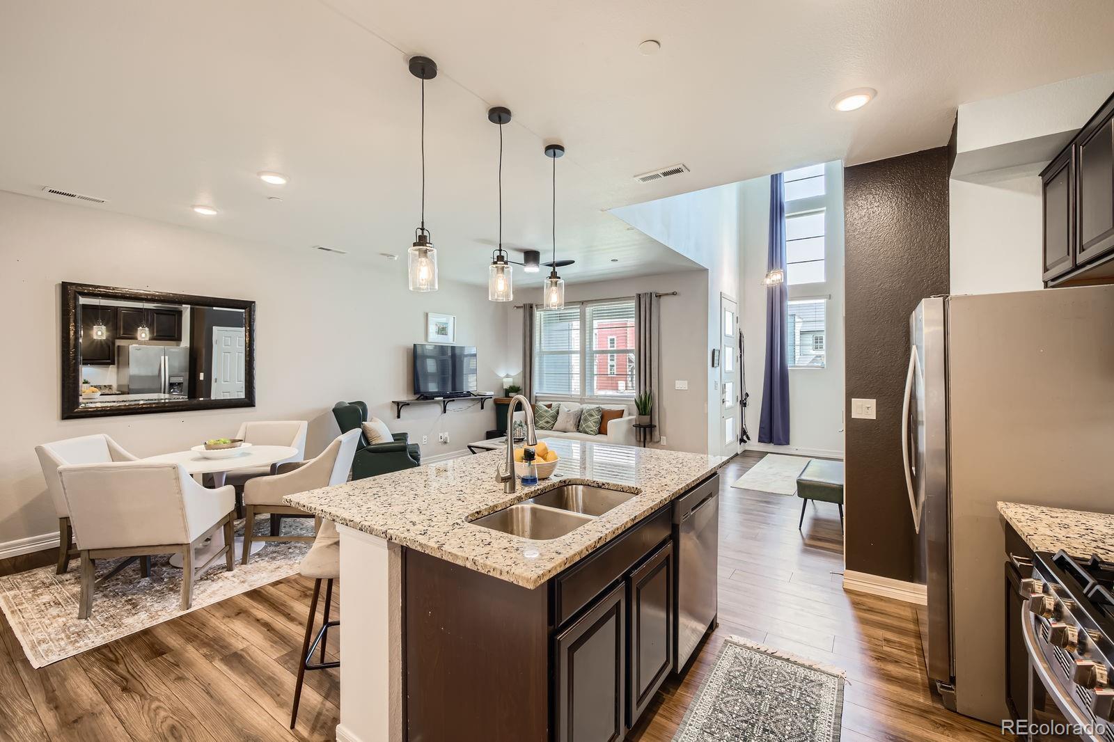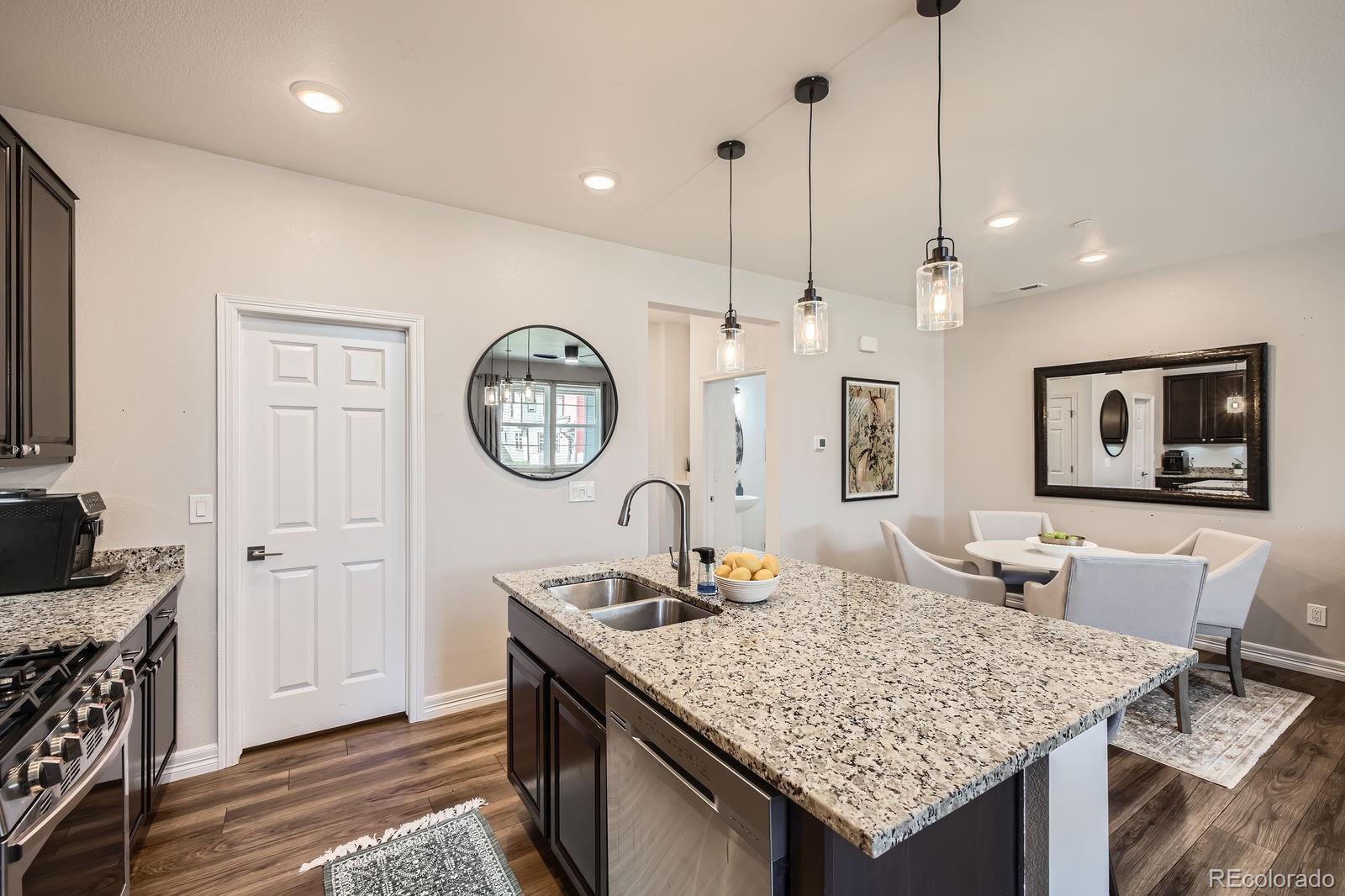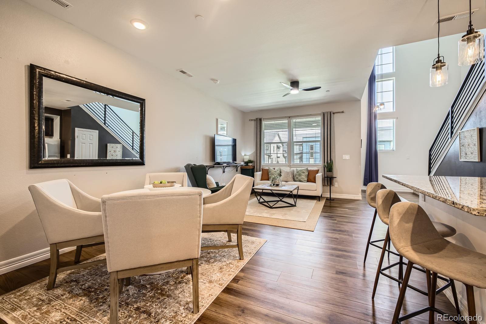 Gorgeous and turnkey 2-bedroom, 2.5-bath modern townhome masterfully blends stylish finishes, thoughtful upgrades, and an inviting sense of community on the edge of a park! From the moment you arrive, you'll appreciate the friendly, welcoming neighborhood and the huge green space just outside your front door. Enjoy your morning coffee under the covered patio or watch the sunset over Pikes Peak from the rear of the property or in the park! This home invites you to savor outdoor living year-round. Inside, the open-concept layout showcases a sleek kitchen with a spacious granite island, new low-maintenance flooring throughout the main areas, and contemporary stainless steel appliances including a dishwasher. The living area offers more upgrades with dimming light switches to set the perfect ambiance, central heating and air conditioning, brand-new carpet on the staircase and a modern metal stair railing, tall ceilings, abundant natural light, bright paint, cordless blinds, huge pantry, oversized garage and more! Retreat upstairs to find two spacious bedrooms with new LVP!!! Primary suite includes a large walk-in closet and zero gravity blinds for a clean look and effortless light control. A new washer and dryer adds to the home’s convenience. Property also features smart upgrades and efficiency along with very low HOA dues, extra insulation between units for enhanced soundproofing and energy savings, a finished garage complete with a water spout and outlets, and a very large and tall crawl space offering plenty of additional storage. Fiber internet is available, making this home ideal for remote work or streaming entertainment. Ideal location—200 feet from a movie theater with quick access to I-25 for an easy commute to Denver or downtown Springs, close to military bases and surrounded by a vibrant community with access to a brand-new amphitheater, Topgolf, indoor skydiving, go-karts, and more. Don’t miss the opportunity to make this exceptional property your new home!