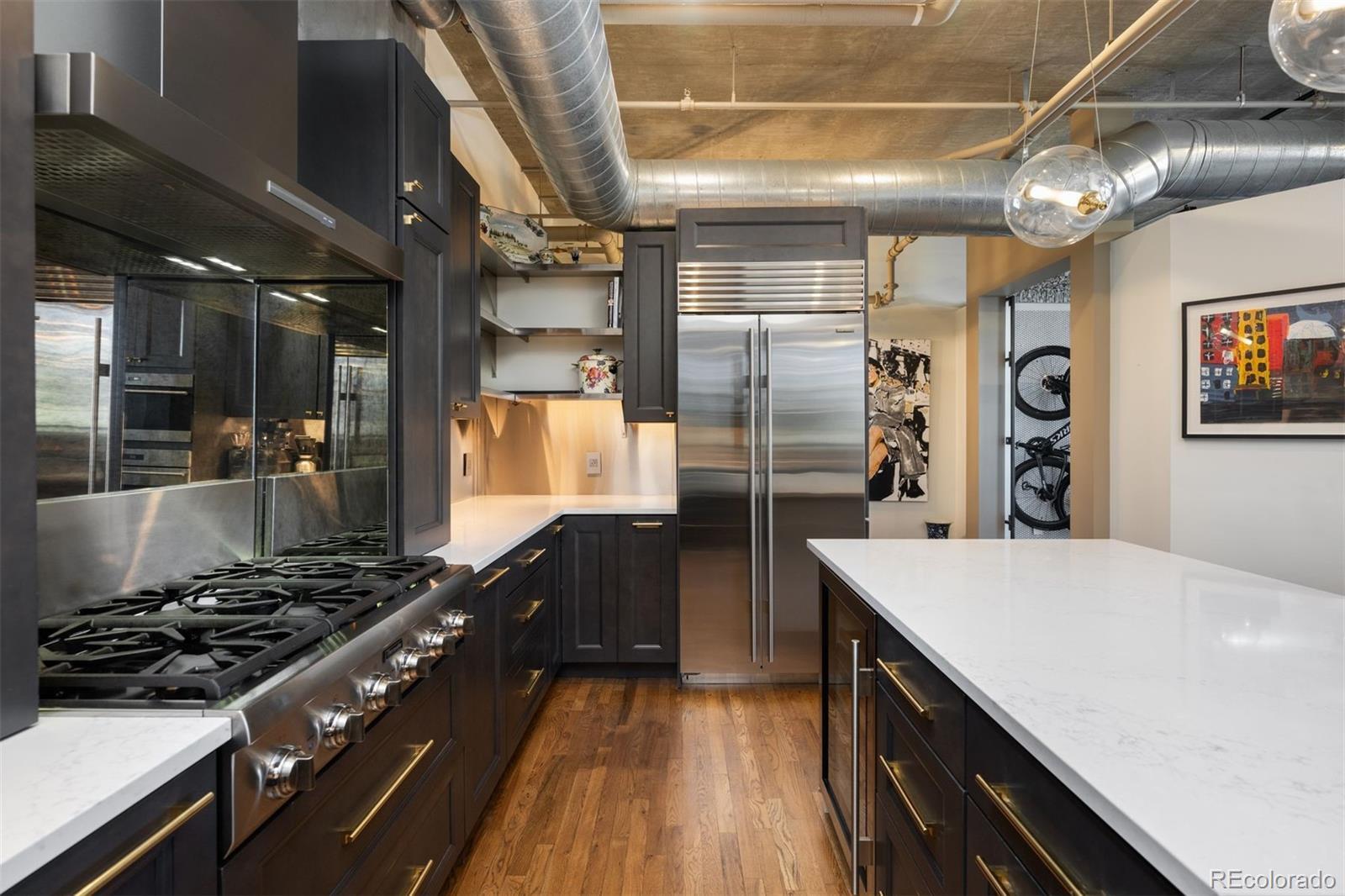 Sophisticated Corner Loft at IceHouse Lofts | Private Balcony & Mountain Views Welcome to one of Lower Downtown Denver’s most distinctive loft residences—a rare sixth-floor corner loft in the historic IceHouse, added during the building’s rooftop conversion. This residence blends modern luxury with authentic industrial character, featuring exposed brick, soaring ceilings, and the preserved original parapet—architectural elements rarely found in downtown Denver. The chef’s kitchen is designed for both performance and presentation, featuring a Thermador six-burner gas range and hood, Sub-Zero refrigerator, Wolf oven, Cove dishwasher, and built-in wine refrigerator, complemented by a stainless-steel backsplash, open shelving, and custom cabinetry. Open living and dining areas extend seamlessly to a private outdoor balcony with mountain views and Colorado sunsets—an exceptional amenity in a historic Denver loft. The primary suite offers a spa-inspired bath with a raised soaking tub, dual vanity with quartz countertops, Brizo Luxe Gold fixtures, towel-warming drawer, and an oversized shower with rainfall and body sprays. A Toto Neorest bidet toilet adds heated seating and auto-flush functionality. The secondary bath continues the spa experience with modern matte black finishes and a multi-function shower panel. Additional features include energy-efficient HVAC, a whole-home humidifier, Hubbardton Forge lighting, remote-controlled window shades, and an LG all-in-one washer/dryer. Ideally located in the heart of LoDo, just steps from Union Station, Wynkoop Street, Coors Field, McGregor Square, the Dairy Block, Whole Foods, and Riverfront Park trails. Sixth-floor corner placement offers enhanced privacy, natural light, and quiet separation—an uncommon combination within IceHouse Lofts and Lower Downtown Denver. Additionally, agent is providing a comprehensive HOA Summary Report at Association Online, located in the Documents section of this listing.