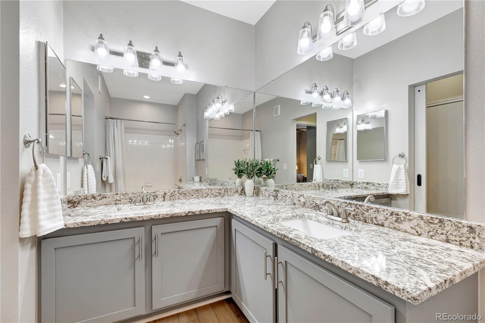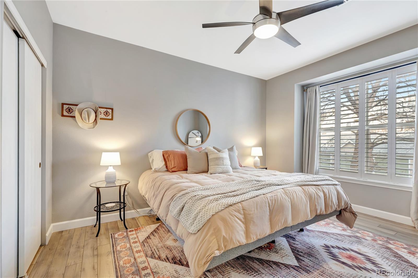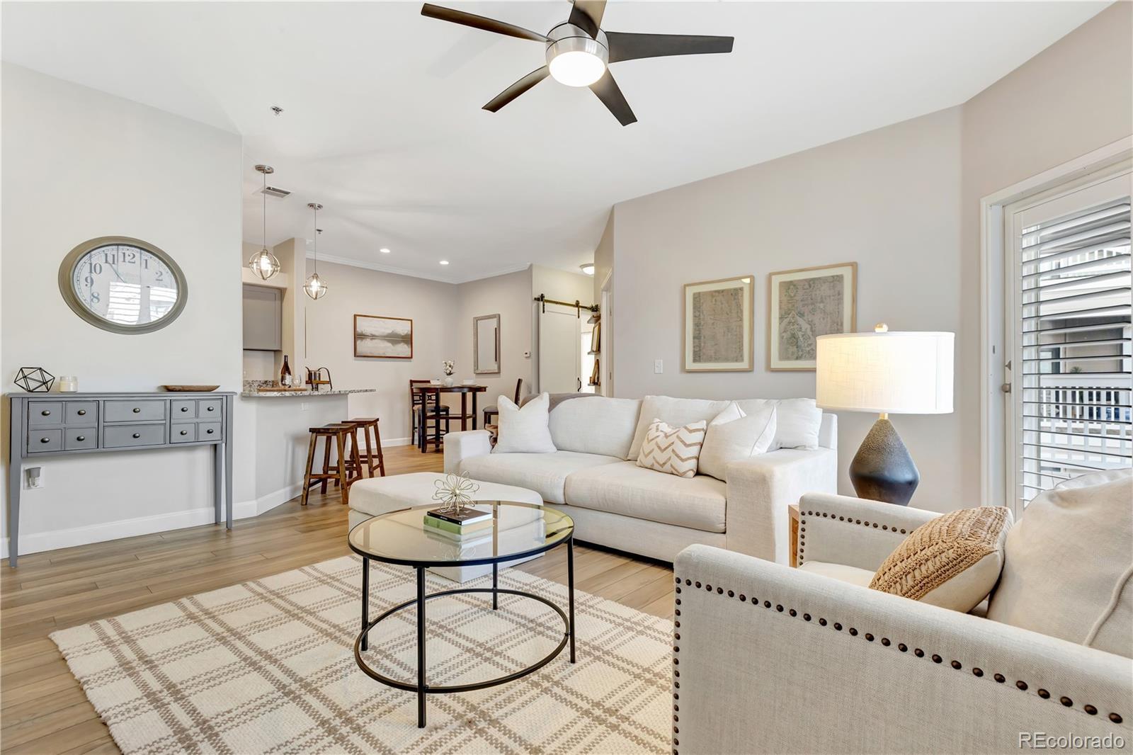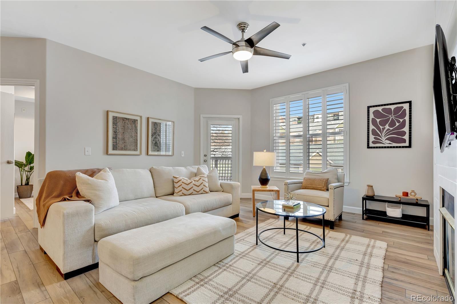 This beautifully remodeled second-floor condo offers turnkey living with intentional, designer-quality finishes. The open concept kitchen features granite slab countertops, stainless steel appliances, and modern pendant lights above the breakfast bar. The home has newer vinyl plank flooring, updated baseboards, upgraded lighting, and refreshed paint. The living room centers around a cozy gas fireplace with a shiplap accent wall, which is designed to pair perfectly with the home’s custom Hunter Douglas Hybrid Shutters. Installed throughout the home, the shutters feature louvers for light filtering and hinged panels for maximum light and privacy control. Down the hall, a custom sliding door opens to a generously sized bathroom with dual sinks, expansive granite countertops, and stainless steel fixtures. The large primary bedroom is positioned away from the living area for privacy and features a walk-in closet, while double doors open to a light-filled second bedroom overlooking the balcony. Every detail was considered in the remodel. Even the elements you feel rather than see, such as soft-close cabinetry, reflect the care given to the updates. Additional highlights include in-unit laundry and a deeded one-car garage located just outside the unit with built-in rear shelving for additional storage. The proactive HOA has recently completed extensive exterior improvements including a new roof, gutters, and fresh exterior paint. Conveniently located with easy access to I-25 and nearby shopping, dining, and entertainment, units of this quality are rarely available. Welcome home.