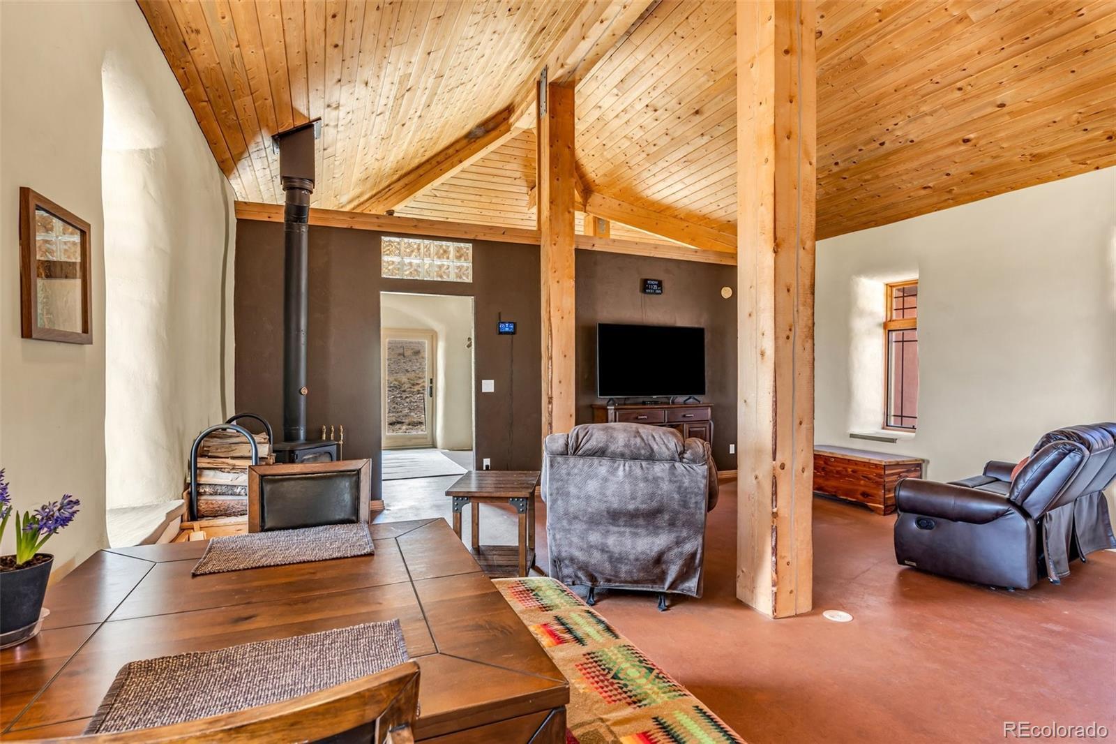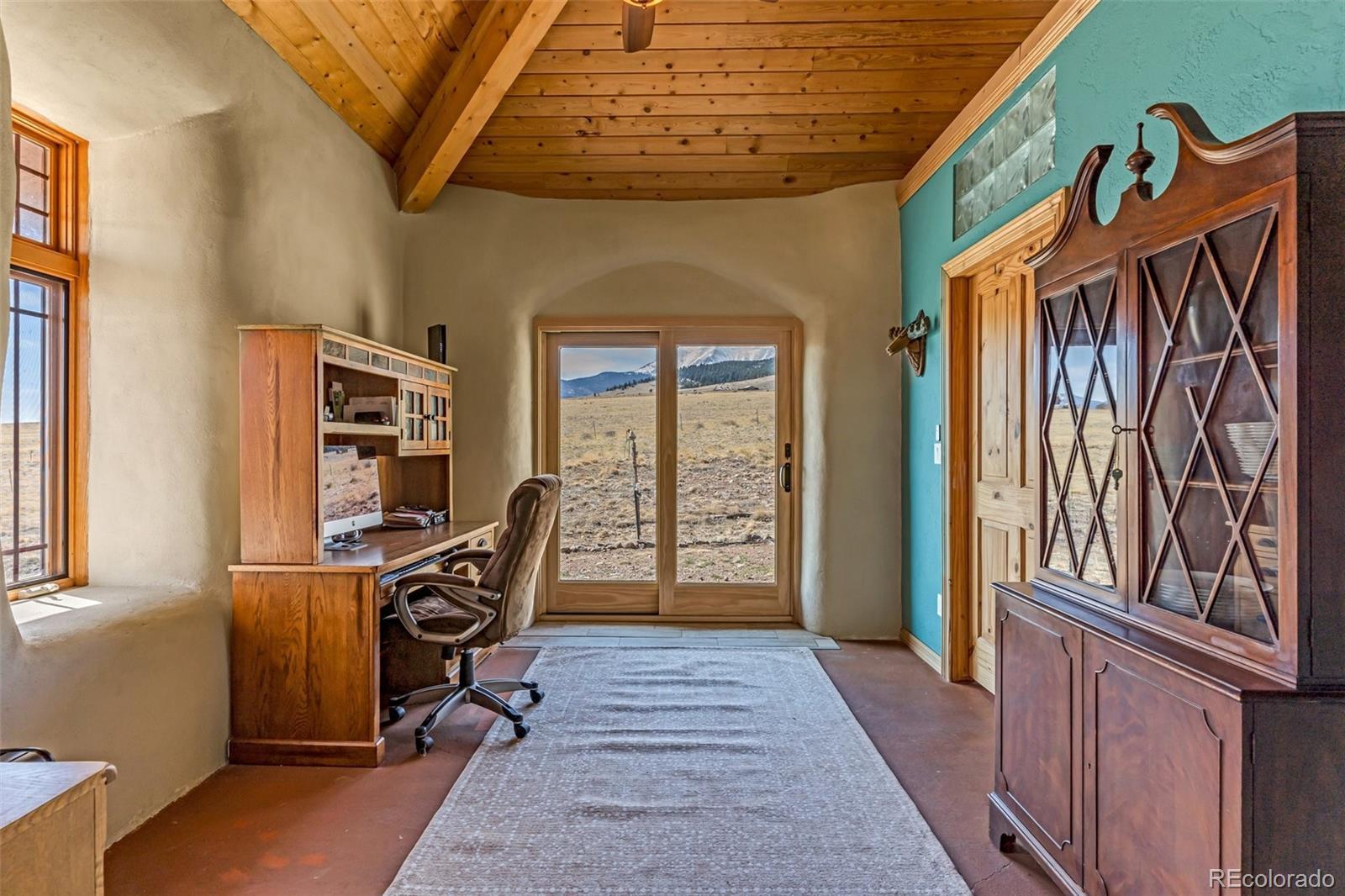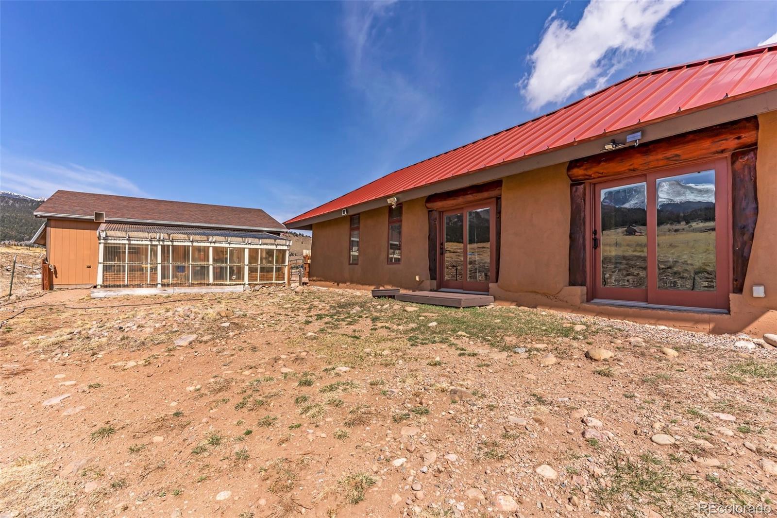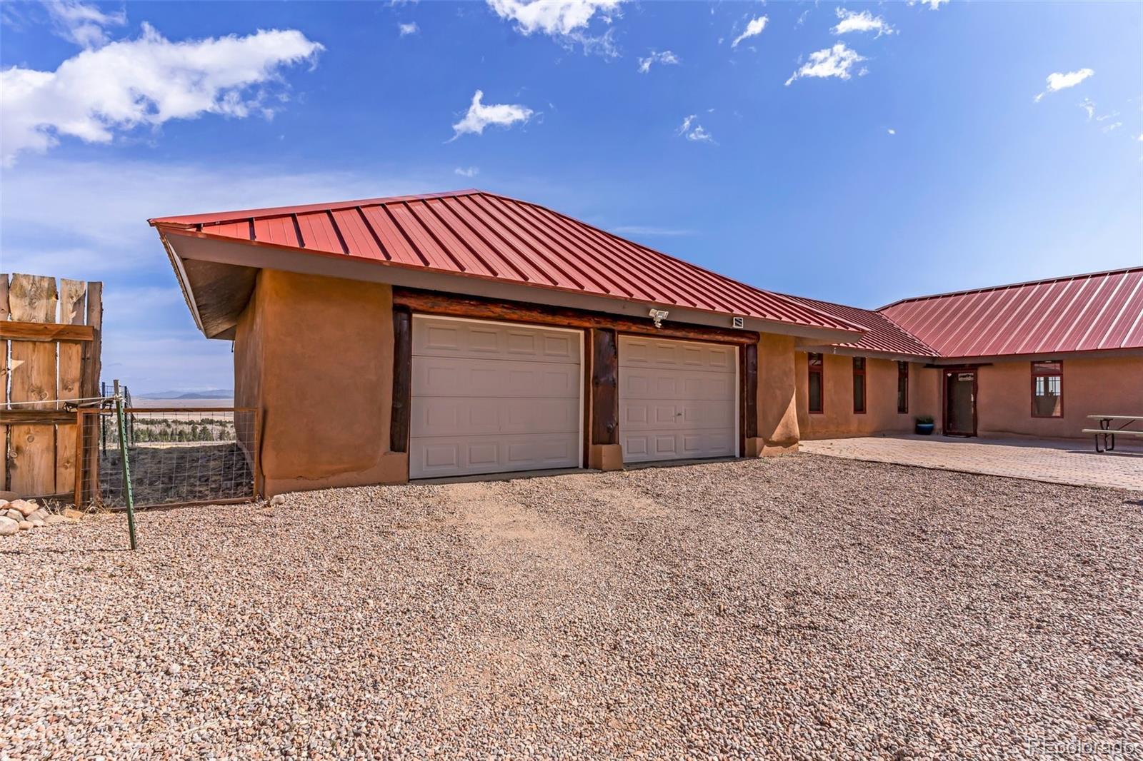 A great location was chosen for this energy-efficient, southwest-style hybrid home. With post & beam construction, hay bale insulation (w/ an R53 insulation factor), & SIP (structural insulated panels (R-17) roofing, earthen plaster interior walls, stucco exterior, concrete floors, in-floor radiant heat, & wood-burning stove, you can plan on reduced utility bills. The center courtyard has brick pavers & latilla fence & provides an excellent spot to soak up the sun & host your BBQs. The one level home has 3 bedrooms, 2 baths, large utility room, bonus/tv/office, great room & kitchen & an attached, heated 2-car garage, plus another detached oversized 2-car garage w/ workshop area. The spacious kitchen w/ cork flooring, has an island w/ seating for 4 & is open to the dining space & great room. This area has tongue& groove vaulted ceilings, 2' Colorado blue stone window sills, large beams, & a wood-burning stove. The master suite, just off the great room has a library/sitting room with double French doors to the outside, & is a nice spot to take time out to appreciate the phenomenal views. The mountains here are up close & personal w/ great hiking & horseback riding nearby. Skidsteer(negotiable)