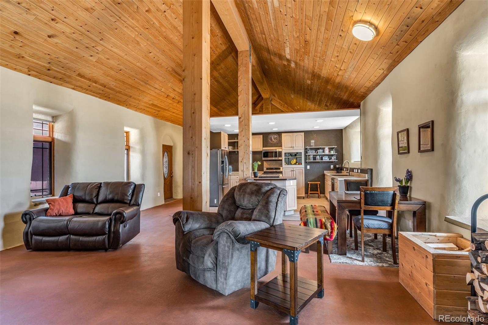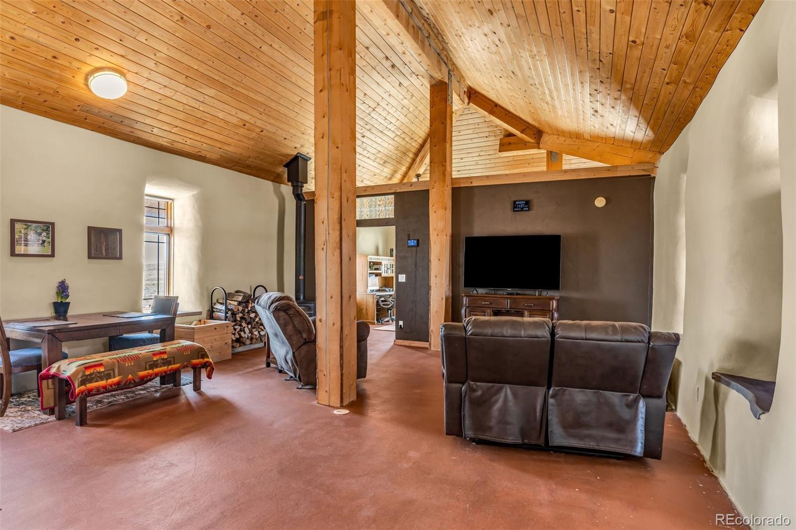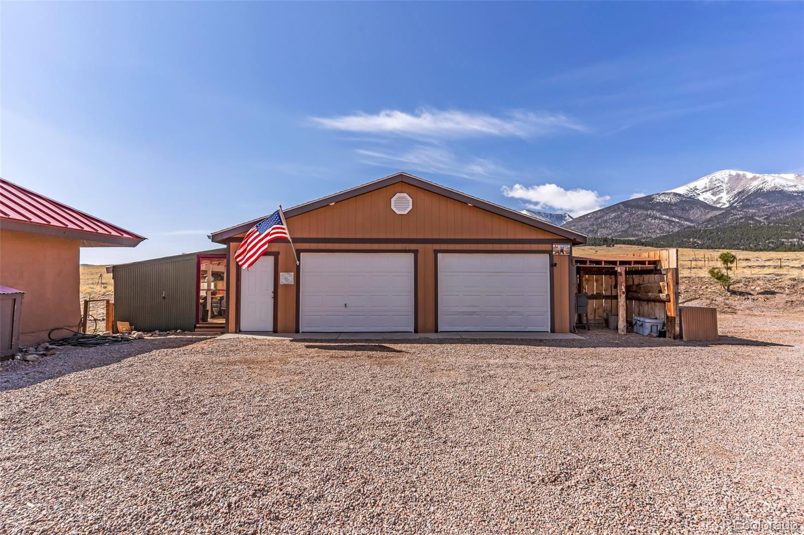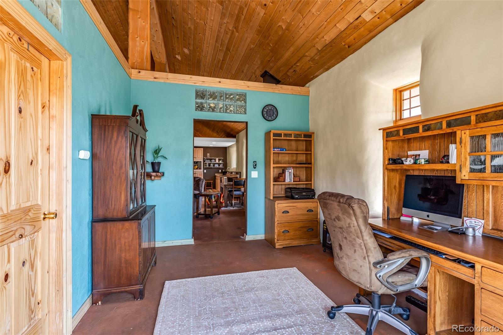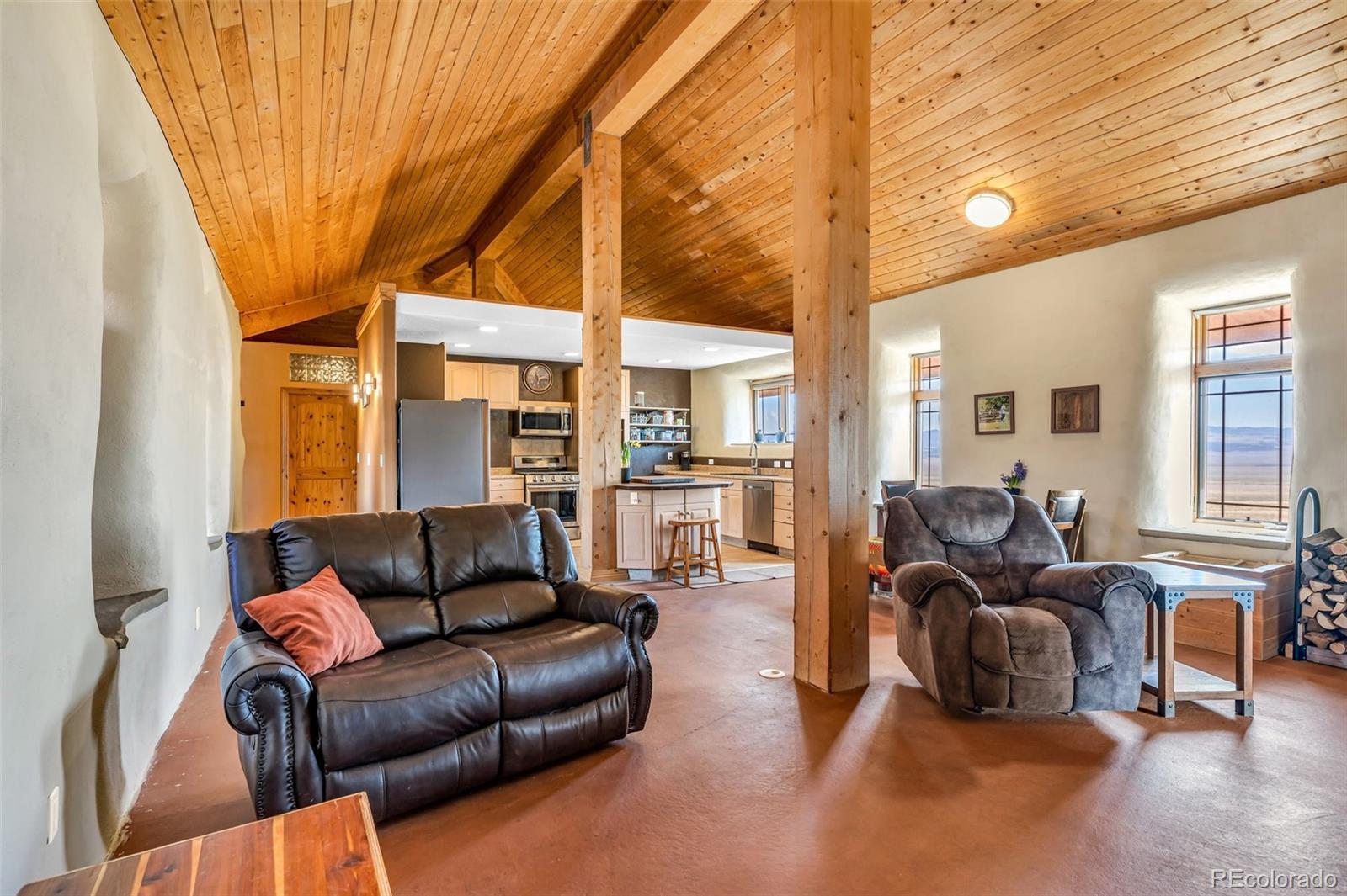 A great location was chosen for this energy-efficient, southwest-style hybrid home. With post & beam construction, hay bale insulation (w/ an R53 insulation factor), & SIP (structural insulated panels (R-17) roofing, earthen plaster interior walls, stucco exterior, concrete floors, in-floor radiant heat, & wood-burning stove, you can plan on reduced utility bills. The center courtyard has brick pavers & latilla fence & provides an excellent spot to soak up the sun & host your BBQs. The one level home has 3 bedrooms, 2 baths, large utility room, bonus/tv/office, great room & kitchen & an attached, heated 2-car garage, plus another detached oversized 2-car garage w/ workshop area. The spacious kitchen w/ cork flooring, has an island w/ seating for 4 & is open to the dining space & great room. This area has tongue& groove vaulted ceilings, 2' Colorado blue stone window sills, large beams, & a wood-burning stove. The master suite, just off the great room has a library/sitting room with double French doors to the outside, & is a nice spot to take time out to appreciate the phenomenal views. The mountains here are up close & personal w/ great hiking & horseback riding nearby. Skidsteer(negotiable)