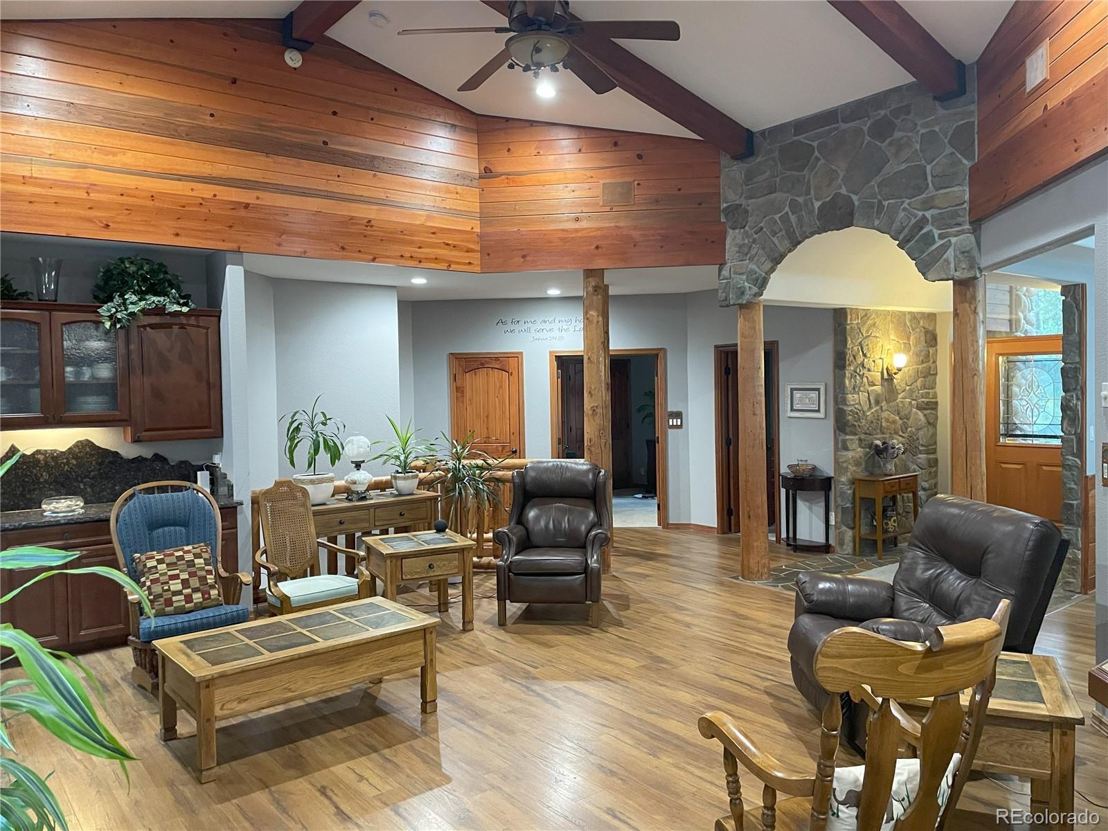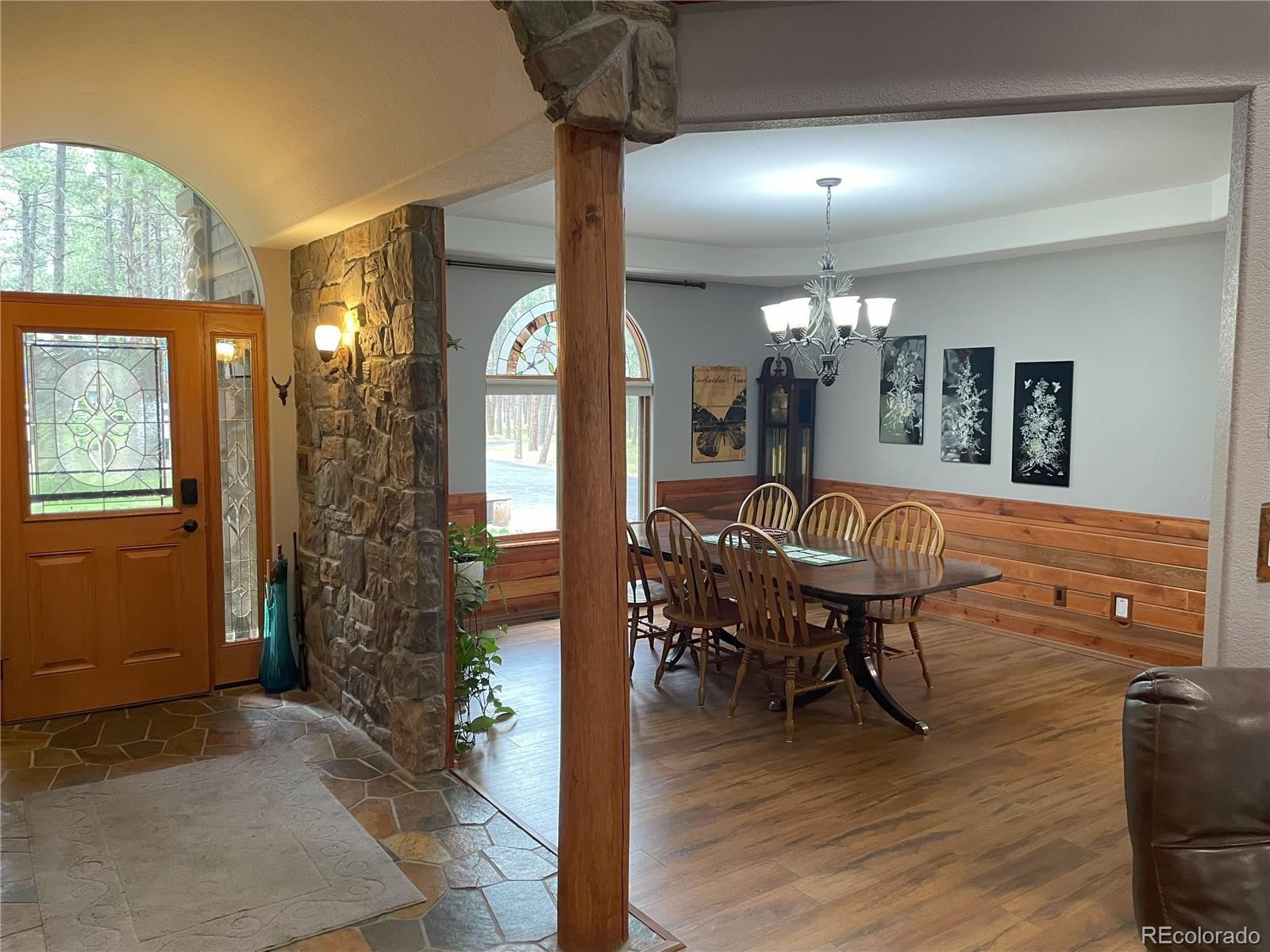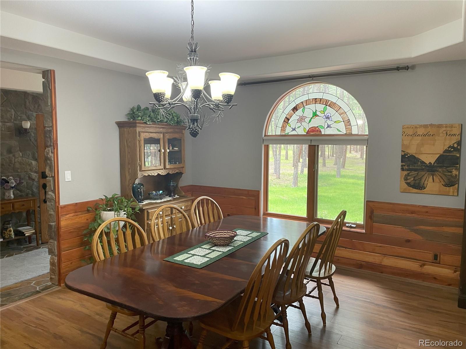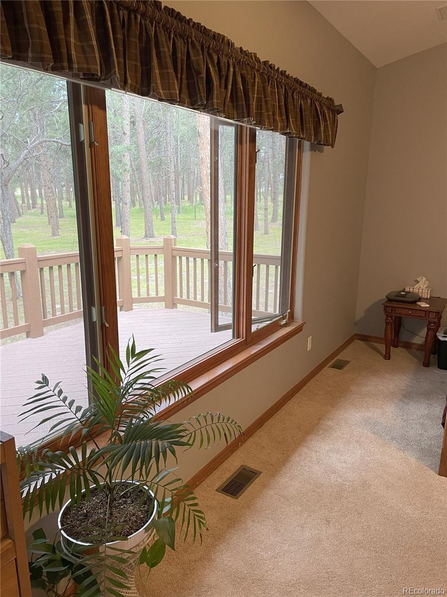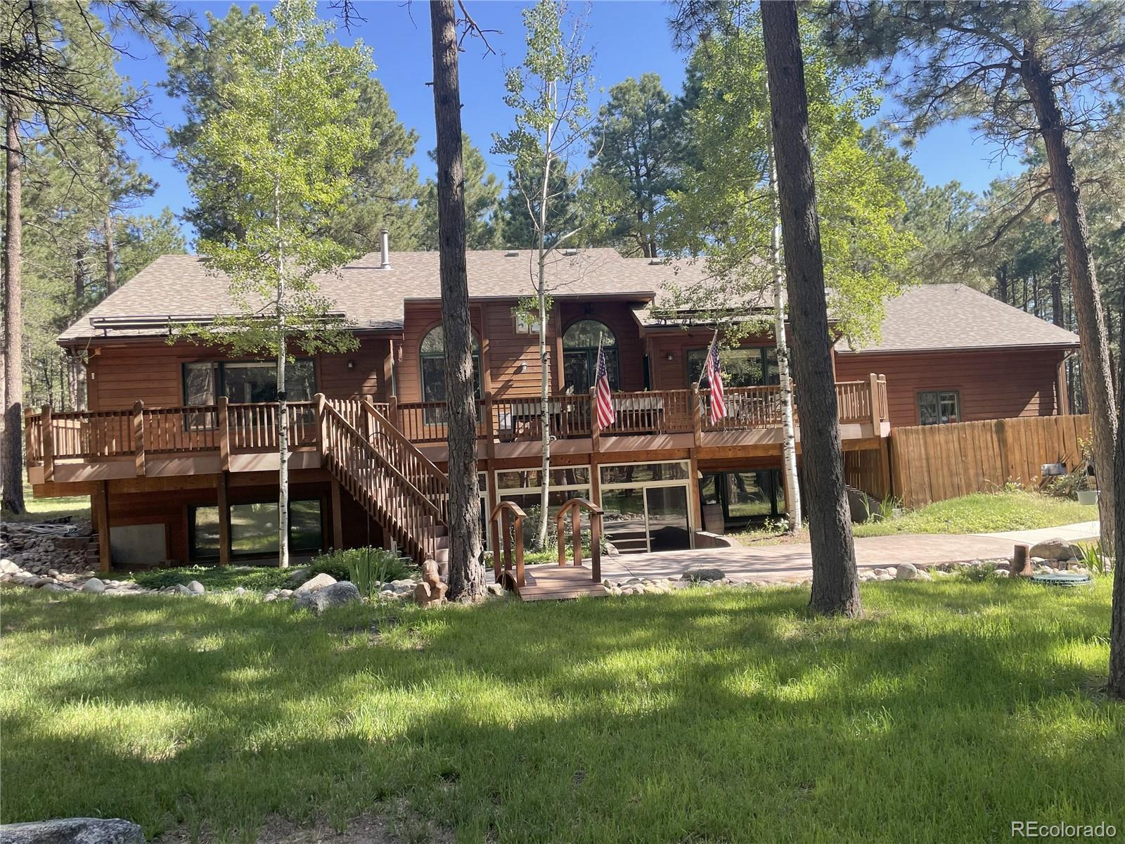 Discover unparalleled comfort and serenity at this exquisite 5 bedroom, 4 bathroom home at 18050 Archers Drive in Monument, Colorado. Nestled on a sprawling 3.05-acre lot adorned with many mature pine trees, this approximately 3,100-square-foot residence offers an amazing forested view front and back, with meticulously maintained landscaping, complete with sprinklers for front and back lawns and water saving drip lines nourishing all trees and plants. Spacious Open Floor Plan: The main level features soaring ceilings, large windows flooding the space with natural light, and a cozy gas fireplace, creating an inviting atmosphere for relaxation or entertaining. Gourmet Kitchen: A chef’s delight with black appliances, a gorgeous gas cook top, a double oven, tiled countertops, and a striking stone backsplash. Adjacent to a charming breakfast nook and a formal dining room, perfect for both casual and elegant dining experiences. The expansive primary bedroom boasts a jetted tub, separate shower, private toilet room, large walk-in closet, and a walkout door to the spacious back deck, offering a private retreat with stunning views. Versatile Living Spaces: Enjoy a dedicated home office, main-floor laundry room, and a finished basement featuring two full bathrooms, four bedrooms, and a living room, ideal for a home theater, gym, or guest quarters. Outdoor Paradise: The expansive lot includes a large back deck, a covered porch area with a walkout door from the lower level, and a serene water feature with a stream, waterfalls, and pond. Powered awnings provide shade, while a built-in dog run off the main 3-car attached garage adds convenience for pet owners. Hardwood floors, fresh paint inside and out, a new roof, and a whole-house fan ensure comfort and efficiency. The home’s many large windows frame picturesque views of the surrounding landscape.