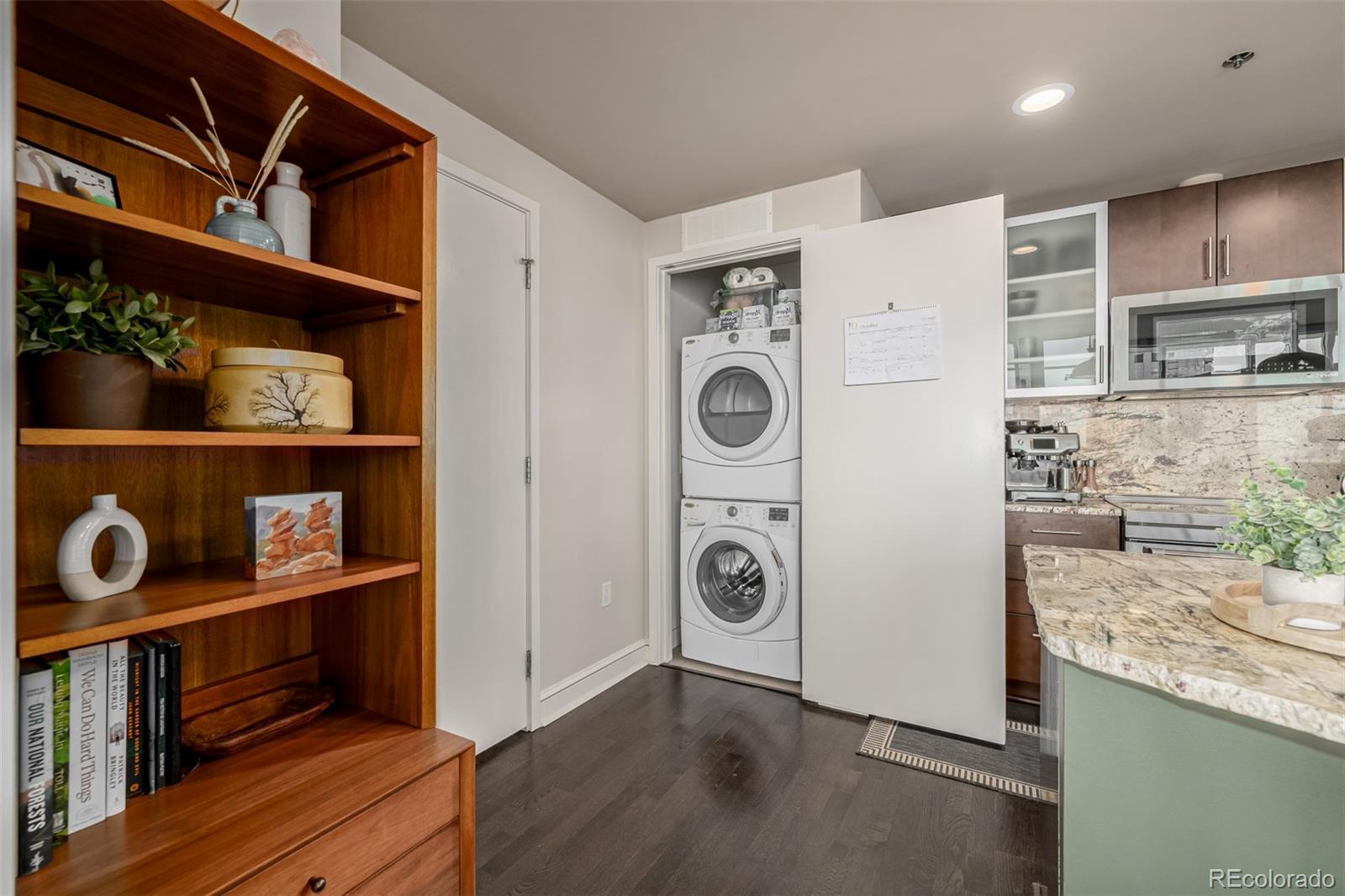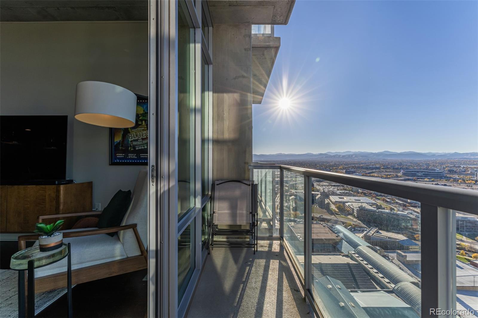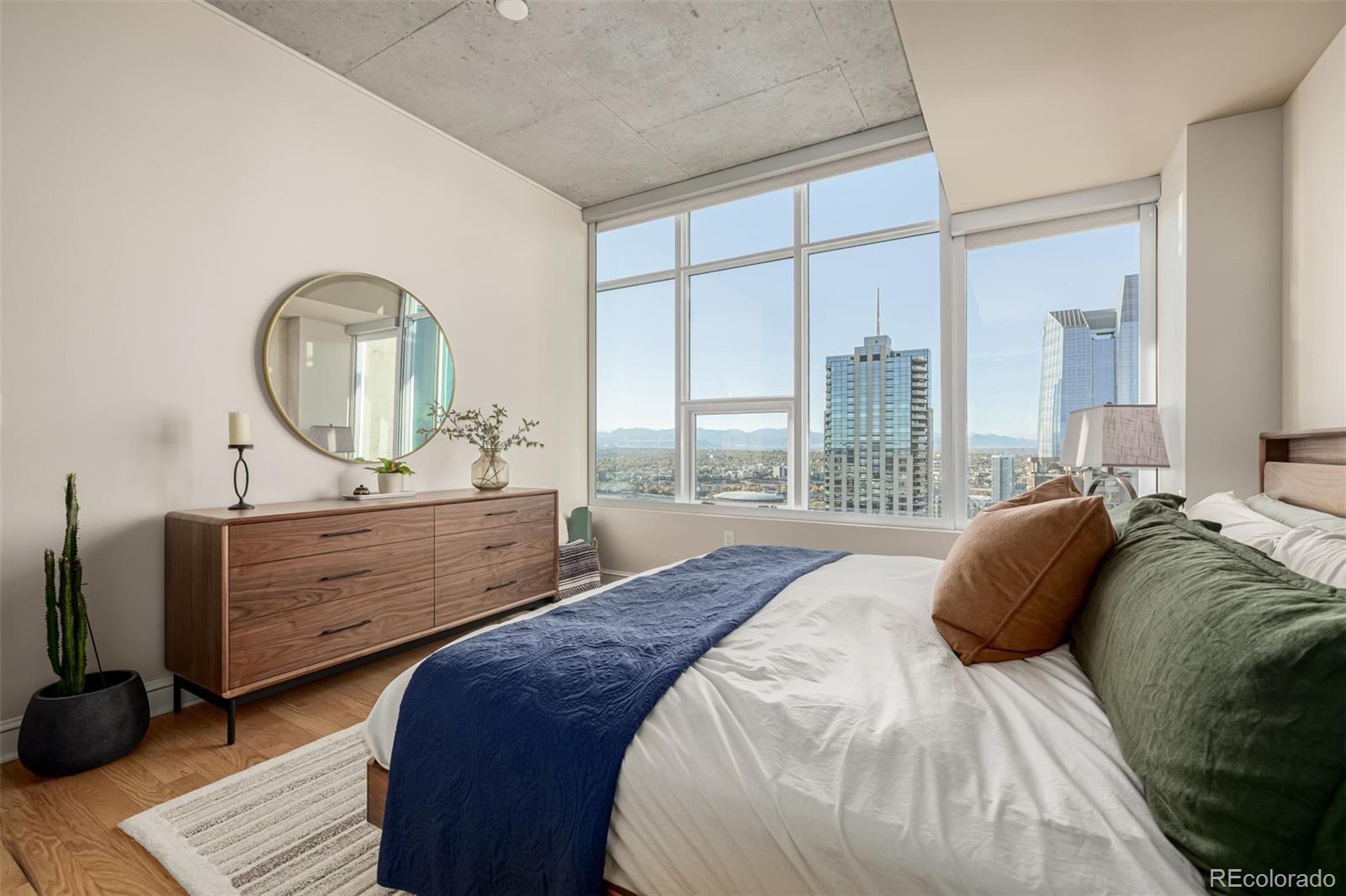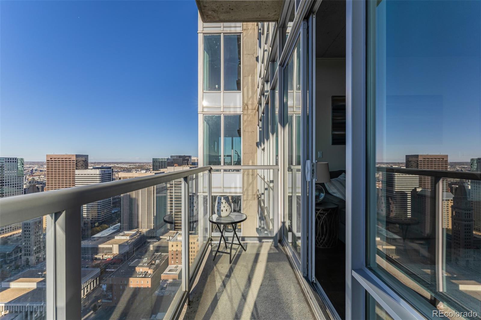 Experience elevated city living in this stunning 1 bedroom/1bathroom condo with incredible skyline views! The welcoming entrance foyer opens to a sophisticated interior featuring high ceilings, engineered hardwood floors, and floor-to-ceiling glass that floods the home with natural light. Enjoy the automatic blinds throughout this stunning residence. The open kitchen is a chef’s delight with custom granite counters, upgraded stainless steel appliances, and a breakfast bar island perfect for casual dining or entertaining. Bright bedroom offers a serene retreat with a walk-in closet, while the bathroom showcases a glass-enclosed tub/shower combo and modern finishes. A stacked washer and dryer adds everyday convenience. The charming balcony is perfect for enjoying fresh air and amazing mountains/city views. This condo also includes a reserved deeded parking space (desirably located on level 2) and access to resort-style amenities such as a pool, hot tub, club room, movie theater and gym. The location is unbeatable! The building sits within walking distance to 16th Street Mall, DCPA, Sculpture Park on Speer and all the amazing restaurants on Larimer Square. One amazing perk of owning this unit - enjoy access to the penthouse SkyClub lounge high atop the 42-story SPIRE.