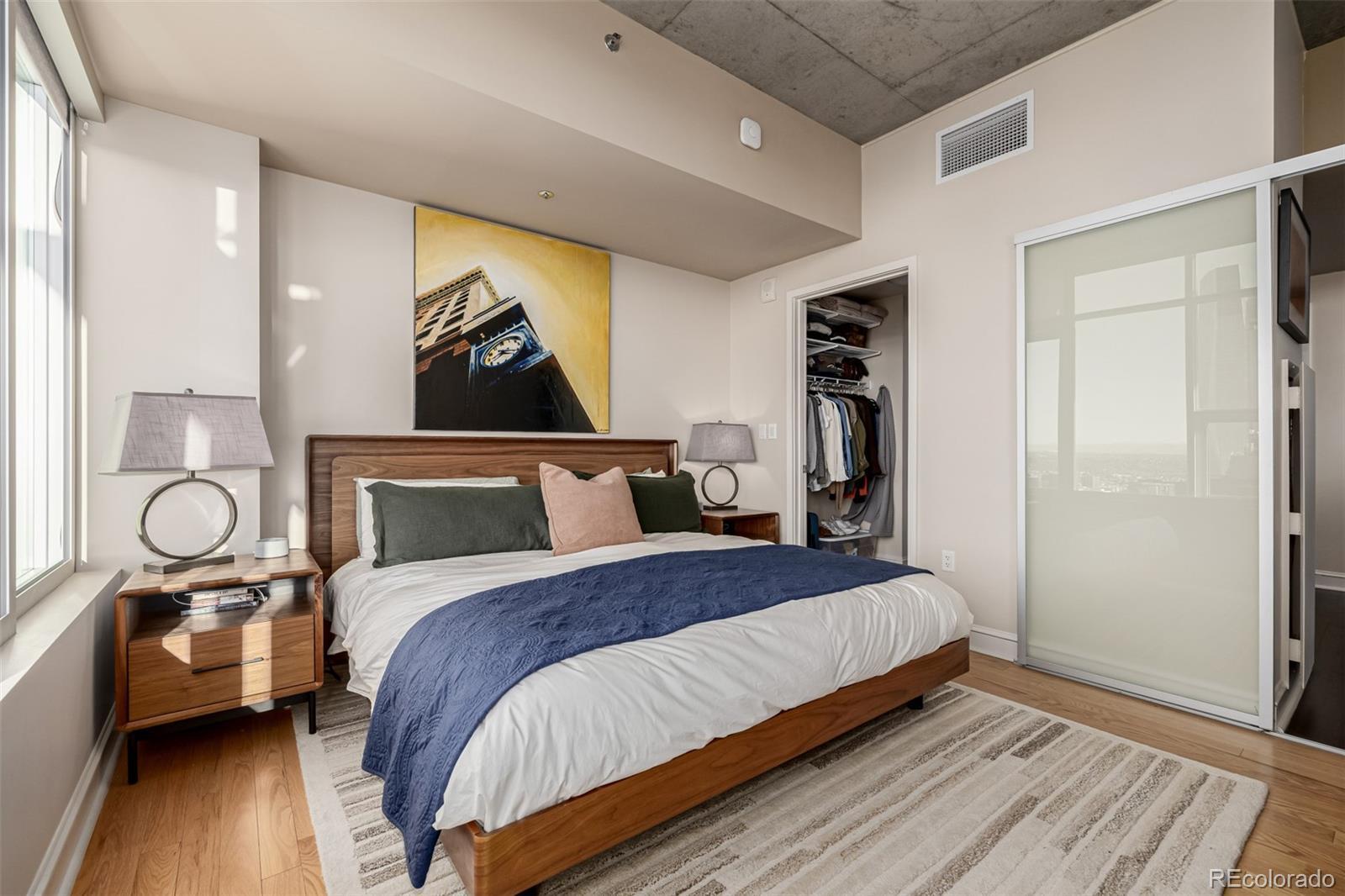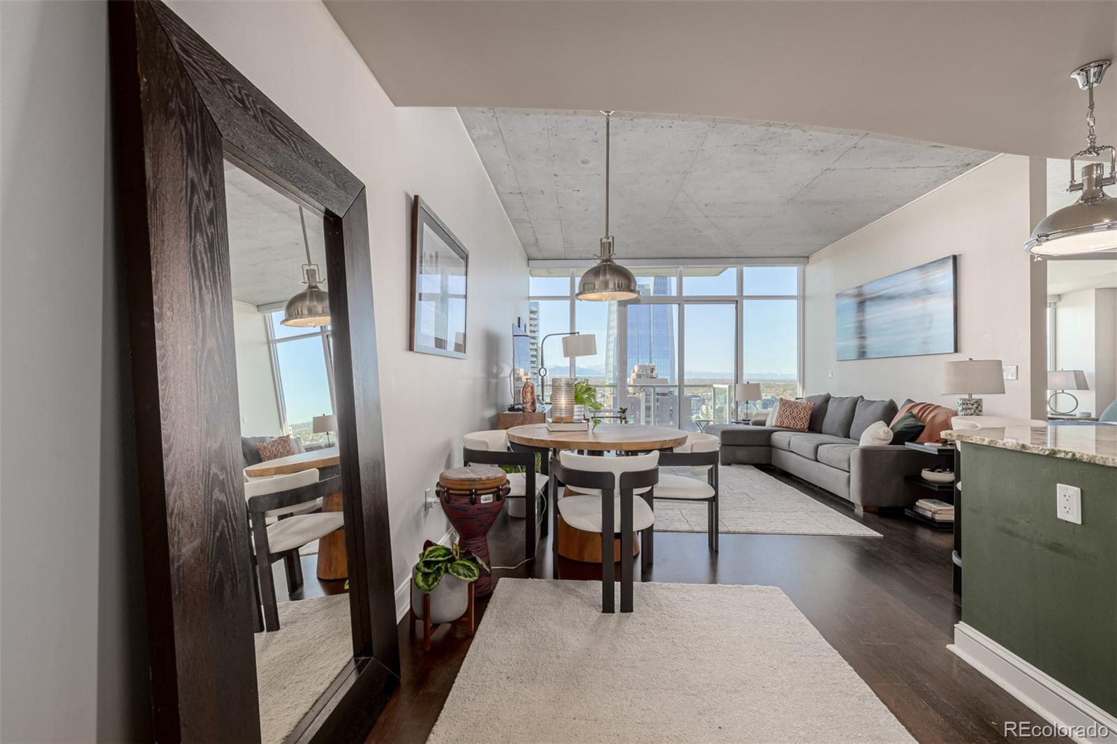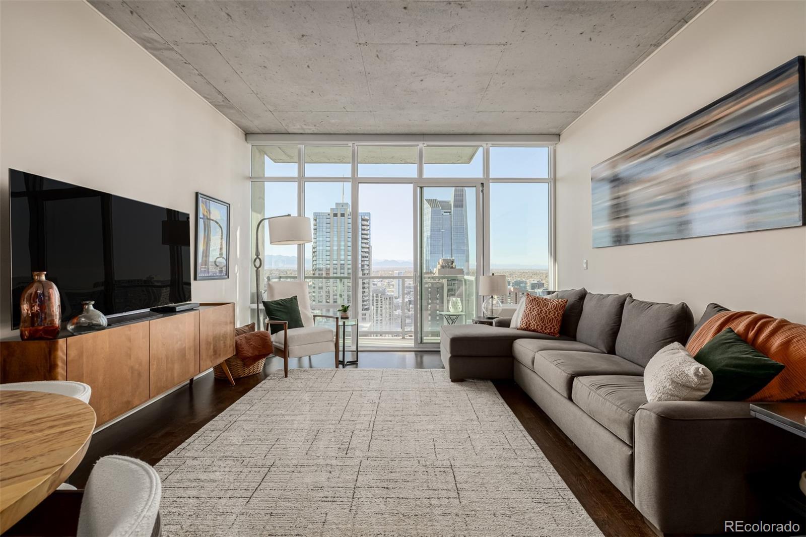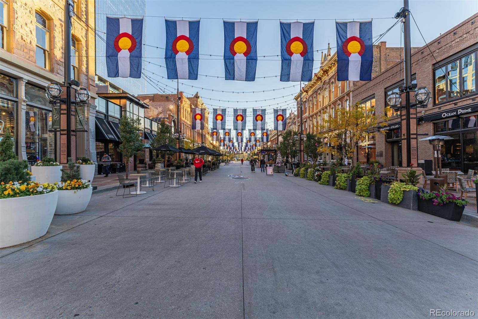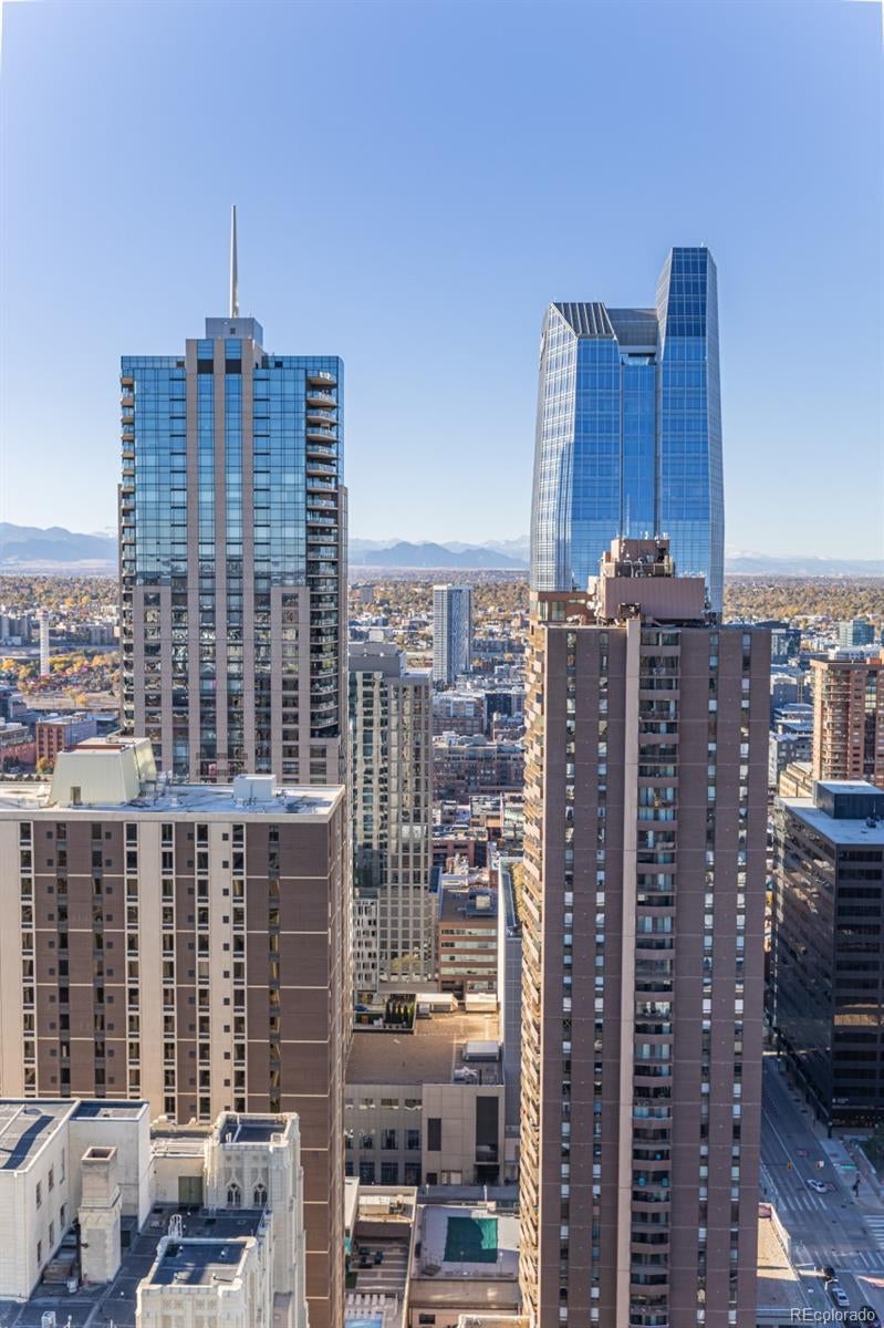 Experience elevated city living in this stunning 1 bedroom/1bathroom condo with incredible skyline views! The welcoming entrance foyer opens to a sophisticated interior featuring high ceilings, engineered hardwood floors, and floor-to-ceiling glass that floods the home with natural light. Enjoy the automatic blinds throughout this stunning residence. The open kitchen is a chef’s delight with custom granite counters, upgraded stainless steel appliances, and a breakfast bar island perfect for casual dining or entertaining. Bright bedroom offers a serene retreat with a walk-in closet, while the bathroom showcases a glass-enclosed tub/shower combo and modern finishes. A stacked washer and dryer adds everyday convenience. The charming balcony is perfect for enjoying fresh air and amazing mountains/city views. This condo also includes a reserved deeded parking space (desirably located on level 2) and access to resort-style amenities such as a pool, hot tub, club room, movie theater and gym. The location is unbeatable! The building sits within walking distance to 16th Street Mall, DCPA, Sculpture Park on Speer and all the amazing restaurants on Larimer Square. One amazing perk of owning this unit - enjoy access to the penthouse SkyClub lounge high atop the 42-story SPIRE.