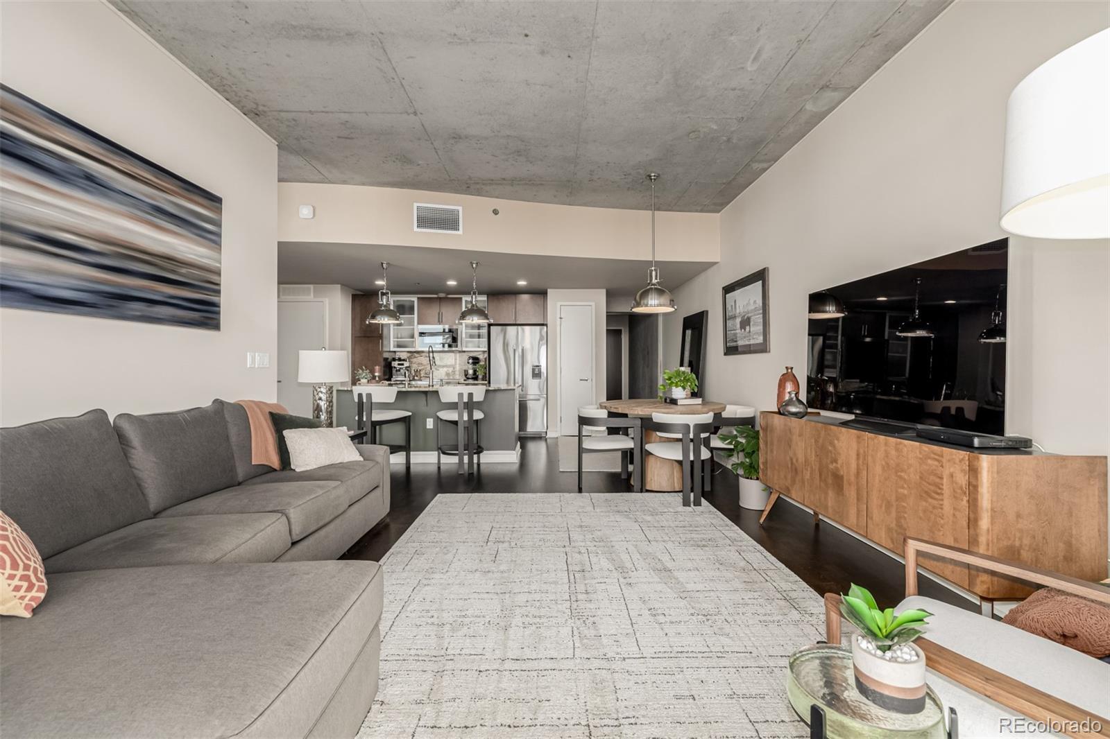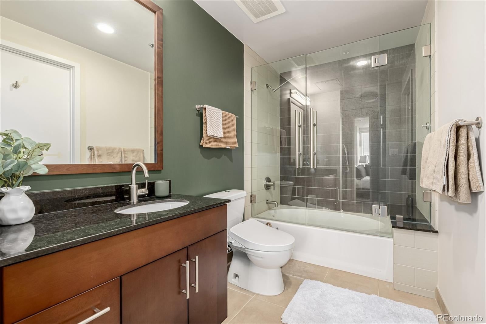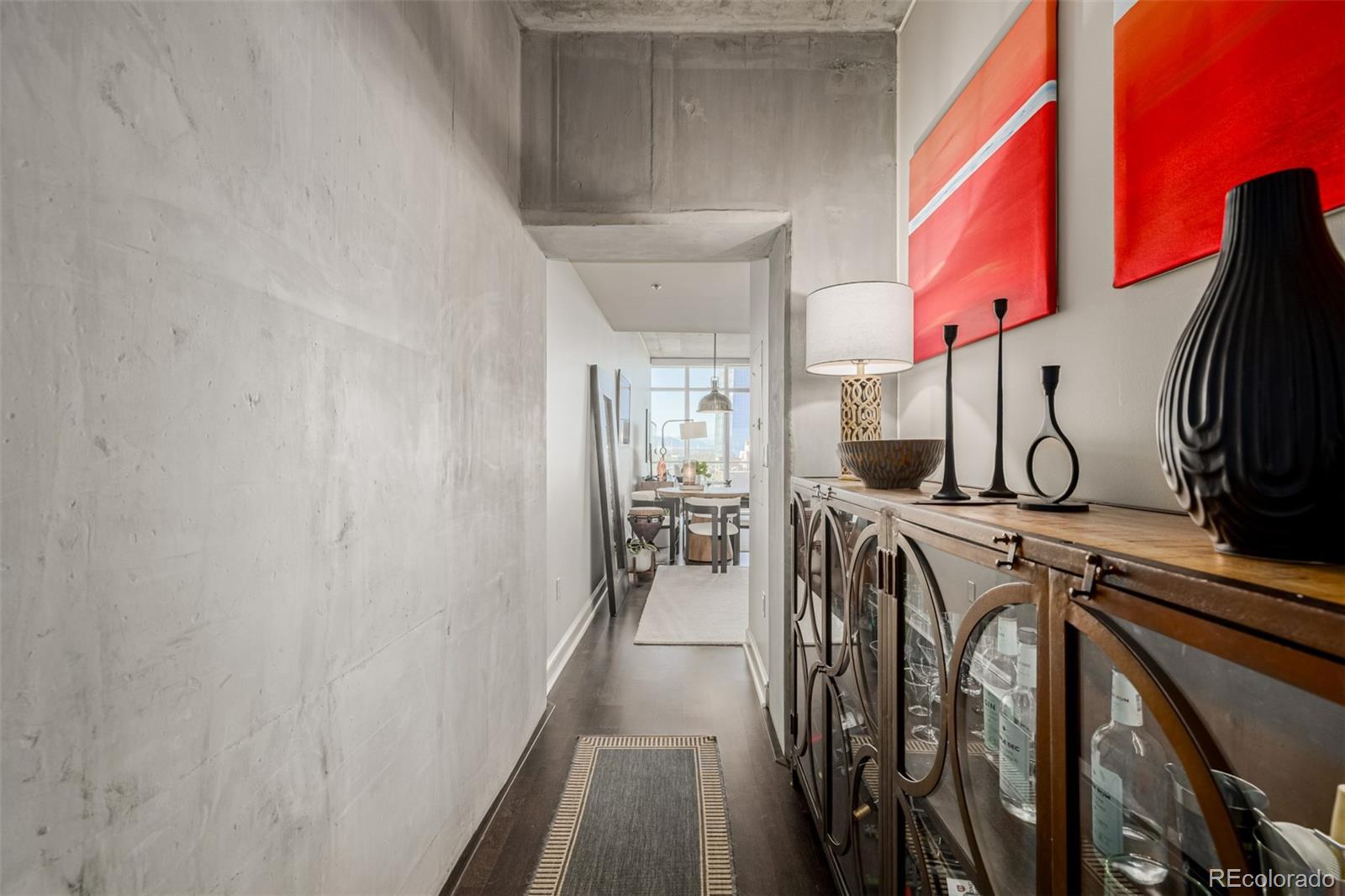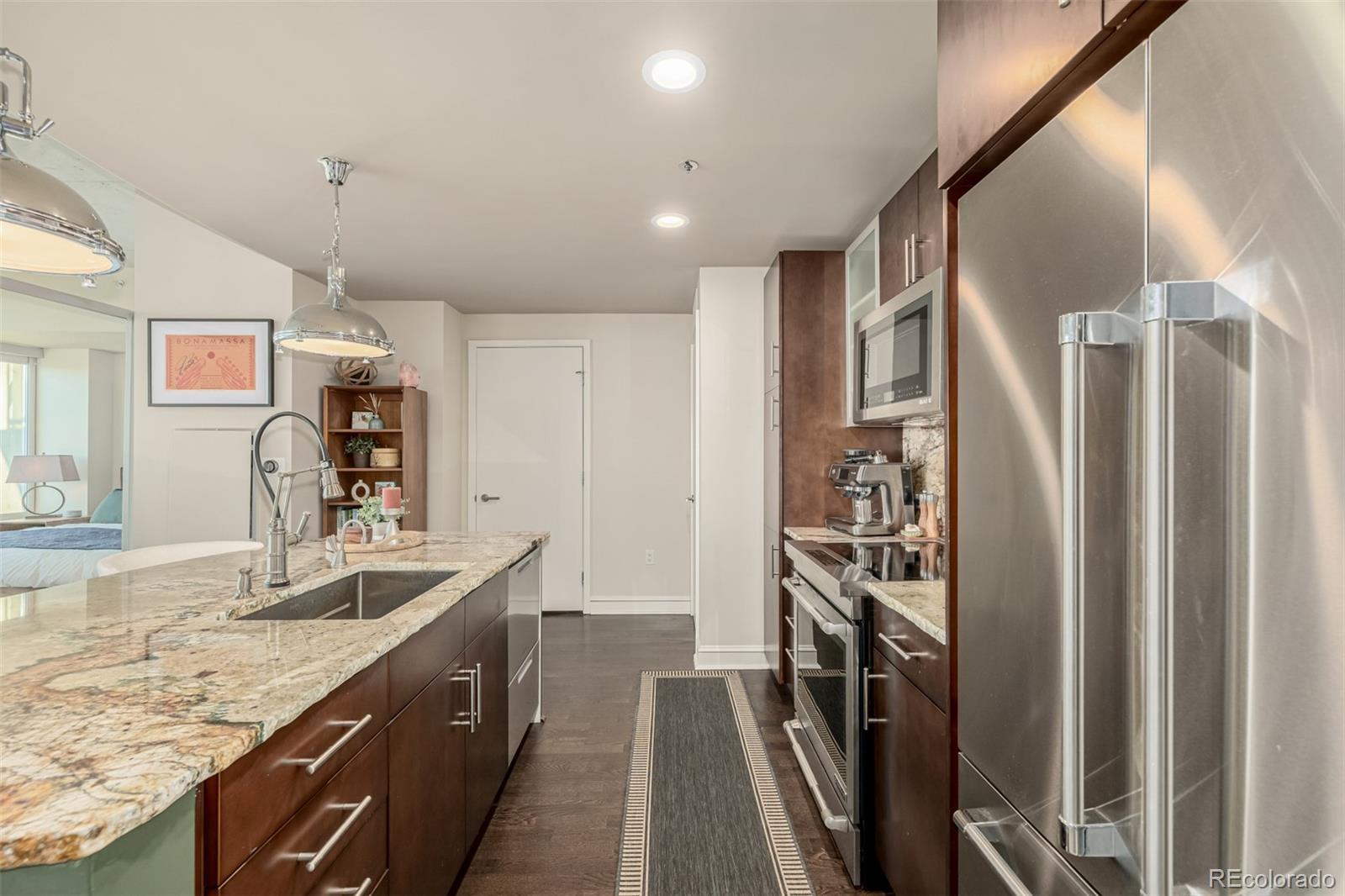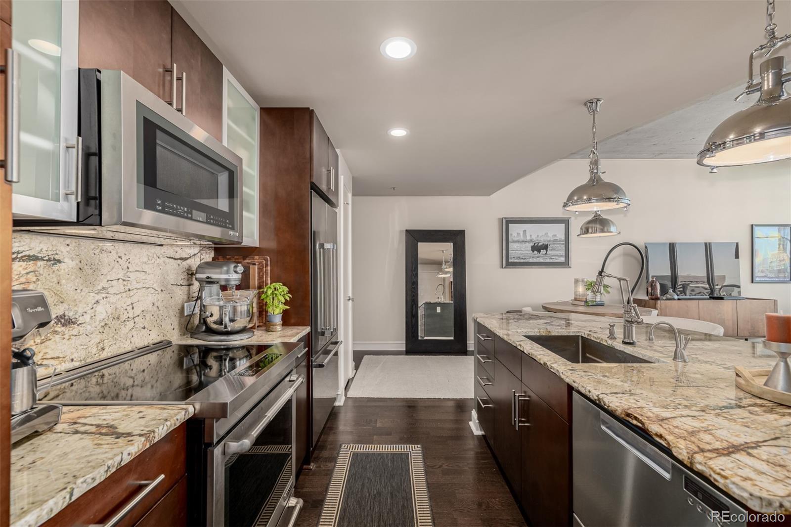 Experience elevated city living in this stunning 1 bedroom/1bathroom condo with incredible skyline views! The welcoming entrance foyer opens to a sophisticated interior featuring high ceilings, engineered hardwood floors, and floor-to-ceiling glass that floods the home with natural light. Enjoy the automatic blinds throughout this stunning residence. The open kitchen is a chef’s delight with custom granite counters, upgraded stainless steel appliances, and a breakfast bar island perfect for casual dining or entertaining. Bright bedroom offers a serene retreat with a walk-in closet, while the bathroom showcases a glass-enclosed tub/shower combo and modern finishes. A stacked washer and dryer adds everyday convenience. The charming balcony is perfect for enjoying fresh air and amazing mountains/city views. This condo also includes a reserved deeded parking space (desirably located on level 2) and access to resort-style amenities such as a pool, hot tub, club room, movie theater and gym. The location is unbeatable! The building sits within walking distance to 16th Street Mall, DCPA, Sculpture Park on Speer and all the amazing restaurants on Larimer Square. One amazing perk of owning this unit - enjoy access to the penthouse SkyClub lounge high atop the 42-story SPIRE.