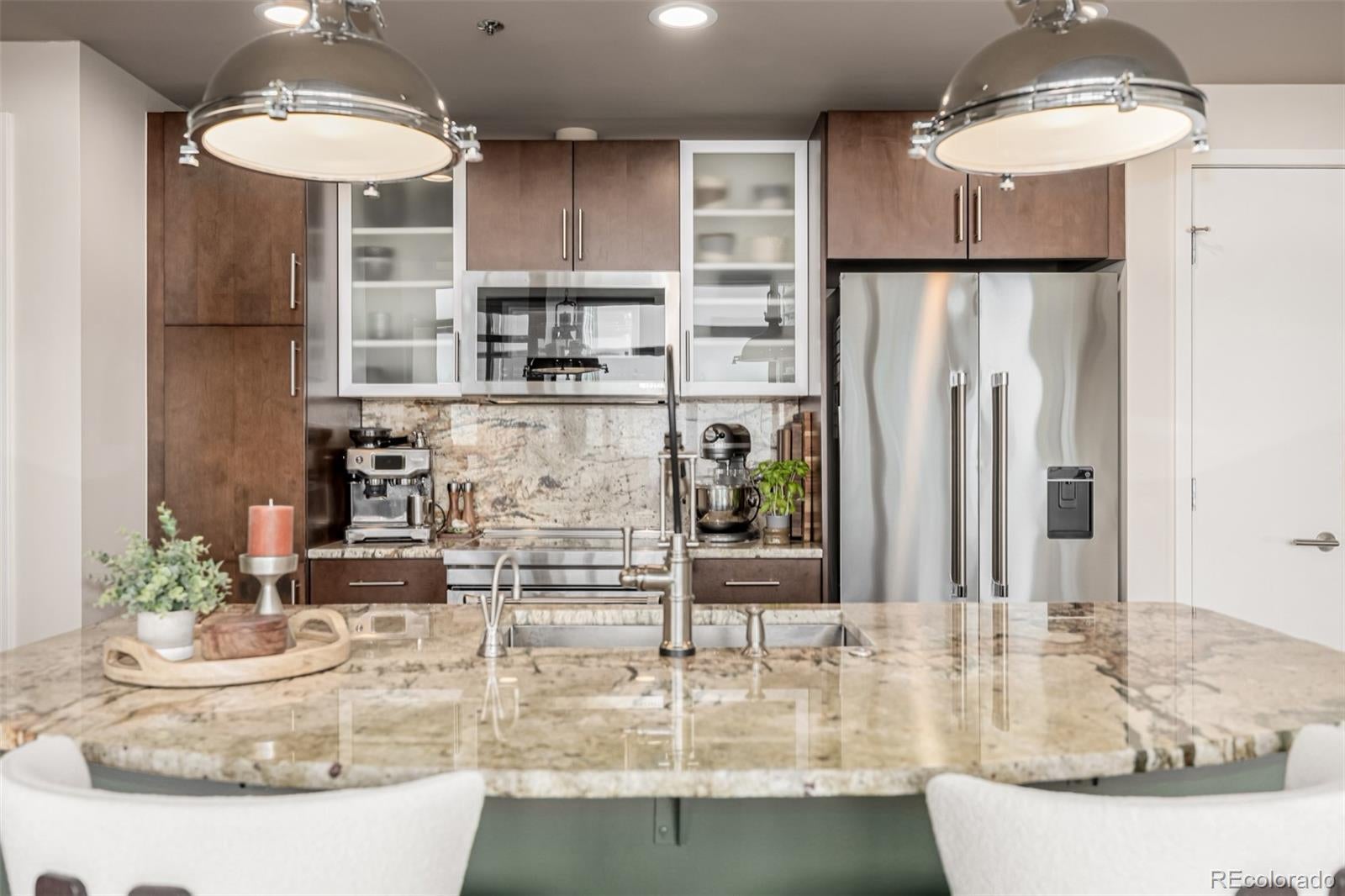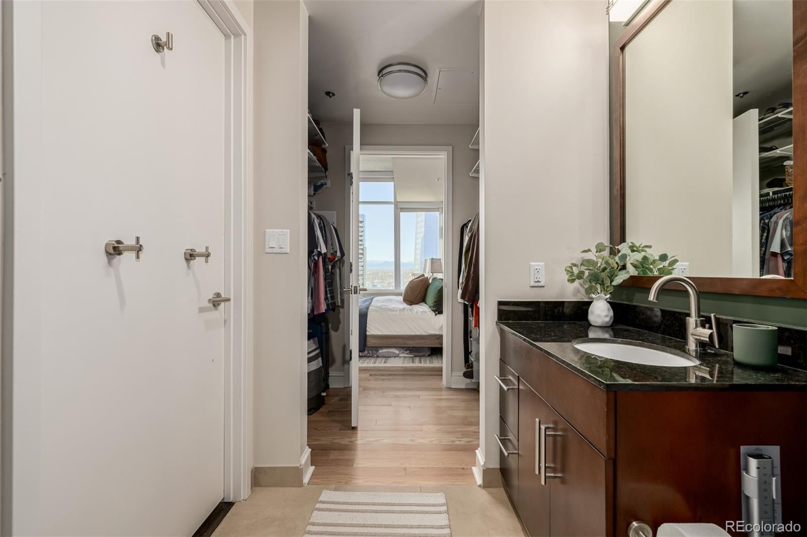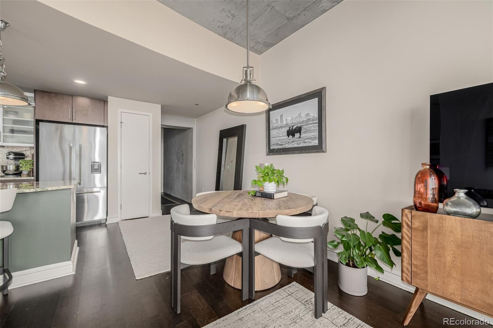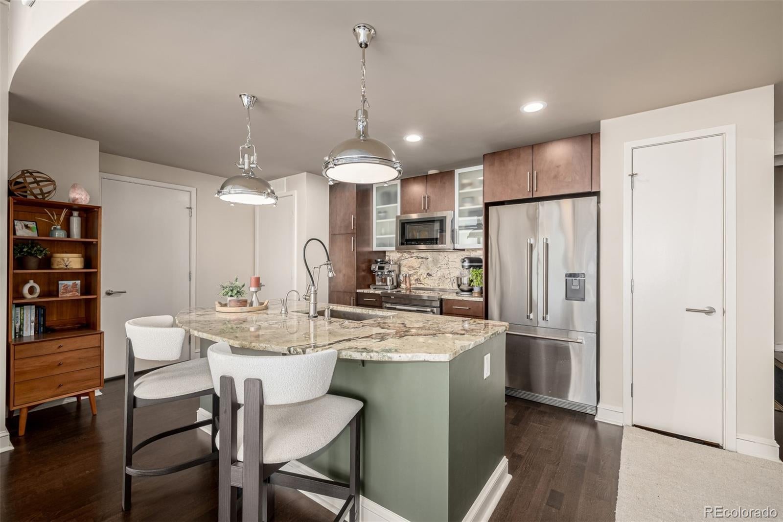 Experience elevated city living in this stunning 1 bedroom/1bathroom condo with incredible skyline views! The welcoming entrance foyer opens to a sophisticated interior featuring high ceilings, engineered hardwood floors, and floor-to-ceiling glass that floods the home with natural light. Enjoy the automatic blinds throughout this stunning residence. The open kitchen is a chef’s delight with custom granite counters, upgraded stainless steel appliances, and a breakfast bar island perfect for casual dining or entertaining. Bright bedroom offers a serene retreat with a walk-in closet, while the bathroom showcases a glass-enclosed tub/shower combo and modern finishes. A stacked washer and dryer adds everyday convenience. The charming balcony is perfect for enjoying fresh air and amazing mountains/city views. This condo also includes a reserved deeded parking space (desirably located on level 2) and access to resort-style amenities such as a pool, hot tub, club room, movie theater and gym. The location is unbeatable! The building sits within walking distance to 16th Street Mall, DCPA, Sculpture Park on Speer and all the amazing restaurants on Larimer Square. One amazing perk of owning this unit - enjoy access to the penthouse SkyClub lounge high atop the 42-story SPIRE.