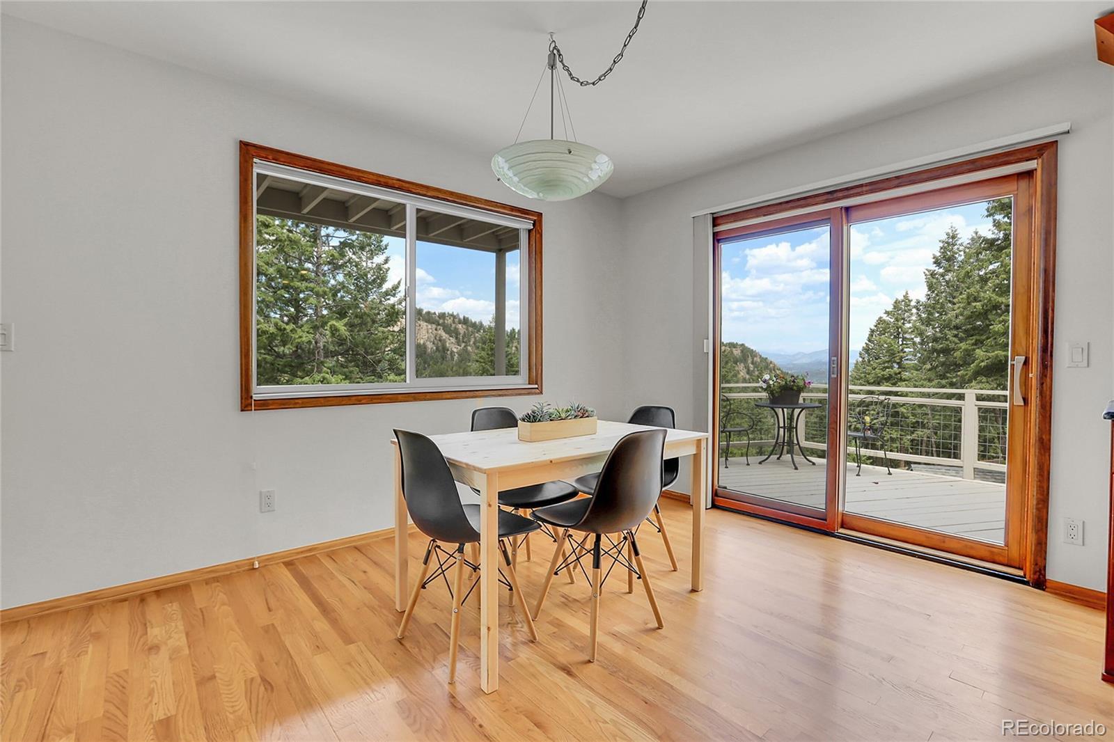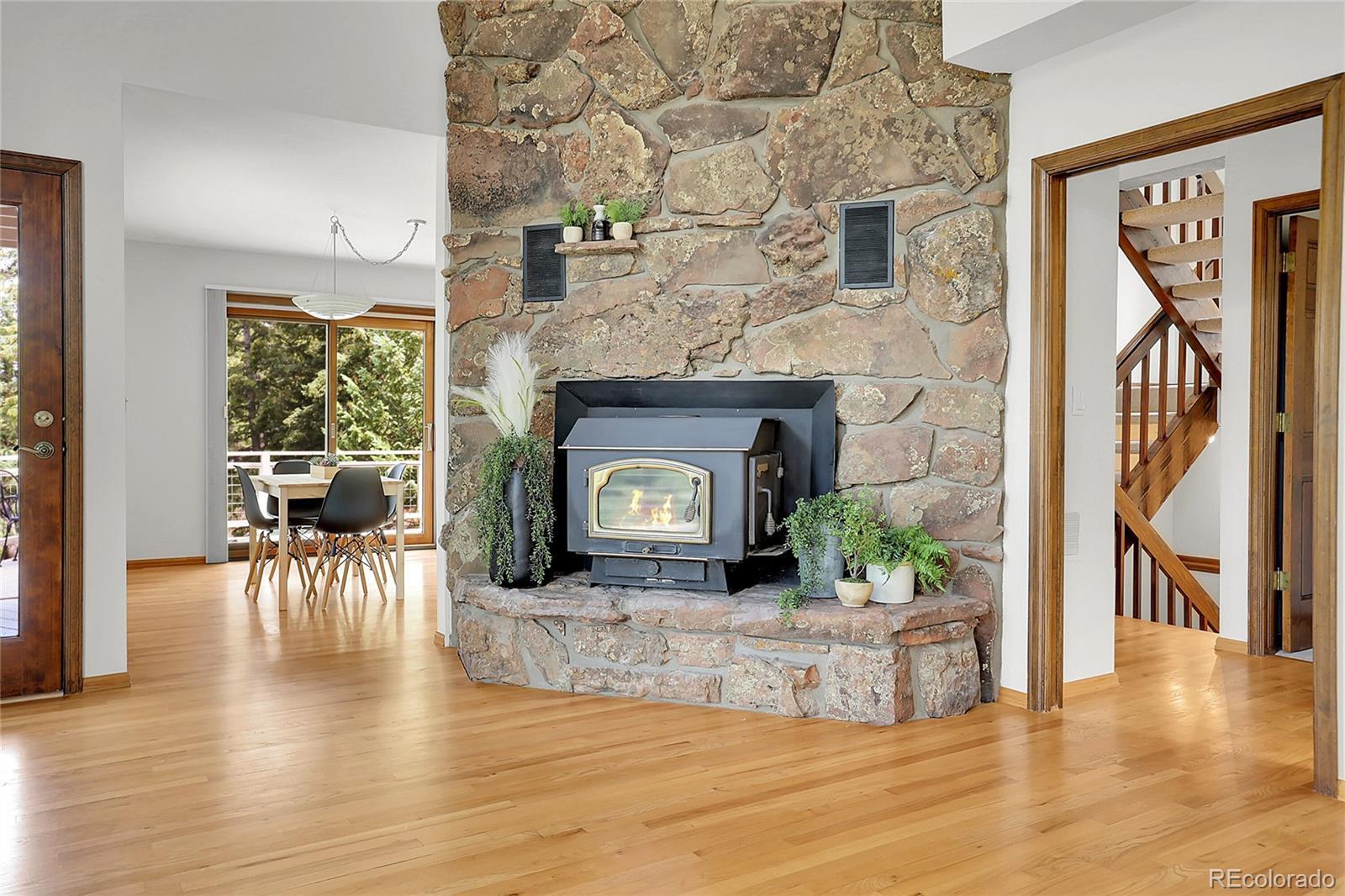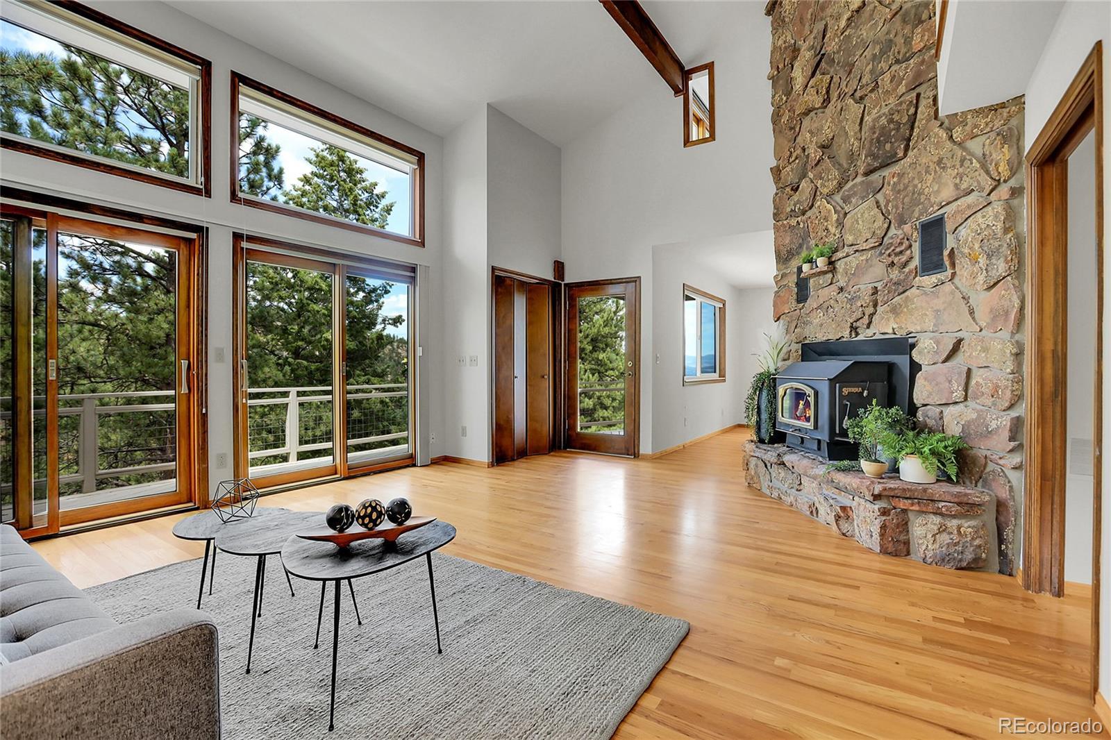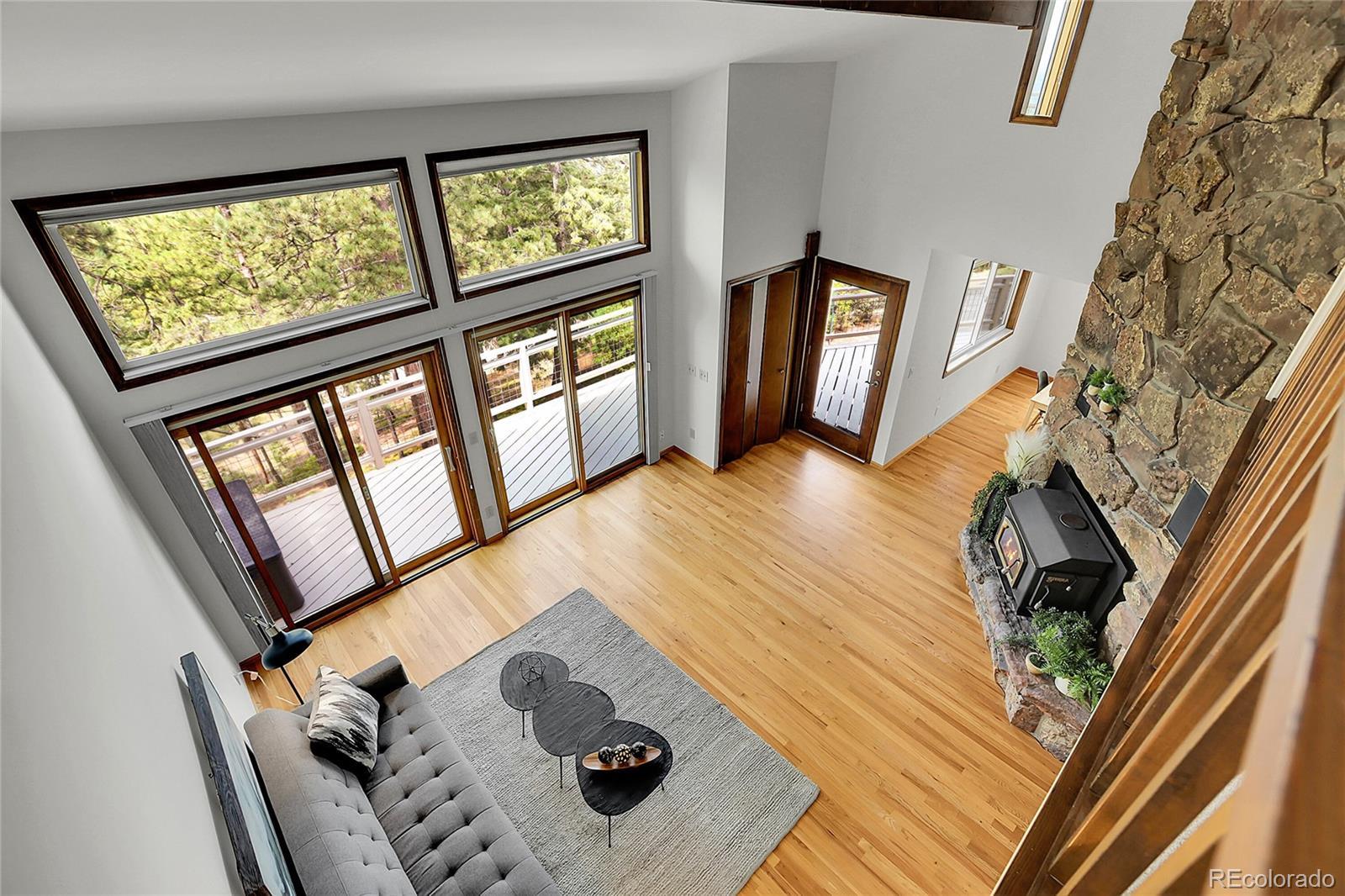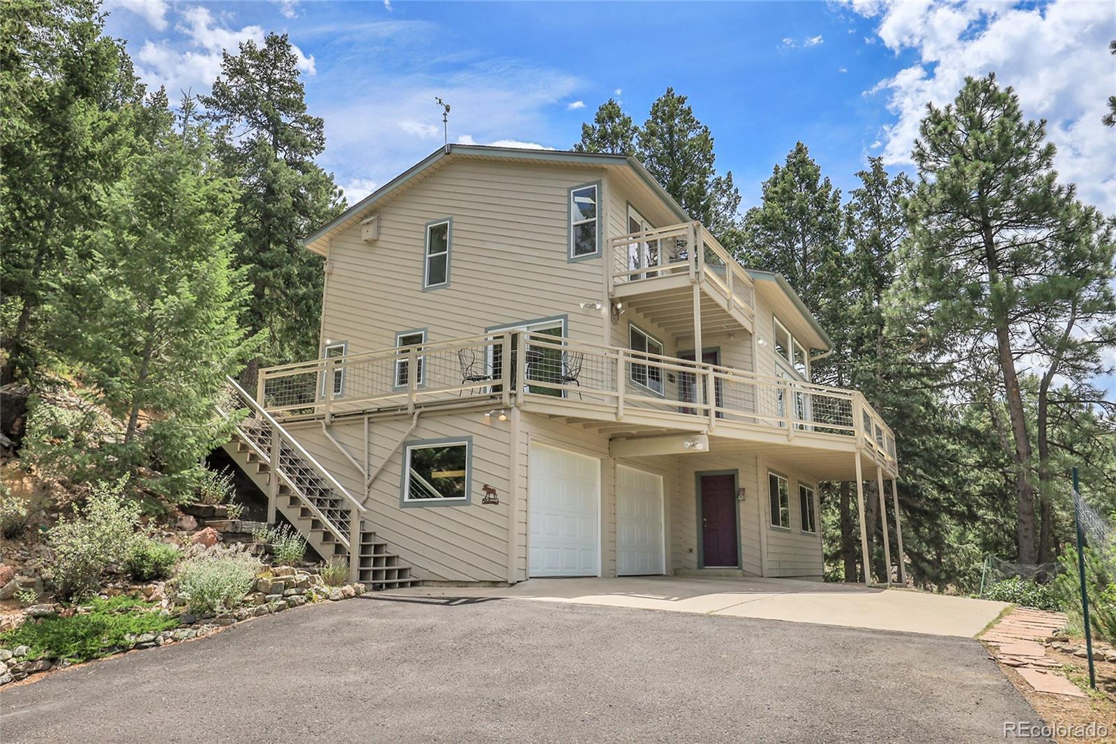 2/1 Rate Buy Down Offered! Obtain a savings of over $900/mo the 1st year! Enjoy privacy, nature, and ease of living in this a well-cared-for mountain retreat. Nestled on almost 4 acres with snowcapped views, this thoughtfully updated home offers the best of Colorado living—quiet surroundings, big skies, & frequent wildlife all just minutes to neighborhood amenities. A paved driveway & easy year-round access take you to this lovely home. Step onto the expansive deck – whether you want sun or shade, you will enjoy beautiful outdoor living with complete privacy & lovely views. Inside find hardwood flooring & a gorgeous remodeled kitchen complete with gas stove, pantry, & cherry cabinetry with the latest features. The lofted living room has a stone fireplace, new paint, plentiful windows to take in the sunshine, & exteriors doors to the deck. Radiant in-floor natural gas heat keeps the home toasty. The primary suite has new carpet, walk-in closet & its own private coffee deck to greet the day. On the lower walk-out level, find a cozy family room w/ private entrance, which could make a 4th bedroom or mother-in-law suite. The oversized garage features a large workbench & plentiful storage. Newer roof, smart thermostats & high speed internet make living here a breeze. Natures creatures abound here, as this 4 acre property has been lovingly cared for with virtually no noxious weeds, no chemicals used, and water features that attract the deer, fox and elk. Walk the trail to above the home for even bigger views & great sunsets! This delightful neighborhood includes amenities such as a 20+ acre common area, fishing pond, tennis/pickleball courts, play area, volleyball court, horse stable, & rentable barn for events. Lots of community gatherings too. It’s just 9 minutes to Hwy 285 for a quick trip to Denver, and just 15 minutes to downtown Evergreen and close proximity to a myriad of trails to hike and bike. Video, 3D walk thru, & more photos at: www.6684OlympusDrive.com