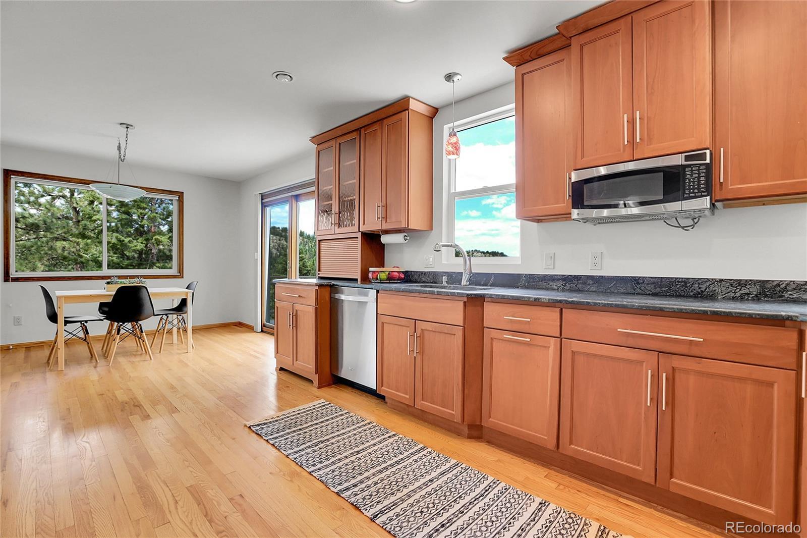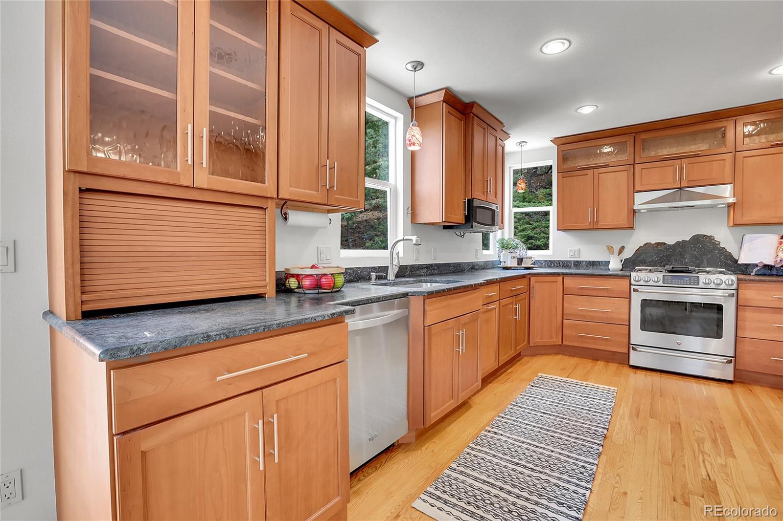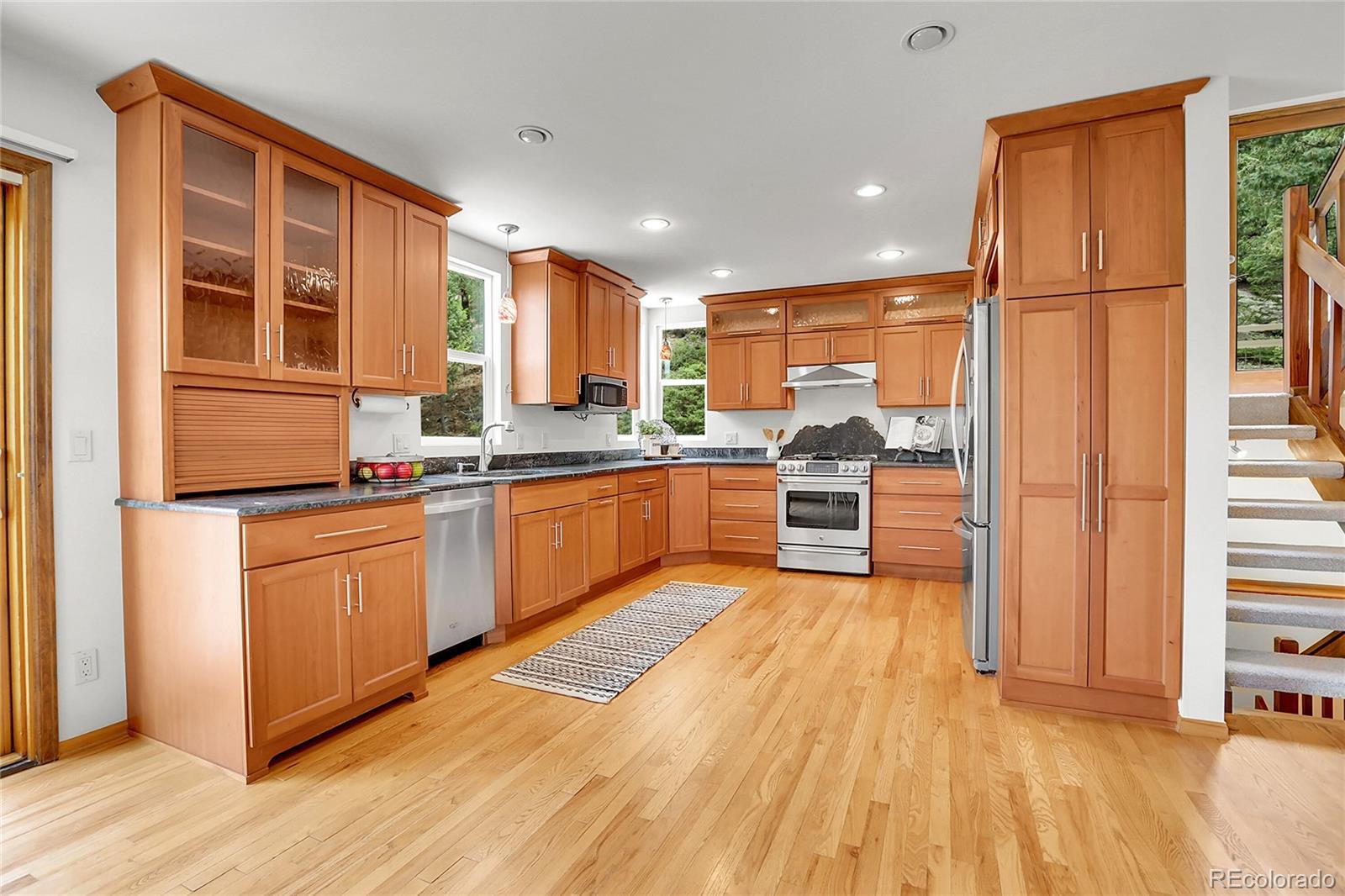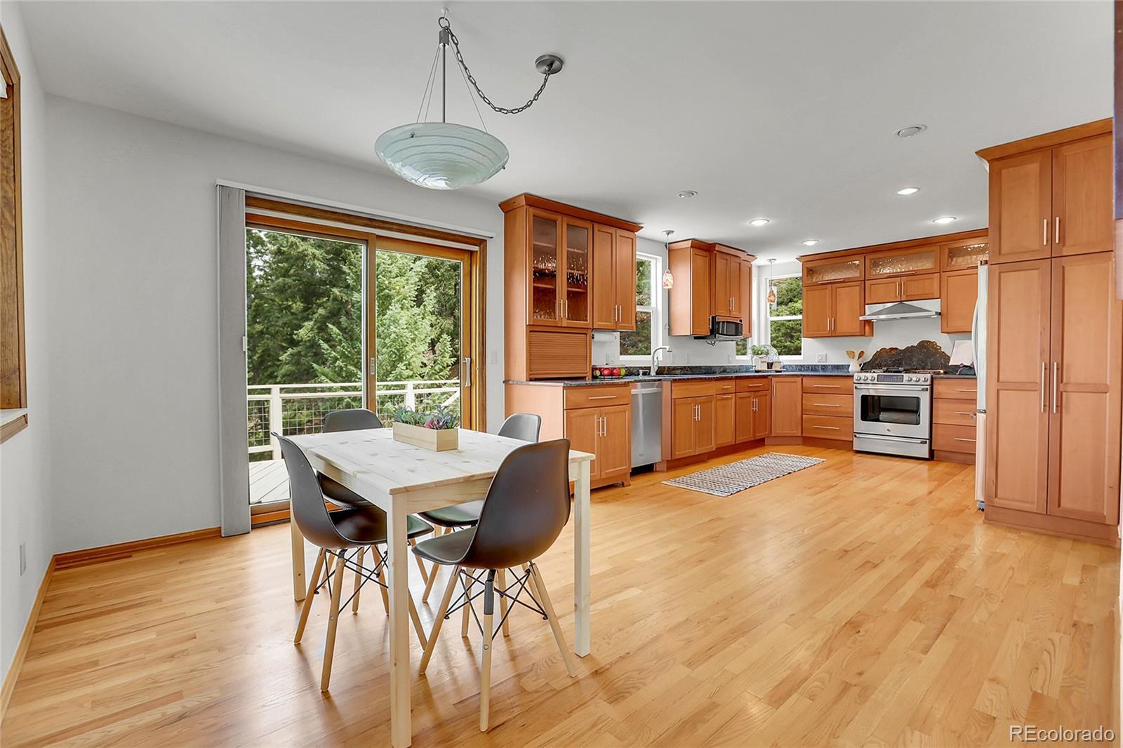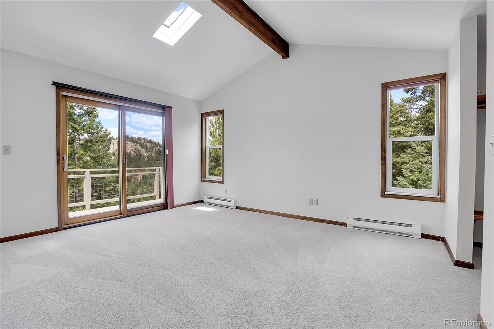 2/1 Rate Buy Down Offered! Obtain a savings of over $900/mo the 1st year! Enjoy privacy, nature, and ease of living in this a well-cared-for mountain retreat. Nestled on almost 4 acres with snowcapped views, this thoughtfully updated home offers the best of Colorado living—quiet surroundings, big skies, & frequent wildlife all just minutes to neighborhood amenities. A paved driveway & easy year-round access take you to this lovely home. Step onto the expansive deck – whether you want sun or shade, you will enjoy beautiful outdoor living with complete privacy & lovely views. Inside find hardwood flooring & a gorgeous remodeled kitchen complete with gas stove, pantry, & cherry cabinetry with the latest features. The lofted living room has a stone fireplace, new paint, plentiful windows to take in the sunshine, & exteriors doors to the deck. Radiant in-floor natural gas heat keeps the home toasty. The primary suite has new carpet, walk-in closet & its own private coffee deck to greet the day. On the lower walk-out level, find a cozy family room w/ private entrance, which could make a 4th bedroom or mother-in-law suite. The oversized garage features a large workbench & plentiful storage. Newer roof, smart thermostats & high speed internet make living here a breeze. Natures creatures abound here, as this 4 acre property has been lovingly cared for with virtually no noxious weeds, no chemicals used, and water features that attract the deer, fox and elk. Walk the trail to above the home for even bigger views & great sunsets! This delightful neighborhood includes amenities such as a 20+ acre common area, fishing pond, tennis/pickleball courts, play area, volleyball court, horse stable, & rentable barn for events. Lots of community gatherings too. It’s just 9 minutes to Hwy 285 for a quick trip to Denver, and just 15 minutes to downtown Evergreen and close proximity to a myriad of trails to hike and bike. Video, 3D walk thru, & more photos at: www.6684OlympusDrive.com