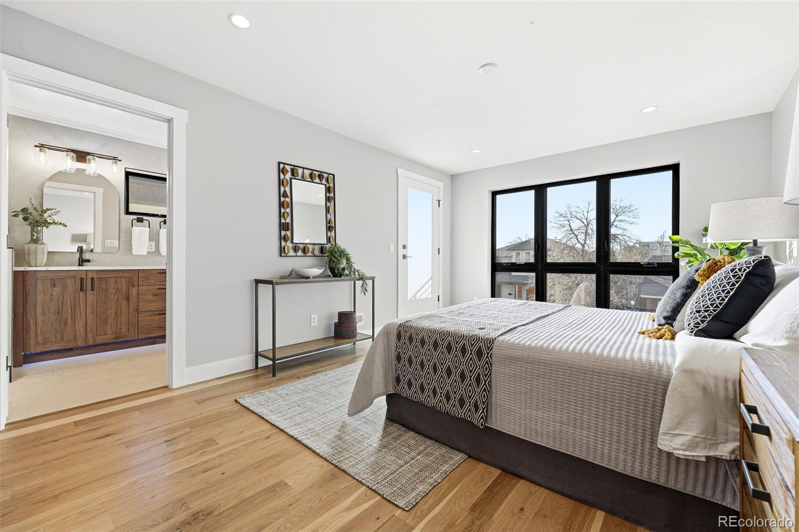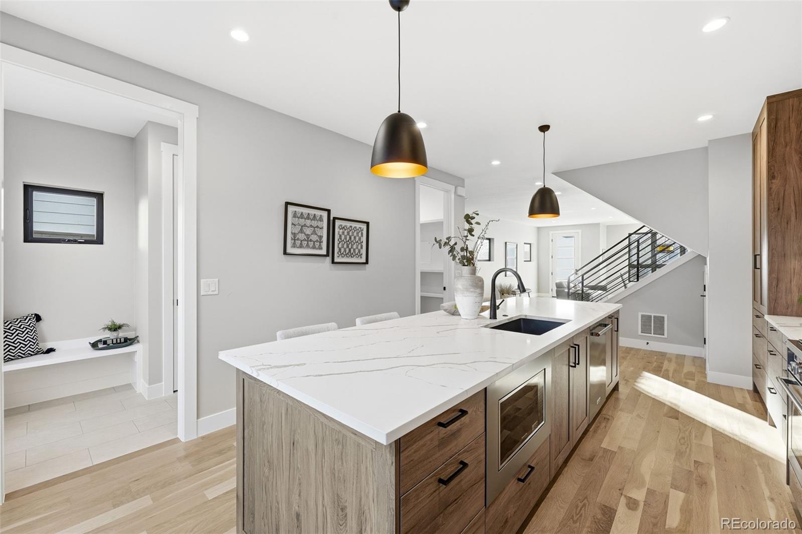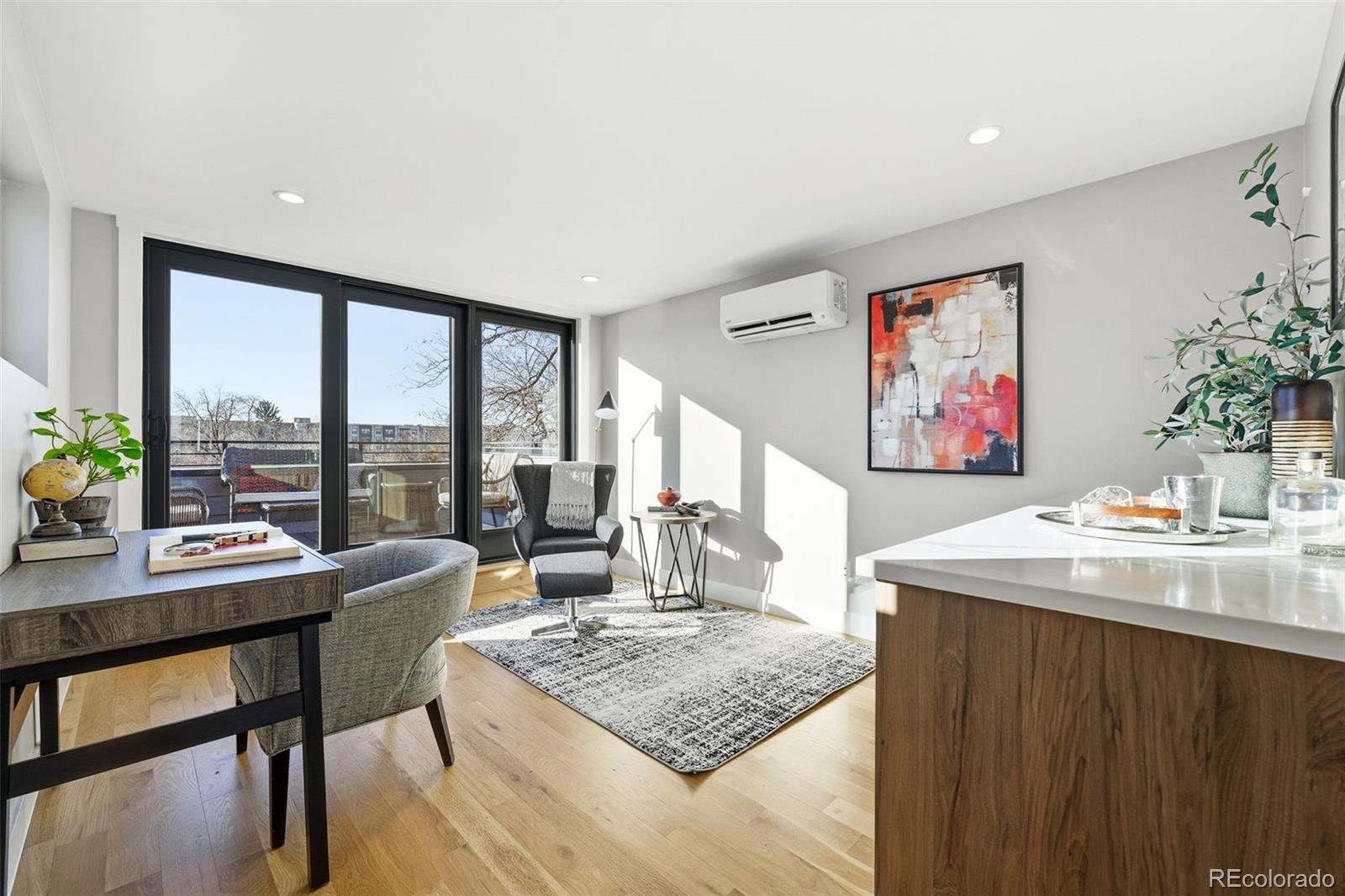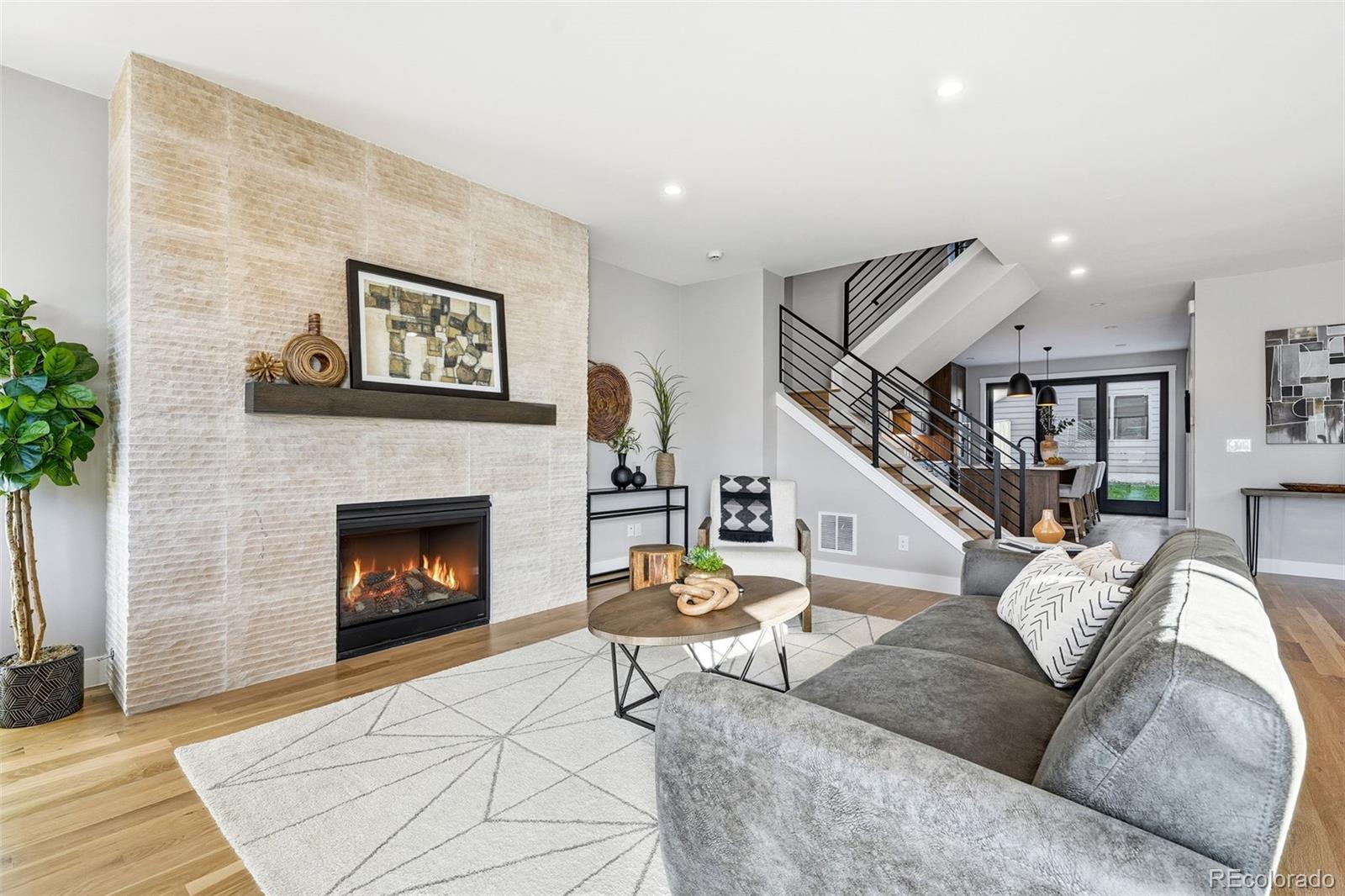 Modern Duplex with Stunning Mountain Views in vibrant Platt Park/Rosedale neighborhood. Meticulously crafted modern duplex, designed with both style and sustainability in mind. Just steps away from the heart of South Broadway and Pearl Street, known for its eclectic mix of boutiques, restaurants, and parks. A perfect blend of cutting-edge design and eco-conscious features that prioritize energy efficiency and sustainability. Main floor features a bright and airy open concept, highlighted by soaring 9-foot ceilings and sliding glass doors that flood the space with natural light. Gourmet kitchen, with a large island, is a chef’s dream, equipped with quartz counters, high-end tile, pendant lighting, and stainless steel appliances. Living room boasts an open concept floorplan with seamless transition to the private back patio extending your living space outdoors. Dining room is spacious and offers the ideal entertaining floor plan. Every inch of this home is thoughtfully designed, with custom stained hardwood floors, sophisticated tile selections, and modern lighting that add character and warmth. Primary suite is a luxurious retreat, featuring an oversized walk-in closet, double vanity, and a spacious shower and freestanding soaker tub. Two additional bedrooms and a full bath, along with a conveniently located walk-in laundry room, complete the second floor. Third floor is the perfect space to unwind, featuring a sitting room, wet bar, 4th Bedroom or office, a full bath, and an incredible rooftop deck with views of the mountains. The versatile bonus room can be tailored to your needs—whether you want a home office, gym, or private place to watch TV or read a book. There is no shortage of space for all your belongings with a two-car garage with 8' doors for easy access for you snowboards/skis or Thule racks. Prime location with a mountain view.