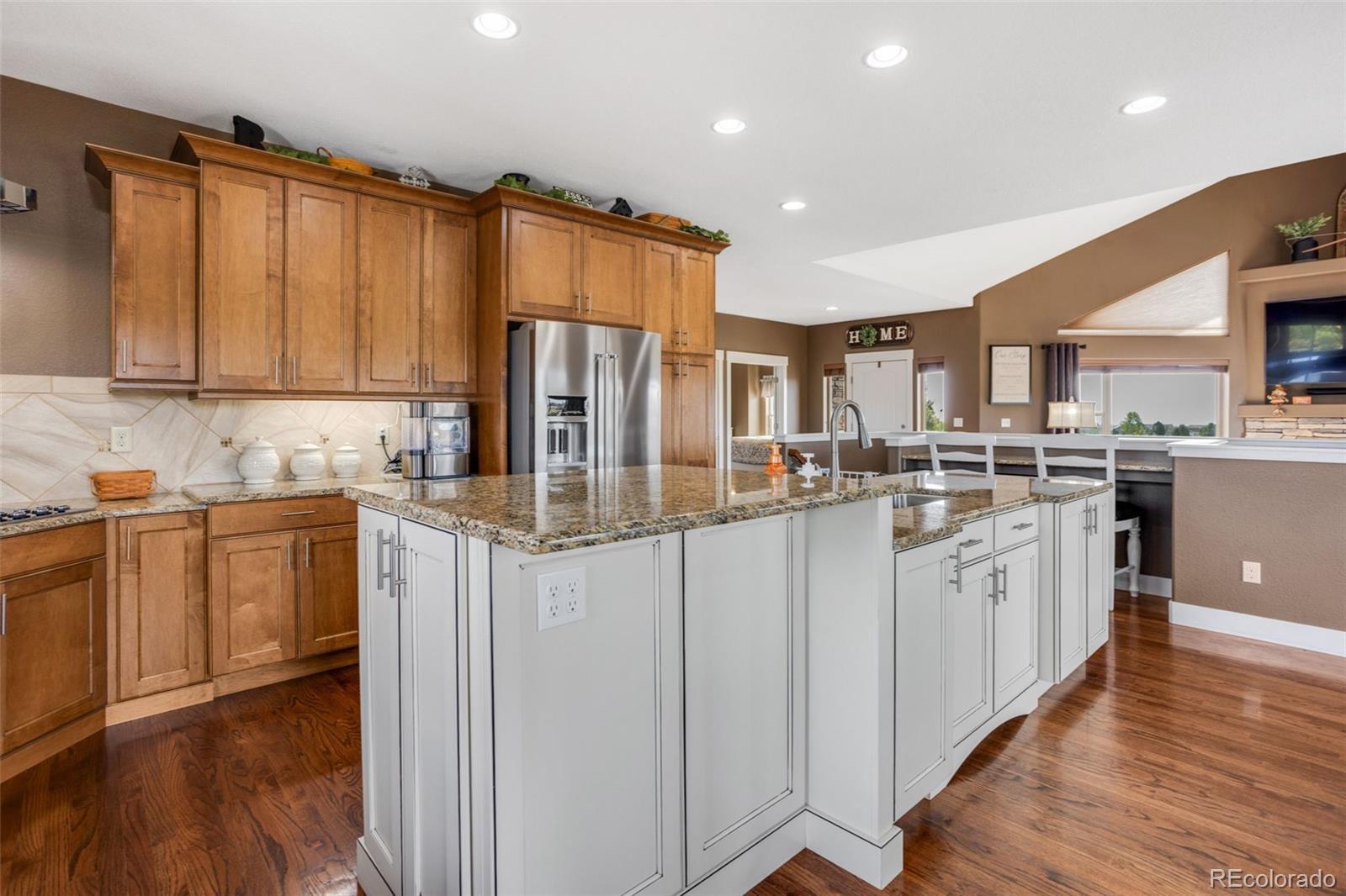 This magnificent home was featured in the 2013 HBA Parade of Homes! The Lot is huge - over an acre! The views you get of the Mountain range from the deck and Great room are breathtaking! Upon entering this custom home you are greeted with beautiful hardwood floors, custom paint and an open floor plan. The living room features vaulted ceilings and a gas fireplace. The gourmet kitchen features granite countertops, stainless steel appliances, a huge island, soft closing undermount cabinet drawers, loads of storage, roll-out pantry shelving, etc... The main level has a spacious Master suite with a 5 piece bath and walk-in closet. There are 2 additional bedrooms on the main floor and a full bath. The laundry/mud room offers built-ins and a sitting area/drop zone. The finished walk-out basement features 9 ft. ceilings, wet bar and a pre-wired media room with speakers. There is a full bath 4th bedroom and a 5th bedroom which is also a second master bedroom with a walk-in closet and its own adjoining bath. The huge oversized garage has hot and cold water, built-in storage and is large enough for 5 cars, or 4 cars and a workshop. Enjoy the spacious backyard that backs to open space and trails. You won't feel crowded here! There is also a large shed, covered deck, custom patio work, permanent exterior holiday lighting system, basketball court and auto sprinkler system. This yard is made for enjoying the outdoors and entertaining. This home would make a great multigenerational home.