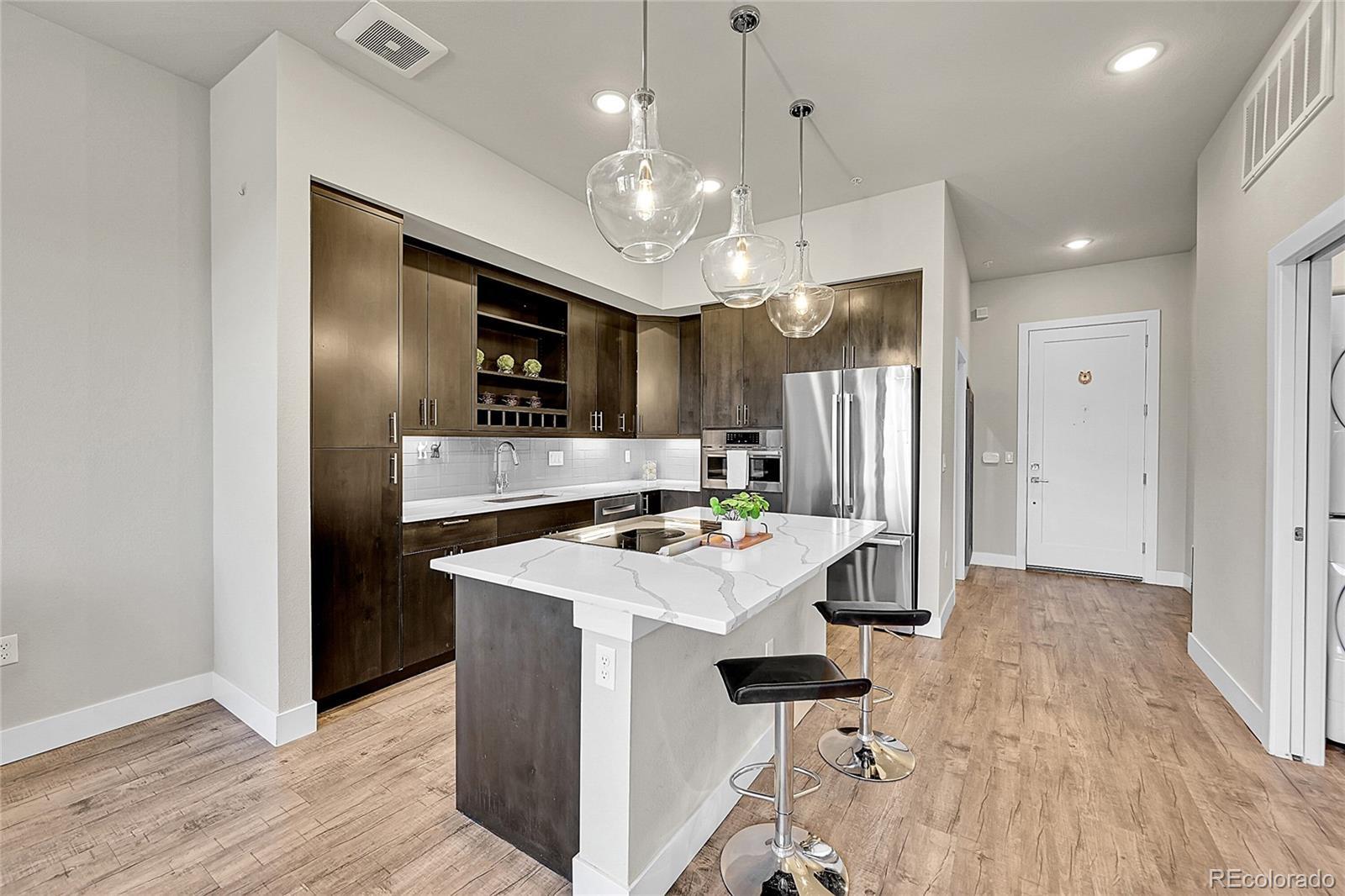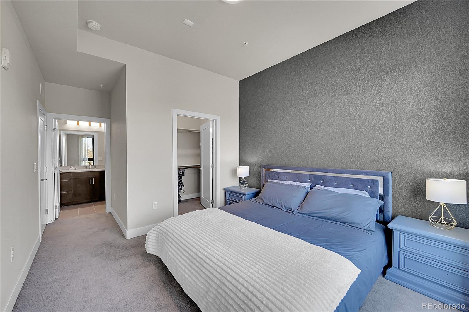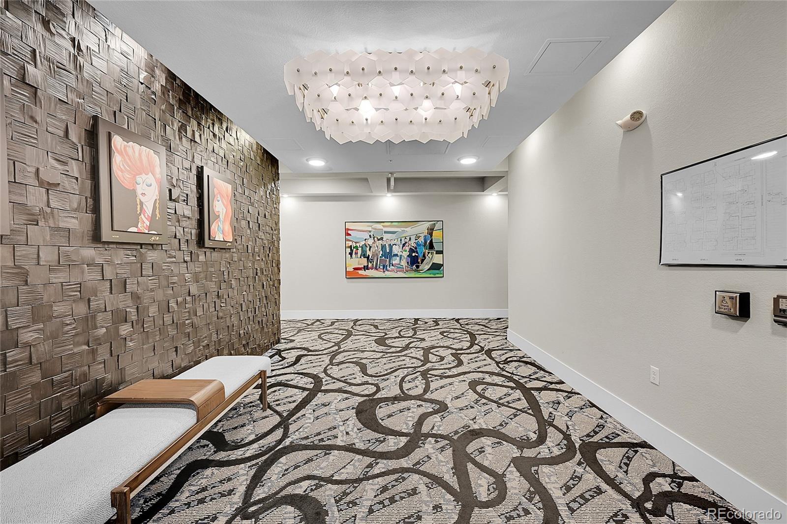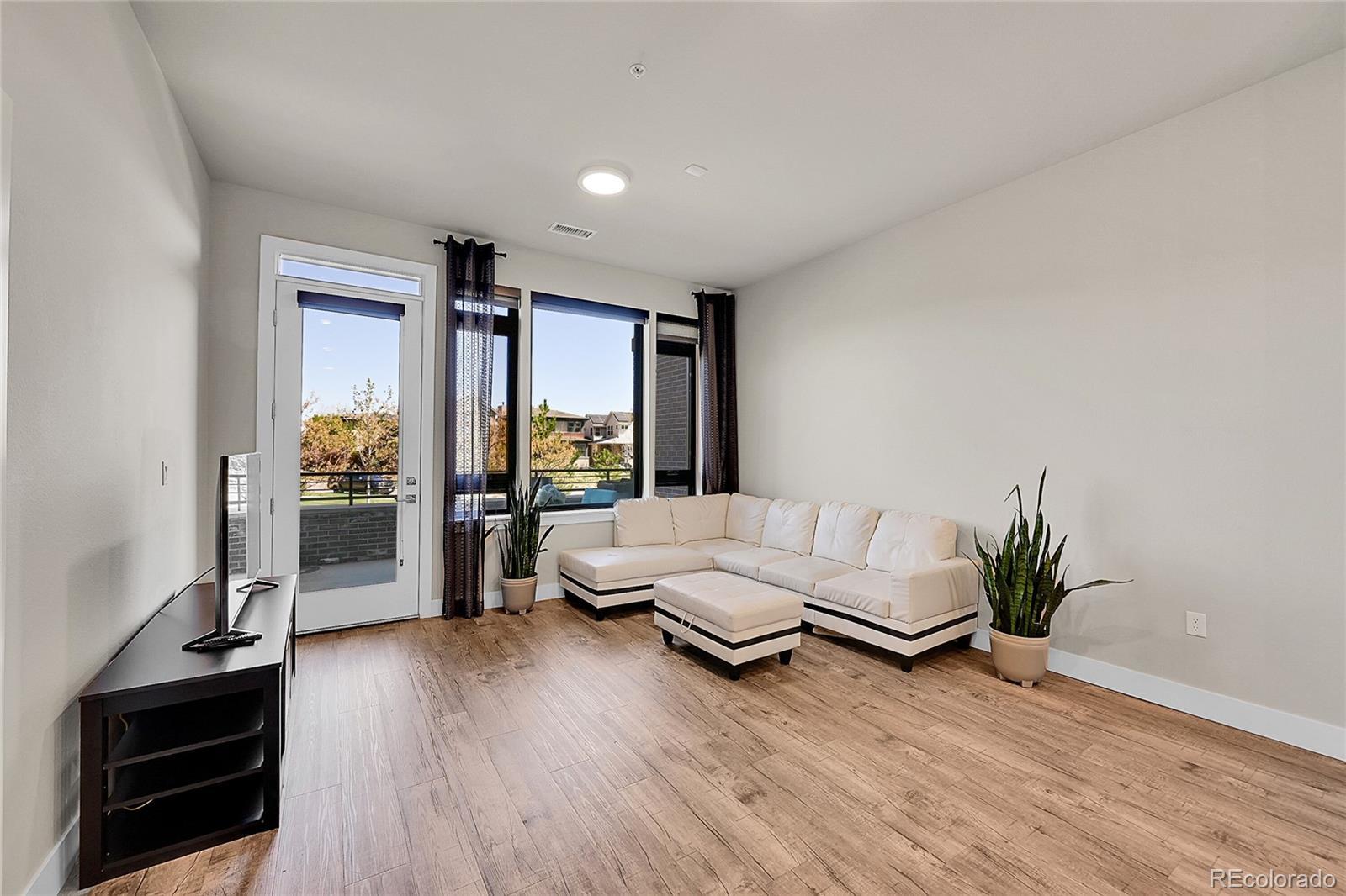 Luxury Condominium in Denver's Lowry neighborhood with an open floor layout and numerous upgrades! This is a great opportunity for a low maintenance living. Previously a builder's model, this home has all the bells and whistles! 10' ceilings and floor to ceiling windows allow maximum natural light exposure and create the perfect space you can call home. Upgraded Espresso kitchen includes thoughtful storage and sleek finishes. Bosch gourmet appliance package with induction and convection cooking, soft close cabinets, 14" deep upper cabinets & deep drawer and pantry storage, quartz countertops and modern style tile backsplash! Private primary suite includes an accent wall, luxury bath finishes and large walk-in closet. Spacious flex room can be used as an office, a flex space or a non-conforming bedroom. This room features built-ins for the office and a hide-a-way bed so you have options to choose from! Endless upgrades also include decorative curtains, window coverings and built-in shelving/storage in the laundry room! Enjoy quick and easy access to your 2-car underground garage parking and storage space! EV charges available in the garage. Your front door is just couple steps away from the main entrance and the elevator to the garage and storage space. Enjoy your spacious covered patio looking out to the beautiful private park with art galore! Such as beautiful and peaceful space for taking a walk or a cozy read outside! The building has secure entrance and is just steps to Crestmoor Park to the West and new Boulevard Shops and restaurants to the East, so much within walking distance to enjoy! Additionally, drive just 3 mins to Lowry Town Center with a mix of eateries, cafes, retails stores and shops, under 10 mins to Cherry Creek Shopping Center and within 30 mins to DIA. This home is a true gem! Welcome Home!