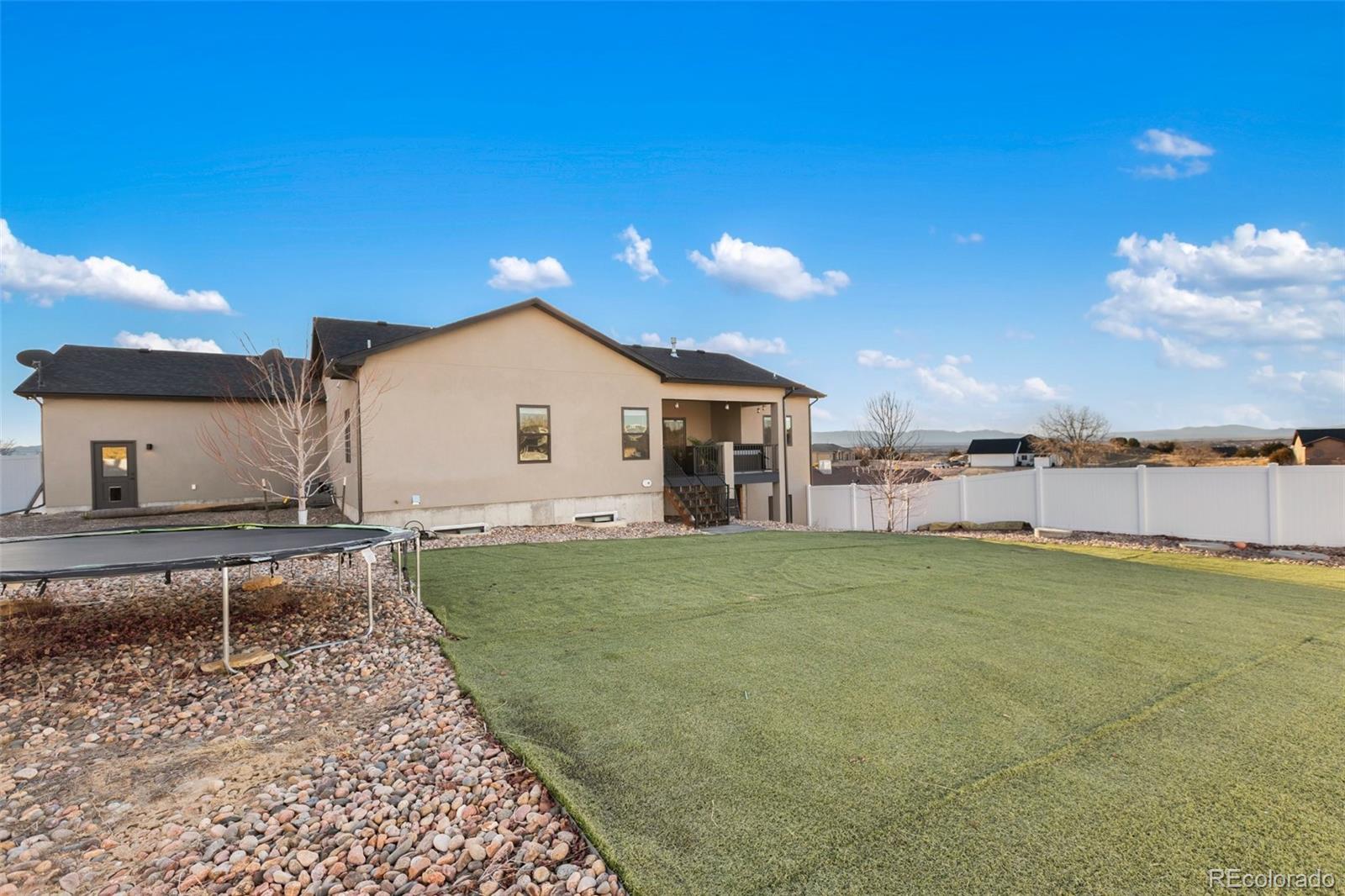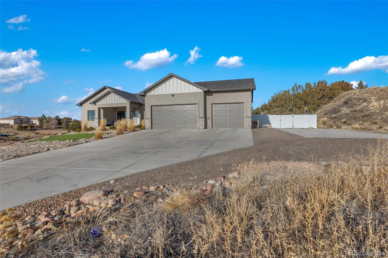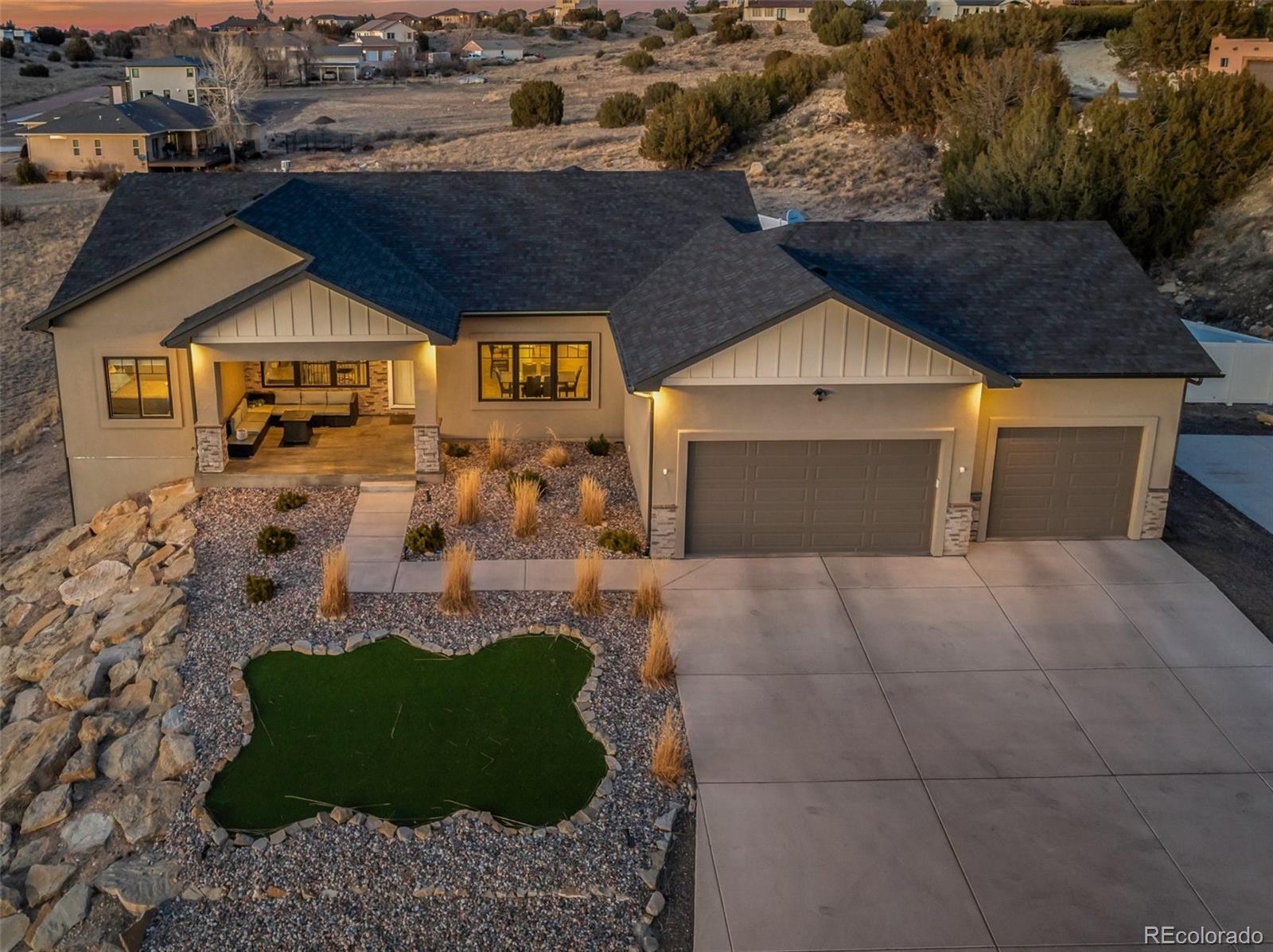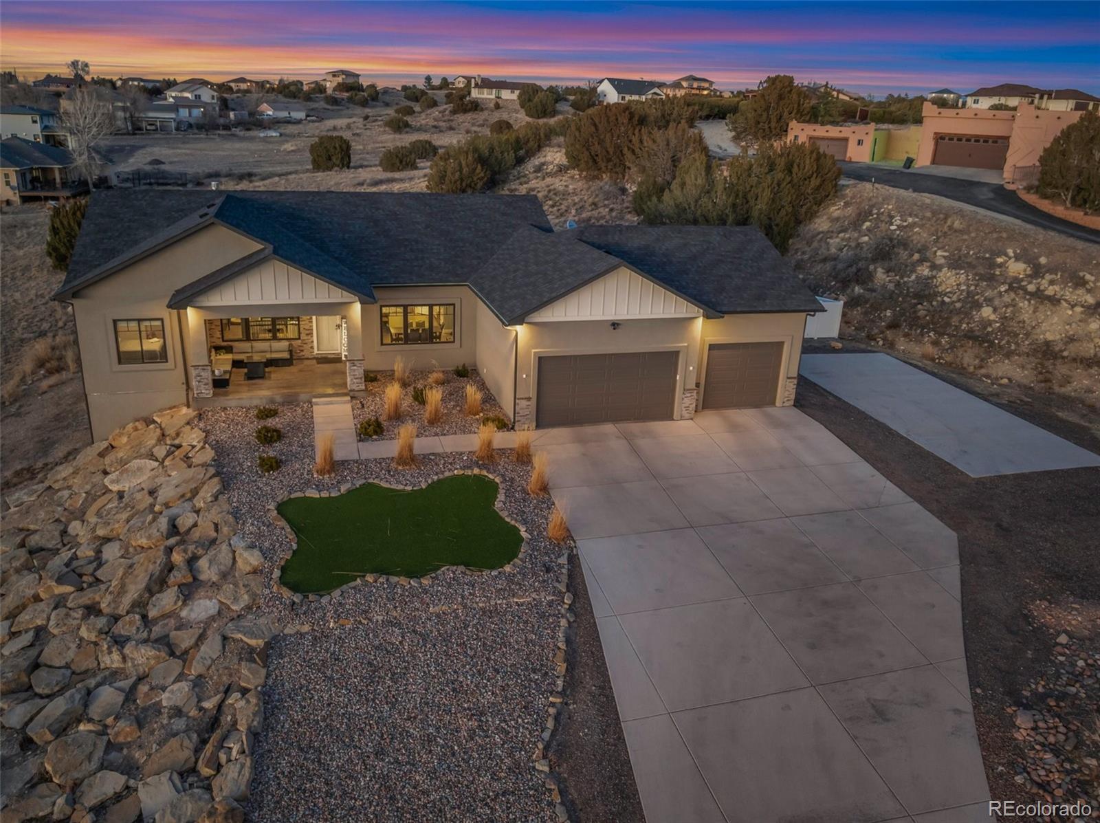 Your dream home is now available in Pueblo West! Prepare to fall in love with this gorgeous single-owner Liberty Point home, built in 2021 with 6 bedrooms, (plus office), 4 bathrooms, with over 4000 square feet, and an oversized 3-car attached garage! Perched high on a 1.21 acre parcel, with concrete driveway, RV parking, and excellent views of Pueblo Reservoir and the surrounding mountain ranges. Step inside to discover the airy and open-concept floor plan with lofted ceilings and a large gourmet kitchen with granite countertops, marble mosaic tile backsplash, stylish pendant and LED lighting, kitchen island with breakfast bar, durable laminate flooring, and a corner pantry. All stainless-steel kitchen appliances are included! Enjoy the sunny dining area, and the beautiful modern gas fireplace in the living room complete with mantle and stone hearth. The split-bedroom layout features a spacious primary bedroom suite, with a huge walk-in closet, 5-piece bath with separate soaking tub and roomy walk-in shower. Step outside to the back patio to enjoy the private backyard and stunning views, featuring water-friendly artificial grass and easy-to-maintain vinyl fencing. Sprinkler system is installed in the backyard if needed for a future lawn, and drip lines service the bushes in the xeriscaped front yard and trees in the back. More reasons to love this home - efficient Anderson windows with electric blinds, central air conditioning, Rinaii tankless hot water heater, stamped concrete covered porch, and granite in all bathrooms! Also features 9’ ceilings in the full basement with large family room, 3 more bedrooms, plus an office/work-out/bonus room (could be 7th bedroom, has egress, but no closet), and plenty of extra storage in the 519 sq ft unfinished utility/storage room. Come see for yourself—this home is in pristine, like-new condition, and is move-in ready for its next lucky owner!