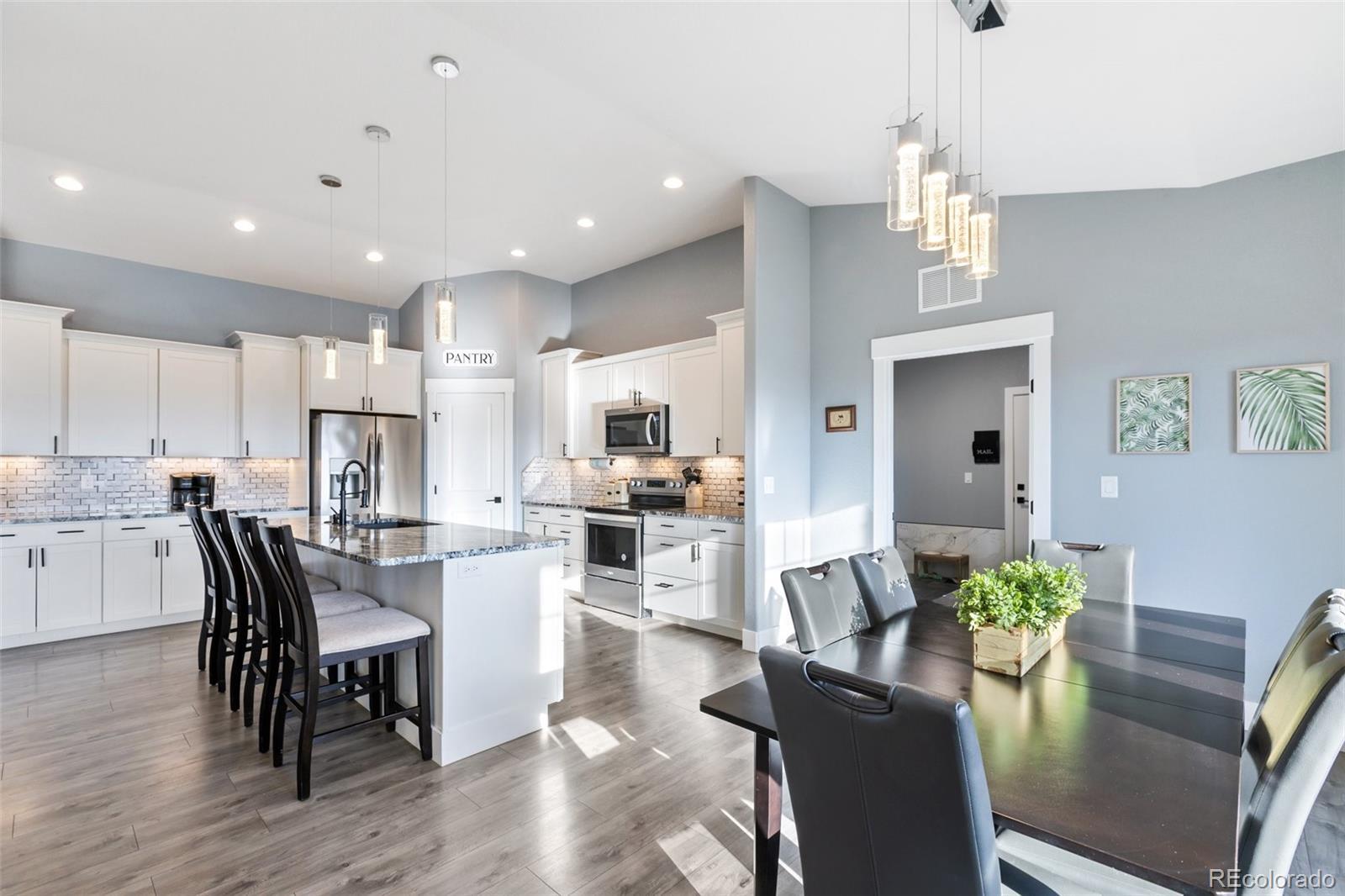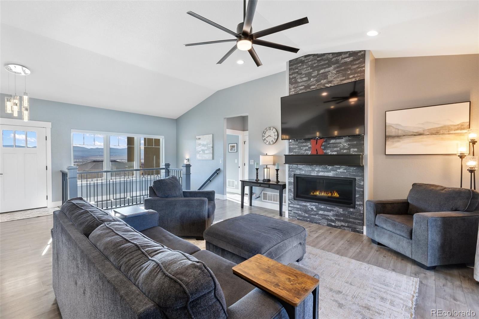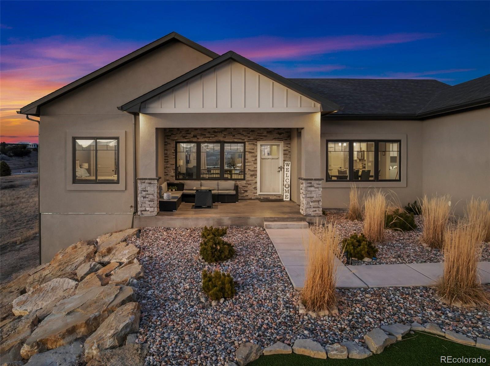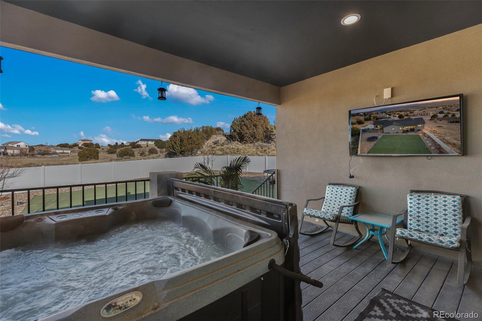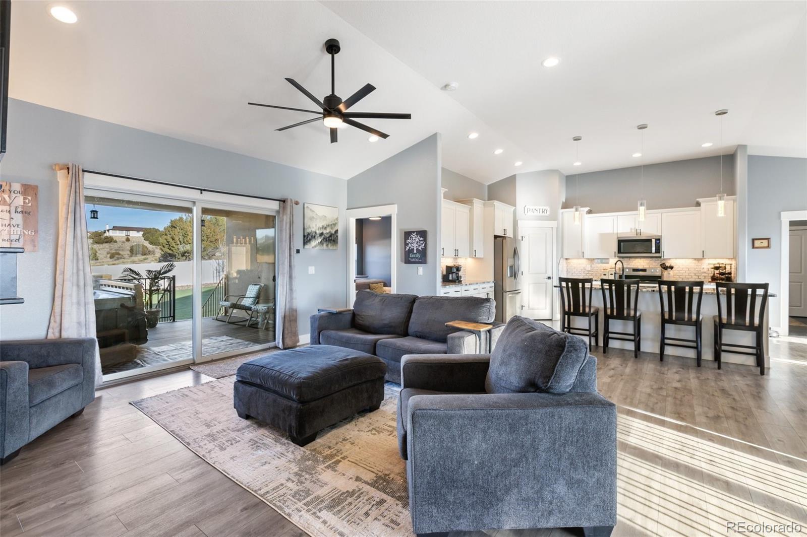 Your dream home is now available in Pueblo West! Prepare to fall in love with this gorgeous single-owner Liberty Point home, built in 2021 with 6 bedrooms, (plus office), 4 bathrooms, with over 4000 square feet, and an oversized 3-car attached garage! Perched high on a 1.21 acre parcel, with concrete driveway, RV parking, and excellent views of Pueblo Reservoir and the surrounding mountain ranges. Step inside to discover the airy and open-concept floor plan with lofted ceilings and a large gourmet kitchen with granite countertops, marble mosaic tile backsplash, stylish pendant and LED lighting, kitchen island with breakfast bar, durable laminate flooring, and a corner pantry. All stainless-steel kitchen appliances are included! Enjoy the sunny dining area, and the beautiful modern gas fireplace in the living room complete with mantle and stone hearth. The split-bedroom layout features a spacious primary bedroom suite, with a huge walk-in closet, 5-piece bath with separate soaking tub and roomy walk-in shower. Step outside to the back patio to enjoy the private backyard and stunning views, featuring water-friendly artificial grass and easy-to-maintain vinyl fencing. Sprinkler system is installed in the backyard if needed for a future lawn, and drip lines service the bushes in the xeriscaped front yard and trees in the back. More reasons to love this home - efficient Anderson windows with electric blinds, central air conditioning, Rinaii tankless hot water heater, stamped concrete covered porch, and granite in all bathrooms! Also features 9’ ceilings in the full basement with large family room, 3 more bedrooms, plus an office/work-out/bonus room (could be 7th bedroom, has egress, but no closet), and plenty of extra storage in the 519 sq ft unfinished utility/storage room. Come see for yourself—this home is in pristine, like-new condition, and is move-in ready for its next lucky owner!