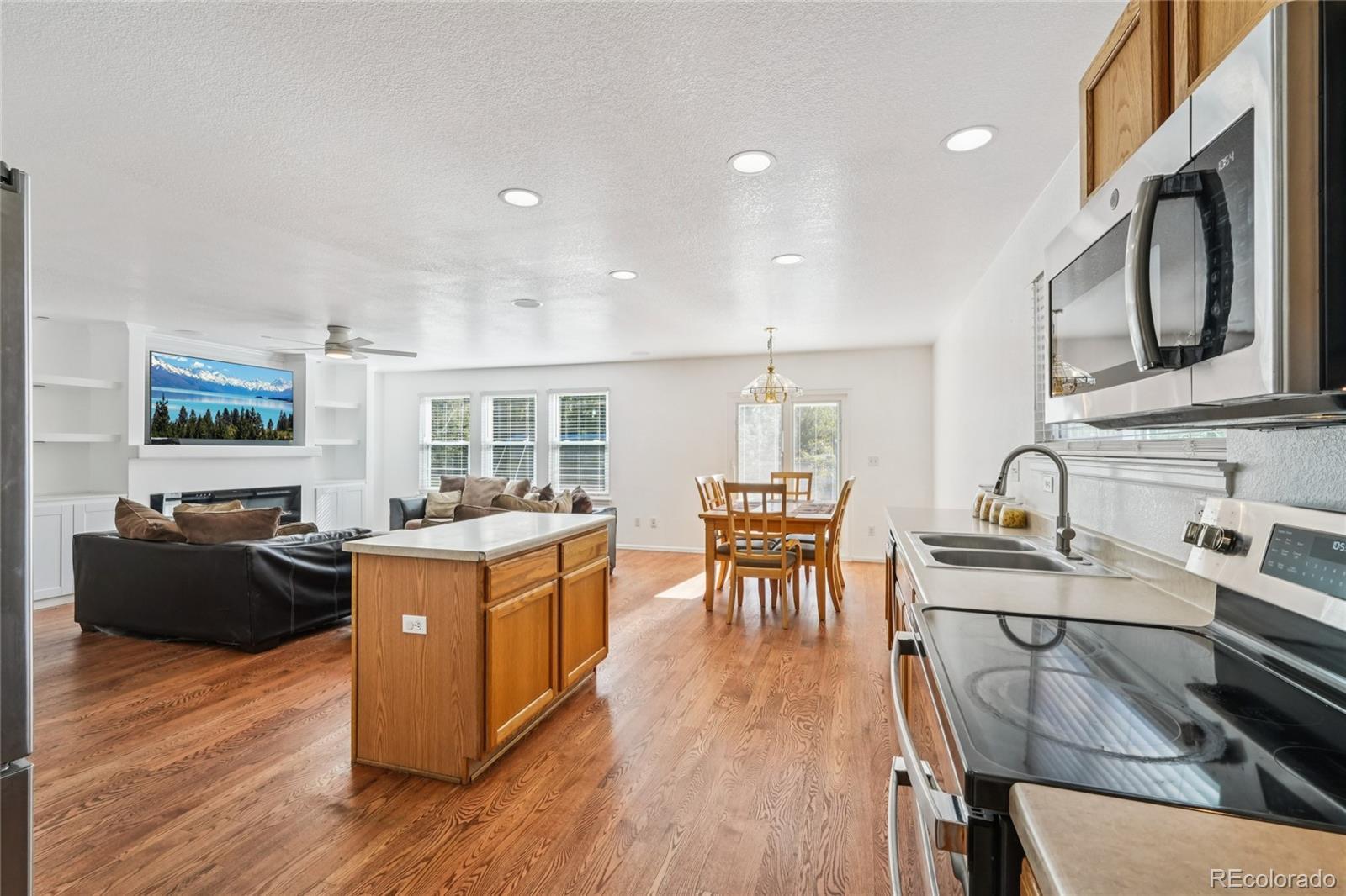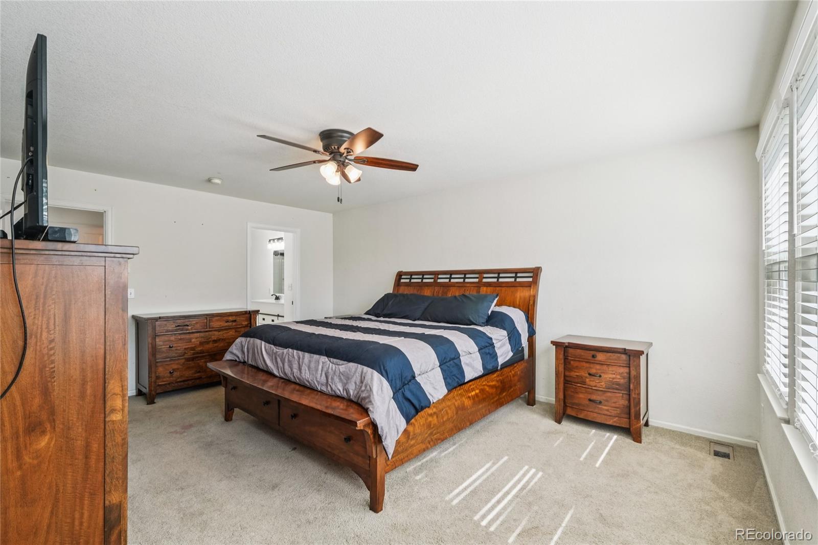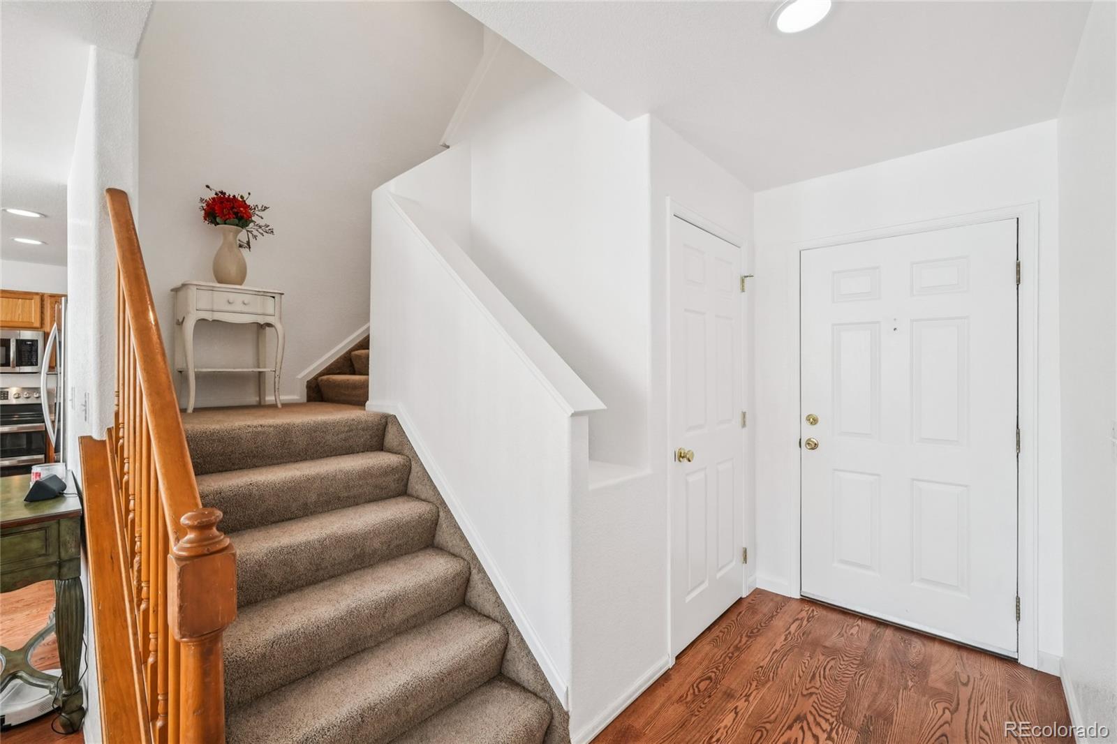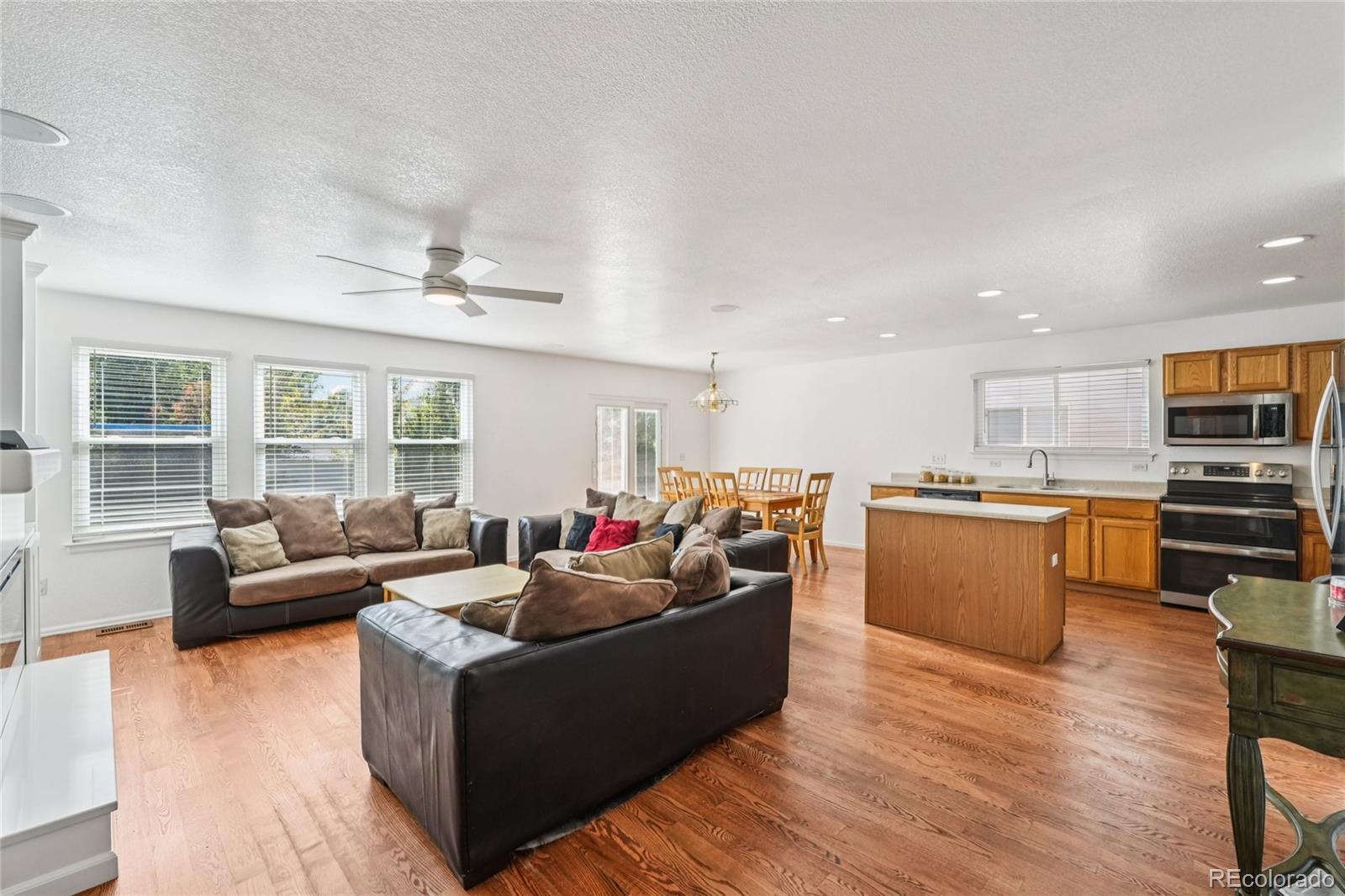 Welcome to this spacious and inviting home in the desirable Villages North community of Thornton! From the welcoming front porch, step into an open main living area designed for comfort and connection. Real hardwood floors gleam throughout the main level. The bright living room features a cozy fireplace surrounded by built-in shelving and flows seamlessly into the dining area and kitchen. The kitchen is well-equipped with stainless steel appliances and a walk-in pantry area that includes the laundry and direct access to the attached two-car garage. A sliding glass door opens to the backyard patio, making indoor-outdoor living and entertaining a breeze. The main-floor primary suite offers the perfect retreat, featuring a spacious layout, private en-suite bath, and generous closet space—ideal for convenient single-level living. A half bath is also located on the main floor for guests. Upstairs, you’ll find four large bedrooms and a full bath, providing plenty of room for your needs. A spacious unfinished basement offers endless possibilities for future expansion and a separate crawl-space can be used for storage. Step outside to enjoy a fully fenced backyard with thoughtful landscaping, green space, and a sunny patio—perfect for morning coffee or evening barbecues. Recent updates include a newer roof, windows, and water heater for added comfort and peace of mind. Located just down the street from Aspen Park and its playground, this home sits in a quiet, friendly neighborhood close to shopping, dining, downtown, and the RTD light rail for easy commuting. Spacious and comfortable, this home offers the ideal blend of convenience, community, and Colorado living! Carpet credit to be provided by seller.