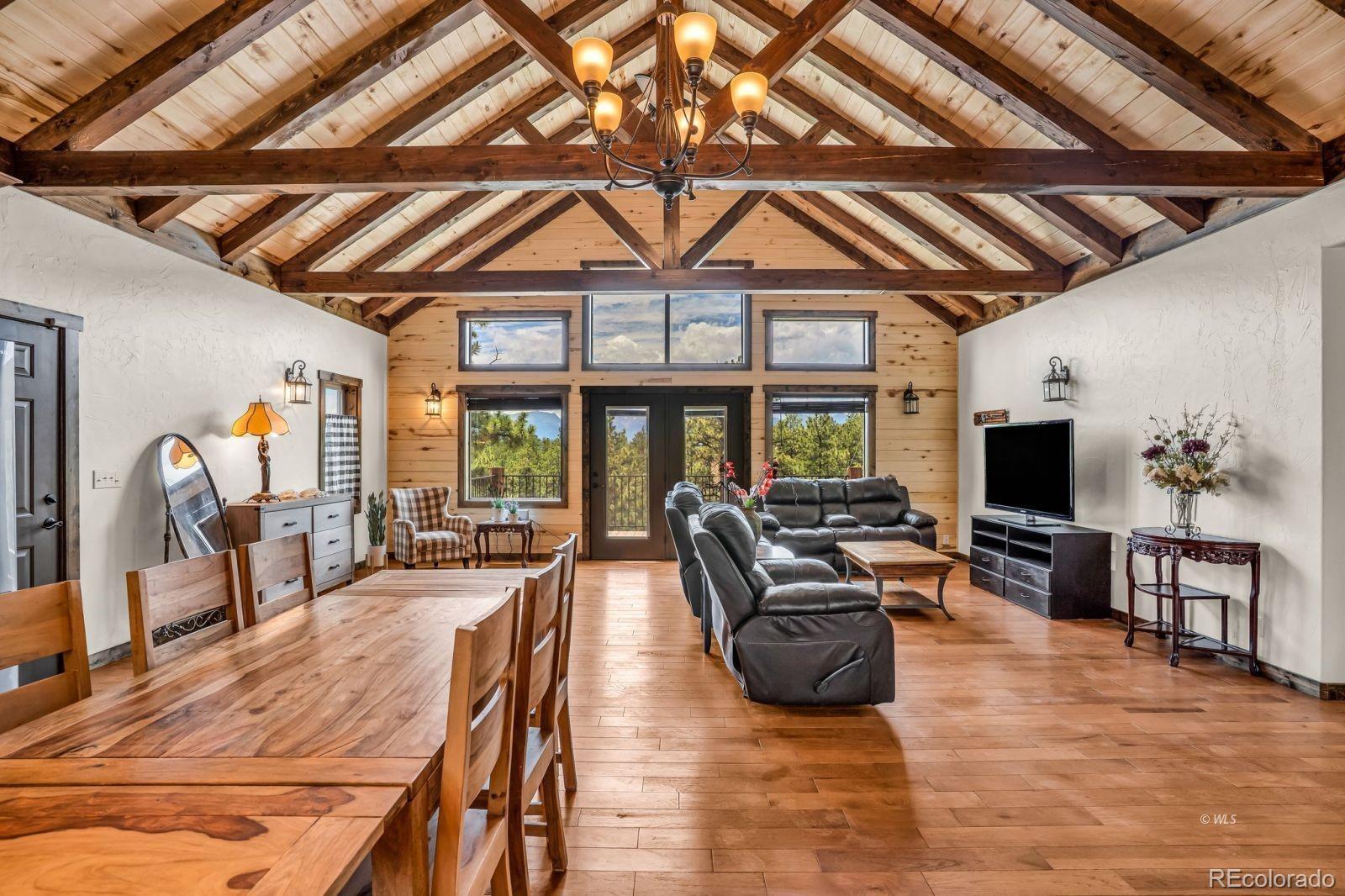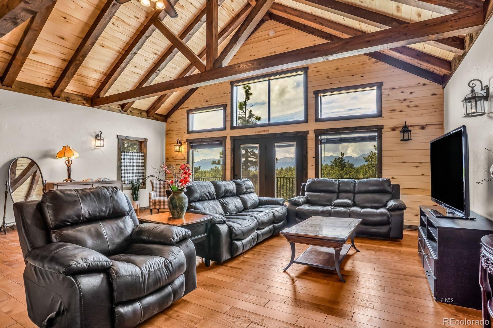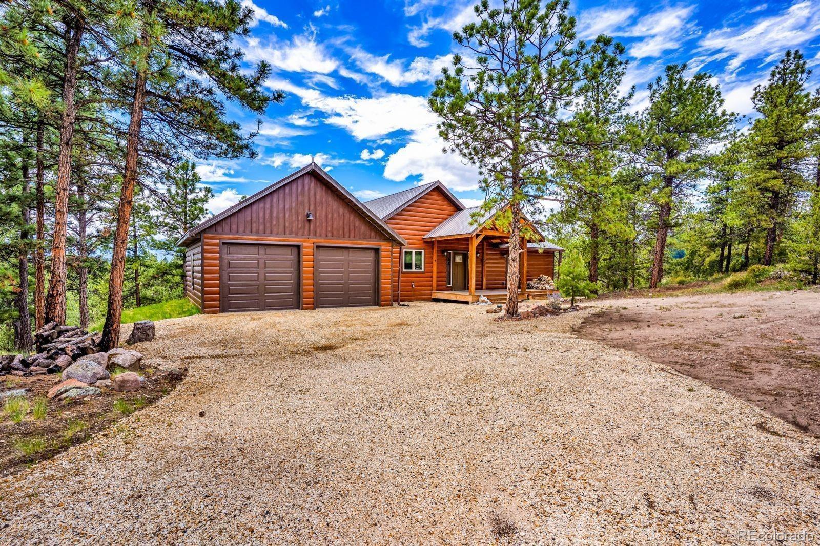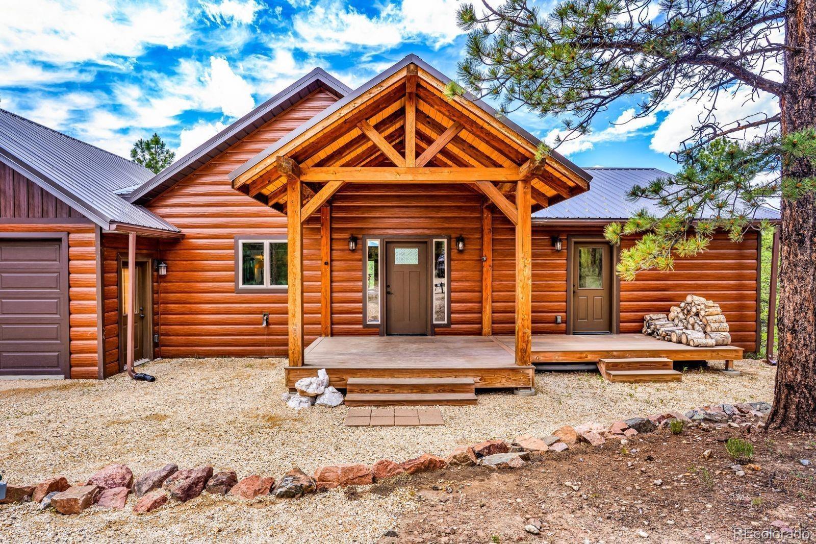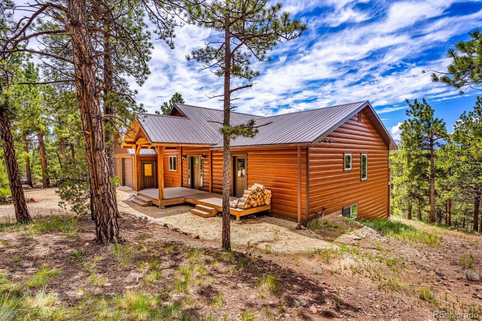 CUSTOM HOME WITH CATHEDRAL CEILINGS AND STARGAZER'S DREAM DECK -- Welcome to your peaceful retreat in the desirable Eastcliffe Subdivision! This beautifully crafted 3-bedroom, 2.5-bath steel-sided home sits on 5.73 wooded acres and offers the perfect blend of comfort, elegance, and breathtaking scenery. Step inside to an open-concept living, kitchen, and dining area, highlighted by soaring cathedral ceilings and rich woodwork throughout. French doors in both the living room and the spacious primary suite lead to a large back deck, where you'll enjoy inspiring views of the Sangre de Cristo Mountains. The primary bedroom also features an ensuite bath for your convenience and comfort. The main level provides everything you need for easy living, including a laundry area and access to the attached two-car garage. The fully finished walk-out basement expands your living space with a generous recreation room or second living area, two sizable bedrooms, and a full bathroom. French doors open onto a poured concrete patio surrounded by tall, mature trees that enhance the sense of seclusion and natural beauty. Whether you're relaxing on the deck, stargazing, entertaining guests, or enjoying the tranquility of your surroundings, this home is a rare gem!