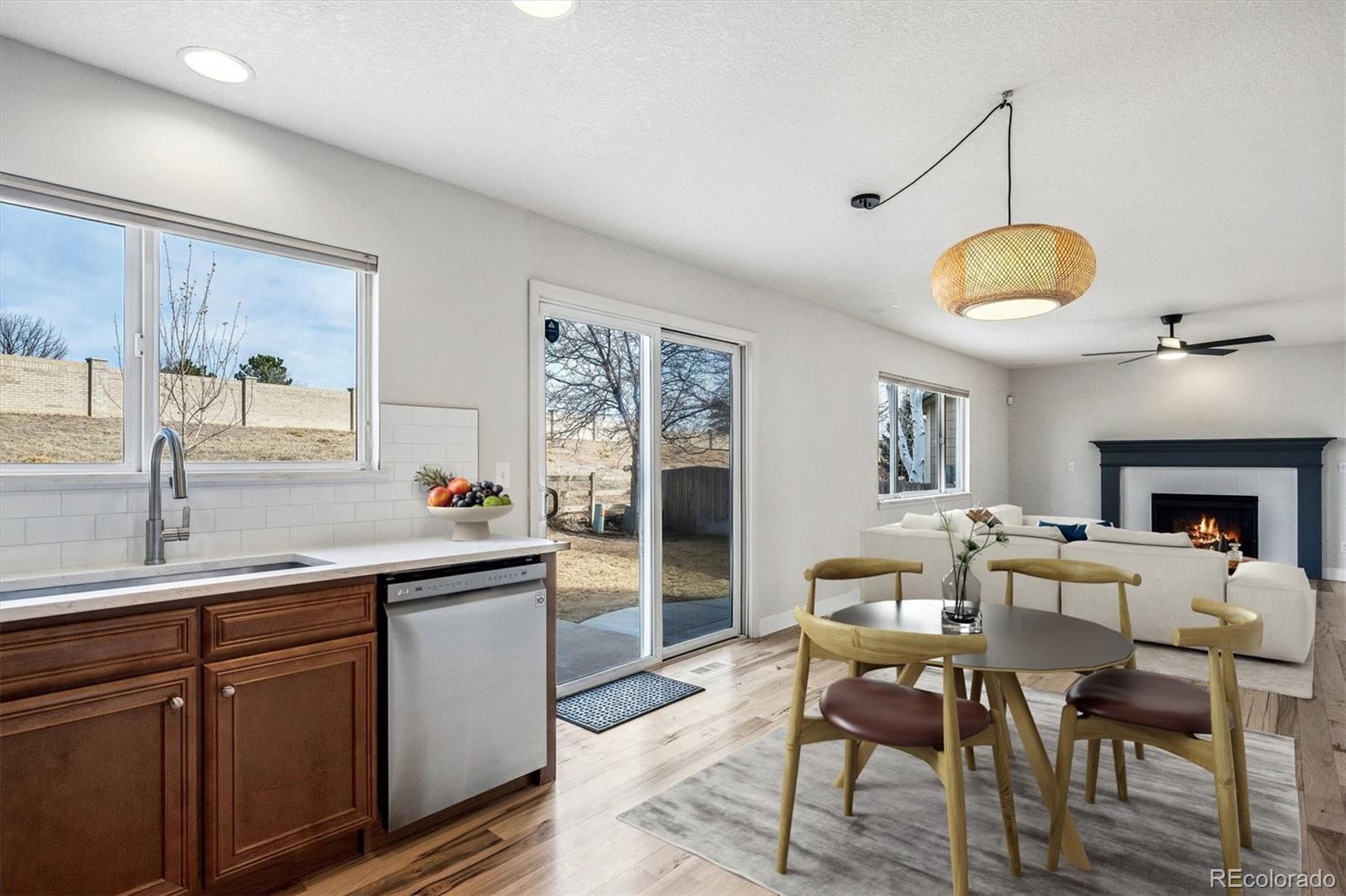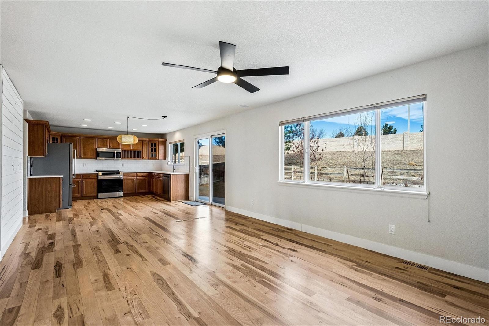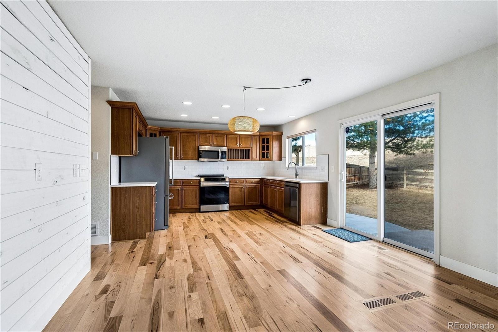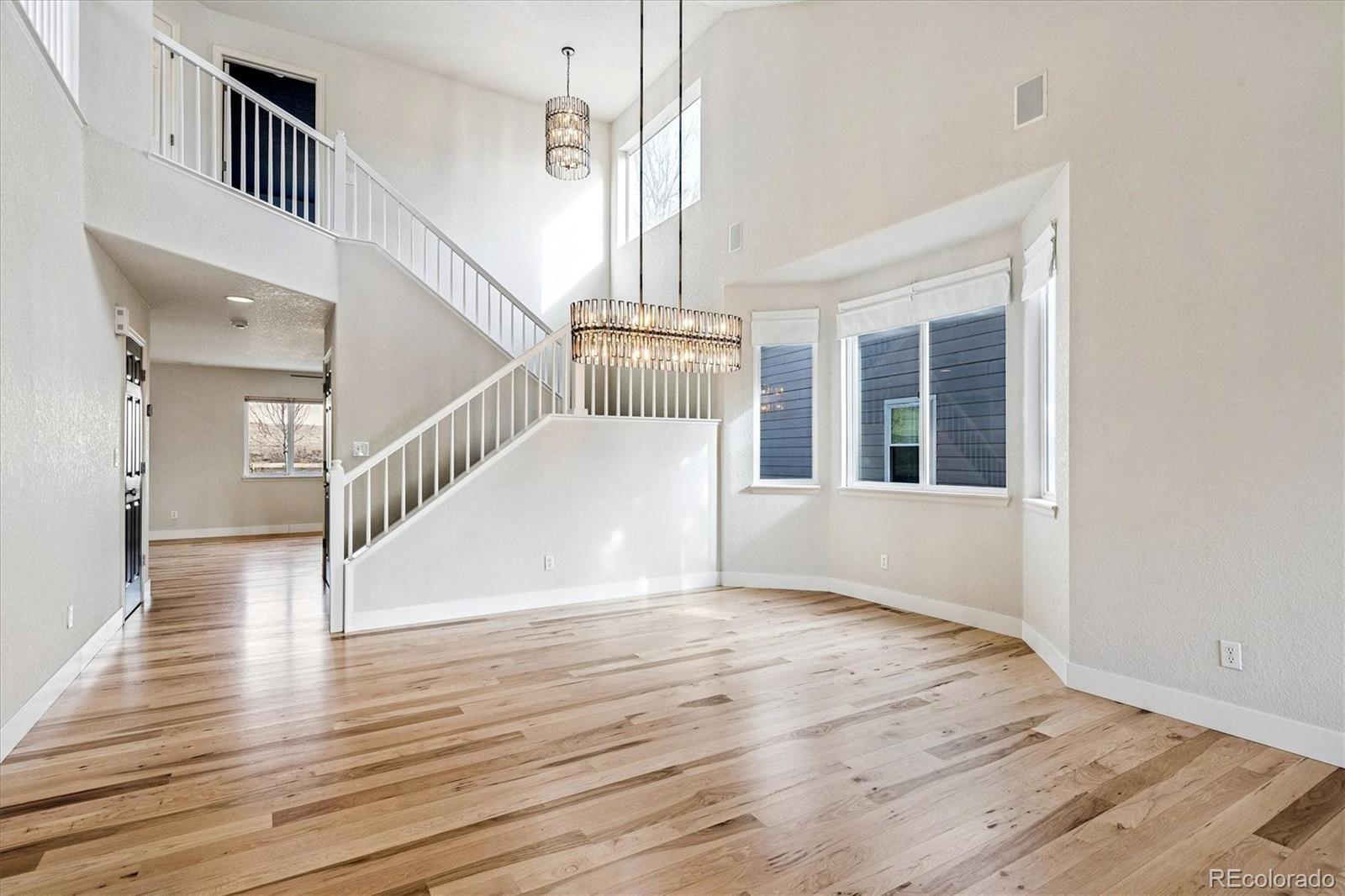 Discover the ultimate move-in ready home abundantly updated for effortless modern living in prime location backing to open space. Fresh natural pine hardwoods flow throughout the bright, open layout adorned with Arhaus lighting and LED smart technology. The spacious living & dining flow seamlessly into the family room with a cozy gas fireplace and opens to the updated kitchen with quartz countertops, a premium induction range & appliances, and deep stainless sink. Enroute to the oversized 3-car garage with lighting and storage, you’ll find the updated half bath and convenient laundry with utility sink and cabinetry. Retreat to your private spa-like primary bathroom complete with a new luxurious dual-shower-head steam spa and elegant Restoration Hardware vanities and fixtures, in addition to the large walk-in closet. The expansive upstairs loft may serve as an office, craft, play or school area. Two bedrooms and a full bathroom complete the upstairs. The outdoor oasis is unbeatable—a large backyard backing to peaceful open space, framed by towering pine trees, a massive patio pre-wired for a hot tub, and a custom turf dog run with auto-waterer and retractable awning, vibrant new plantings including Crimson & Autumn Maples and climbing Boston Ivy along the fence. A solid low-maintenance house with a certified concrete tile roof, fresh exterior paint in 2025, new high-efficiency furnace, AC, tankless water heater, radon system, and more. Sophisticated touches shine through with custom light fixtures throughout, classic carriage lights, a charming lamppost, and dazzling JellyFish lighting across all front eaves for all-season display. Over $160k in recent updates! The practical unfinished basement provides endless storage and rough-ins ready for future expansion. Smart technology throughout house. Phenomenal location just minutes from I-25 and the best retail, dining, and entertainment in Lone Tree and Parker, the light rail station, and local trails & parks.