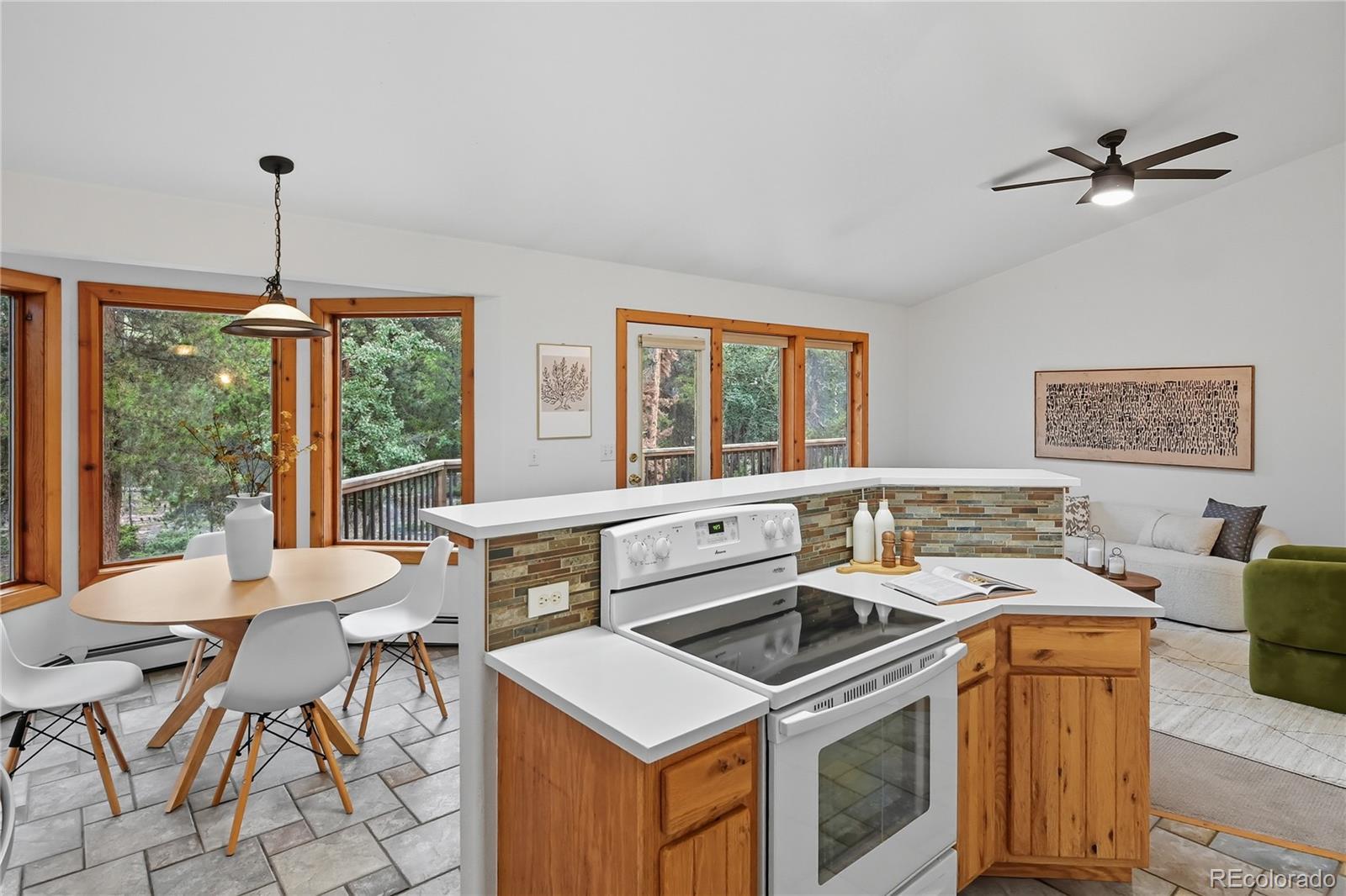 This inviting 3-bedroom, 2-bath home offers comfortable one-level living with vaulted ceilings and a bright, open floor plan. Natural light fills the space through new skylights and large windows throughout. The open kitchen features quartz countertops, a pantry, and a breakfast-bar island, seamlessly connecting to the kitchen and great room—ideal for both everyday living and entertaining. Step outside to enjoy a deck perfect for grilling or relax on the rock patio just off the living room, an ideal spot for morning coffee. The spacious primary suite provides a private retreat with an attached bath, walk-in closet, and direct access to the back deck. Additional highlights include a conveniently located laundry/mudroom leading to the attached, nicely finished garage, a level fire-mitigated lot, and a new roof for peace of mind. Tucked away on a quiet dead-end road with minimal traffic, this home also offers access to Thorn Lake, just a short walk away.