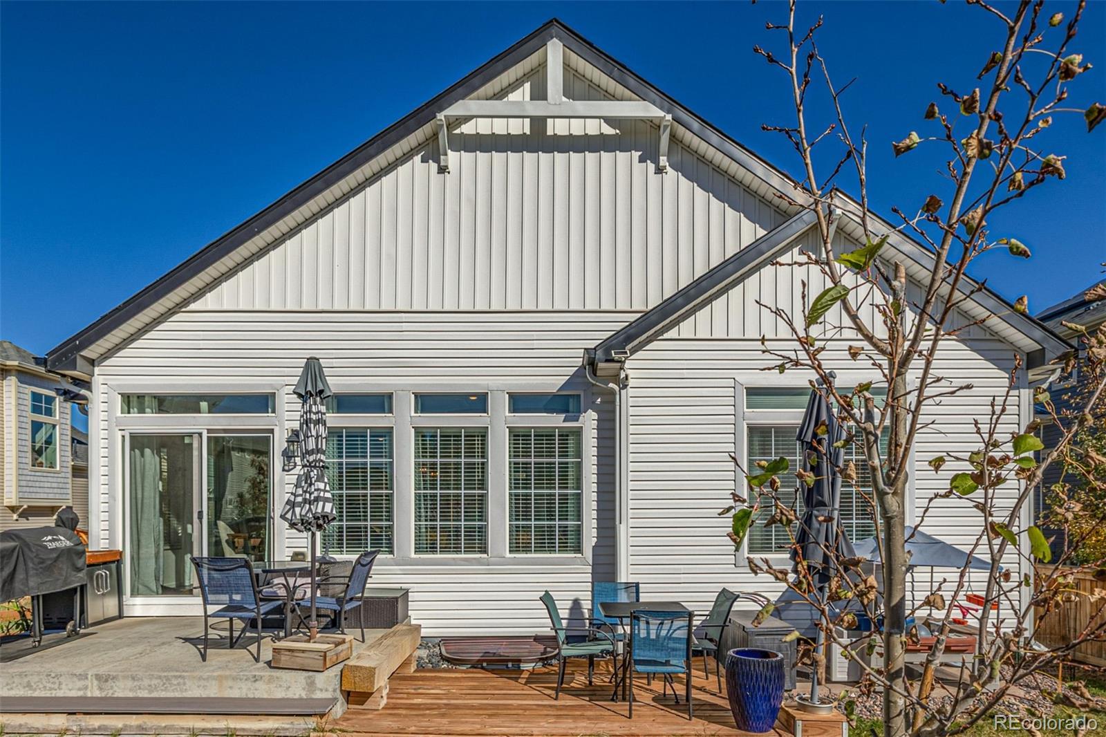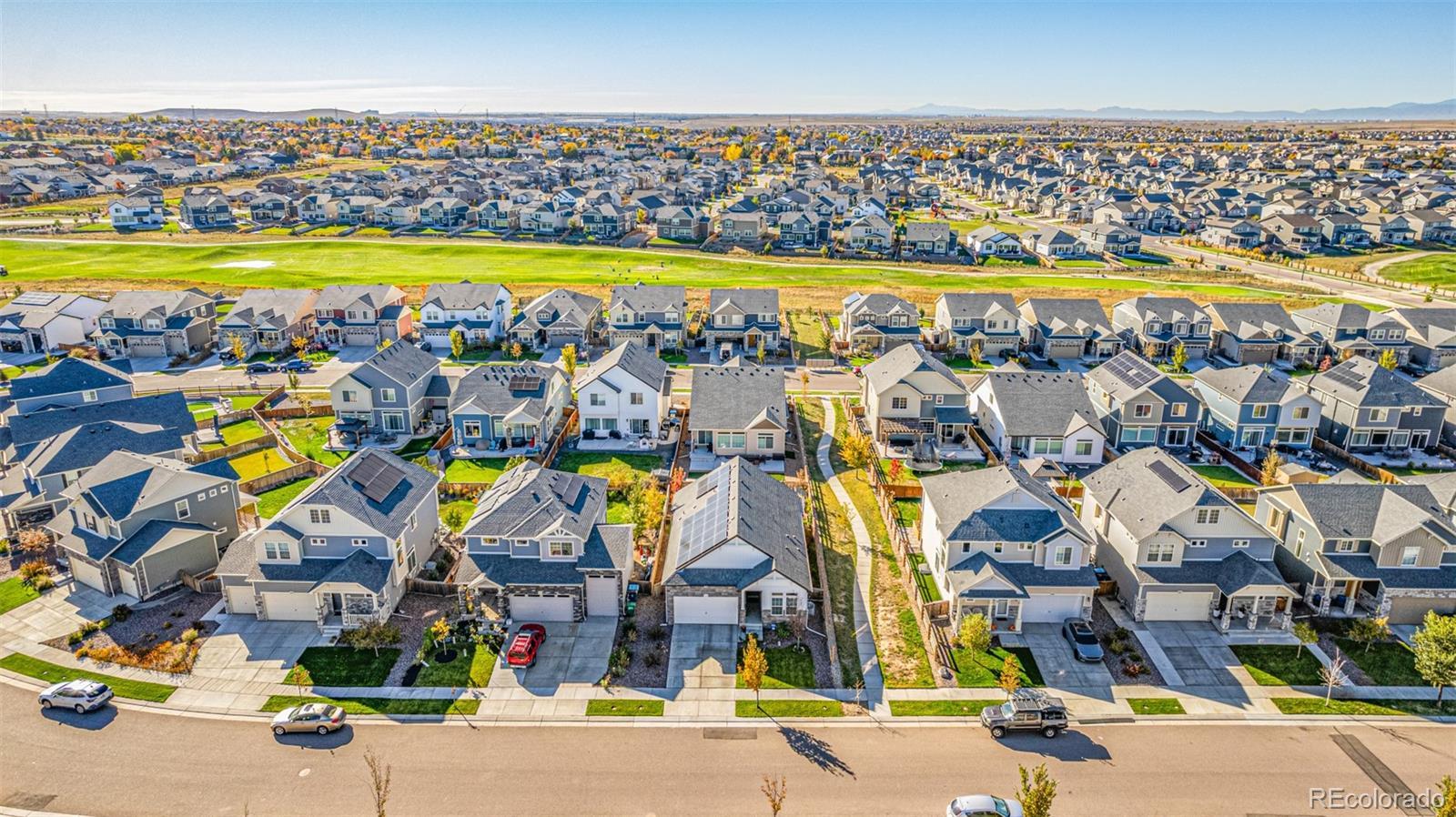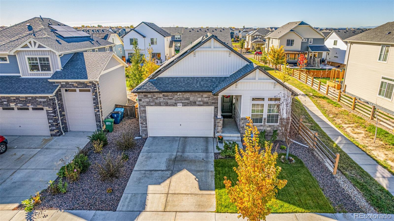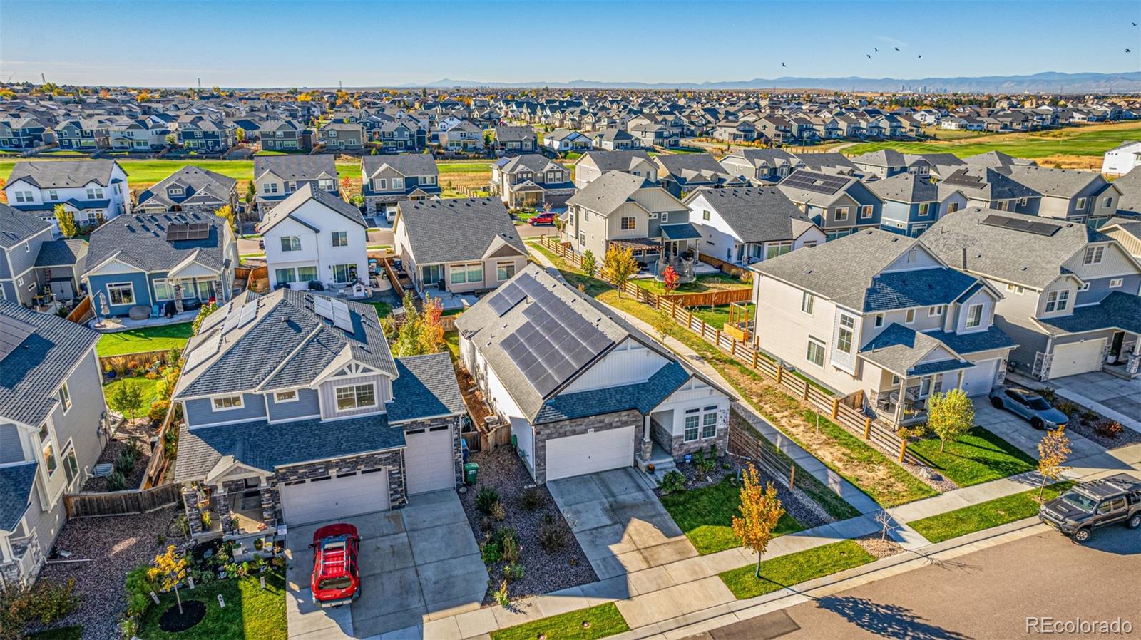 Stunning ranch floorplan situated next to a greenbelt. This is main level living at it's best. Featuring 4 bedrooms and 3 bathrooms this home has enough space for guests, entertaining and enjoying all that Colorado has to offer! Highly upgraded chefs' style kitchen that includes an oversized kitchen island, black stainless steel appliances, soft close cabinets and upgraded flooring. The expansive great room has an electric fireplace and has an open layout concept. The owners' suite features a spa style en-suite bathroom with a huge walk in closet. Laundry is conveniently located next to the guest bedroom and full bathroom. the basement is finished featuring 2 additional bedrooms, large living room and a guest bathroom. Additional features include an oversized garage, whole house humidifier, EV-pre wire, large solar array and your back yard oasis with oversized patio. Located in amenity rich Reunion you will enjoy a clubhouse, pool, parks, trails, fitness center and coffee shop. Close to E-470, Buffalo Run golf course, Shopping and dining. This home truly has it all! Set your showing today!