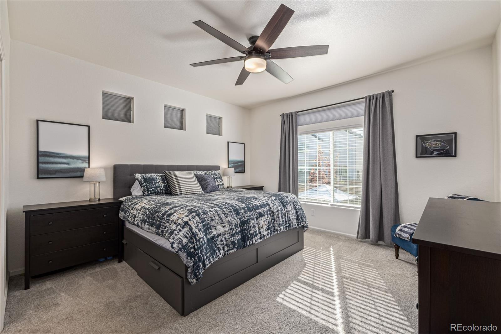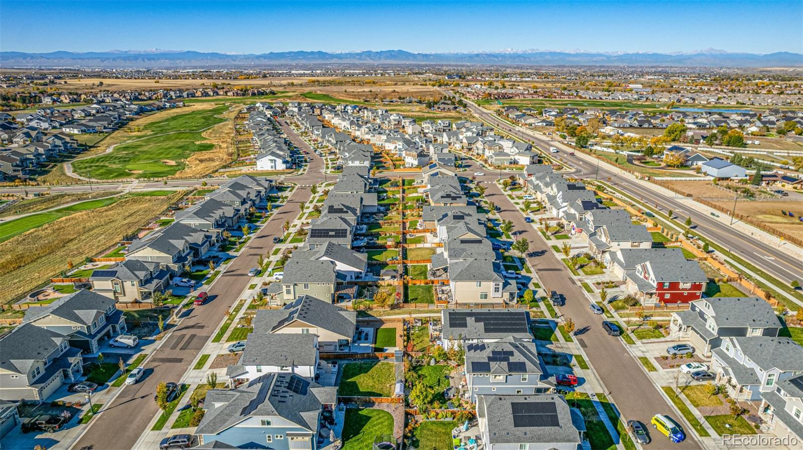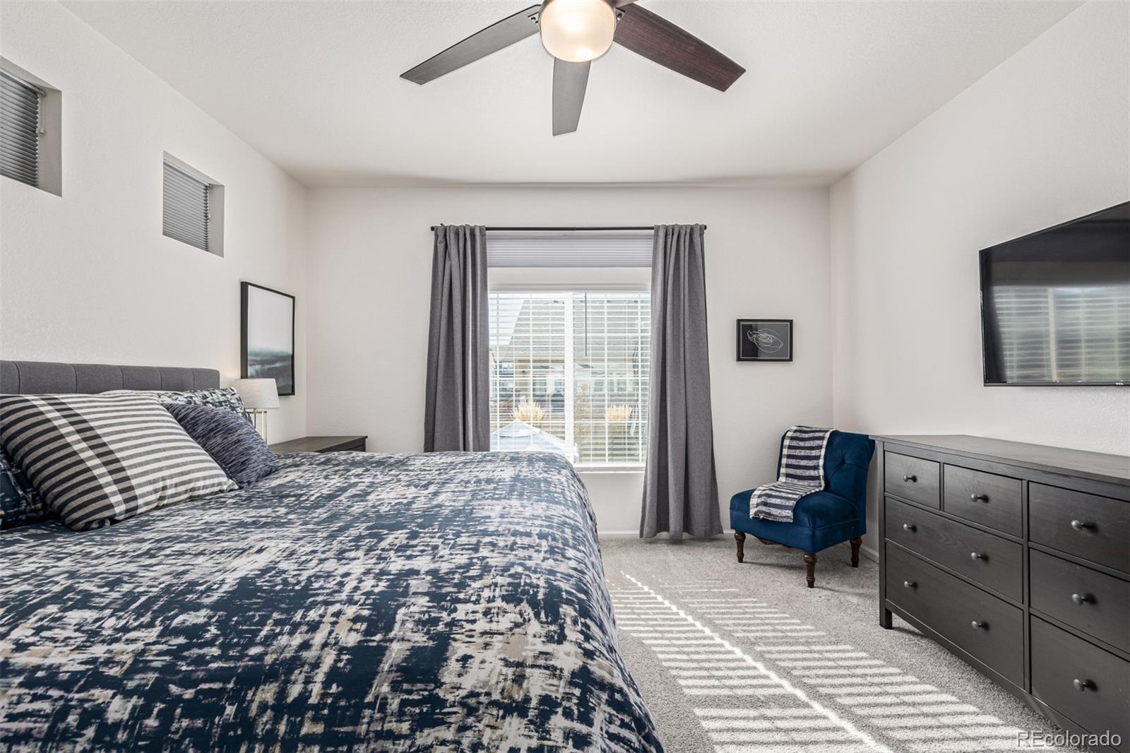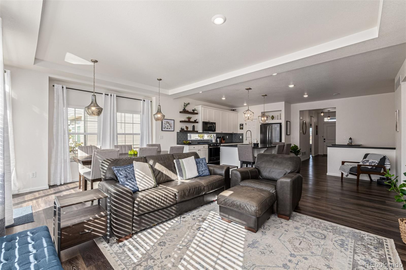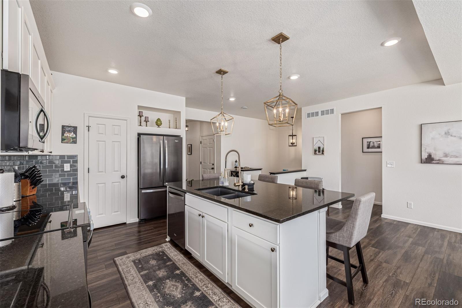 Stunning ranch floorplan situated next to a greenbelt. This is main level living at it's best. Featuring 4 bedrooms and 3 bathrooms this home has enough space for guests, entertaining and enjoying all that Colorado has to offer! Highly upgraded chefs' style kitchen that includes an oversized kitchen island, black stainless steel appliances, soft close cabinets and upgraded flooring. The expansive great room has an electric fireplace and has an open layout concept. The owners' suite features a spa style en-suite bathroom with a huge walk in closet. Laundry is conveniently located next to the guest bedroom and full bathroom. the basement is finished featuring 2 additional bedrooms, large living room and a guest bathroom. Additional features include an oversized garage, whole house humidifier, EV-pre wire, large solar array and your back yard oasis with oversized patio. Located in amenity rich Reunion you will enjoy a clubhouse, pool, parks, trails, fitness center and coffee shop. Close to E-470, Buffalo Run golf course, Shopping and dining. This home truly has it all! Set your showing today!
