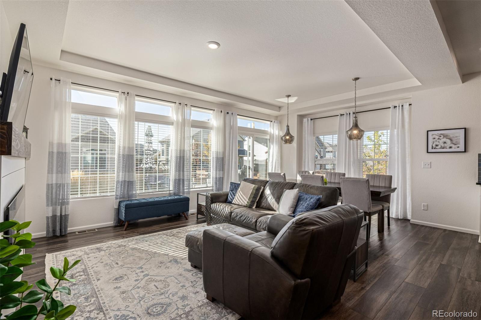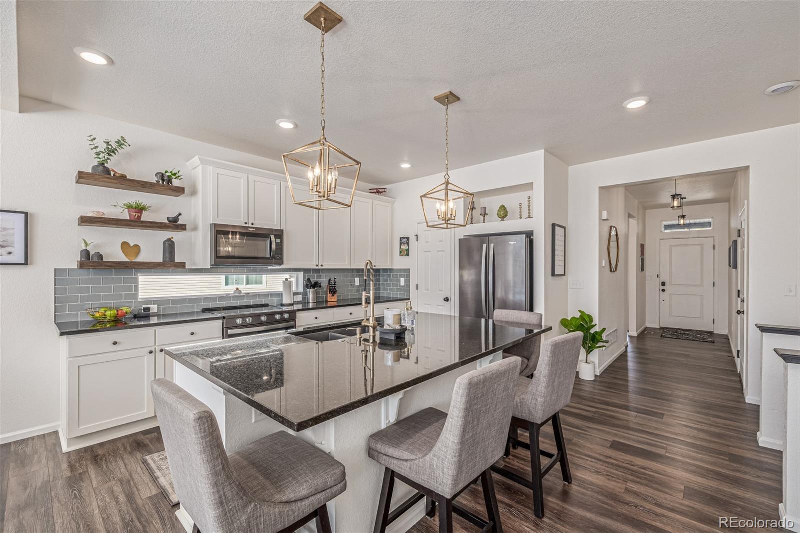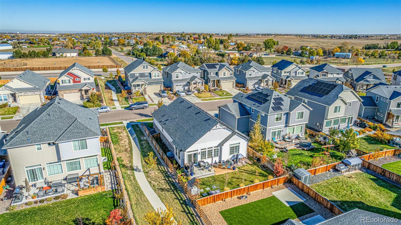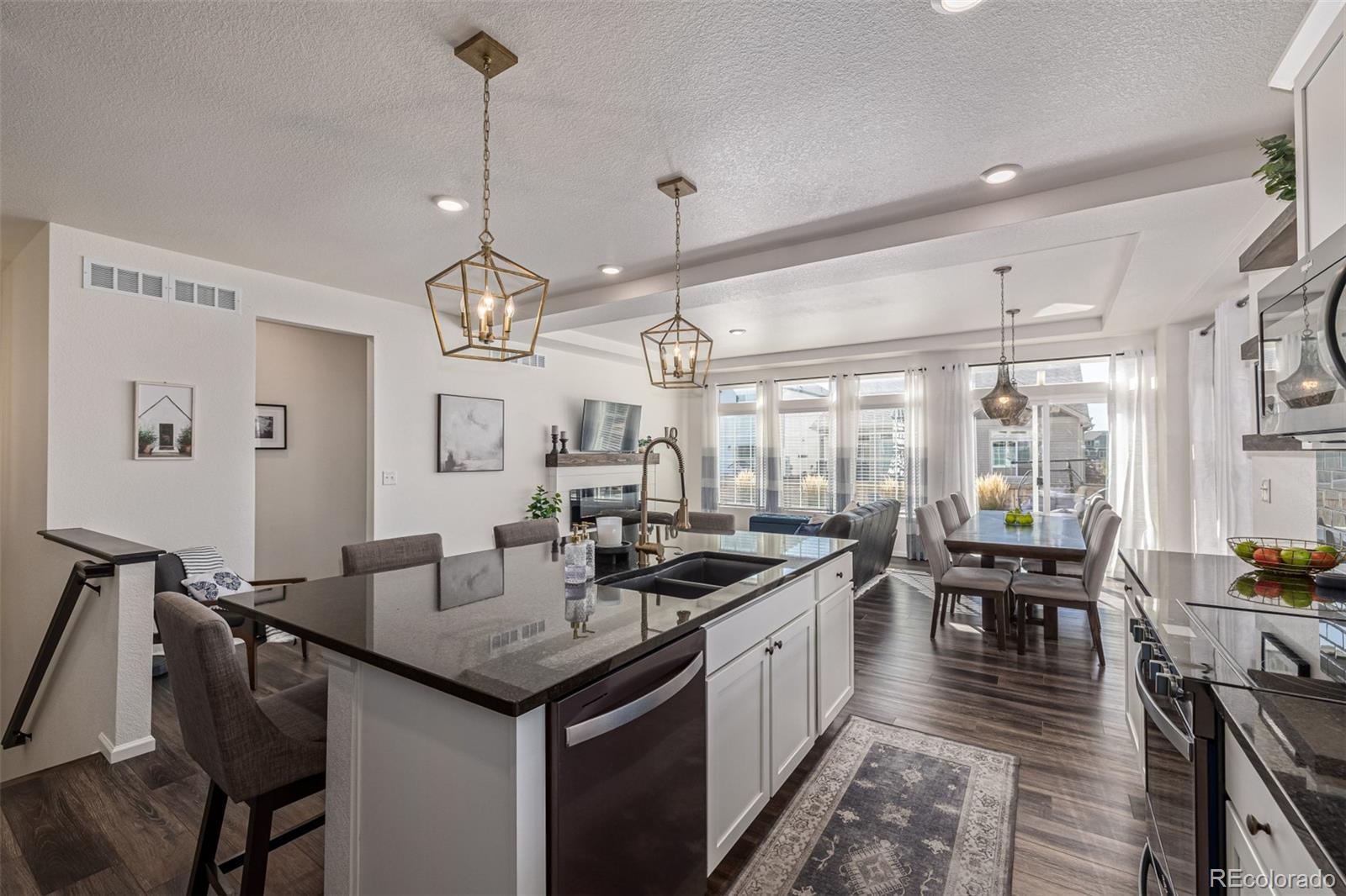 Stunning ranch floorplan situated next to a greenbelt. This is main level living at it's best. Featuring 4 bedrooms and 3 bathrooms this home has enough space for guests, entertaining and enjoying all that Colorado has to offer! Highly upgraded chefs' style kitchen that includes an oversized kitchen island, black stainless steel appliances, soft close cabinets and upgraded flooring. The expansive great room has an electric fireplace and has an open layout concept. The owners' suite features a spa style en-suite bathroom with a huge walk in closet. Laundry is conveniently located next to the guest bedroom and full bathroom. the basement is finished featuring 2 additional bedrooms, large living room and a guest bathroom. Additional features include an oversized garage, whole house humidifier, EV-pre wire, large solar array and your back yard oasis with oversized patio. Located in amenity rich Reunion you will enjoy a clubhouse, pool, parks, trails, fitness center and coffee shop. Close to E-470, Buffalo Run golf course, Shopping and dining. This home truly has it all! Set your showing today!