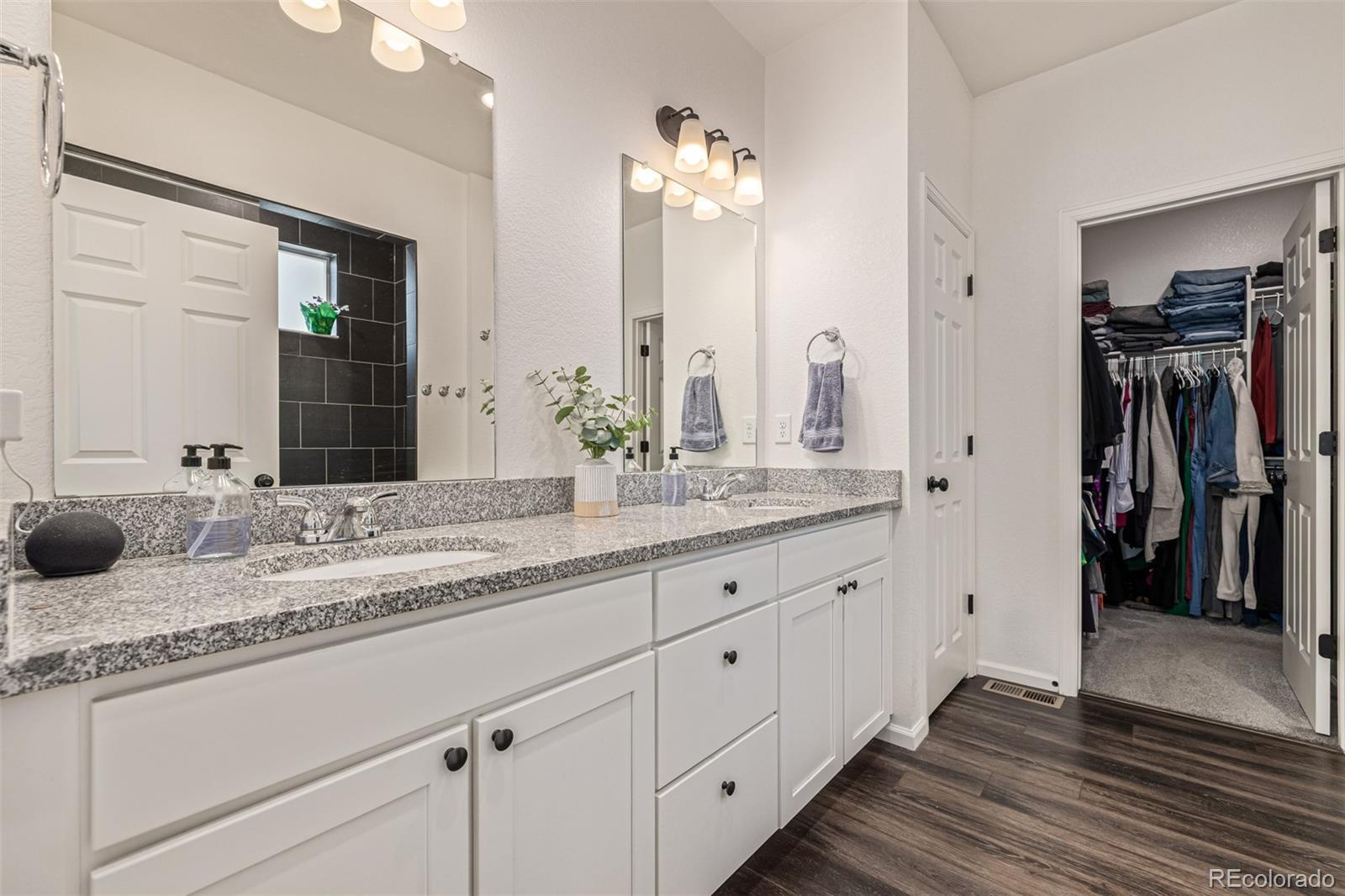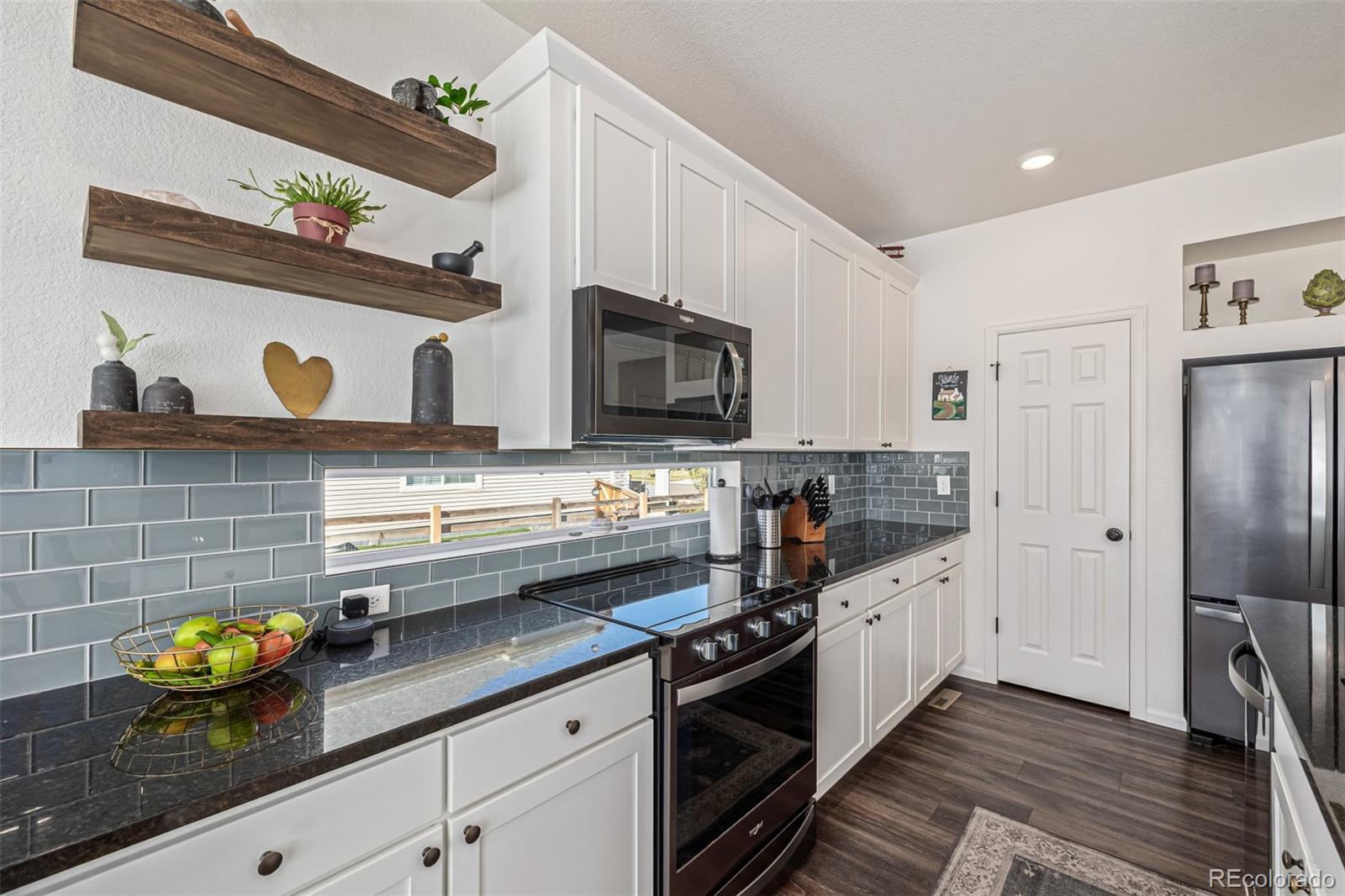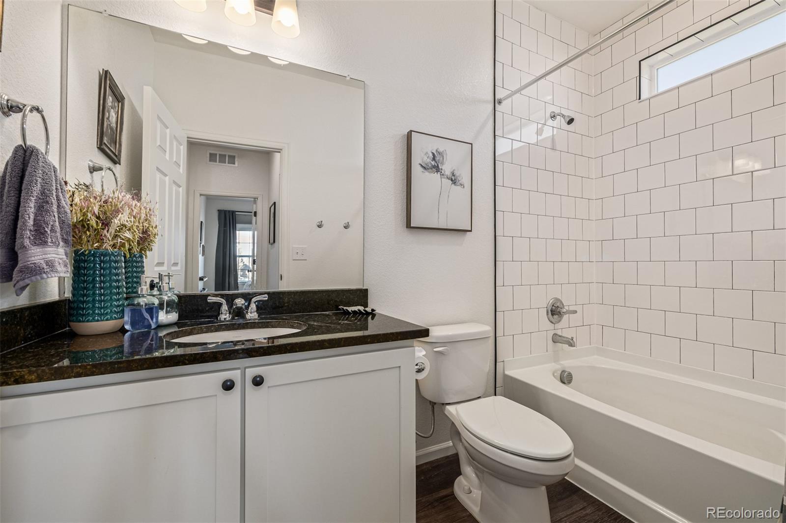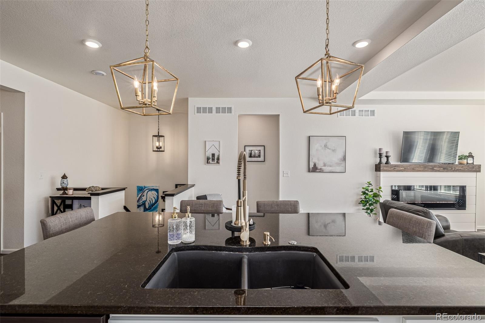 Stunning ranch floorplan situated next to a greenbelt. This is main level living at it's best. Featuring 4 bedrooms and 3 bathrooms this home has enough space for guests, entertaining and enjoying all that Colorado has to offer! Highly upgraded chefs' style kitchen that includes an oversized kitchen island, black stainless steel appliances, soft close cabinets and upgraded flooring. The expansive great room has an electric fireplace and has an open layout concept. The owners' suite features a spa style en-suite bathroom with a huge walk in closet. Laundry is conveniently located next to the guest bedroom and full bathroom. the basement is finished featuring 2 additional bedrooms, large living room and a guest bathroom. Additional features include an oversized garage, whole house humidifier, EV-pre wire, large solar array and your back yard oasis with oversized patio. Located in amenity rich Reunion you will enjoy a clubhouse, pool, parks, trails, fitness center and coffee shop. Close to E-470, Buffalo Run golf course, Shopping and dining. This home truly has it all! Set your showing today!