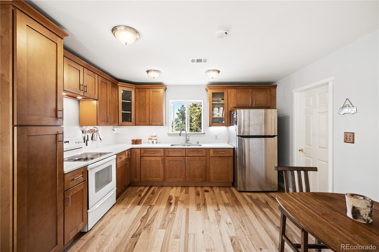 This updated ranch style home features a metal roof, covered front porch, and back porch over looking the fire mitigated back yard. Beautiful mountain views from the kitchen window. The septic was just installed in 2022 with an automatic in line heater to prevent winter freezing (2023). The well pump house has a new whole house water filter (2023) and a new automatic heat trace with a backup preventing winter freezing (2023). Seller has added insulation to the pump house and a thermostatic control for heating in winter. Cabinets, wood floors, and interior paint all new in 2022. New water heater in 2023 and a new refrigerator in 2022. All appliances stay with the house. Close to Wonderview Cafe, 25 minutes to Eldora Ski Resort, 15 minutes from Gross Reservoir, and 1 hour from DIA. This home has easy access to 72 and highway 93.