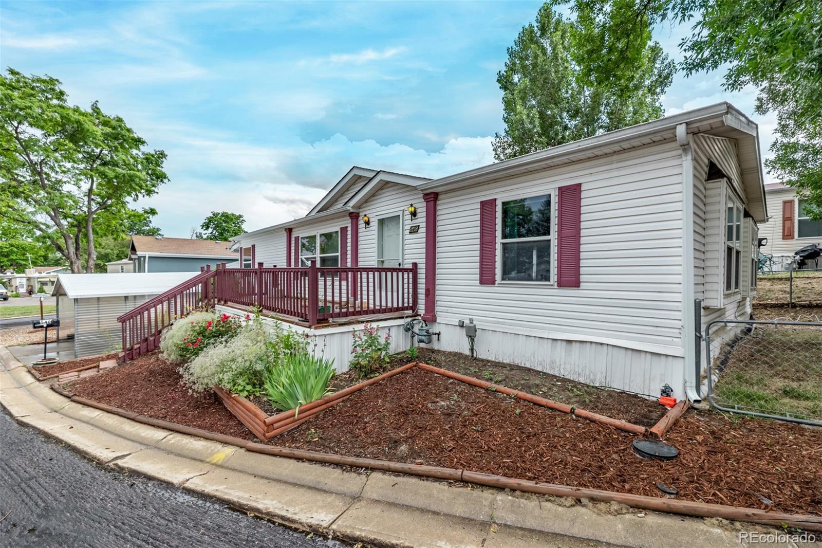 Welcome to this beautifully maintained 3-bedroom, 2-bath home in the Holiday Hills Village! Nestled on a corner lot, this charming home features a spacious front deck surrounded by well-kept landscaping and mature trees. Step inside to an expansive living area with soft carpeting, large windows for natural light, and an open floorplan that flows seamlessly into the dining and kitchen areas. The kitchen offers ample cabinet space, stainless steel appliances, and a center island—perfect for entertaining or prepping meals. Just off the kitchen is a cozy sitting area with room to gather or relax. The primary bedroom is generously sized with large windows and dual closets, while the secondary bedrooms are versatile and bright. Both bathrooms are clean and updated, and there's a dedicated laundry room with extra cabinetry for storage. Outside, enjoy a covered carport, enclosed patio space, and shed. The fully fenced side yard is perfect for pets, play, or gardening. Located in a vibrant 55+ community with clubhouse, pool, and daily activities, and just minutes to shopping, dining, and major commuter routes—this home offers comfort, convenience, and low-maintenance living at its finest!