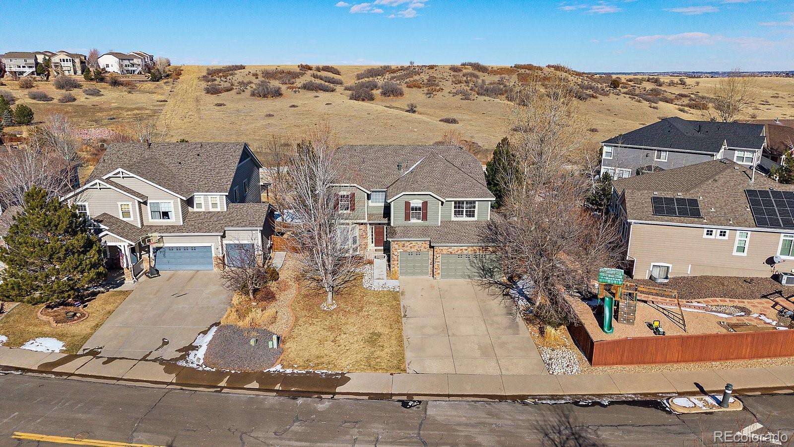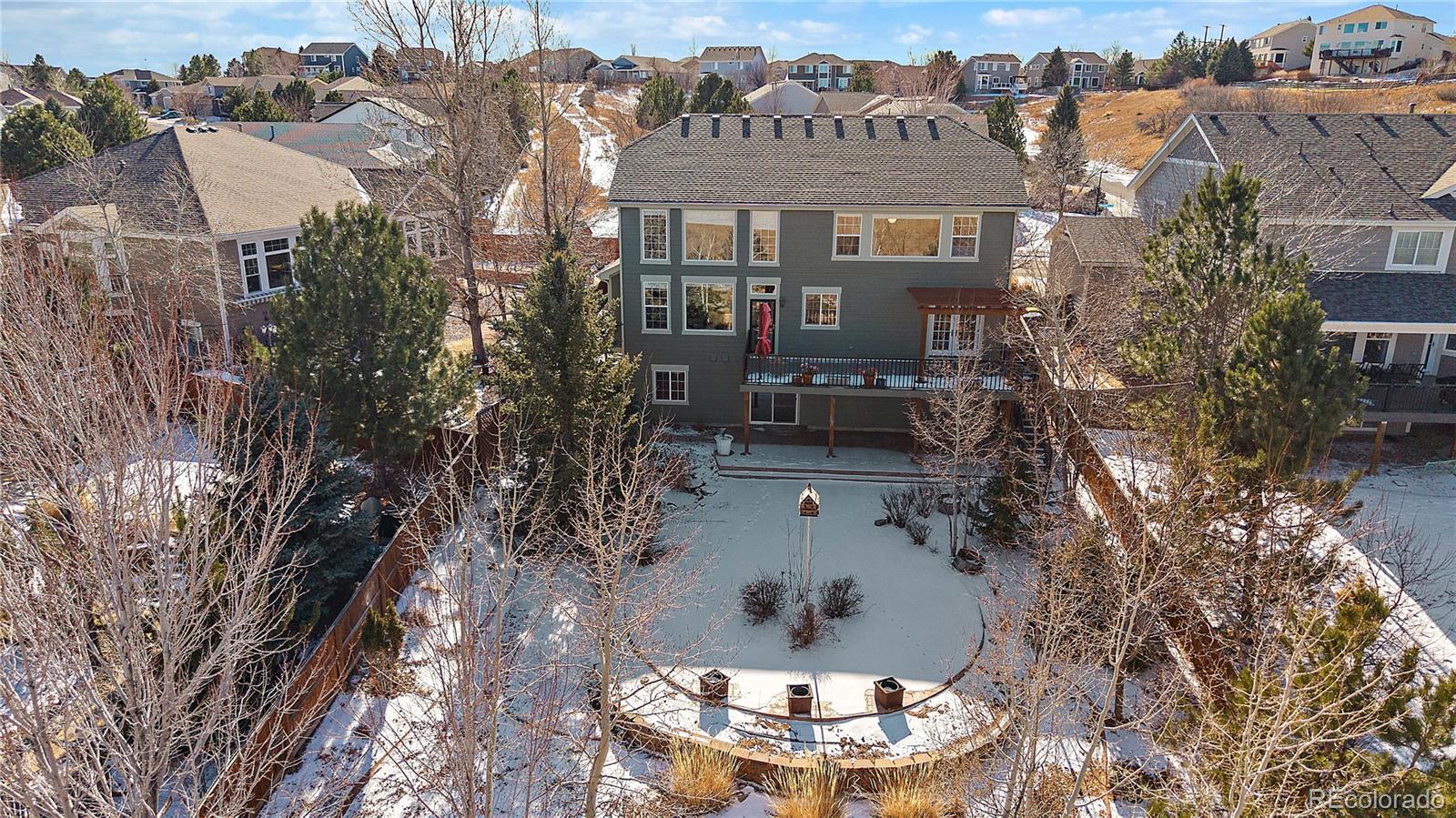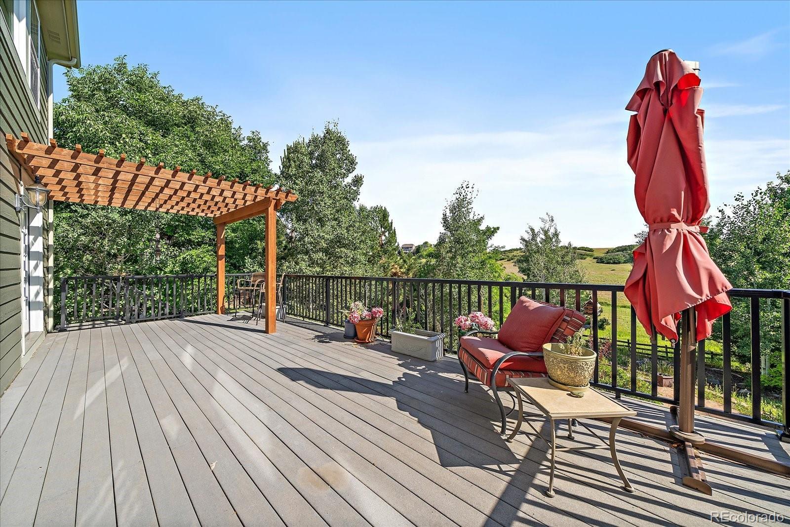 Designed for space, flexibility, and connection to the outdoors, this custom Sapphire Pointe home offers scenic open space views and multiple areas to gather or unwind. Recent updates include a new roof and updated 5-inch trim, while custom skip-trowel wall texture throughout adds warmth and character. The welcoming entry features a vaulted ceiling, travertine tile inlay, and a dramatic spiral staircase that sets the tone for the home’s thoughtful design. A traditional floor plan offers formal living and dining rooms filled with natural light, along with a private study behind French doors—ideal for working from home or creative pursuits. The vaulted family room is anchored by a grand fireplace and expansive windows that frame the open space beyond. At the heart of the home, the kitchen is designed for both function and entertaining, featuring granite countertops, a butcher block island, gas cooktop, double ovens, and generous cabinetry. The casual eating area includes built-in cabinetry and desk space and opens to an oversized deck with pergola—perfect for outdoor dining and summer gatherings overlooking open space. The upper level is highlighted by a spacious primary suite overlooking open space, complete with a sitting area, three-sided fireplace, and a well-appointed five-piece bath with granite counters and inlaid travertine tile flooring. A large walk-in closet with center island adds to the suite’s comfort. Three additional bedrooms complete the upper level, including one with an ensuite bath and two connected by a shared bathroom. The fully finished walk-out basement adds exceptional versatility, offering a second kitchen, family room with fireplace, bedroom with sink, laundry hookups, and flexible living areas well-suited for multiple living situations or extended guest stays. With new carpet, fresh paint, and open space views, this home offers a distinctive opportunity in a desirable Castle Rock setting.