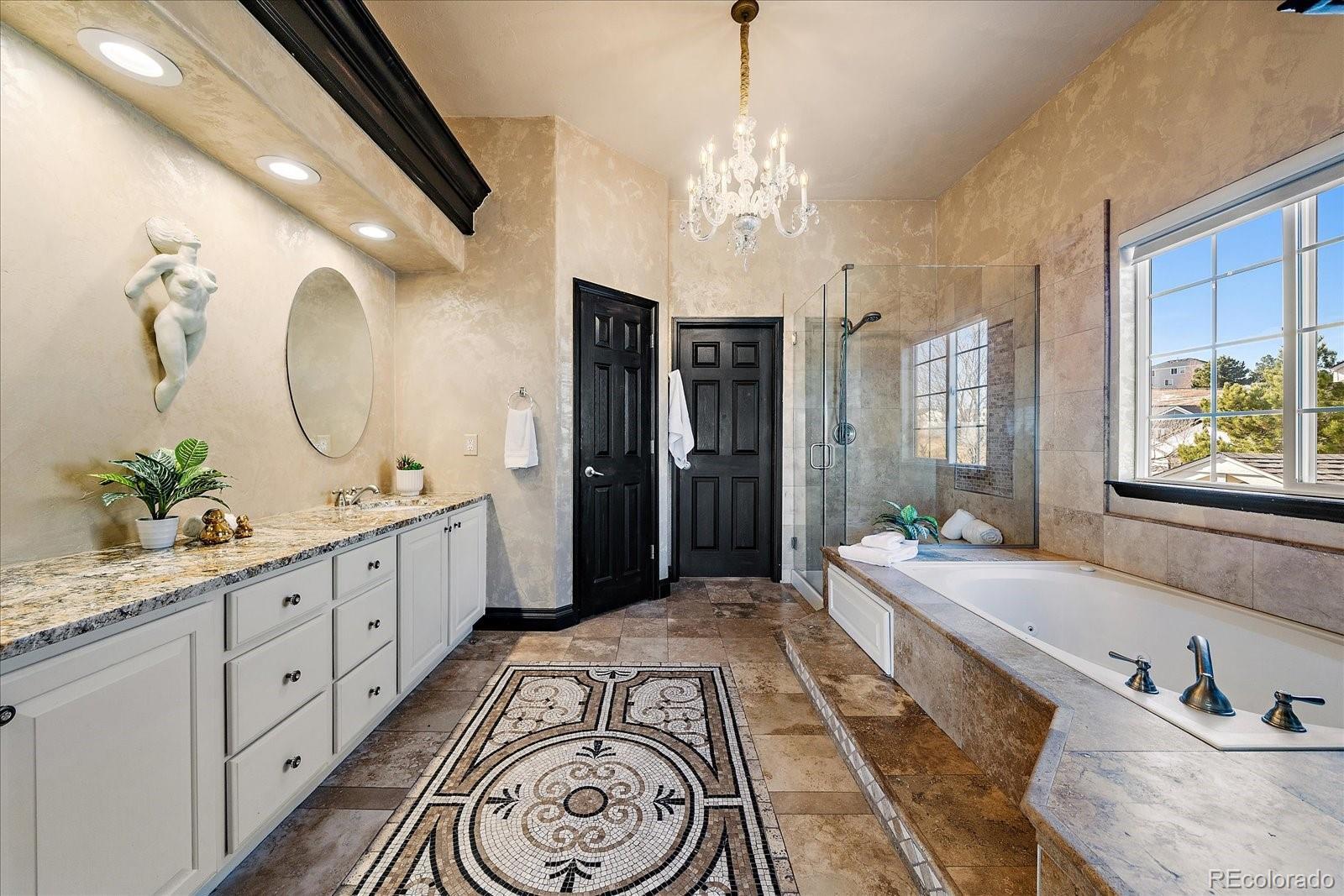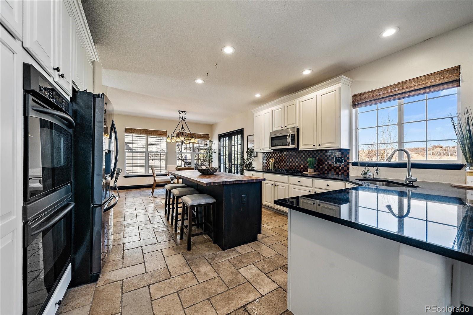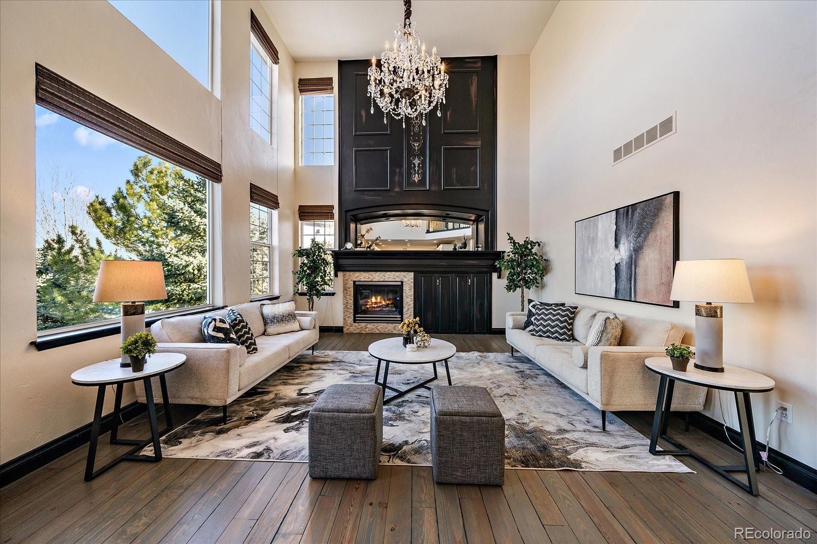 Designed for space, flexibility, and connection to the outdoors, this custom Sapphire Pointe home offers scenic open space views and multiple areas to gather or unwind. Recent updates include a new roof and updated 5-inch trim, while custom skip-trowel wall texture throughout adds warmth and character. The welcoming entry features a vaulted ceiling, travertine tile inlay, and a dramatic spiral staircase that sets the tone for the home’s thoughtful design. A traditional floor plan offers formal living and dining rooms filled with natural light, along with a private study behind French doors—ideal for working from home or creative pursuits. The vaulted family room is anchored by a grand fireplace and expansive windows that frame the open space beyond. At the heart of the home, the kitchen is designed for both function and entertaining, featuring granite countertops, a butcher block island, gas cooktop, double ovens, and generous cabinetry. The casual eating area includes built-in cabinetry and desk space and opens to an oversized deck with pergola—perfect for outdoor dining and summer gatherings overlooking open space. The upper level is highlighted by a spacious primary suite overlooking open space, complete with a sitting area, three-sided fireplace, and a well-appointed five-piece bath with granite counters and inlaid travertine tile flooring. A large walk-in closet with center island adds to the suite’s comfort. Three additional bedrooms complete the upper level, including one with an ensuite bath and two connected by a shared bathroom. The fully finished walk-out basement adds exceptional versatility, offering a second kitchen, family room with fireplace, bedroom with sink, laundry hookups, and flexible living areas well-suited for multiple living situations or extended guest stays. With new carpet, fresh paint, and open space views, this home offers a distinctive opportunity in a desirable Castle Rock setting.