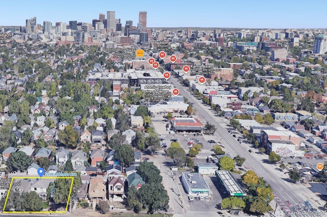 DEVELOPMENT OPPORTUNITY - PERMITS APPROVED - Ideally located, half a block to vibrant Broadway corridor with retail and restaurants. Easy access to Santa Fe and I-25. Across the street from luxury apartment buildings and grocery-anchored shopping center. Plans for fourteen 2 bed, 2.5 bath townhomes. Once built, lease or sell each individual unit, providing maximum exit opportunity. List price includes architectural plans, structural plans, MEP, soil, environmental testing, survey, permit review fees. Listing is for three lots: 55/57 W Alameda (commercial office duplex), 61/63 W Alameda (residential duplex), 65 W Alameda (commercial office building.)