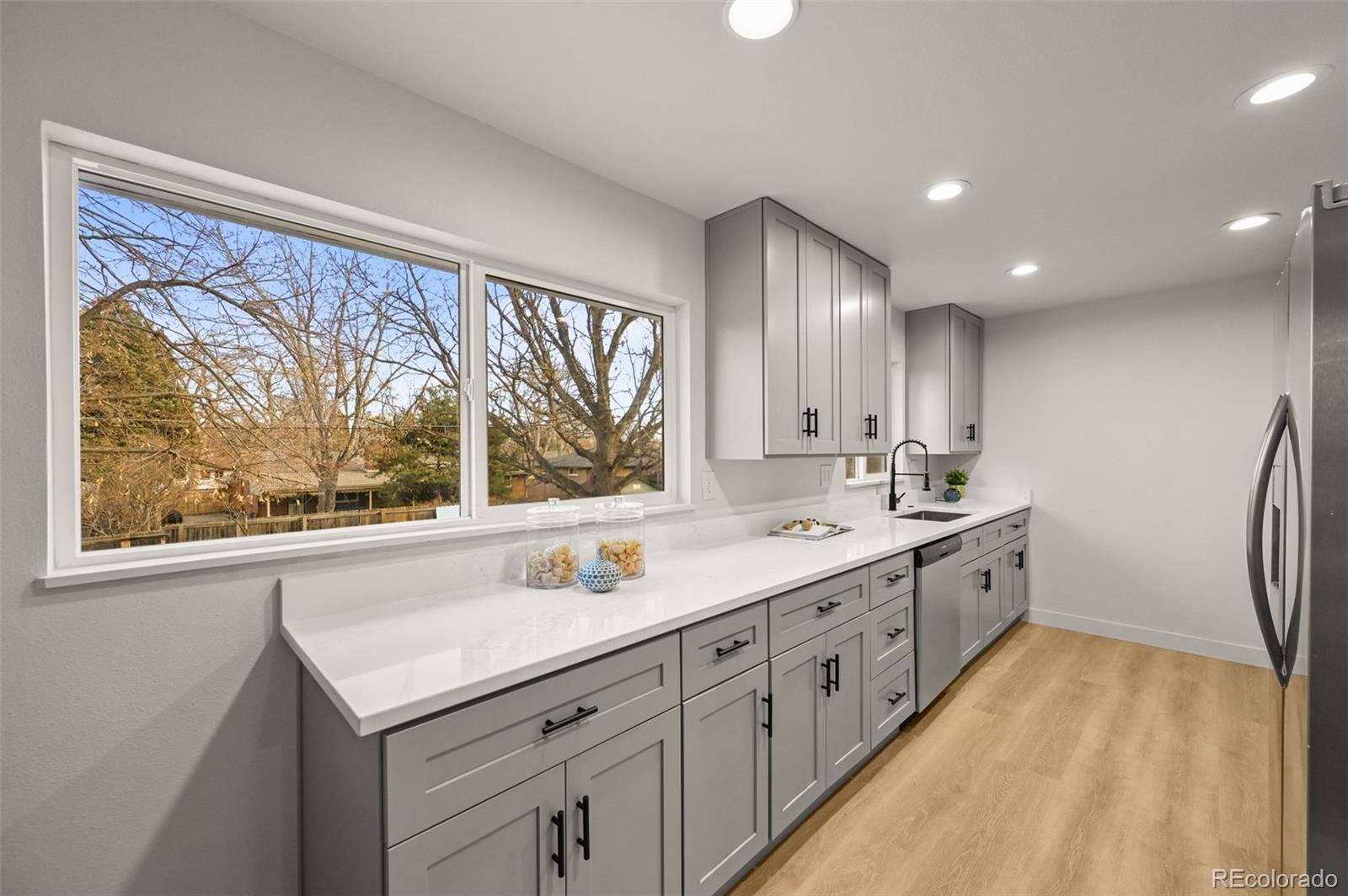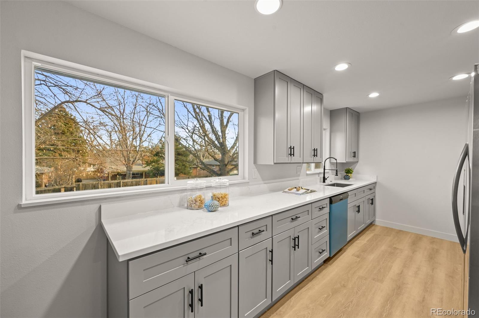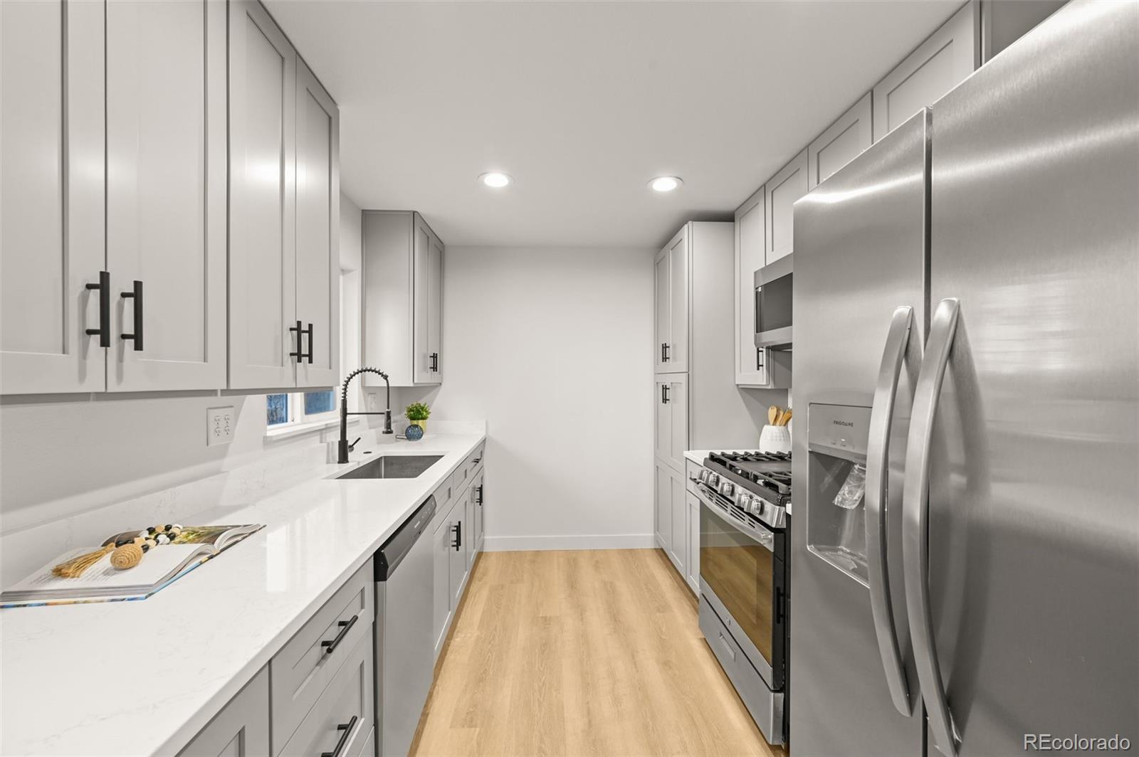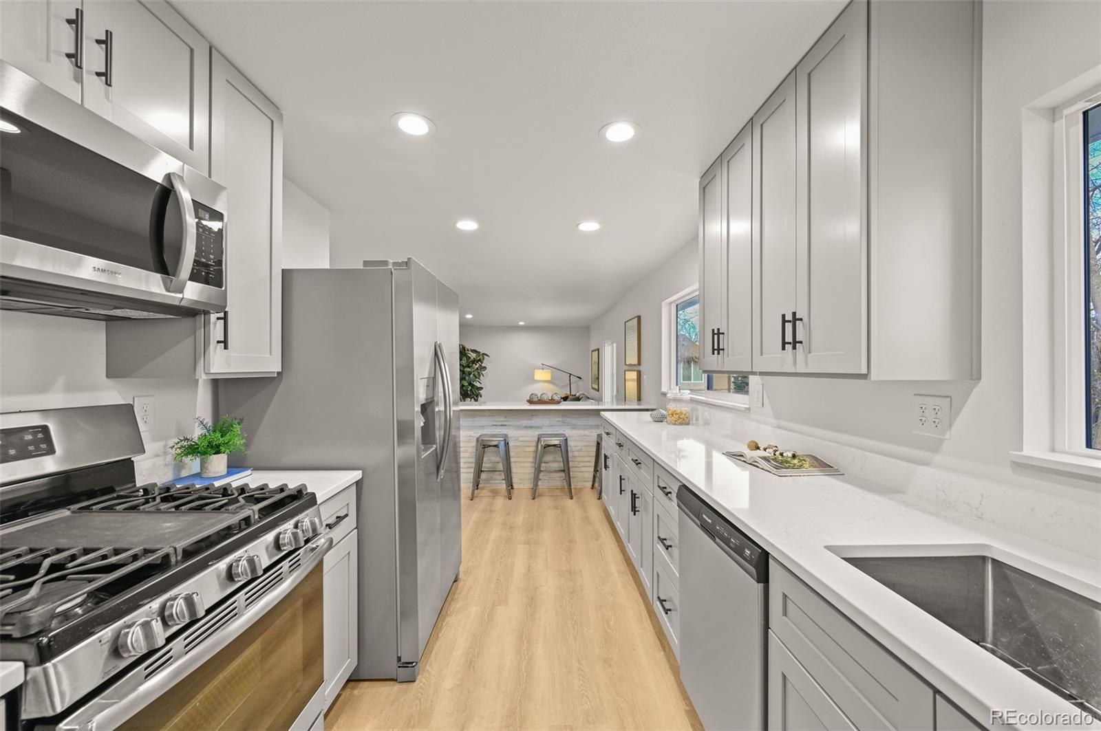 Welcome home to this fully reimagined and renovated ranch-style home, featuring nearly 3,000 sqft of functional space for everyday living and entertaining. Brand-new exterior paint (2025), new windows (2025), and a newer roof greet you from the street, offering instant curb appeal. Inside, the sun-drenched open floor plan features vinyl plank flooring, fresh paint, new doors and trim, and curated finishes that bring contemporary details to the property. The heart of the home is the renovated gourmet kitchen, complete with an oversized center island, white shaker cabinetry, a stainless steel appliance package, and quartz countertops. Three generously sized bedrooms are located on the main level, with two additional bedrooms in the finished basement, ideal for guests or for a home office, playroom, or gym. Further features of this turnkey residence include a new HVAC, two fully renovated bathrooms, a new water heater (all completed in 2025), and an attached 2-car garage. 130 Garrison Street is ideally situated on a spacious lot within minutes of neighborhood parks, Jefferson County schools, shopping, dining, public transportation, and major roadways. Offering comfort, convenience, and updates throughout, this property is contemporary living in the heart of Lakewood; book your showing today!