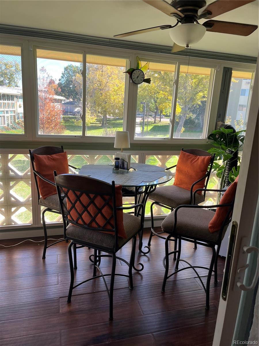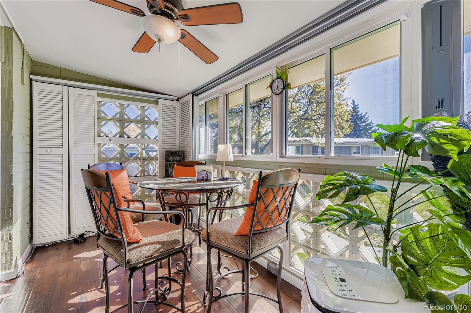 Windsor Gardens is a peaceful 55+ active adult condo community in a great location: close to both Parker Rd, and Havana St. Colorado Anschutz medical center, lots of shopping, and restaurants, and two 18 hole Golf Courses. What differentiates this condo from others for sale in Windsor Gardens is it's an end unit on the top floor which means only 1 common wall, and Vaulted/High ceilings. It also has newer windows and patio slider, newer high quality, rich tone LVP flooring and 4 AC units. The lanai/balcony features an AC unit to make it comfortable in the summer, a beautiful view of the green space, and trees adjacent to the building, and floor to ceiling windows with moveable shutters. Also it's being sold furnished. At first glance the HOA seems a bit pricey, but after considering the laundry list of amenities you'll realize it's pretty good deal: Heat, Water, Sewer, Trash, Grounds and Structure maintenance and insurance, snow removal, 24 hour security/patrolling community responders, on site management, 2 pools, Hot tub, sauna, fitness center, and a very nice, inexpensive, 9 hole golf course in your back yard - literally. And last but certainly not least - the HOA fee includes payment of your property TAXES. Unit is being sold fully furnished. If buyer doesn't want the furnishings, seller will remove.