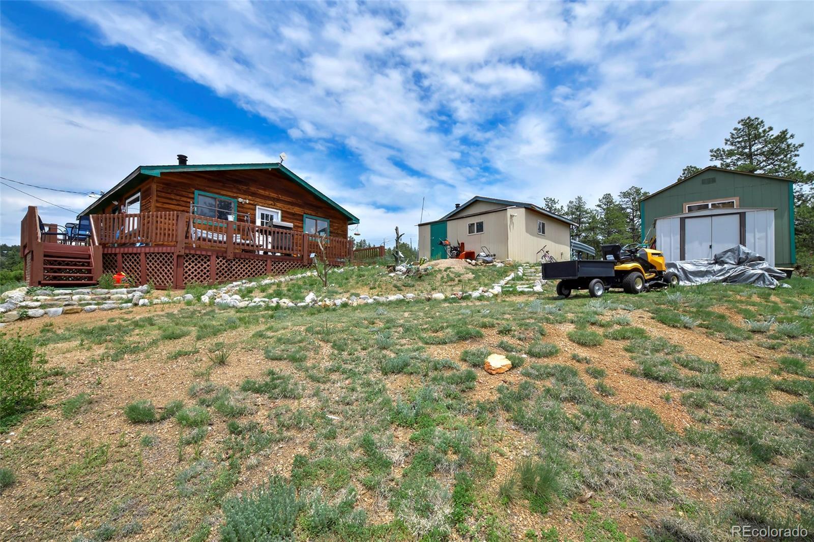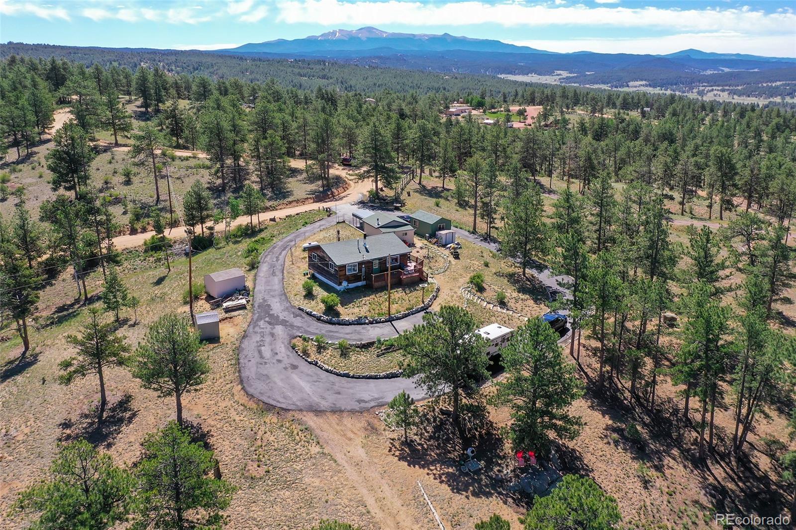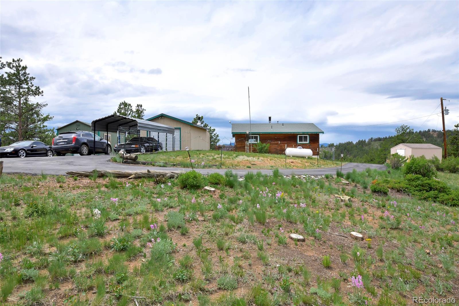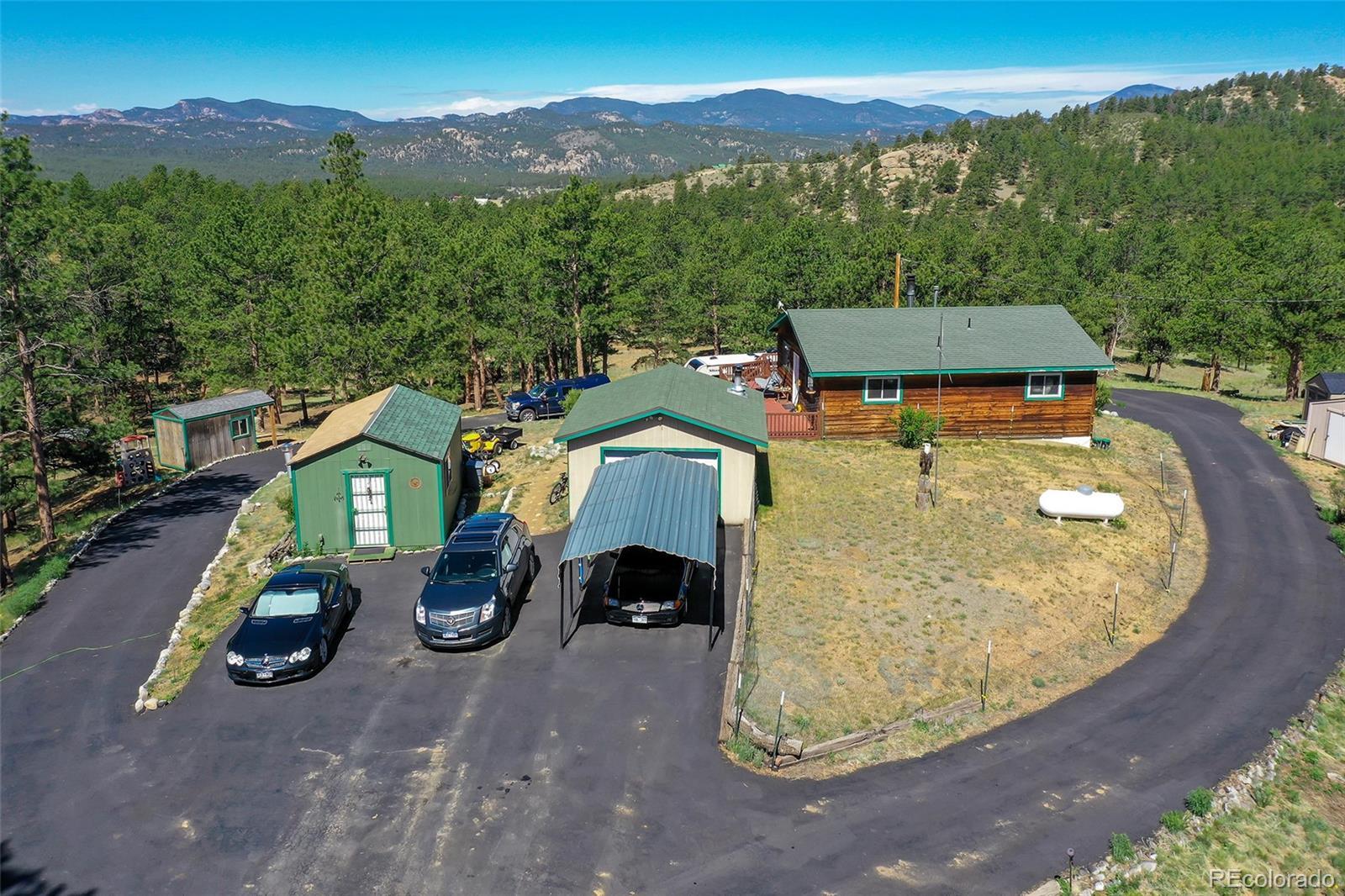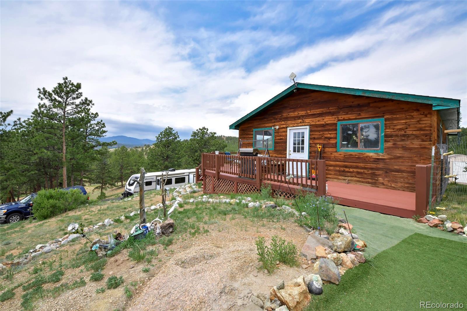 Welcome to this charming retreat nestled in the central Colorado mountains. This delightful home is the epitome of cozy mountain living. Set on five acres of meticulously mitigated mountain land, the property offers a rare blend of seclusion and natural beauty, making it an ideal haven for those who cherish tranquility and outdoor living. The home itself is a testament to thoughtful design and comfort. As you step inside, you'll be greeted by large windows that frame stunning views of the surrounding mountains and allow natural light into the living spaces. The open floor plan creates a seamless flow between all the living spaces making the most of the compact yet efficient layout. The kitchen is well-equipped with ample counter space, and custom cabinetry with inlayed Cripple Creek turquoise. One of the standout features of this property is the wrap-around deck, perfect for enjoying breathtaking scenery. Whether you're sipping your morning coffee or simply relaxing with a good book, the deck offers a versatile outdoor space that enhances the living experience. In addition to the main house, the property includes several out sheds, offering plenty of storage and potential for various uses. The property has a circular asphalted driveway around the cabin. There is a permanent full-time connection for a full-size RV– providing room for friends and family to come, visit and enjoy the mountains with you. The five-acre lot has been carefully mitigated to maintain the health and beauty of the mountain landscape. This extensive mitigation not only preserves the natural ecosystem but also provides peace of mind, ensuring the property is well-protected against environmental hazards. The land is dotted with pine, aspen and Colorado wild-flowers around the many trails on the property.