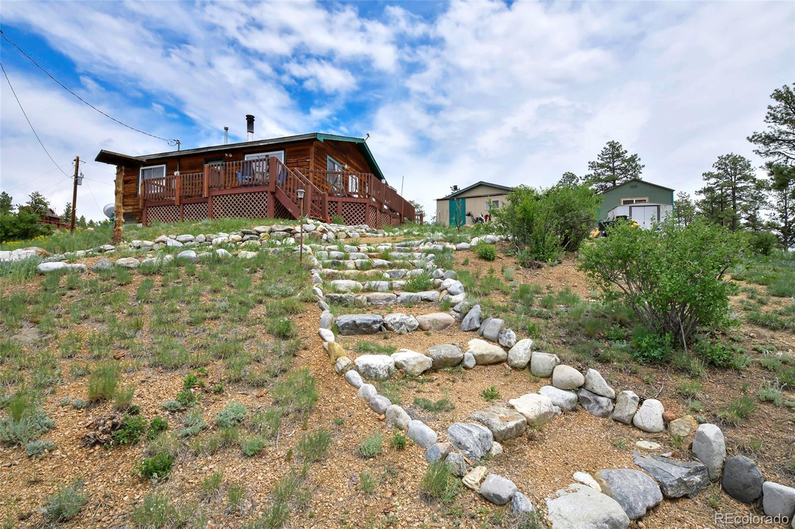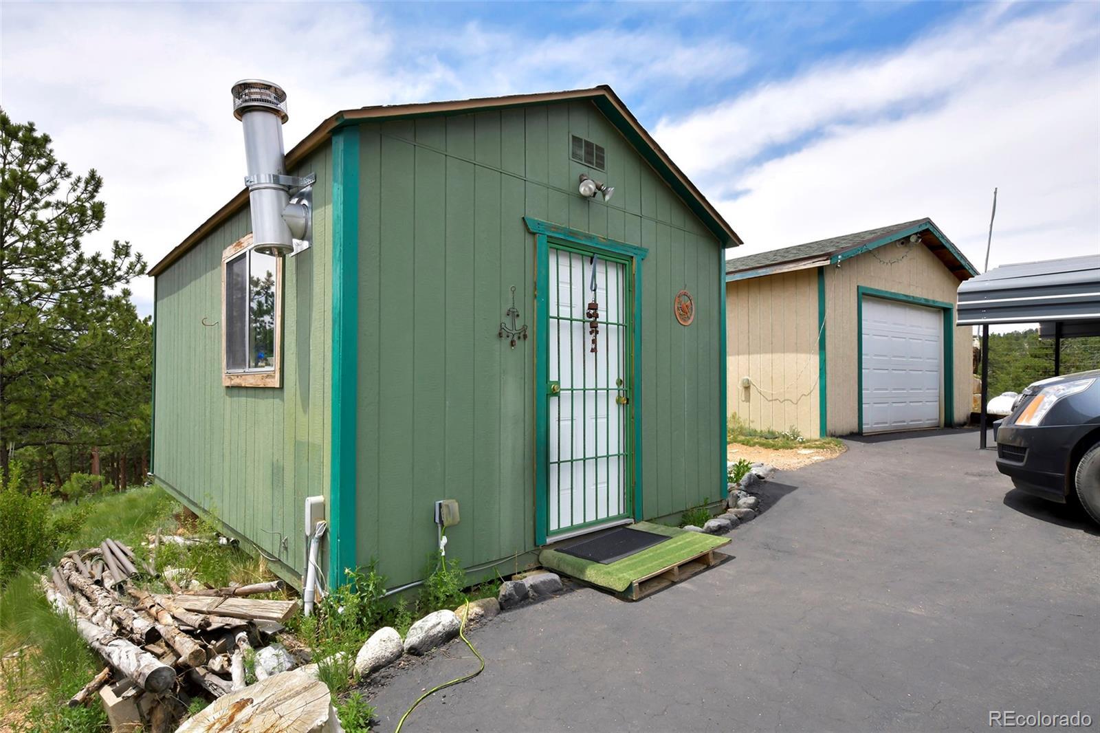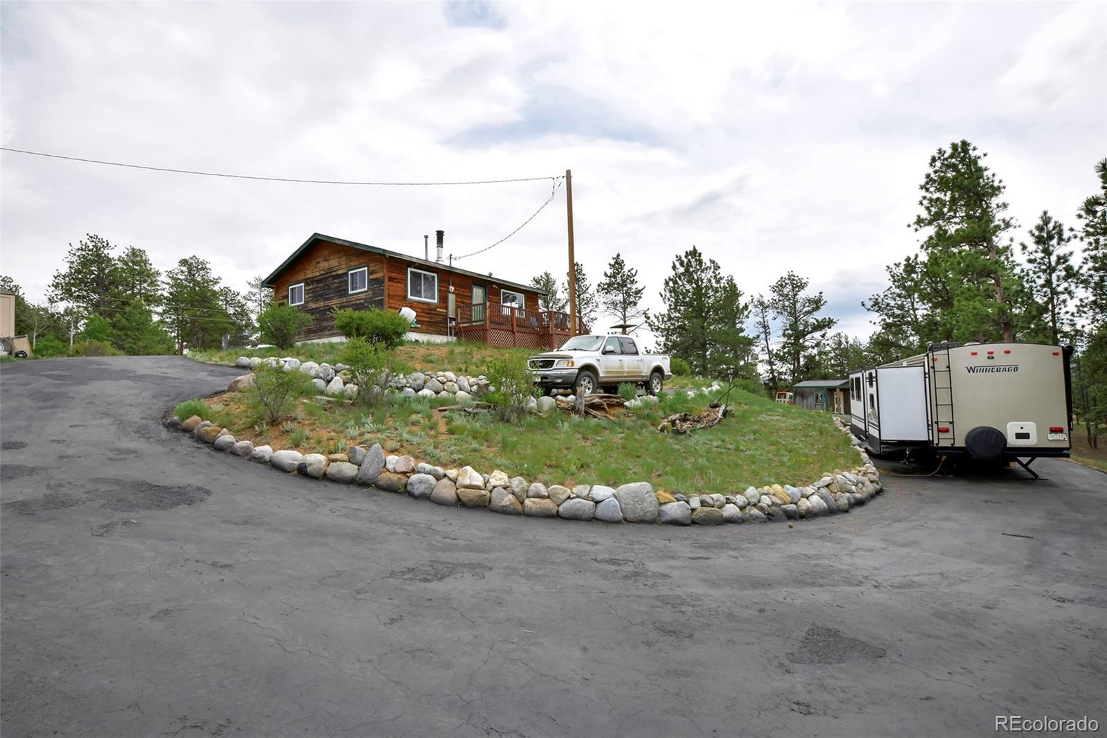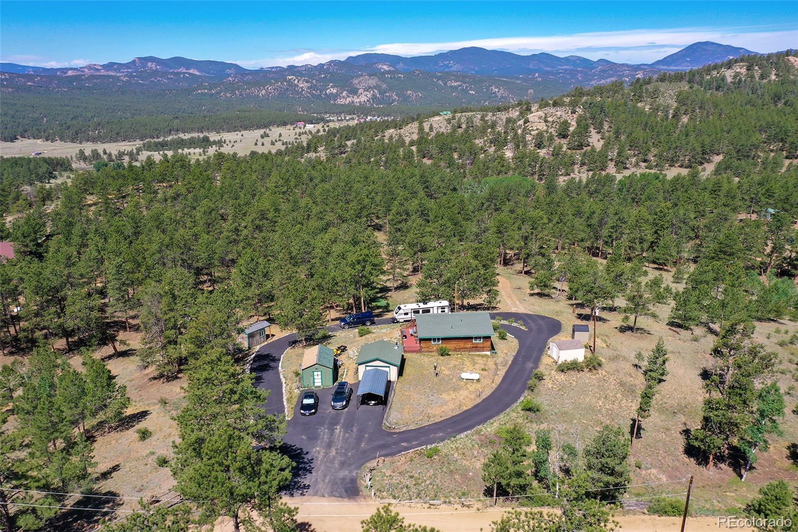 Welcome to this charming retreat nestled in the central Colorado mountains. This delightful home is the epitome of cozy mountain living. Set on five acres of meticulously mitigated mountain land, the property offers a rare blend of seclusion and natural beauty, making it an ideal haven for those who cherish tranquility and outdoor living. The home itself is a testament to thoughtful design and comfort. As you step inside, you'll be greeted by large windows that frame stunning views of the surrounding mountains and allow natural light into the living spaces. The open floor plan creates a seamless flow between all the living spaces making the most of the compact yet efficient layout. The kitchen is well-equipped with ample counter space, and custom cabinetry with inlayed Cripple Creek turquoise. One of the standout features of this property is the wrap-around deck, perfect for enjoying breathtaking scenery. Whether you're sipping your morning coffee or simply relaxing with a good book, the deck offers a versatile outdoor space that enhances the living experience. In addition to the main house, the property includes several out sheds, offering plenty of storage and potential for various uses. The property has a circular asphalted driveway around the cabin. There is a permanent full-time connection for a full-size RV– providing room for friends and family to come, visit and enjoy the mountains with you. The five-acre lot has been carefully mitigated to maintain the health and beauty of the mountain landscape. This extensive mitigation not only preserves the natural ecosystem but also provides peace of mind, ensuring the property is well-protected against environmental hazards. The land is dotted with pine, aspen and Colorado wild-flowers around the many trails on the property.