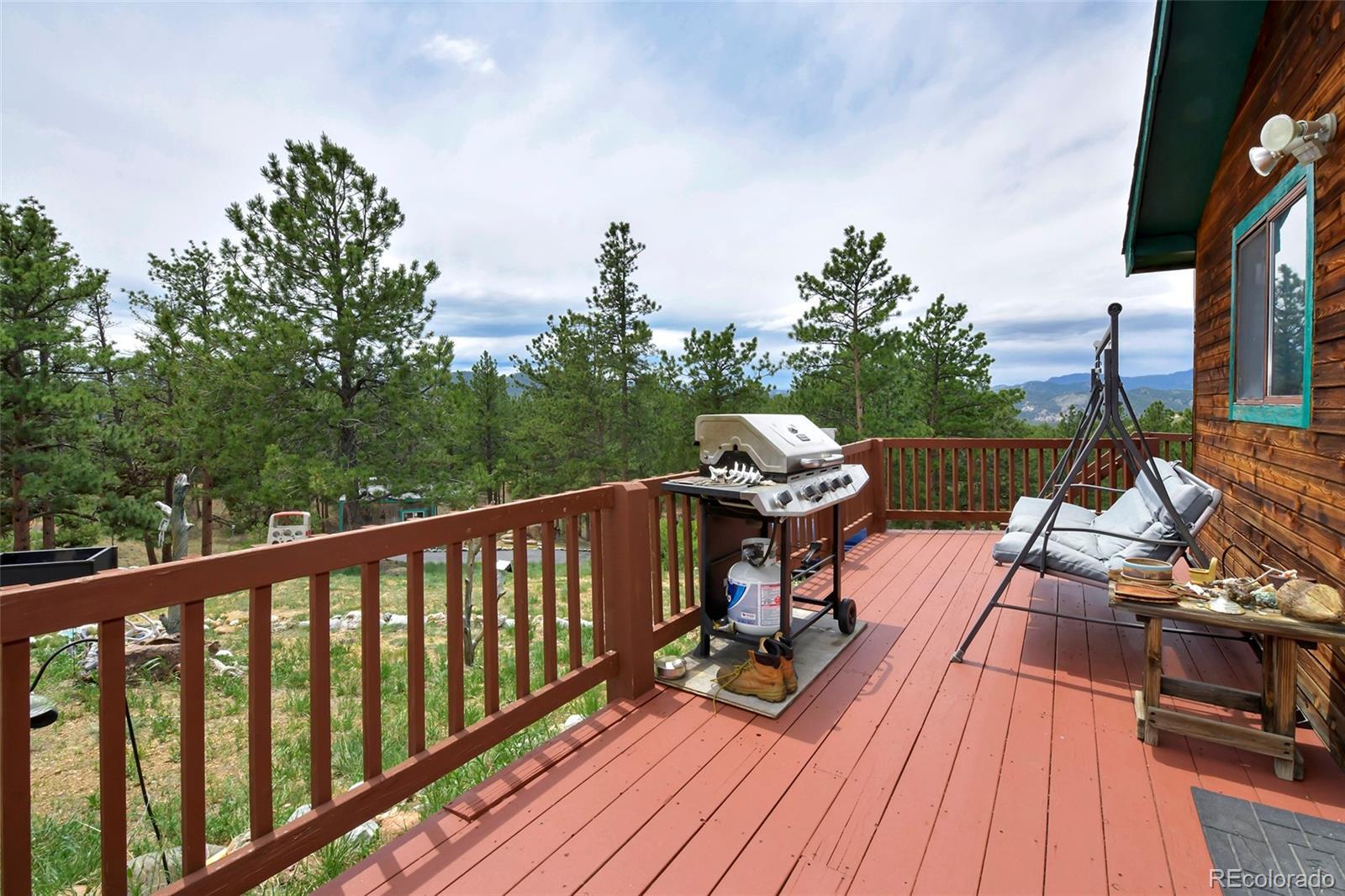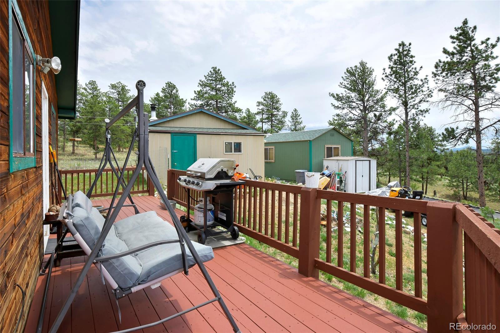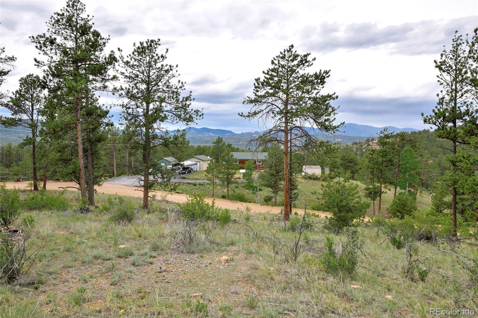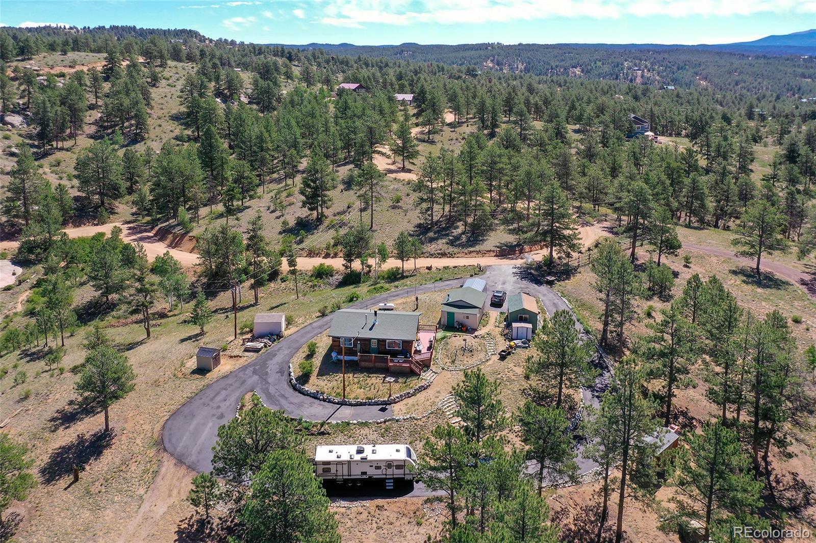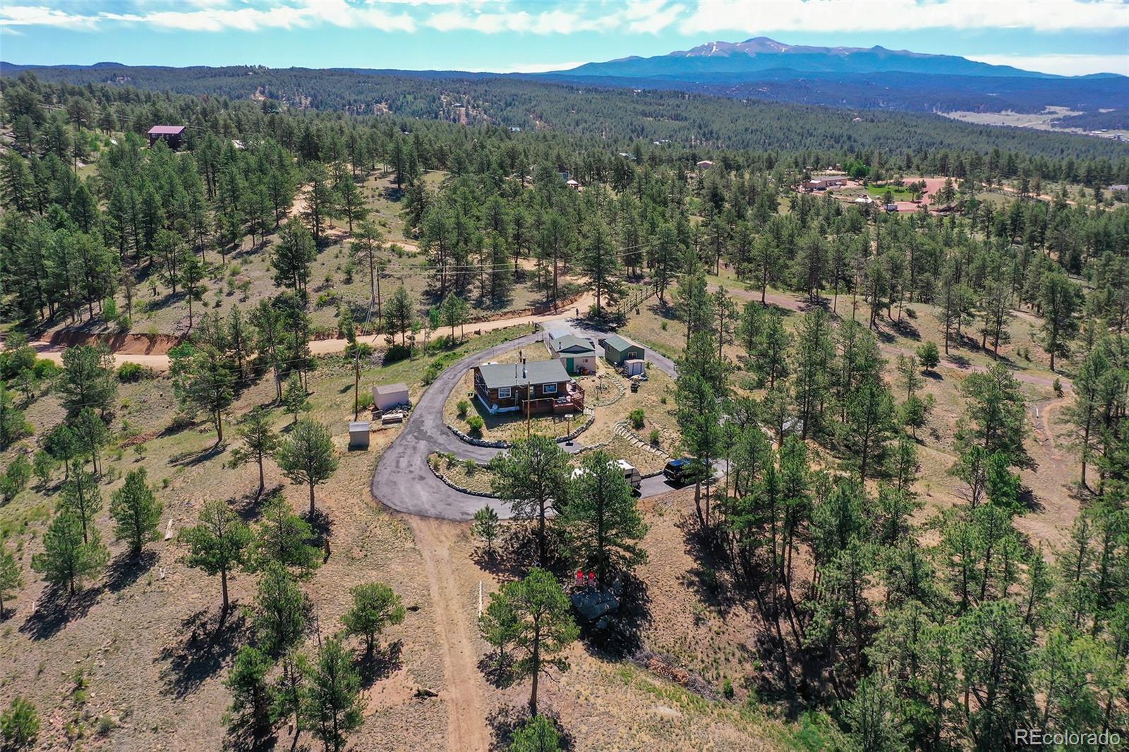 Welcome to this charming retreat nestled in the central Colorado mountains. This delightful home is the epitome of cozy mountain living. Set on five acres of meticulously mitigated mountain land, the property offers a rare blend of seclusion and natural beauty, making it an ideal haven for those who cherish tranquility and outdoor living. The home itself is a testament to thoughtful design and comfort. As you step inside, you'll be greeted by large windows that frame stunning views of the surrounding mountains and allow natural light into the living spaces. The open floor plan creates a seamless flow between all the living spaces making the most of the compact yet efficient layout. The kitchen is well-equipped with ample counter space, and custom cabinetry with inlayed Cripple Creek turquoise. One of the standout features of this property is the wrap-around deck, perfect for enjoying breathtaking scenery. Whether you're sipping your morning coffee or simply relaxing with a good book, the deck offers a versatile outdoor space that enhances the living experience. In addition to the main house, the property includes several out sheds, offering plenty of storage and potential for various uses. The property has a circular asphalted driveway around the cabin. There is a permanent full-time connection for a full-size RV– providing room for friends and family to come, visit and enjoy the mountains with you. The five-acre lot has been carefully mitigated to maintain the health and beauty of the mountain landscape. This extensive mitigation not only preserves the natural ecosystem but also provides peace of mind, ensuring the property is well-protected against environmental hazards. The land is dotted with pine, aspen and Colorado wild-flowers around the many trails on the property.