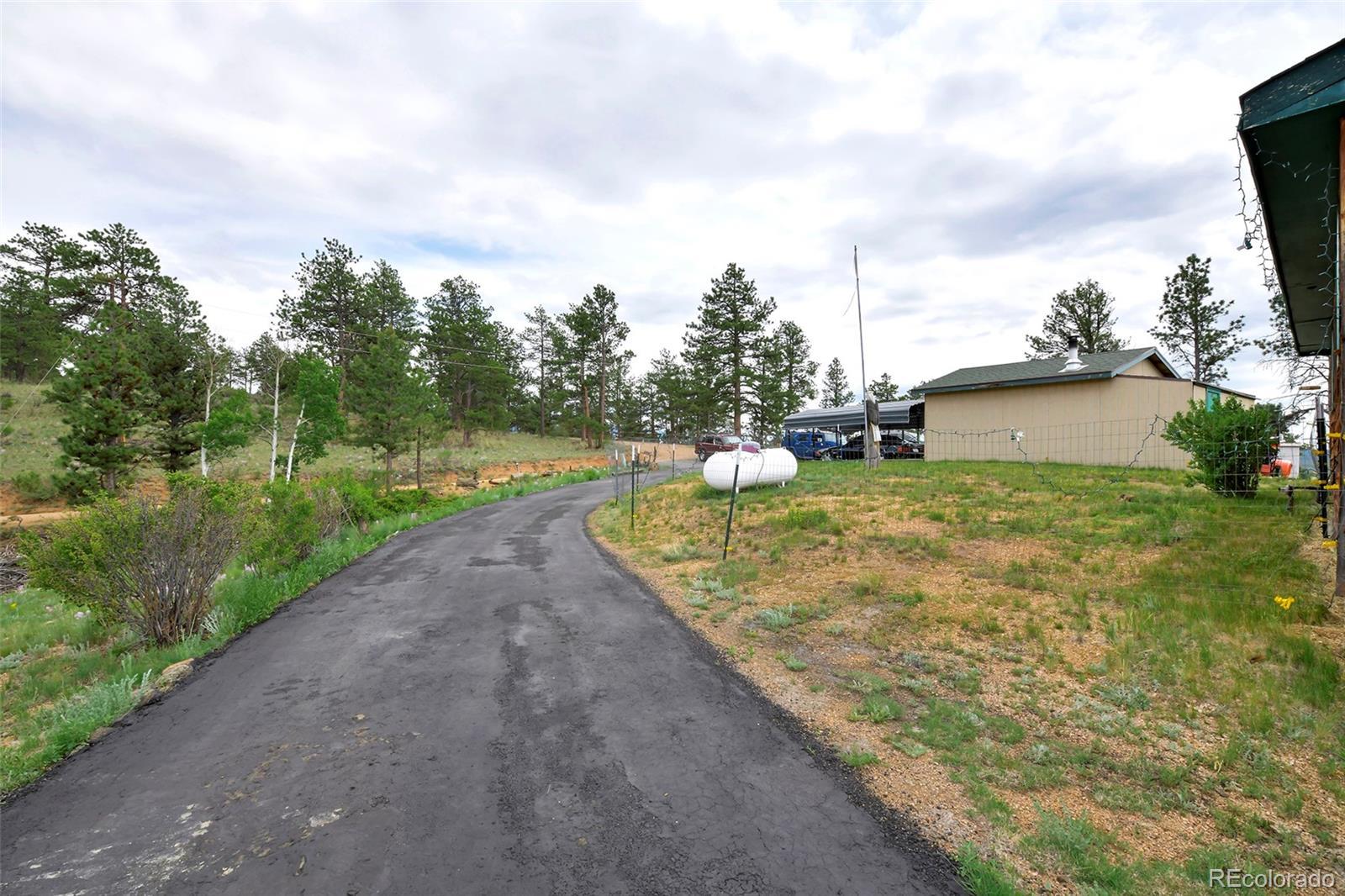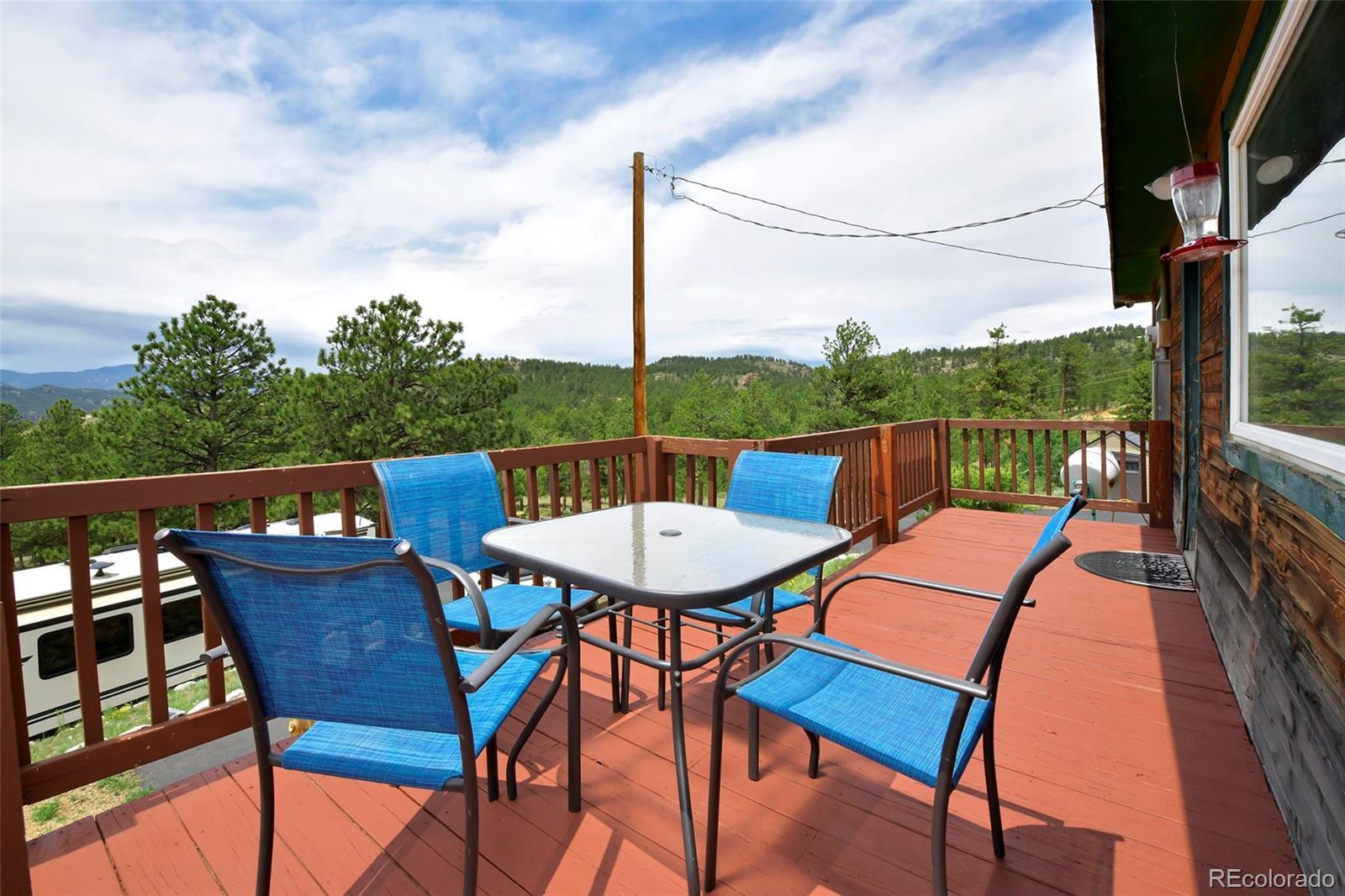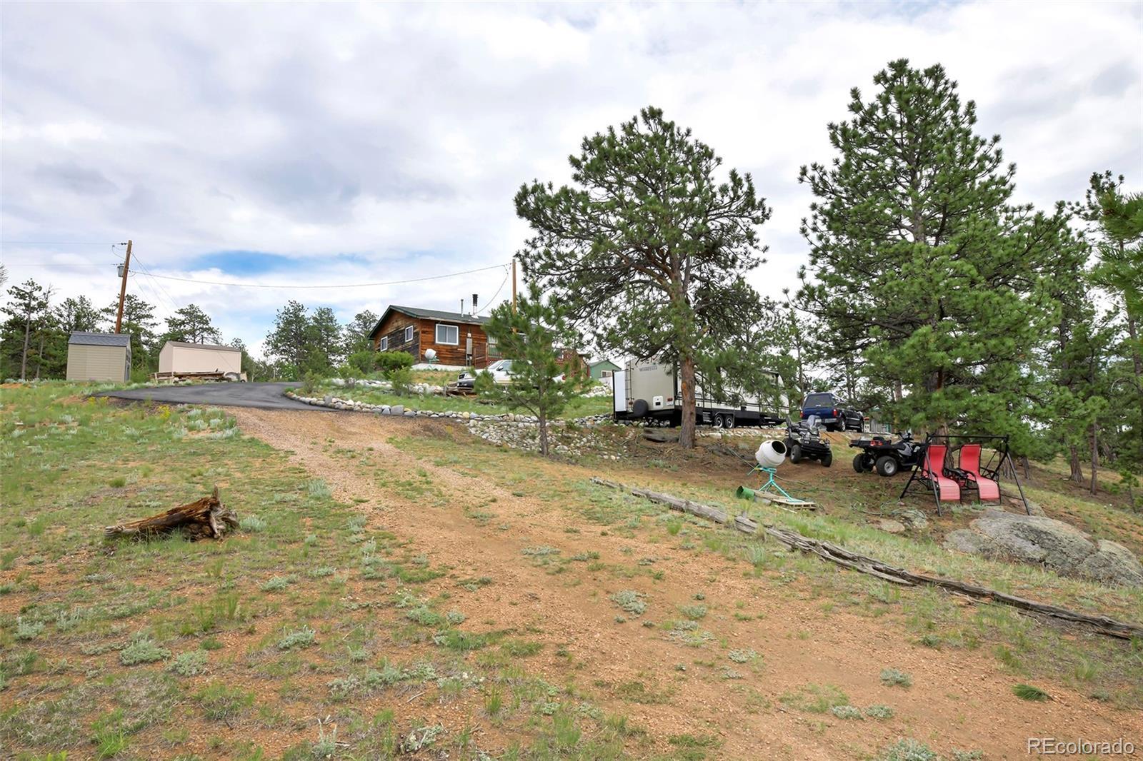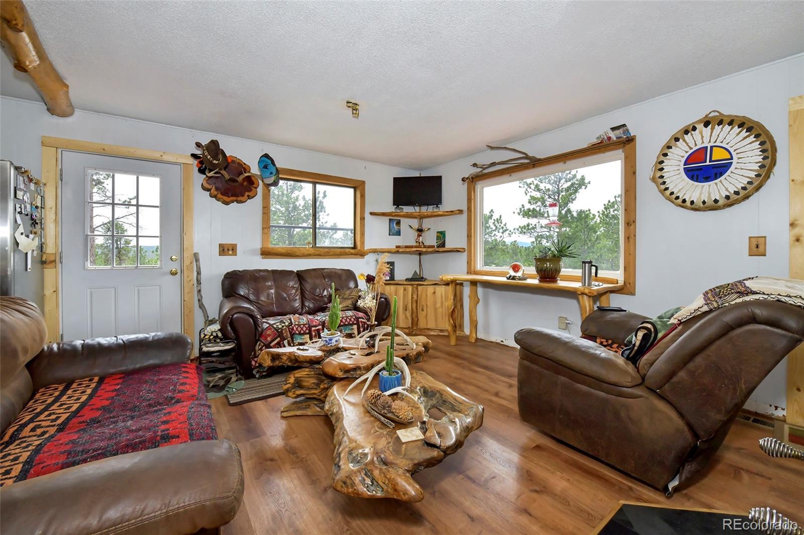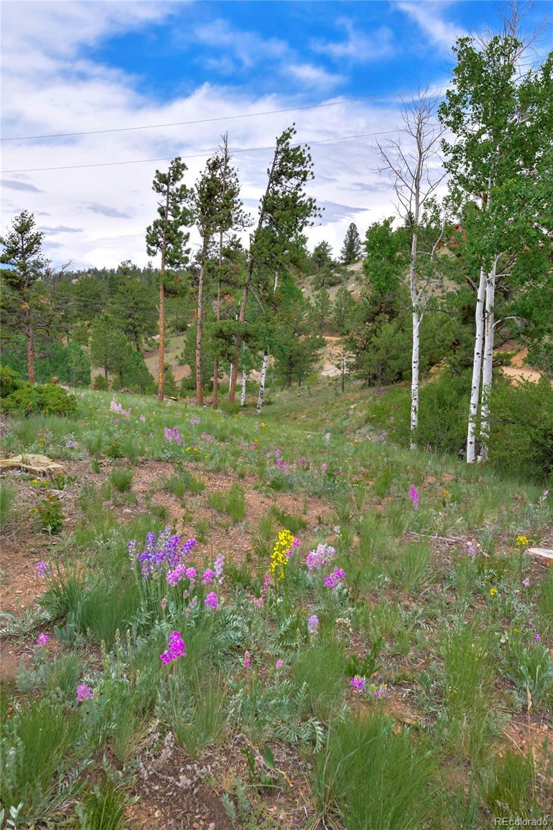 Welcome to this charming retreat nestled in the central Colorado mountains. This delightful home is the epitome of cozy mountain living. Set on five acres of meticulously mitigated mountain land, the property offers a rare blend of seclusion and natural beauty, making it an ideal haven for those who cherish tranquility and outdoor living. The home itself is a testament to thoughtful design and comfort. As you step inside, you'll be greeted by large windows that frame stunning views of the surrounding mountains and allow natural light into the living spaces. The open floor plan creates a seamless flow between all the living spaces making the most of the compact yet efficient layout. The kitchen is well-equipped with ample counter space, and custom cabinetry with inlayed Cripple Creek turquoise. One of the standout features of this property is the wrap-around deck, perfect for enjoying breathtaking scenery. Whether you're sipping your morning coffee or simply relaxing with a good book, the deck offers a versatile outdoor space that enhances the living experience. In addition to the main house, the property includes several out sheds, offering plenty of storage and potential for various uses. The property has a circular asphalted driveway around the cabin. There is a permanent full-time connection for a full-size RV– providing room for friends and family to come, visit and enjoy the mountains with you. The five-acre lot has been carefully mitigated to maintain the health and beauty of the mountain landscape. This extensive mitigation not only preserves the natural ecosystem but also provides peace of mind, ensuring the property is well-protected against environmental hazards. The land is dotted with pine, aspen and Colorado wild-flowers around the many trails on the property.