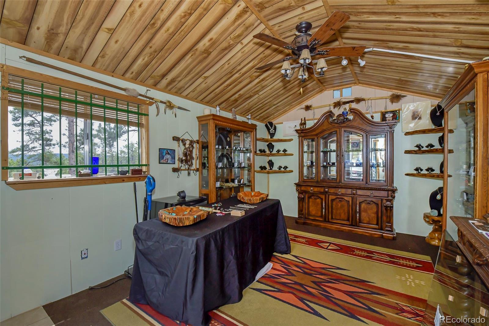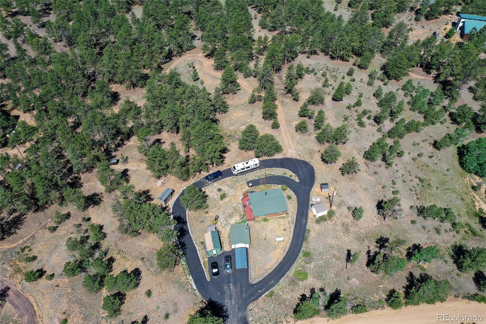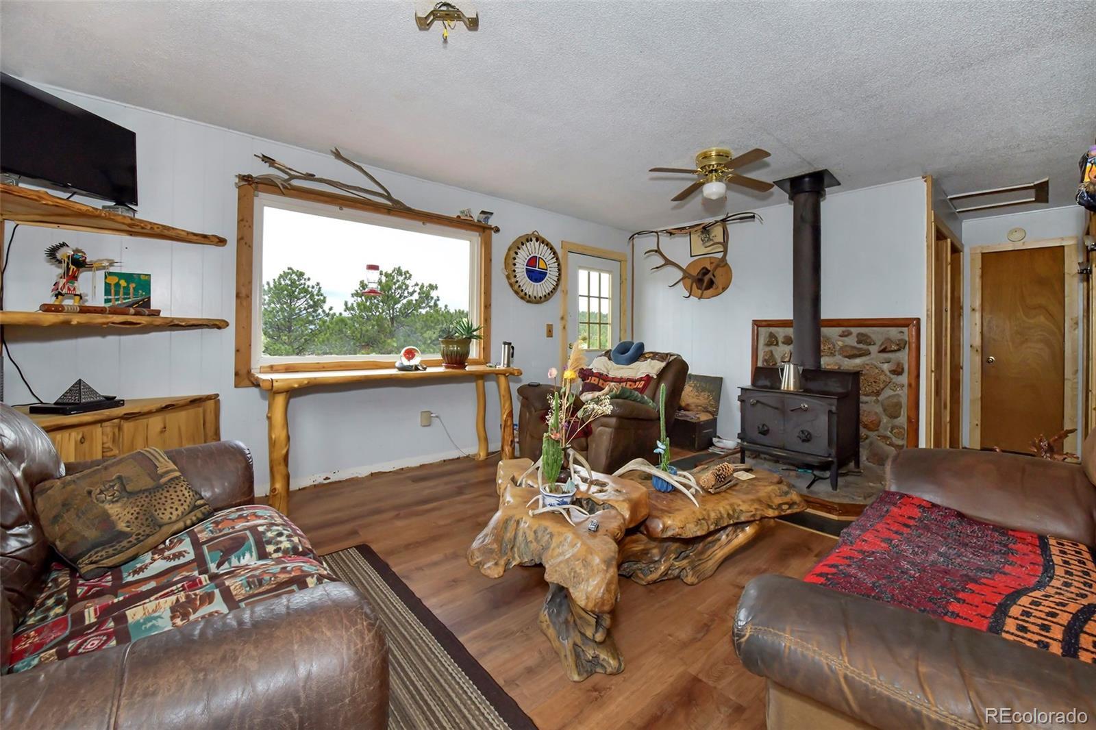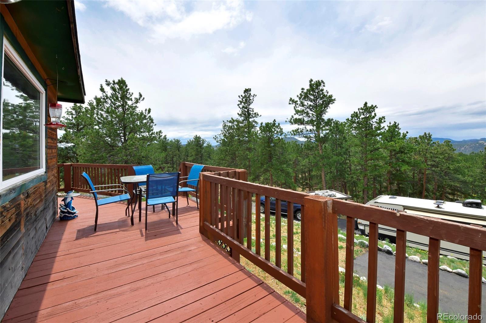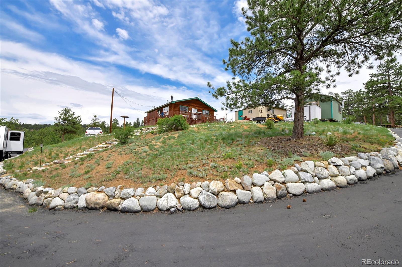 Welcome to this charming retreat nestled in the central Colorado mountains. This delightful home is the epitome of cozy mountain living. Set on five acres of meticulously mitigated mountain land, the property offers a rare blend of seclusion and natural beauty, making it an ideal haven for those who cherish tranquility and outdoor living. The home itself is a testament to thoughtful design and comfort. As you step inside, you'll be greeted by large windows that frame stunning views of the surrounding mountains and allow natural light into the living spaces. The open floor plan creates a seamless flow between all the living spaces making the most of the compact yet efficient layout. The kitchen is well-equipped with ample counter space, and custom cabinetry with inlayed Cripple Creek turquoise. One of the standout features of this property is the wrap-around deck, perfect for enjoying breathtaking scenery. Whether you're sipping your morning coffee or simply relaxing with a good book, the deck offers a versatile outdoor space that enhances the living experience. In addition to the main house, the property includes several out sheds, offering plenty of storage and potential for various uses. The property has a circular asphalted driveway around the cabin. There is a permanent full-time connection for a full-size RV– providing room for friends and family to come, visit and enjoy the mountains with you. The five-acre lot has been carefully mitigated to maintain the health and beauty of the mountain landscape. This extensive mitigation not only preserves the natural ecosystem but also provides peace of mind, ensuring the property is well-protected against environmental hazards. The land is dotted with pine, aspen and Colorado wild-flowers around the many trails on the property.