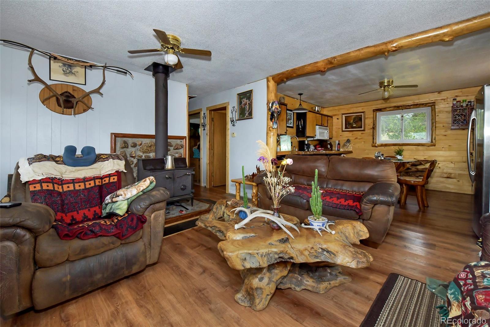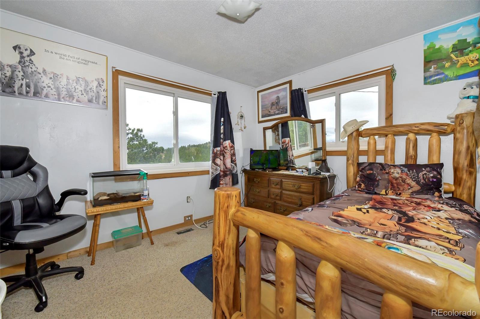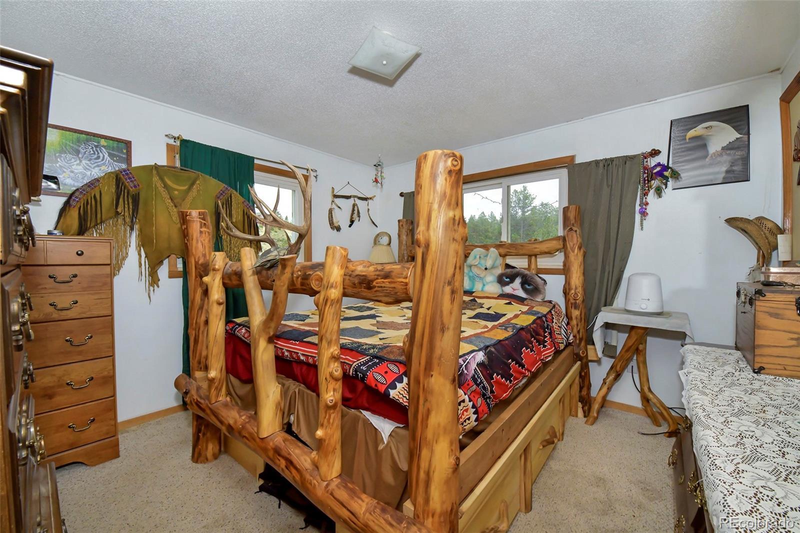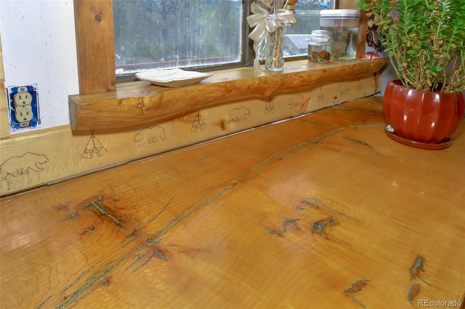 Welcome to this charming retreat nestled in the central Colorado mountains. This delightful home is the epitome of cozy mountain living. Set on five acres of meticulously mitigated mountain land, the property offers a rare blend of seclusion and natural beauty, making it an ideal haven for those who cherish tranquility and outdoor living. The home itself is a testament to thoughtful design and comfort. As you step inside, you'll be greeted by large windows that frame stunning views of the surrounding mountains and allow natural light into the living spaces. The open floor plan creates a seamless flow between all the living spaces making the most of the compact yet efficient layout. The kitchen is well-equipped with ample counter space, and custom cabinetry with inlayed Cripple Creek turquoise. One of the standout features of this property is the wrap-around deck, perfect for enjoying breathtaking scenery. Whether you're sipping your morning coffee or simply relaxing with a good book, the deck offers a versatile outdoor space that enhances the living experience. In addition to the main house, the property includes several out sheds, offering plenty of storage and potential for various uses. The property has a circular asphalted driveway around the cabin. There is a permanent full-time connection for a full-size RV– providing room for friends and family to come, visit and enjoy the mountains with you. The five-acre lot has been carefully mitigated to maintain the health and beauty of the mountain landscape. This extensive mitigation not only preserves the natural ecosystem but also provides peace of mind, ensuring the property is well-protected against environmental hazards. The land is dotted with pine, aspen and Colorado wild-flowers around the many trails on the property.