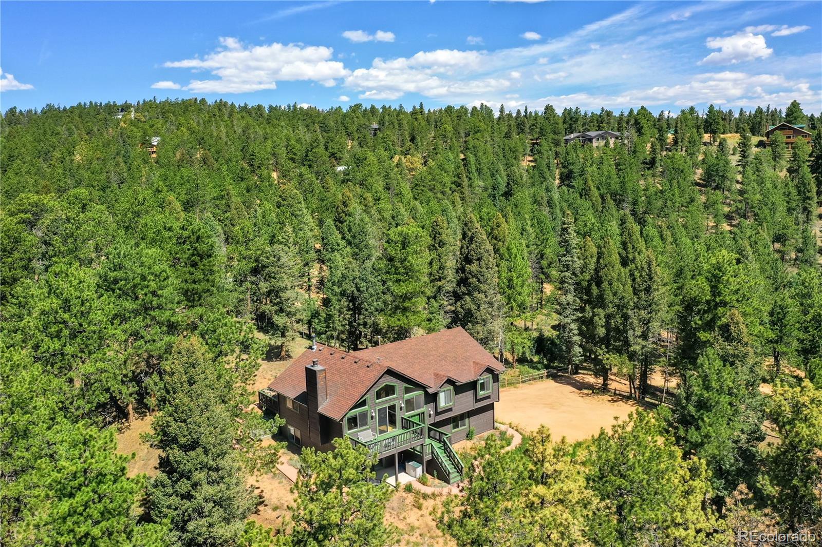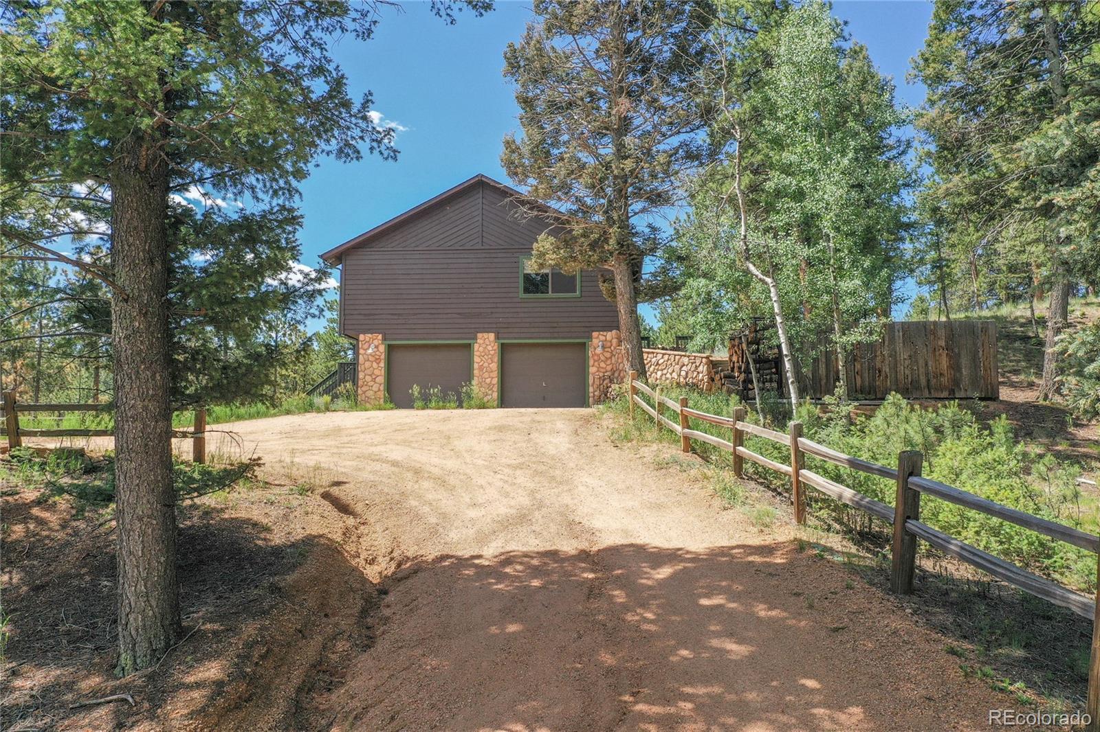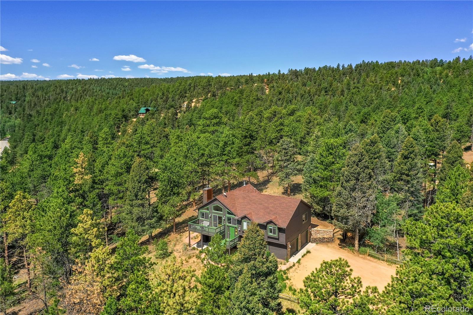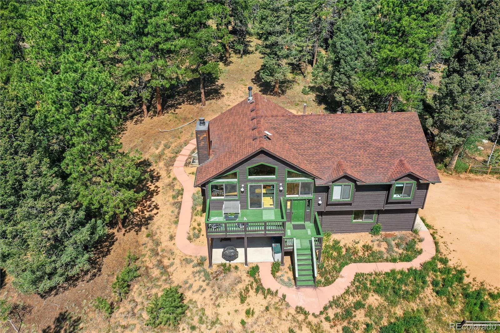 Charming Updated Bi-Level Home on 5+ Acres Near Woodland Park; If you're in the market for a beautifully maintained,open-concept home just minutes from Woodland Park, your search ends here; this inviting property seamlessly blends modern upgrades with cozy mountain charm; From the moment you arrive, the freshly painted exterior and decks welcome you with style and curb appeal. These outdoor spaces are perfect for relaxing with a morning coffee or entertaining guestsamidst the natural surroundings; Inside, you'll be greeted by gleaming hardwood floors and an abundance of natural light streaming through large windows; The spacious open layout is enhanced by recessed lighting and ceiling fans throughout,offering comfort and energy efficiency year-round; The heart of the home—the kitchen—has been thoughtfully updated withnew stainless-steel appliances, including a Frigidaire refrigerator, LG stove and microwave, Samsung dishwasher, and a Glacier Bay sink. A central island with a breakfast bar offers the perfect spot for casual meals and conversation; The livingroom features a stunning stone-faced wood-burning fireplace and a Hearthstone Radiant wood stove, adding both warmth and rustic elegance; The main level primary suite boasts a private bath and a walk-in closet, while two additional bedroomsoffer brand-new carpet, track lighting, and ample space for family or guests; A full guest bathroom features slate tile flooring and a granite countertop; Downstairs, enjoy a massive media room—ideal for movie nights, game days, or extraguest space; The lower level also includes a dedicated laundry area with pantry storage and convenient access to the two-car attached garage; There’s even an RV turnaround for added flexibility in the drive cutout; Additionally property has been fire midigated, USB outlets, and a blend of stylish fixtures and upgrades throughout; Don't miss the opportunity to make it yours!