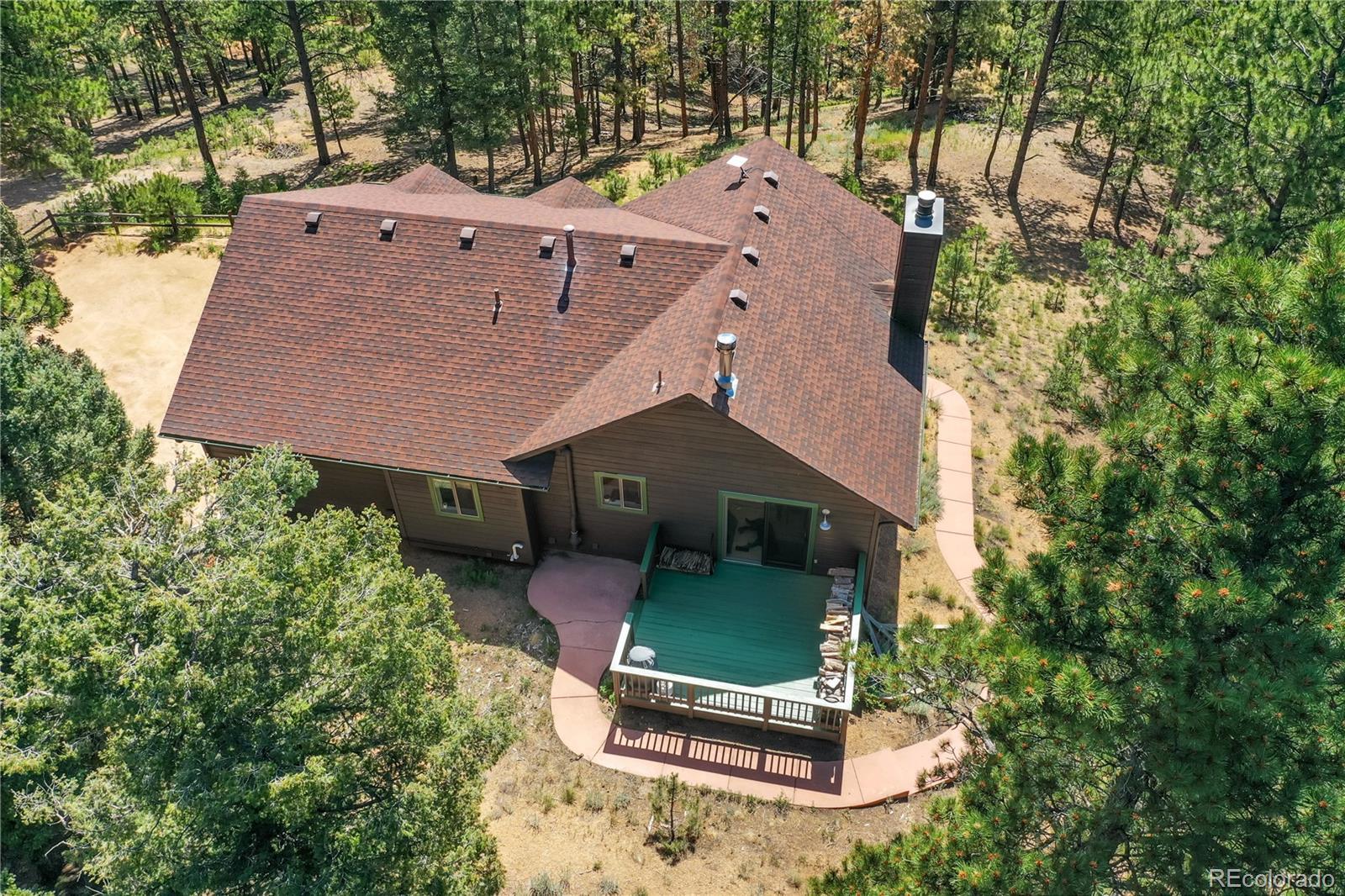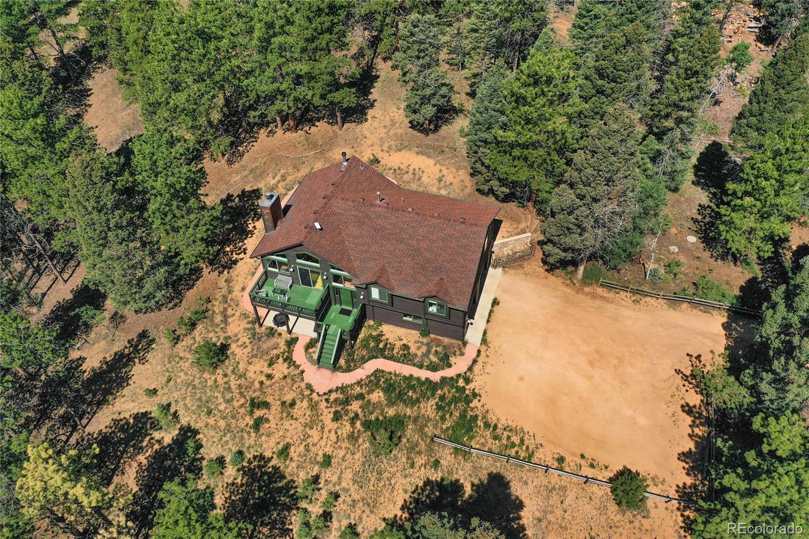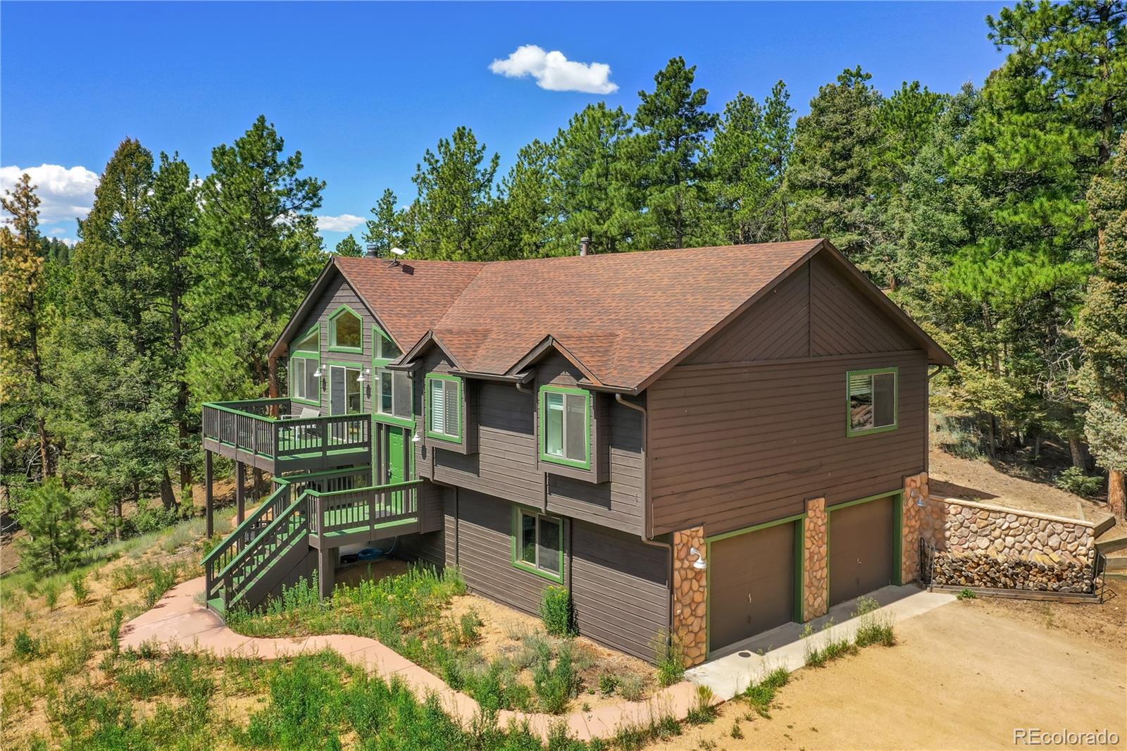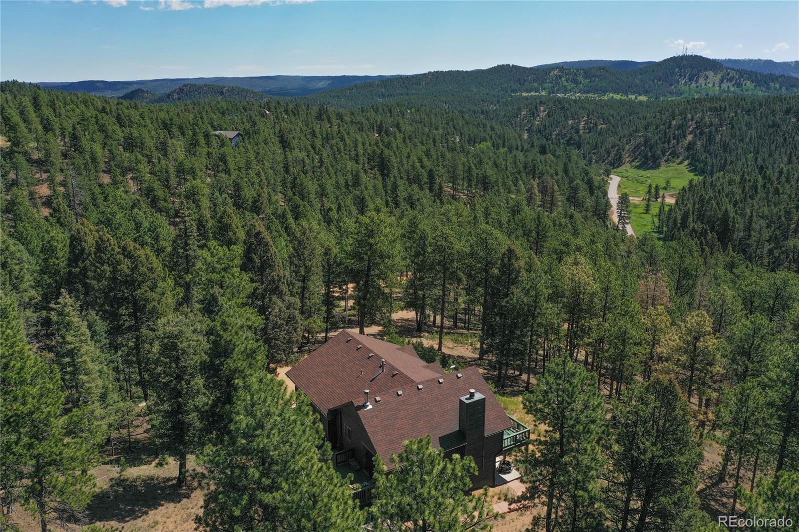 Charming Updated Bi-Level Home on 5+ Acres Near Woodland Park; If you're in the market for a beautifully maintained,open-concept home just minutes from Woodland Park, your search ends here; this inviting property seamlessly blends modern upgrades with cozy mountain charm; From the moment you arrive, the freshly painted exterior and decks welcome you with style and curb appeal. These outdoor spaces are perfect for relaxing with a morning coffee or entertaining guestsamidst the natural surroundings; Inside, you'll be greeted by gleaming hardwood floors and an abundance of natural light streaming through large windows; The spacious open layout is enhanced by recessed lighting and ceiling fans throughout,offering comfort and energy efficiency year-round; The heart of the home—the kitchen—has been thoughtfully updated withnew stainless-steel appliances, including a Frigidaire refrigerator, LG stove and microwave, Samsung dishwasher, and a Glacier Bay sink. A central island with a breakfast bar offers the perfect spot for casual meals and conversation; The livingroom features a stunning stone-faced wood-burning fireplace and a Hearthstone Radiant wood stove, adding both warmth and rustic elegance; The main level primary suite boasts a private bath and a walk-in closet, while two additional bedroomsoffer brand-new carpet, track lighting, and ample space for family or guests; A full guest bathroom features slate tile flooring and a granite countertop; Downstairs, enjoy a massive media room—ideal for movie nights, game days, or extraguest space; The lower level also includes a dedicated laundry area with pantry storage and convenient access to the two-car attached garage; There’s even an RV turnaround for added flexibility in the drive cutout; Additionally property has been fire midigated, USB outlets, and a blend of stylish fixtures and upgrades throughout; Don't miss the opportunity to make it yours!