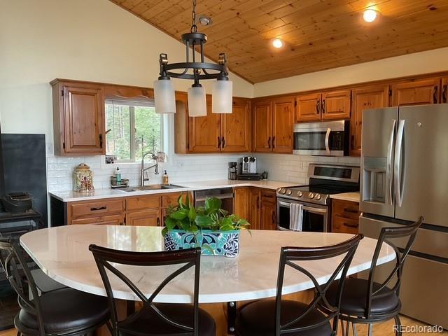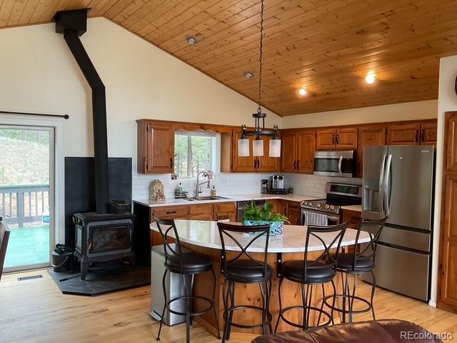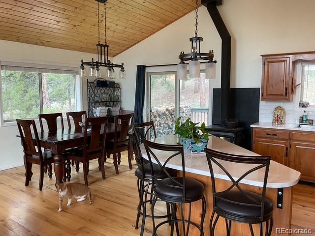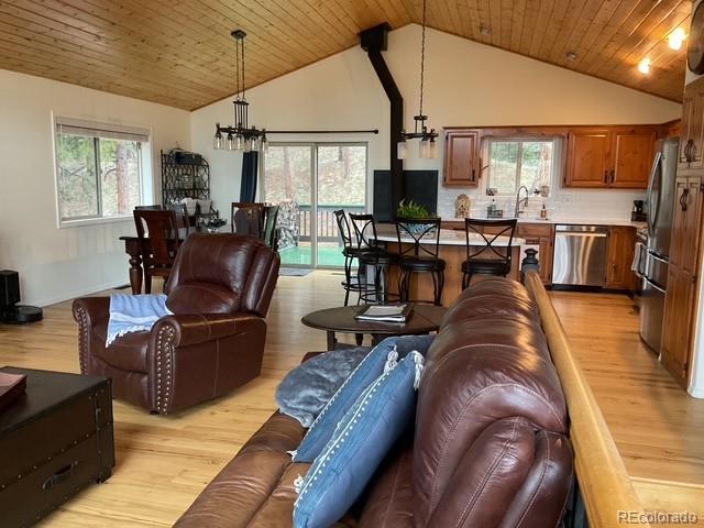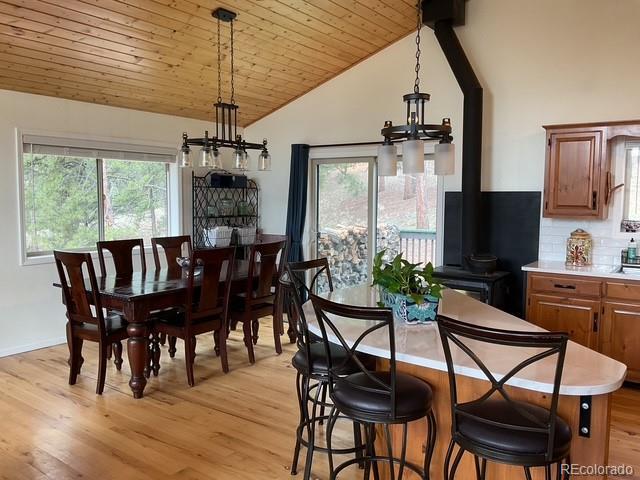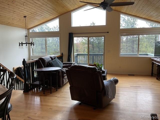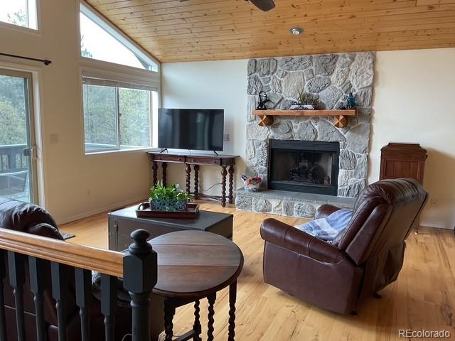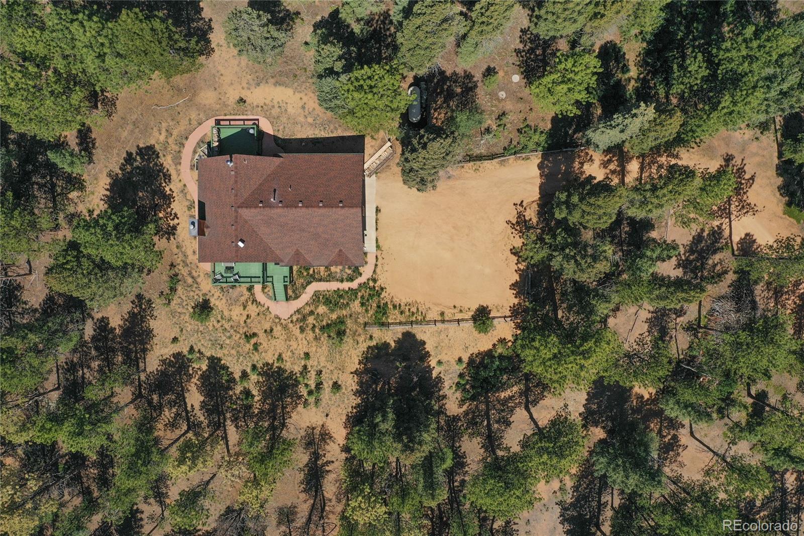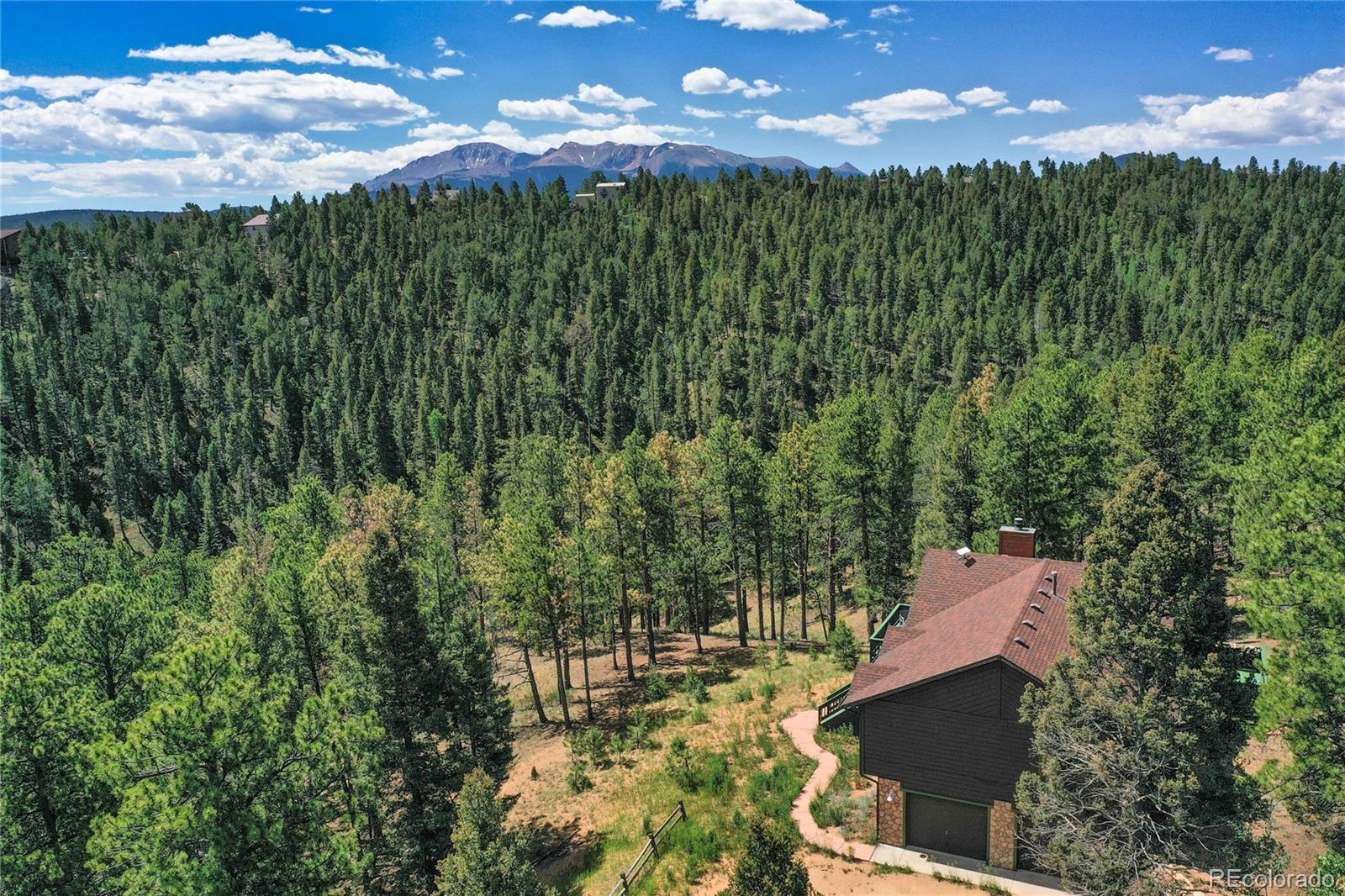 Charming Updated Bi-Level Home on 5+ Acres Near Woodland Park; If you're in the market for a beautifully maintained,open-concept home just minutes from Woodland Park, your search ends here; this inviting property seamlessly blends modern upgrades with cozy mountain charm; From the moment you arrive, the freshly painted exterior and decks welcome you with style and curb appeal. These outdoor spaces are perfect for relaxing with a morning coffee or entertaining guestsamidst the natural surroundings; Inside, you'll be greeted by gleaming hardwood floors and an abundance of natural light streaming through large windows; The spacious open layout is enhanced by recessed lighting and ceiling fans throughout,offering comfort and energy efficiency year-round; The heart of the home—the kitchen—has been thoughtfully updated withnew stainless-steel appliances, including a Frigidaire refrigerator, LG stove and microwave, Samsung dishwasher, and a Glacier Bay sink. A central island with a breakfast bar offers the perfect spot for casual meals and conversation; The livingroom features a stunning stone-faced wood-burning fireplace and a Hearthstone Radiant wood stove, adding both warmth and rustic elegance; The main level primary suite boasts a private bath and a walk-in closet, while two additional bedroomsoffer brand-new carpet, track lighting, and ample space for family or guests; A full guest bathroom features slate tile flooring and a granite countertop; Downstairs, enjoy a massive media room—ideal for movie nights, game days, or extraguest space; The lower level also includes a dedicated laundry area with pantry storage and convenient access to the two-car attached garage; There’s even an RV turnaround for added flexibility in the drive cutout; Additionally property has been fire midigated, USB outlets, and a blend of stylish fixtures and upgrades throughout; Don't miss the opportunity to make it yours!