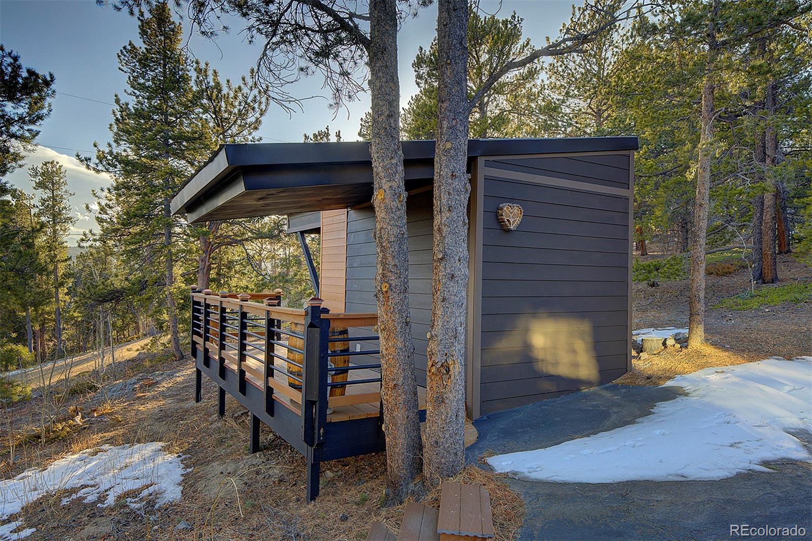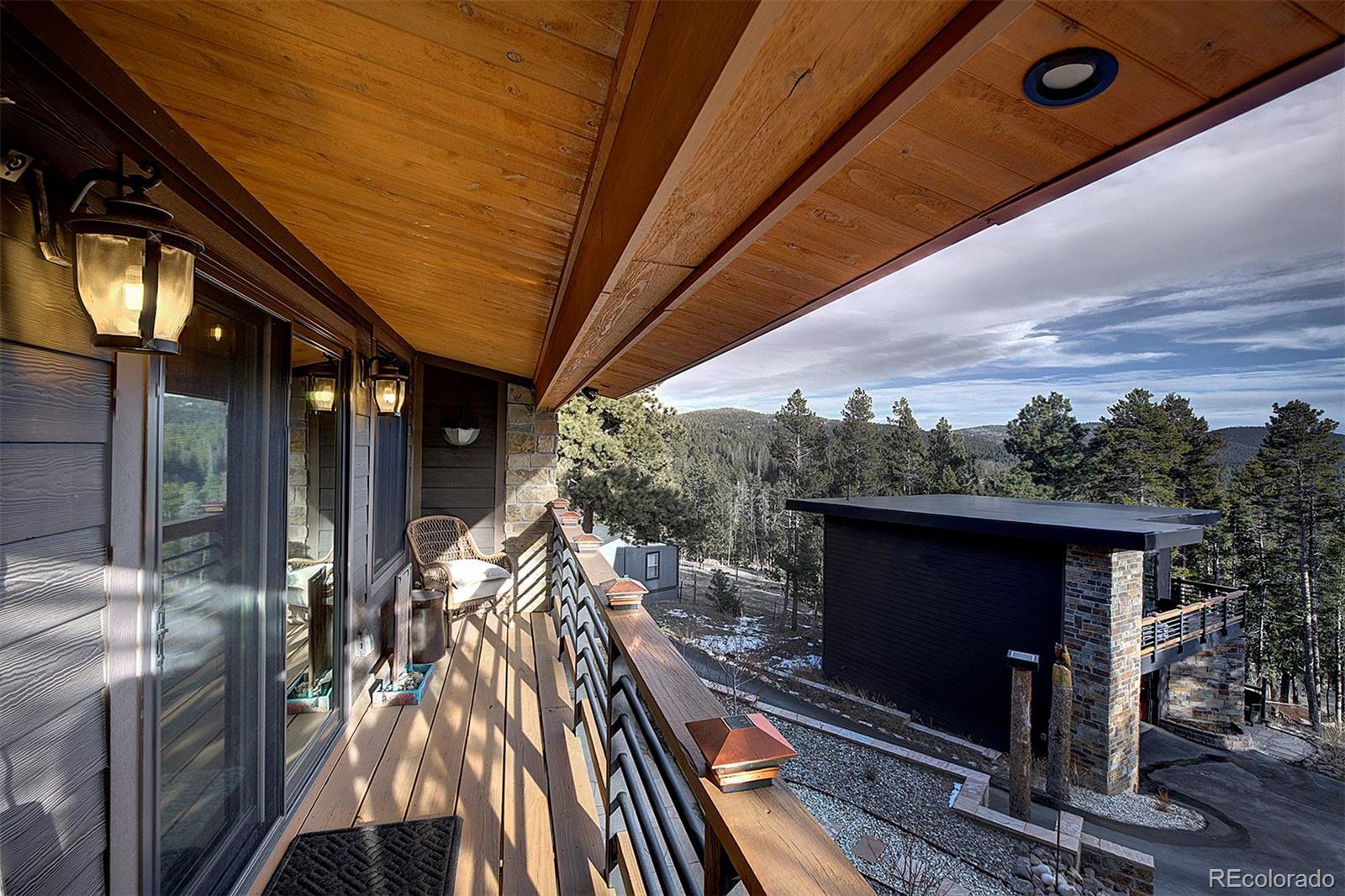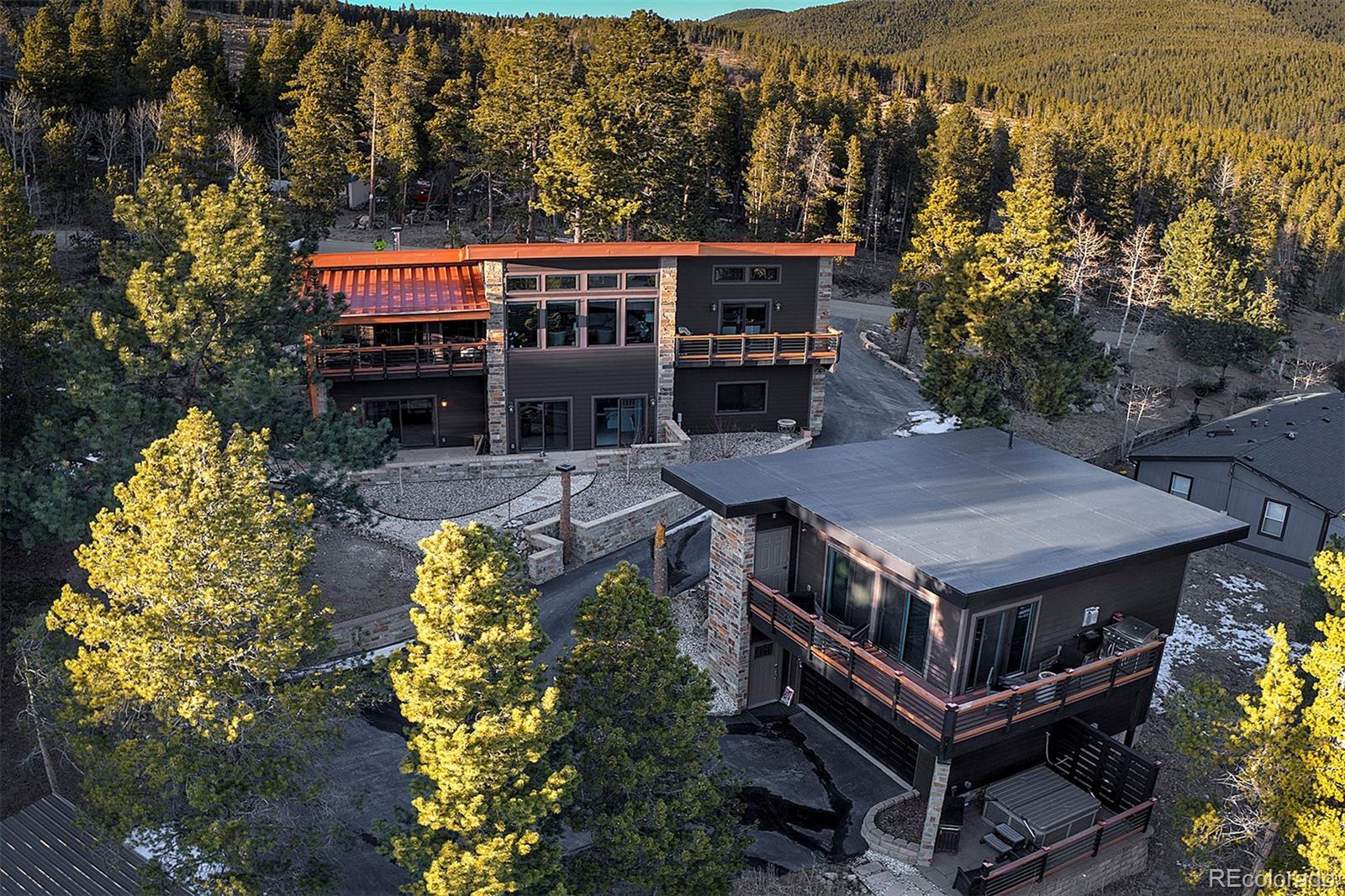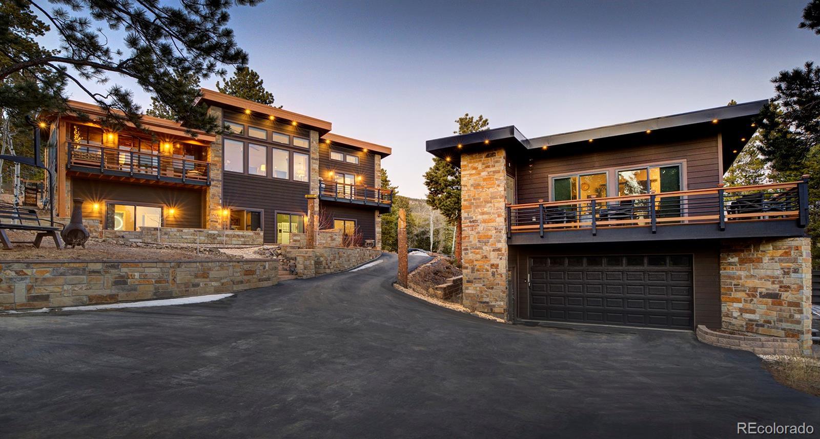 Tucked against protected open space with the Arapaho National Forest just across the street, this exceptional mountain retreat offers rare privacy, panoramic Continental Divide views, and a beautifully appointed guest residence that mirrors the quality of the main home—all without the constraints of an HOA. The main residence is a study in thoughtful craftsmanship and comfort. Warm hardwood floors, custom cabinetry, cast river rock countertops, and Jenn-Air appliances set an elevated tone, while wood-cased solar windows frame ever-changing alpine scenery. In-floor radiant heat, on-demand hot water, advanced water filtration, and remote-controlled blinds ensure modern ease throughout. The lower-level primary suite and private office both walk out to serene outdoor spaces with expansive views, and a wood-burning fireplace anchors the home with classic mountain charm. A heated, finished two-car attached garage with epoxy floors, metal roof, and James Hardie Siding completes the main home’s refined functionality. Above the heated two-car detached garage, the 2015 one bed/one bath ADU feels like a private alpine suite, with hardwood floors, a gas fireplace, barn doors, a generous pantry, and a spa-grade hot tub. Thoughtfully designed and impeccably finished, it's an ideal setting for guests or extended family, while its strong short-term rental history is an added advantage for owners who choose to leverage it. That it is already booked well into the season underscores the property’s proven desirability. A commercial well and advanced septic system serve both residences, with separate gas metering and shared electric. The STR license is not transferable; however, the infrastructure and performance history are firmly in place for a seamless transition. Additional amenities include a greenhouse, versatile shed, high-speed internet, and close proximity to skiing, dining, and gaming. This is mountain living, elevated—and intelligently invested.