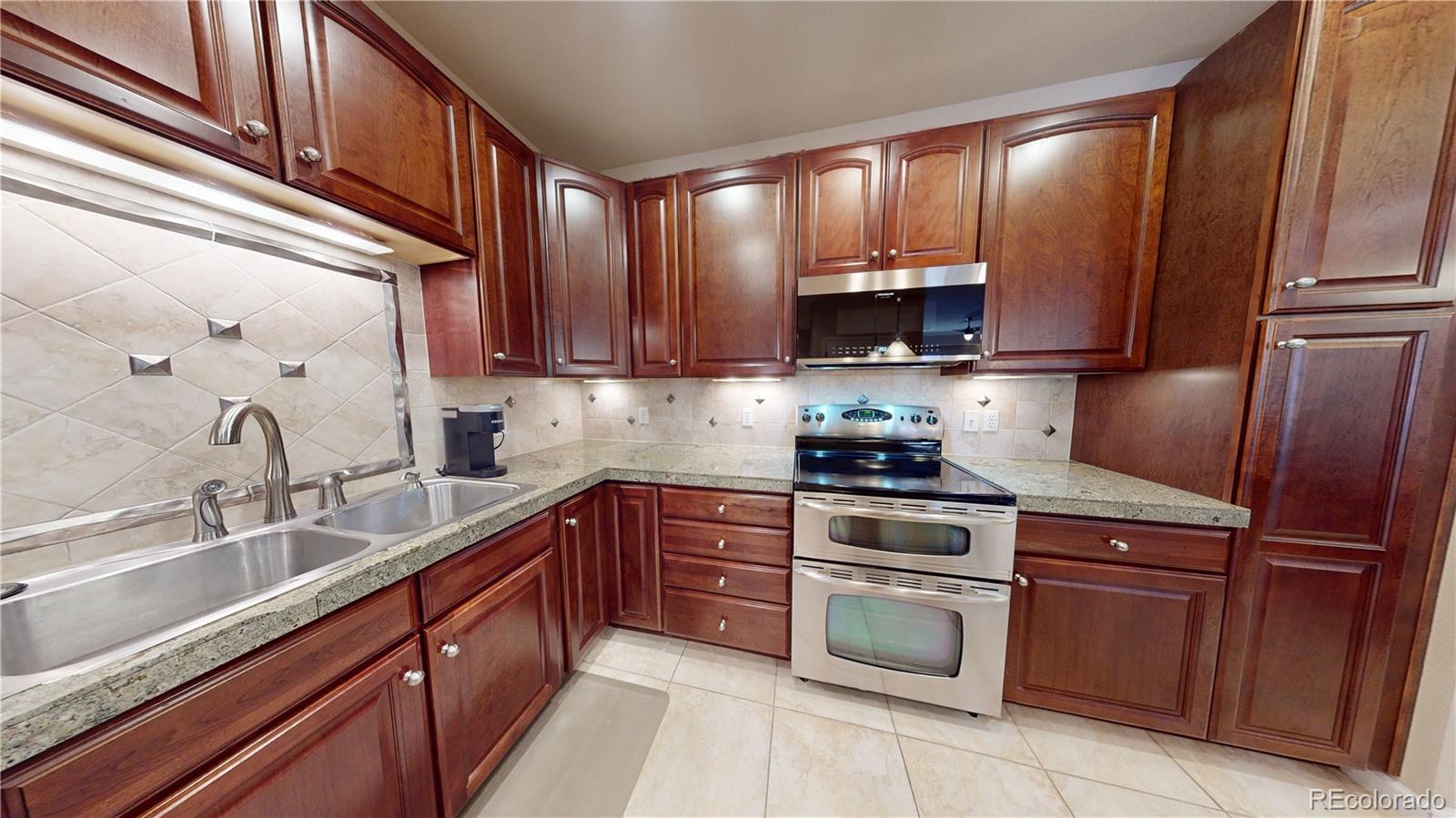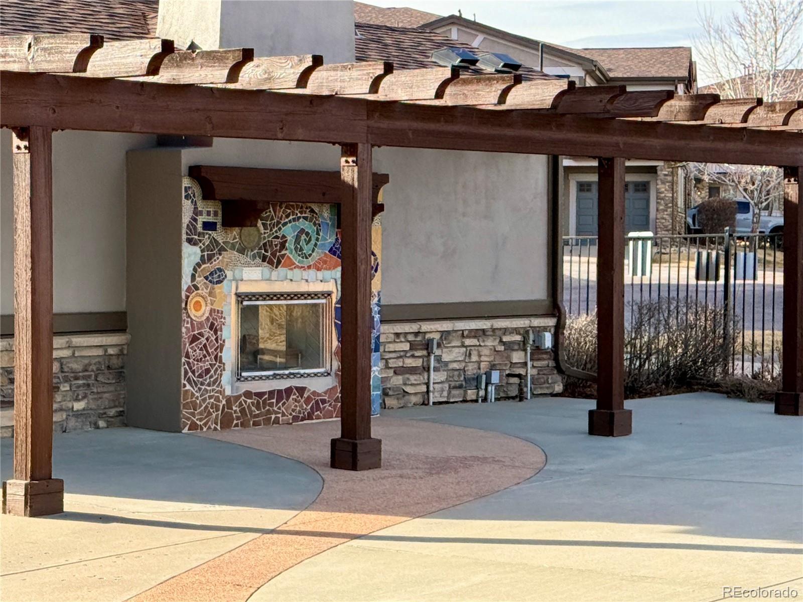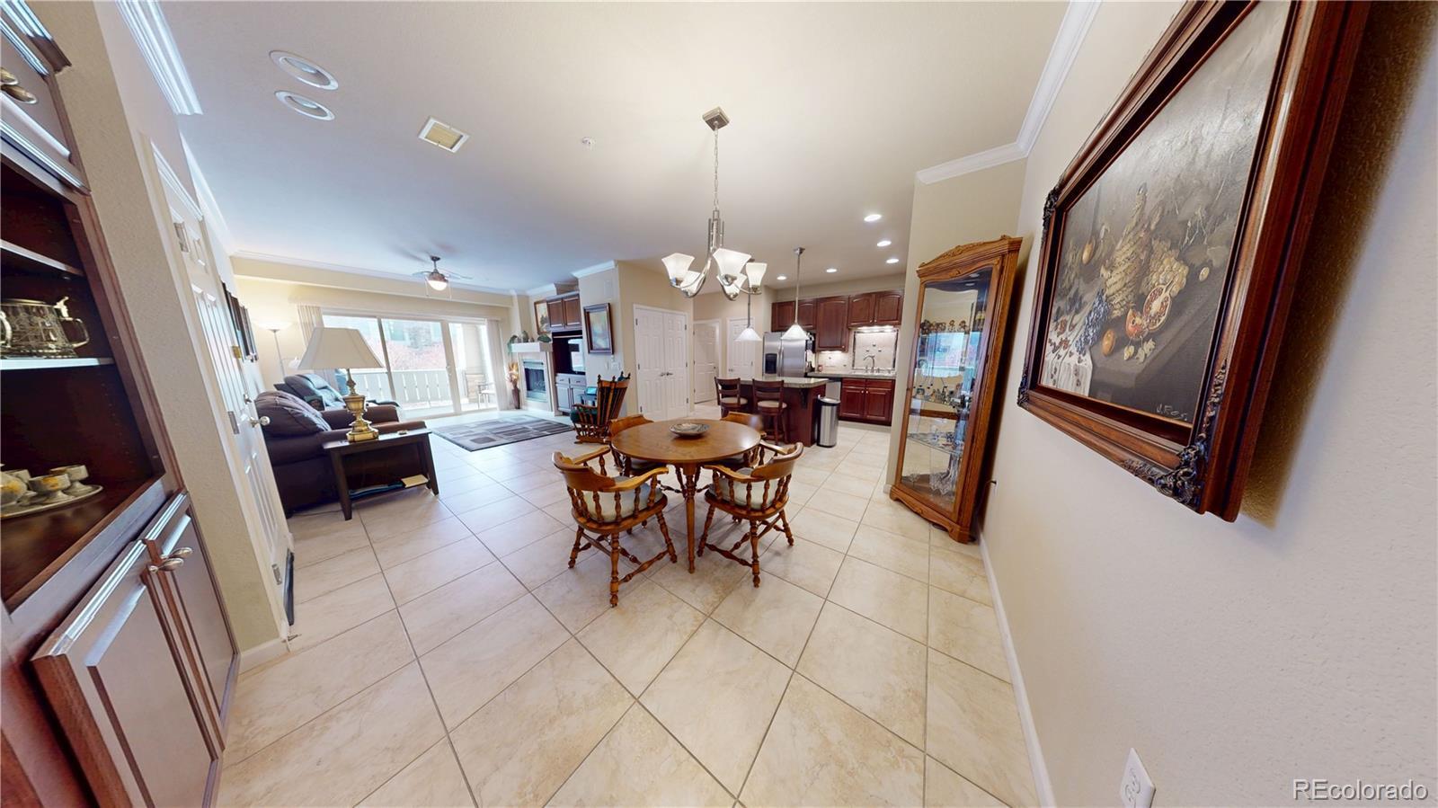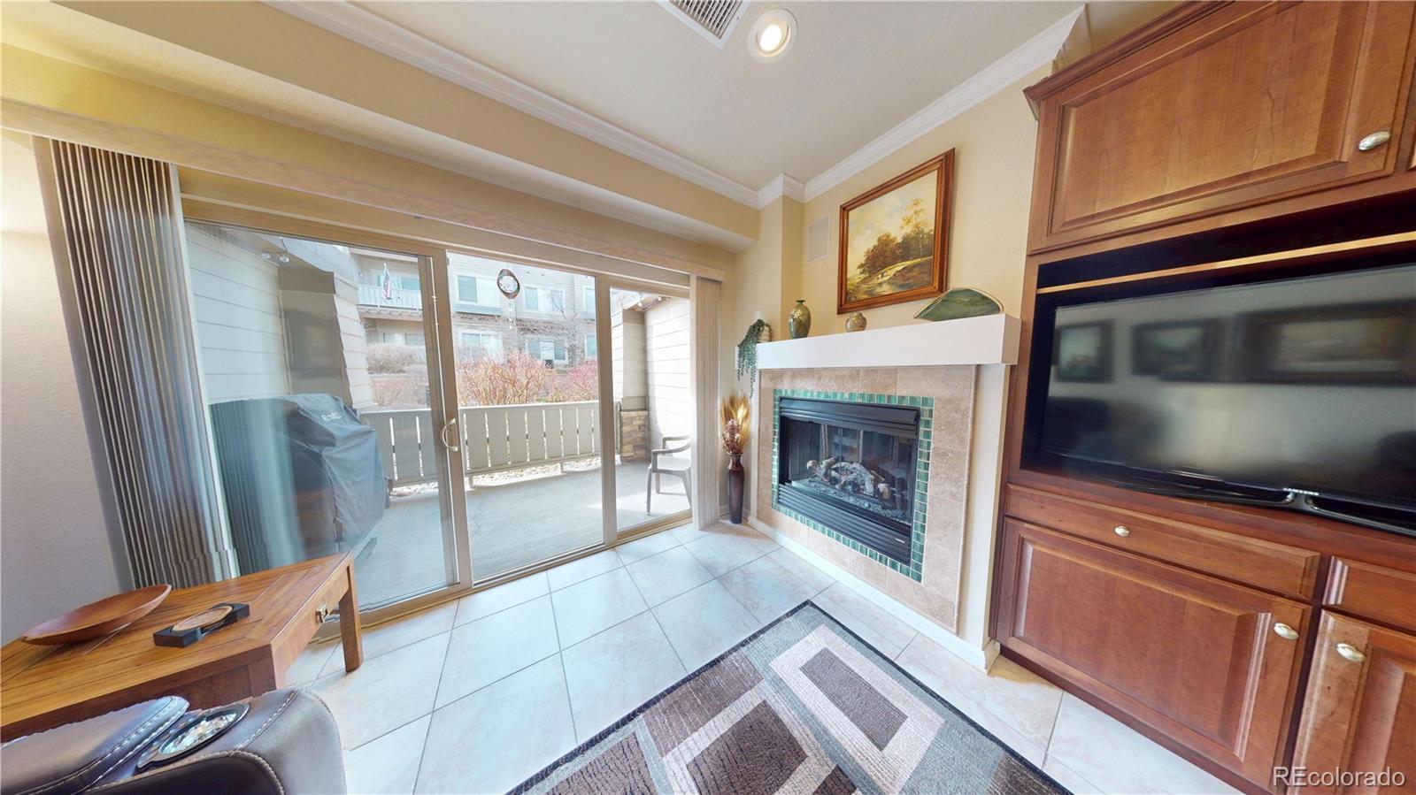 This first-floor condominium, in coveted Stonegate of Parker, has an attached 2 car tandem garage with no stairs as you enter, finding a large walk-in entry closet great for extra storage. This 2 bedroom, 2 bathroom home offers over 1,200 square feet of living space, with spacious 9-foot ceilings, an open floor plan, and numerous upgrades throughout. The kitchen is complete with granite tile countertops, stainless steel appliances with double oven/smooth top range, pantry closet, center island/breakfast bar with pendant lights, accent mosaic tile and under counter lighting, additional built-in display/serving cabinetry by eating space provide convenience and enjoyment. The great room offers an electric fireplace, crown molding, built-in entertainment cabinets and a sliding glass door with additional full floor to ceiling window inviting you to step out onto the covered patio. Oversized tile flooring extends throughout the kitchen, living area, and hallways. The primary suite boasts a large walk-in closet, plus a full bath which includes a double sink vanity, a walk-in shower with two shower heads and a handy sitting bench. The secondary bedroom provides built-in cabinetry perfect for office space. Additional appealing features include ceiling fans, beautiful patterned carpeting in the bedrooms, and decorative tile on the shower walls. Close to parks, trails, shopping and dining, along with the pool, hot tub, and the mail box. All these features make this place a fantastic find!