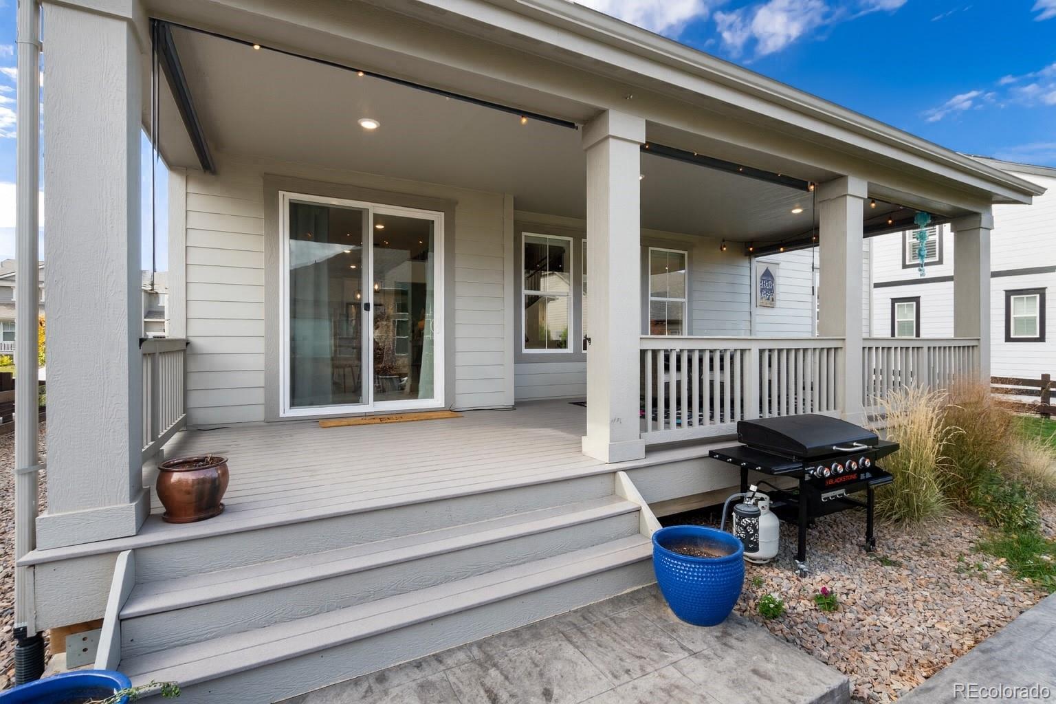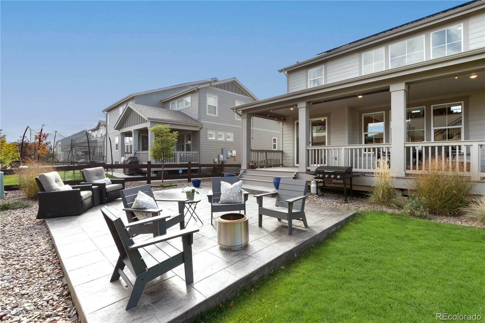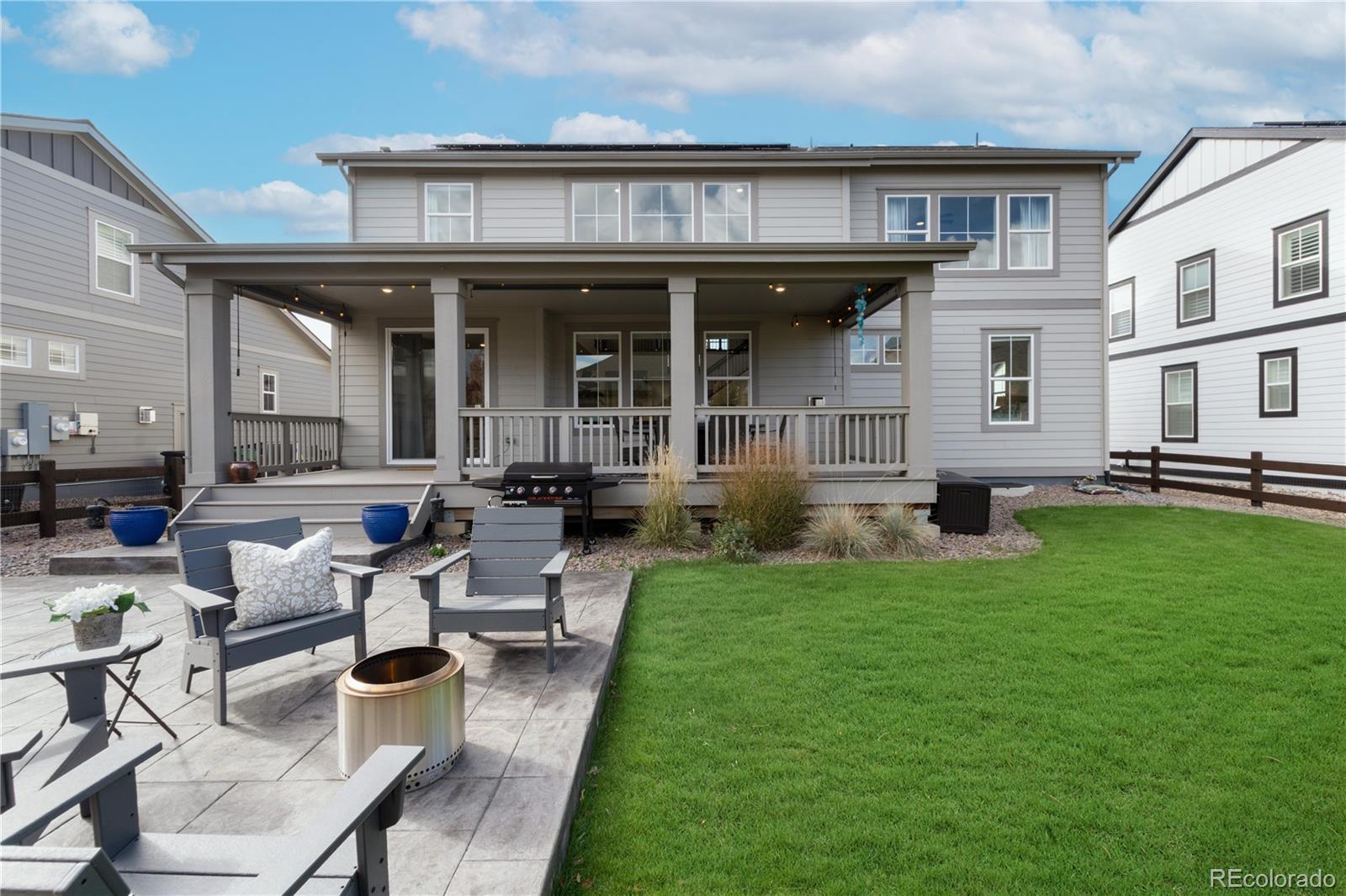 Welcome home to this spacious and thoughtfully designed 5 BDRM, 4 BATH home in the highly sought-after Compass neighborhood of Erie. Step inside to find a welcoming entry and formal dining room that lead into a chef’s kitchen, complete with an oversized island and open flow into the stunning two-story family room with a cozy gas fireplace.The main floor offers a versatile bedroom and full bath, ideal for guests or a home office. Upstairs, you’ll find a large loft with its own bathroom, plus a luxurious primary suite featuring a five-piece bath and a walk-in closet with custom built-ins that conveniently connects to the laundry room. Two additional bedrooms share a well-appointed Jack-and-Jill bath. The finished basement expands your living space with a large recreation room, wet bar, and an additional bedroom. It’s plumbed and ready for a future bathroom, perfect for growing families or entertaining guests. Enjoy Colorado living at its best from the welcoming front porch, an ideal spot to relax with coffee and watch Erie’s famous hot air balloons drift by. The backyard offers even more outdoor living with a covered deck featuring custom shades for privacy, plus an extended stamped-concrete patio perfect for gatherings. The oversized three-car garage is finished with epoxy floors, and additional updates include new flooring, two furnaces, and a radon mitigation system. Located in one of Erie’s most desirable communities—just minutes from parks, trails, top-rated schools, and charming downtown Erie—this home perfectly blends luxury, comfort, and small-town charm.