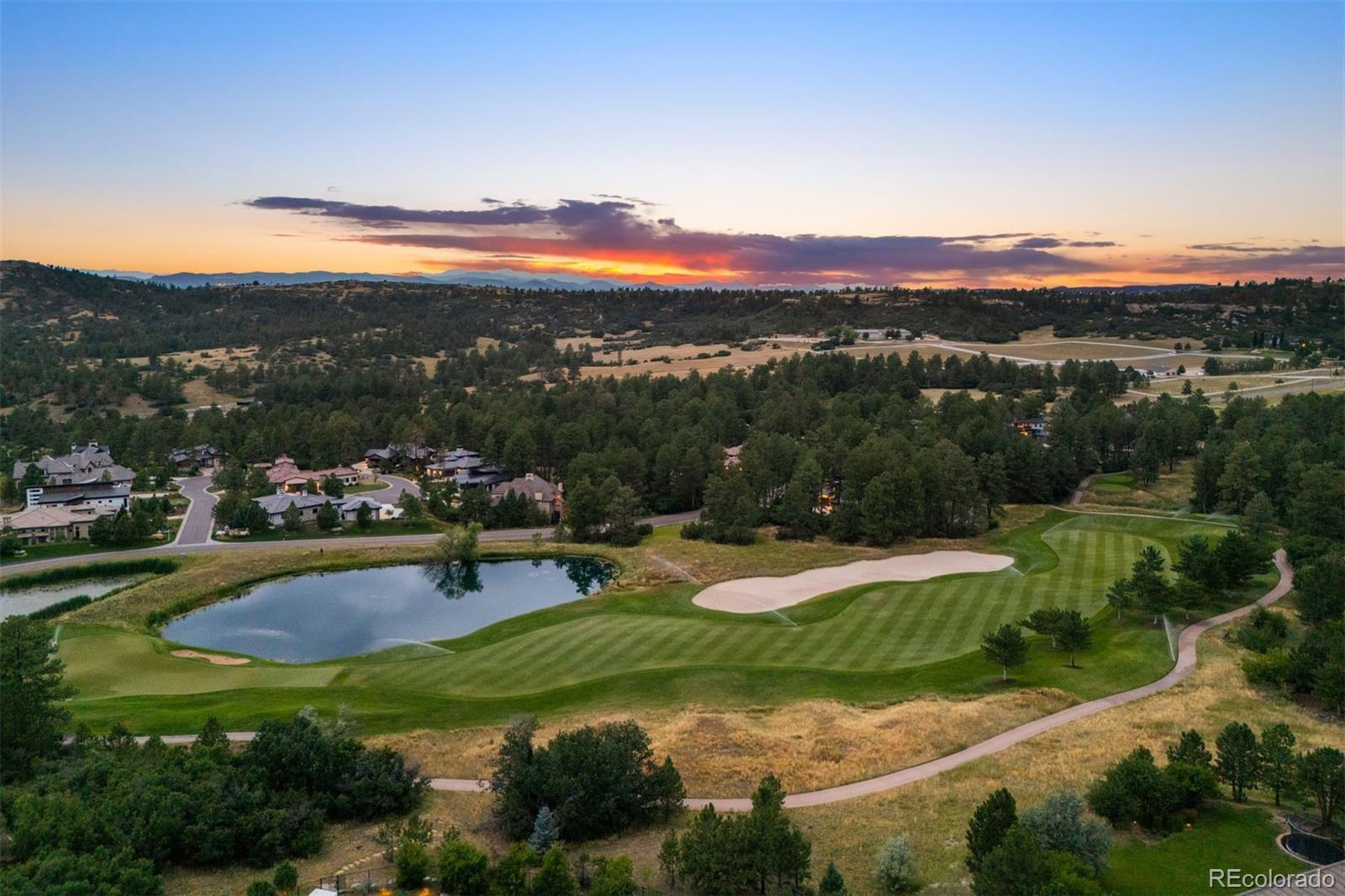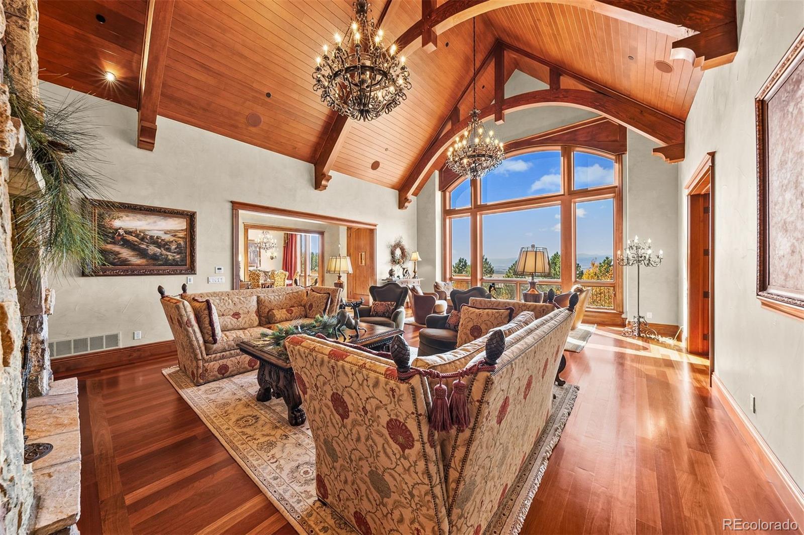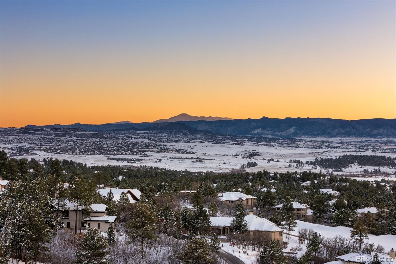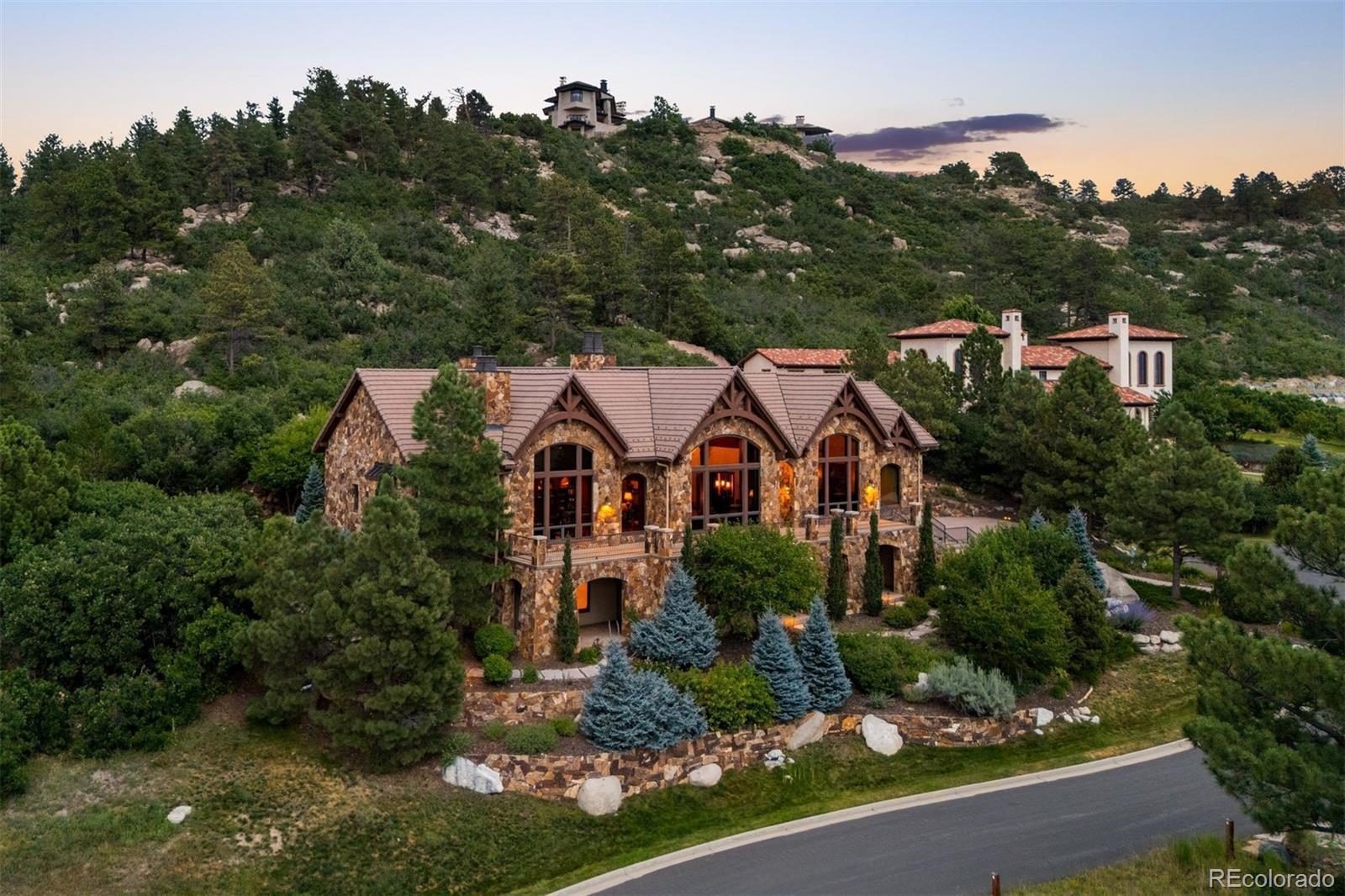 Commanding rare, sweeping views from the Sangre de Cristo Range to Mt. Evans, this 5 bedroom | 9 bathroom estate, regally perched above the gated Village at Castle Pines community, is magnificent in both scale and design. Unfolding around a breathtaking 2-story great room, vaulted ceilings, hand-hewn wood beams, and natural Colorado stone set a tone of grandeur for this impressive home. Designed to entertain, the comfortable family room, with access to the amply sized back patio and yard, offers a seamless transition into the kitchen which is anchored by an oversized island, Sub-Zero refrigerator, Wolf double ovens, and range. Gatherings are further enhanced by a wet bar, formal dining room, and butler’s pantry with dedicated appliances. The fully wood-paneled executive office is fit for a CEO, and the main level is completed by a spacious primary bedroom and spa-like bathroom, ideally located guest suite, second office, two powder rooms, laundry room, and 4-car garage. A destination of its own, the walkout lower level includes a recreation room and bar, soundproof theater, and an extraordinary, climate-controlled wine cellar paired with an adjoining tasting room, both crafted for collectors. An en suite bedroom, workout room with sauna and shower, bonus room, powder room, and abundant storage complete this level. The upstairs is its own retreat with a loft and two additional bedrooms complimented by en suite baths, each with heated floors. The thoughtfully engineered 6-inch steel-reinforced concrete driveway with snowmelt system on the downhill approach and front steps is a plus. Outside, incredible living spaces abound whether you're stargazing by the fire pit on the back patio, playing in the yard, winding through the flagstone paths, dining on the lower level porch, or taking in the spectacular mountain views from the front terrace. Simply put, this exceptional estate is a residence like no other and offers a phenomenal setting for year-round Colorado enjoyment.