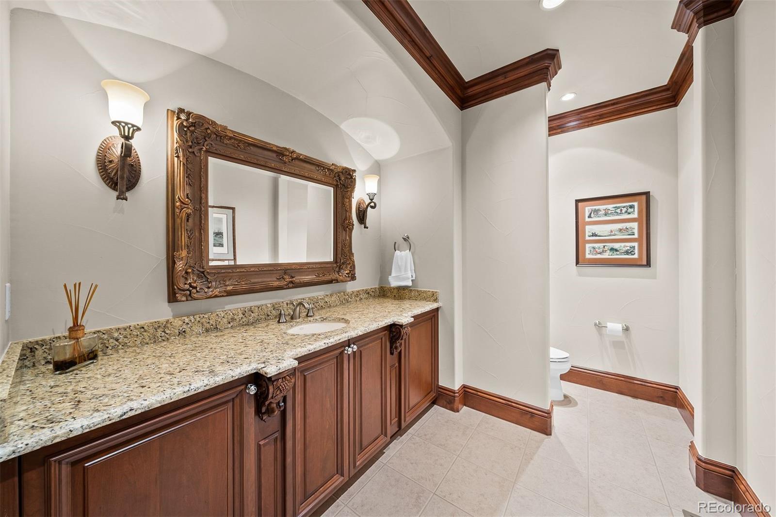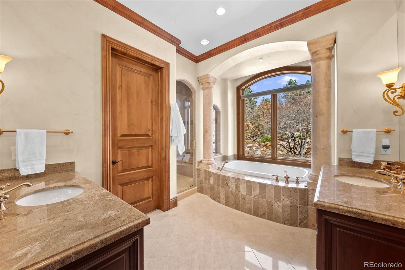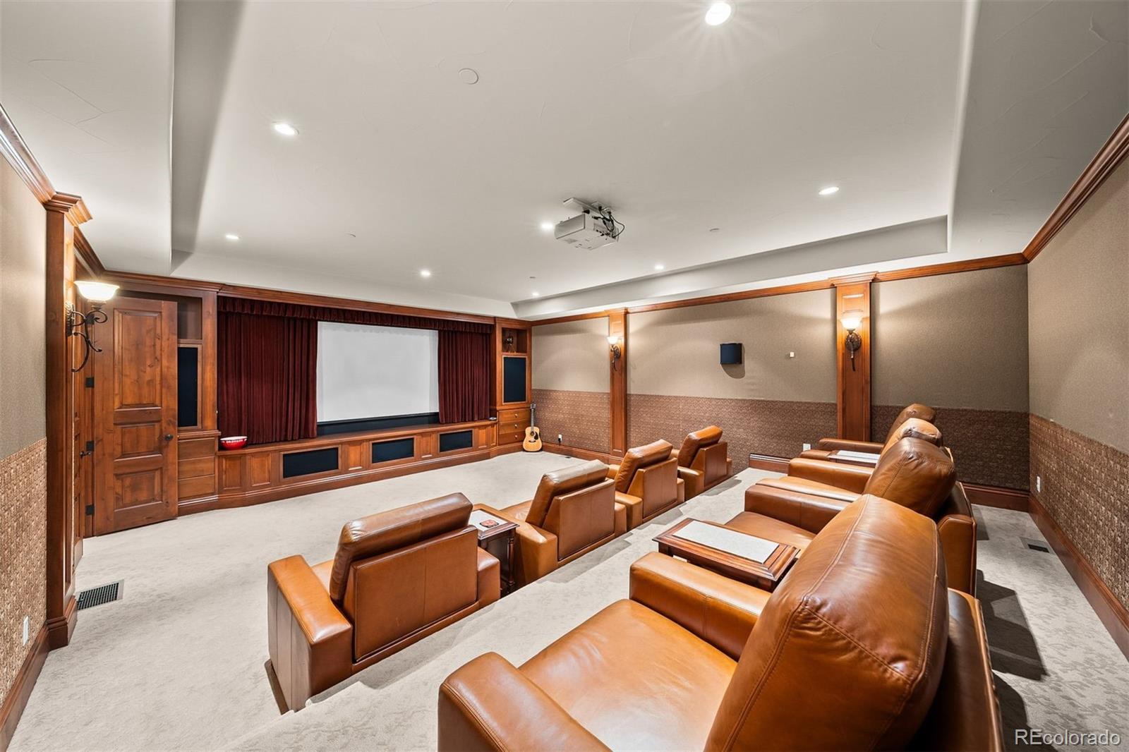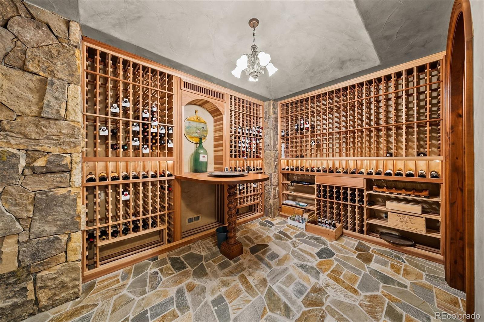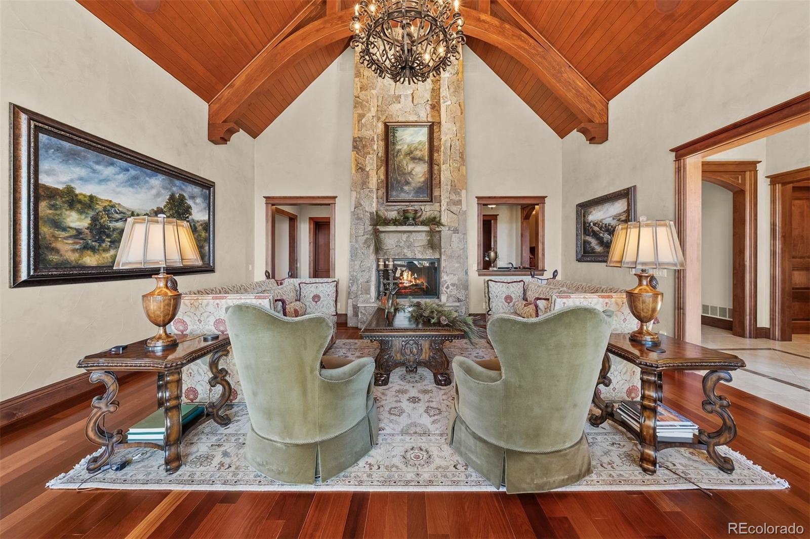 Commanding rare, sweeping views from the Sangre de Cristo Range to Mt. Evans, this 5 bedroom | 9 bathroom estate, regally perched above the gated Village at Castle Pines community, is magnificent in both scale and design. Unfolding around a breathtaking 2-story great room, vaulted ceilings, hand-hewn wood beams, and natural Colorado stone set a tone of grandeur for this impressive home. Designed to entertain, the comfortable family room, with access to the amply sized back patio and yard, offers a seamless transition into the kitchen which is anchored by an oversized island, Sub-Zero refrigerator, Wolf double ovens, and range. Gatherings are further enhanced by a wet bar, formal dining room, and butler’s pantry with dedicated appliances. The fully wood-paneled executive office is fit for a CEO, and the main level is completed by a spacious primary bedroom and spa-like bathroom, ideally located guest suite, second office, two powder rooms, laundry room, and 4-car garage. A destination of its own, the walkout lower level includes a recreation room and bar, soundproof theater, and an extraordinary, climate-controlled wine cellar paired with an adjoining tasting room, both crafted for collectors. An en suite bedroom, workout room with sauna and shower, bonus room, powder room, and abundant storage complete this level. The upstairs is its own retreat with a loft and two additional bedrooms complimented by en suite baths, each with heated floors. The thoughtfully engineered 6-inch steel-reinforced concrete driveway with snowmelt system on the downhill approach and front steps is a plus. Outside, incredible living spaces abound whether you're stargazing by the fire pit on the back patio, playing in the yard, winding through the flagstone paths, dining on the lower level porch, or taking in the spectacular mountain views from the front terrace. Simply put, this exceptional estate is a residence like no other and offers a phenomenal setting for year-round Colorado enjoyment.