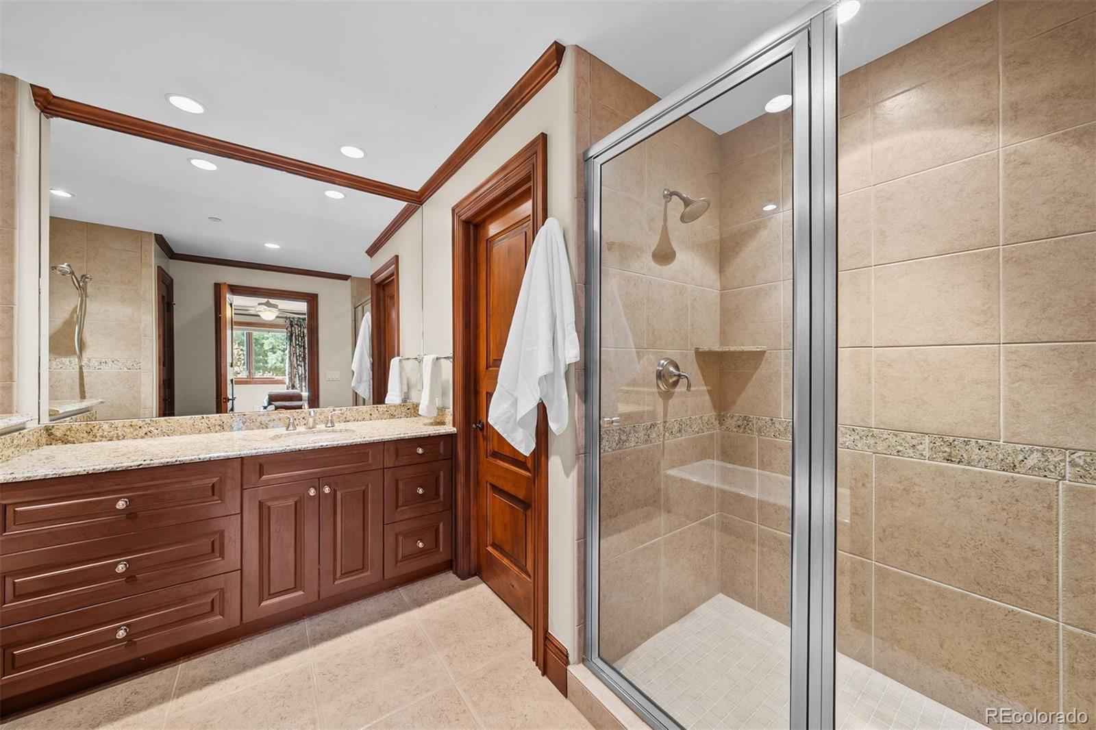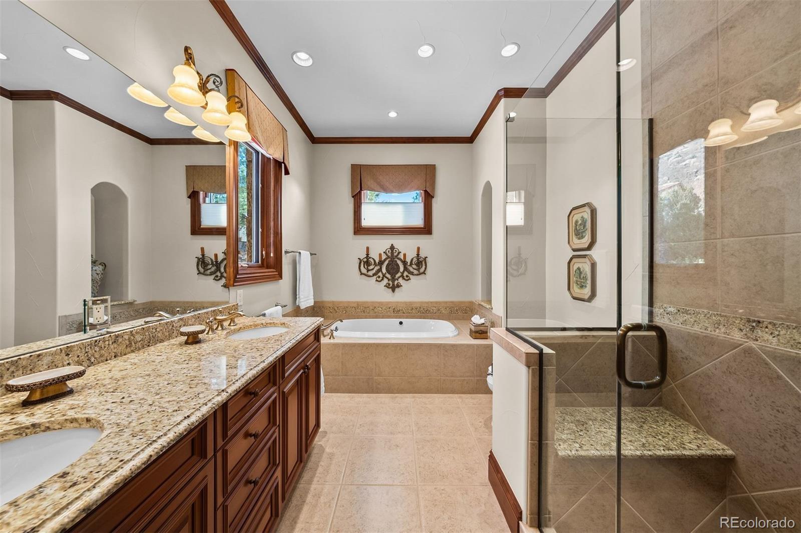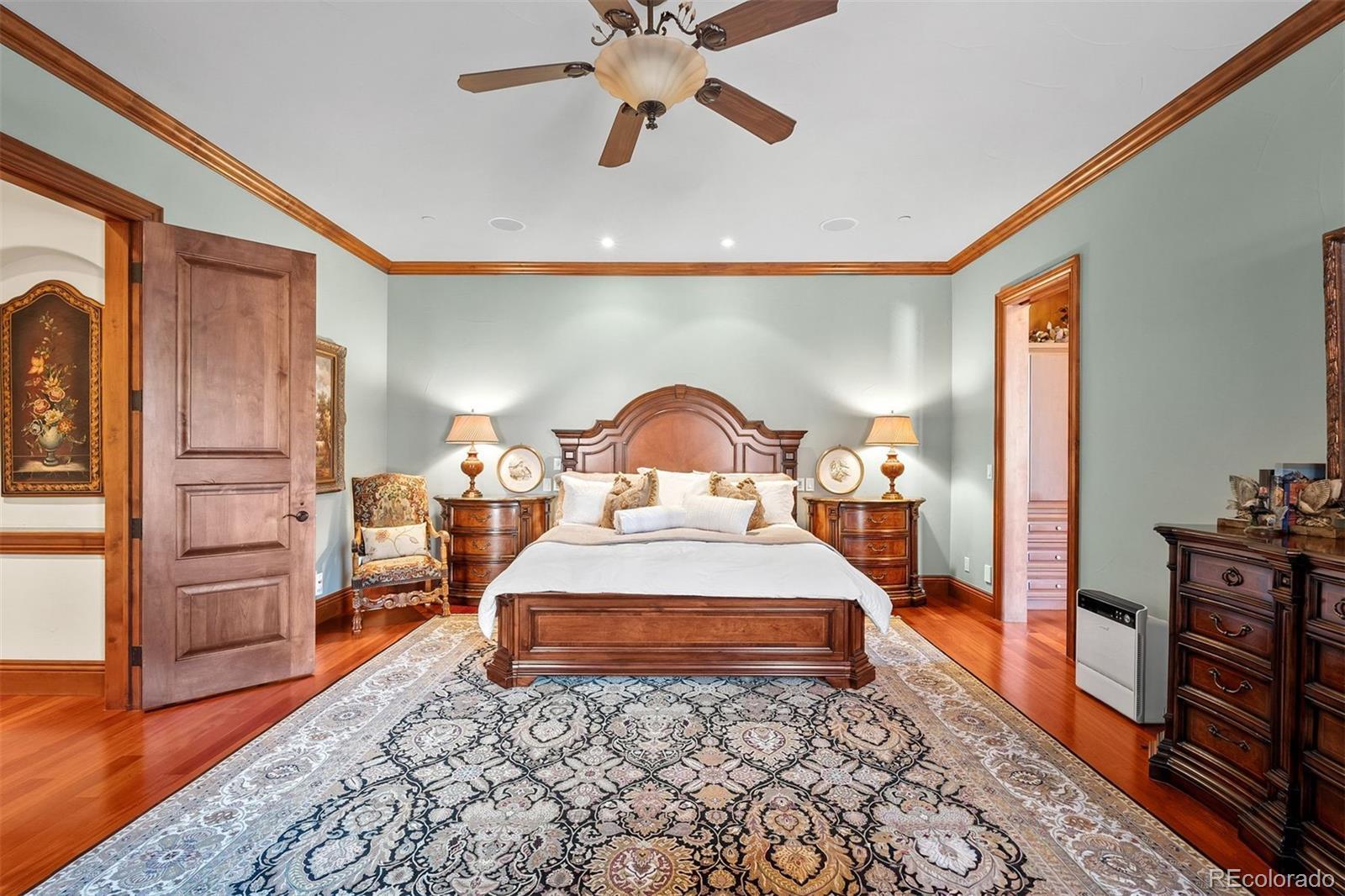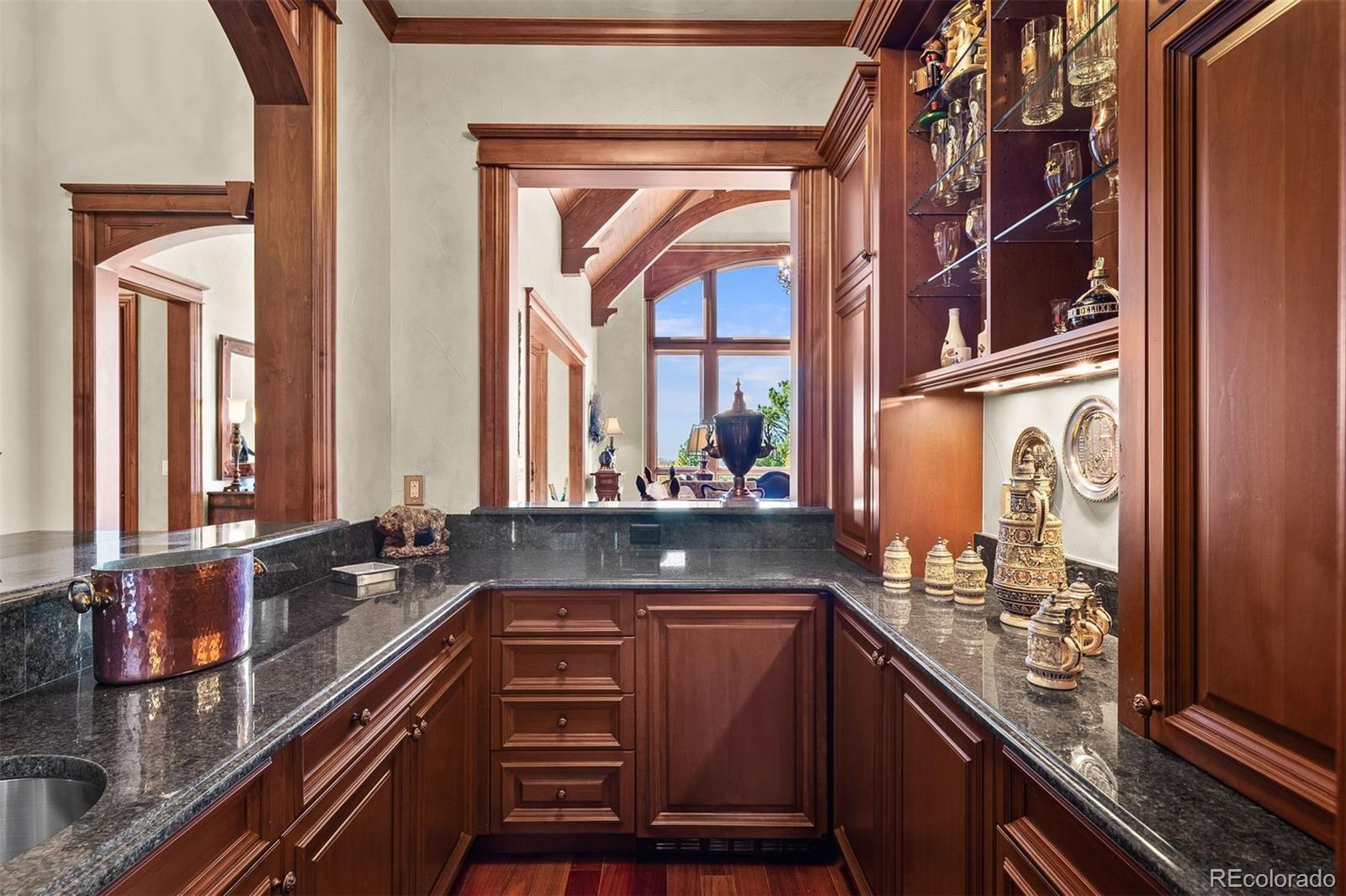 Commanding rare, sweeping views from the Sangre de Cristo Range to Mt. Evans, this 5 bedroom | 9 bathroom estate, regally perched above the gated Village at Castle Pines community, is magnificent in both scale and design. Unfolding around a breathtaking 2-story great room, vaulted ceilings, hand-hewn wood beams, and natural Colorado stone set a tone of grandeur for this impressive home. Designed to entertain, the comfortable family room, with access to the amply sized back patio and yard, offers a seamless transition into the kitchen which is anchored by an oversized island, Sub-Zero refrigerator, Wolf double ovens, and range. Gatherings are further enhanced by a wet bar, formal dining room, and butler’s pantry with dedicated appliances. The fully wood-paneled executive office is fit for a CEO, and the main level is completed by a spacious primary bedroom and spa-like bathroom, ideally located guest suite, second office, two powder rooms, laundry room, and 4-car garage. A destination of its own, the walkout lower level includes a recreation room and bar, soundproof theater, and an extraordinary, climate-controlled wine cellar paired with an adjoining tasting room, both crafted for collectors. An en suite bedroom, workout room with sauna and shower, bonus room, powder room, and abundant storage complete this level. The upstairs is its own retreat with a loft and two additional bedrooms complimented by en suite baths, each with heated floors. The thoughtfully engineered 6-inch steel-reinforced concrete driveway with snowmelt system on the downhill approach and front steps is a plus. Outside, incredible living spaces abound whether you're stargazing by the fire pit on the back patio, playing in the yard, winding through the flagstone paths, dining on the lower level porch, or taking in the spectacular mountain views from the front terrace. Simply put, this exceptional estate is a residence like no other and offers a phenomenal setting for year-round Colorado enjoyment.