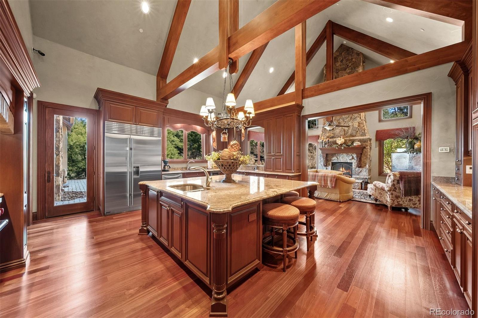 Audio/Video Controls, Built-in Features, Ceiling Fan(s), Eat-in Kitchen, Entrance Foyer, Five Piece Bath, Granite Counters, High Ceilings, Kitchen Island, Pantry, Primary Suite, Sauna, Sound System, Vaulted Ceiling(s), Walk-In Closet(s), Wet Bar