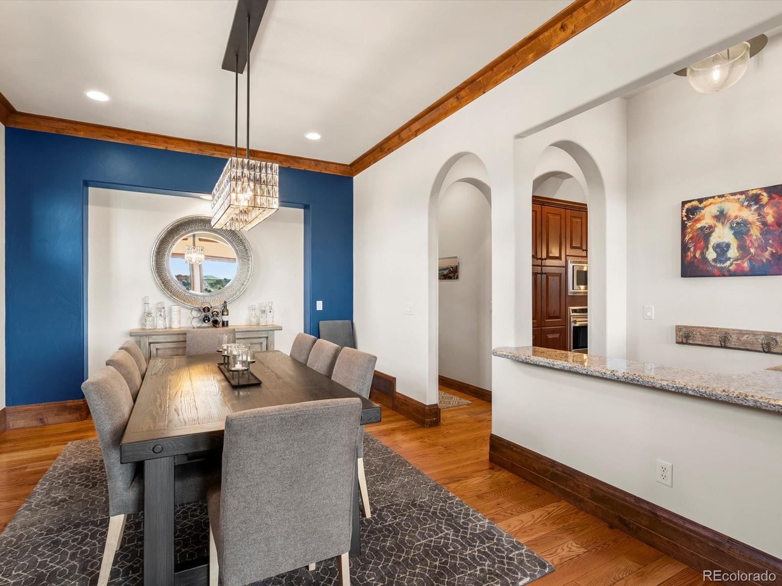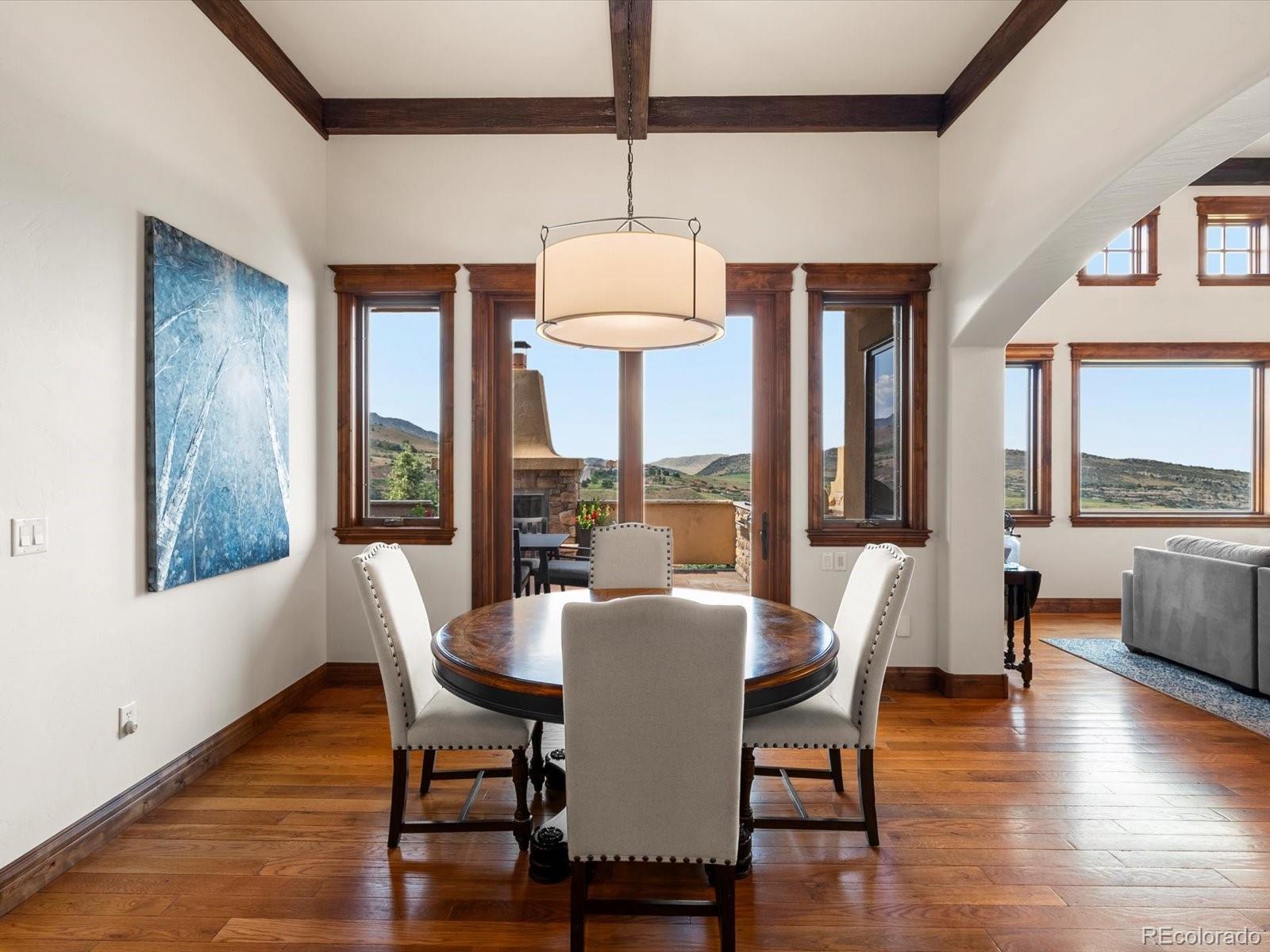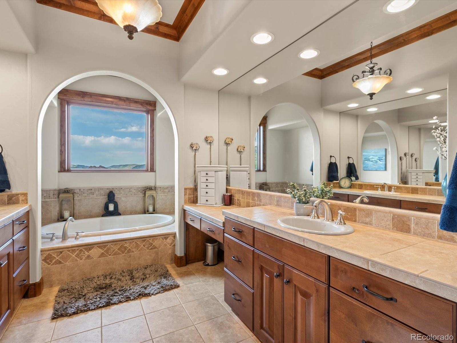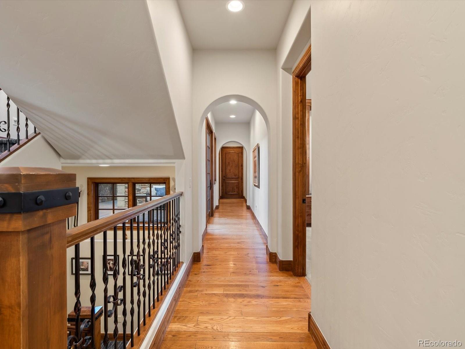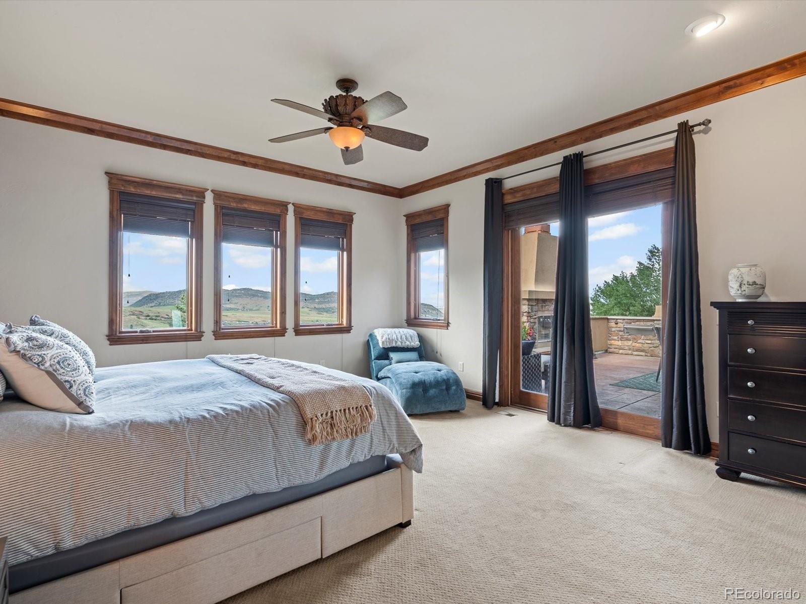 Tucked into a peaceful corner of the coveted Willow Springs North neighborhood, this expansive custom home lives like a ranch home and blends luxurious living with the natural beauty of the Colorado foothills. A short golf cart ride to Red Rocks Country Club and direct access to over 800 acres of private open space for hiking, biking, and horseback riding, this home offers both adventure and retreat. Enter through a private courtyard with a tranquil water feature into a light-filled interior with soaring ceilings, fresh paint, updated lighting, and beautiful wood and tile floors. The heart of the home is an open-concept kitchen and living room with massive windows framing mountain and city views, a brick gas fireplace, and seamless flow to the formal dining room and wet bar. The chef’s kitchen features alder cabinetry, granite counters, walk-in pantry, Sub-Zero fridge, Wolf gas stove, island with extra sink, and eat-in area that opens to a partially covered patio with built-in gas grill and fireplace. Perfect for relaxing sunsets and stunning downtown views. The main-floor primary suite includes a deck walkout, dual vanities, jetted tub, oversized shower, huge walk-in closet, and access to the partially fenced backyard with a waterfall feature and open space for privacy. A large office, laundry room, powder room, additional bedroom with en-suite bath, and mudroom off the heated 4-car garage with EV outlet complete the main level. Upstairs are 2 more bedrooms, each with en-suite baths, walk-in closets, and Juliet balconies, plus a loft with wood beams and views of the rock outcroppings and courtyard. The walk-out lower level features a spacious workout room, rec space, fireplace, wet bar, wine cellar, gym, ¾ bath, storage room, covered patio with hot tub, retractable shades, and TV hookups. Additional highlights: 5 furnaces with room-by-room thermostats, 2 hot water heaters, and whole-house Sonos audio. A rare retreat minutes from modern conveniences.