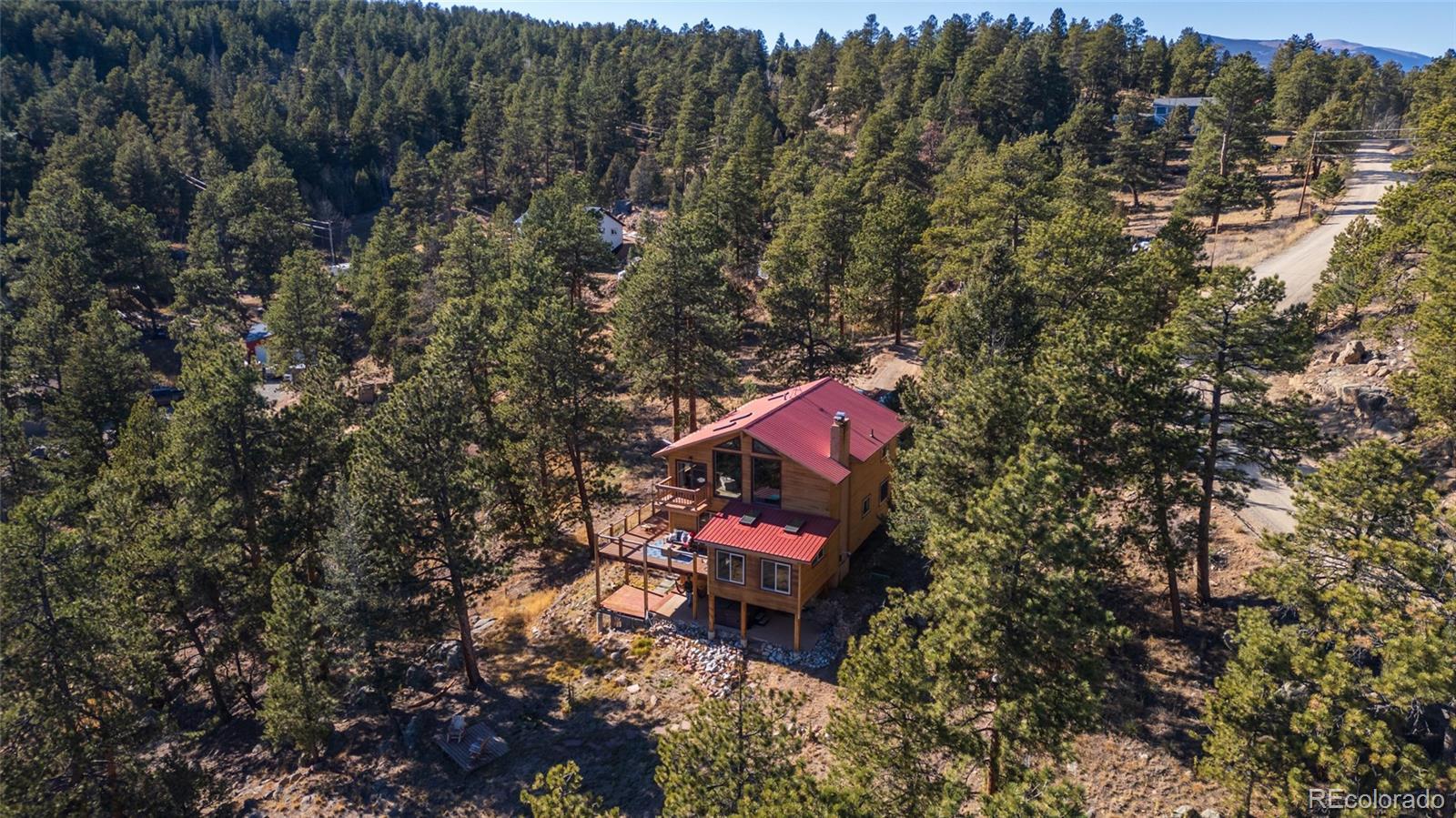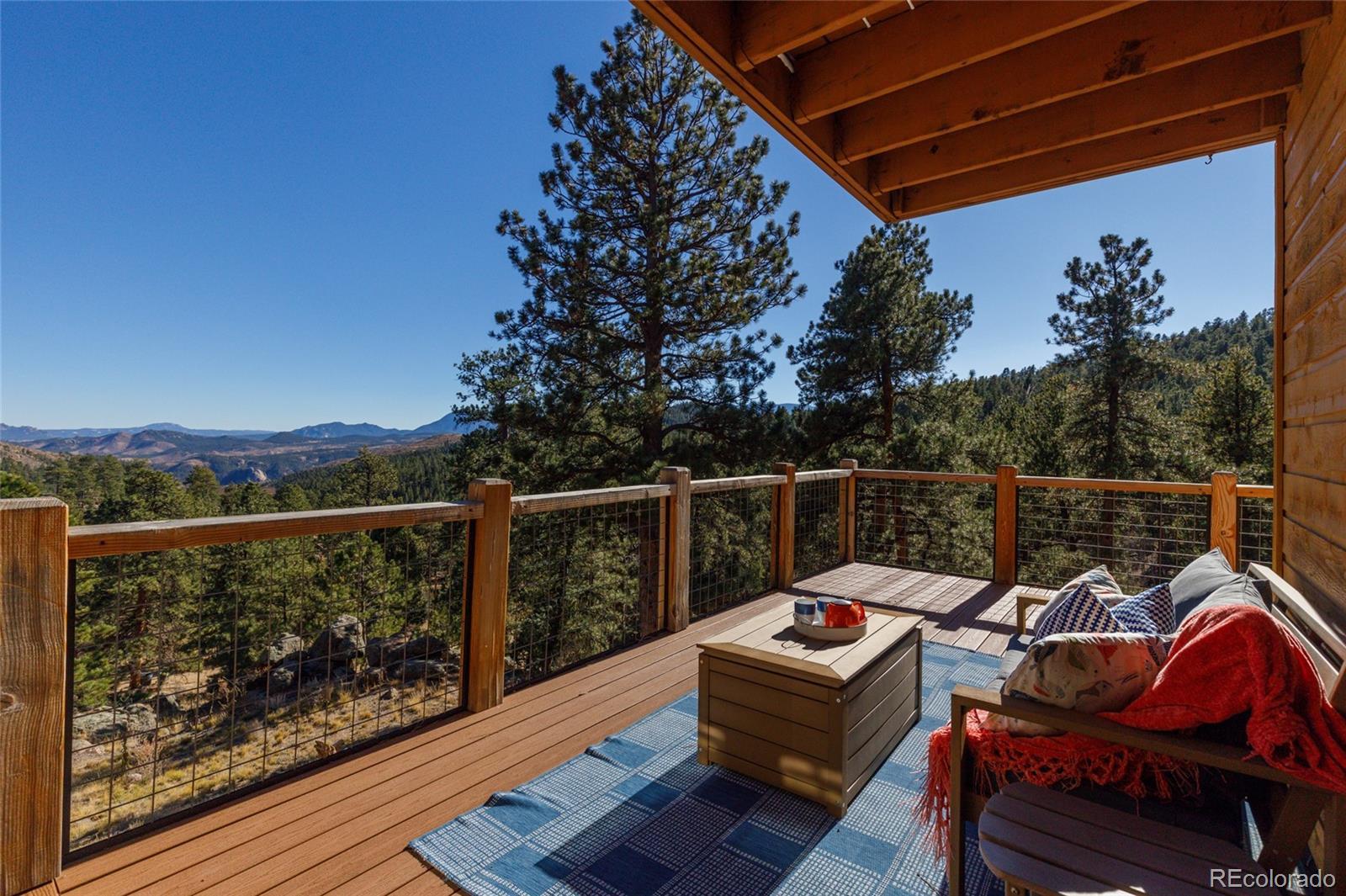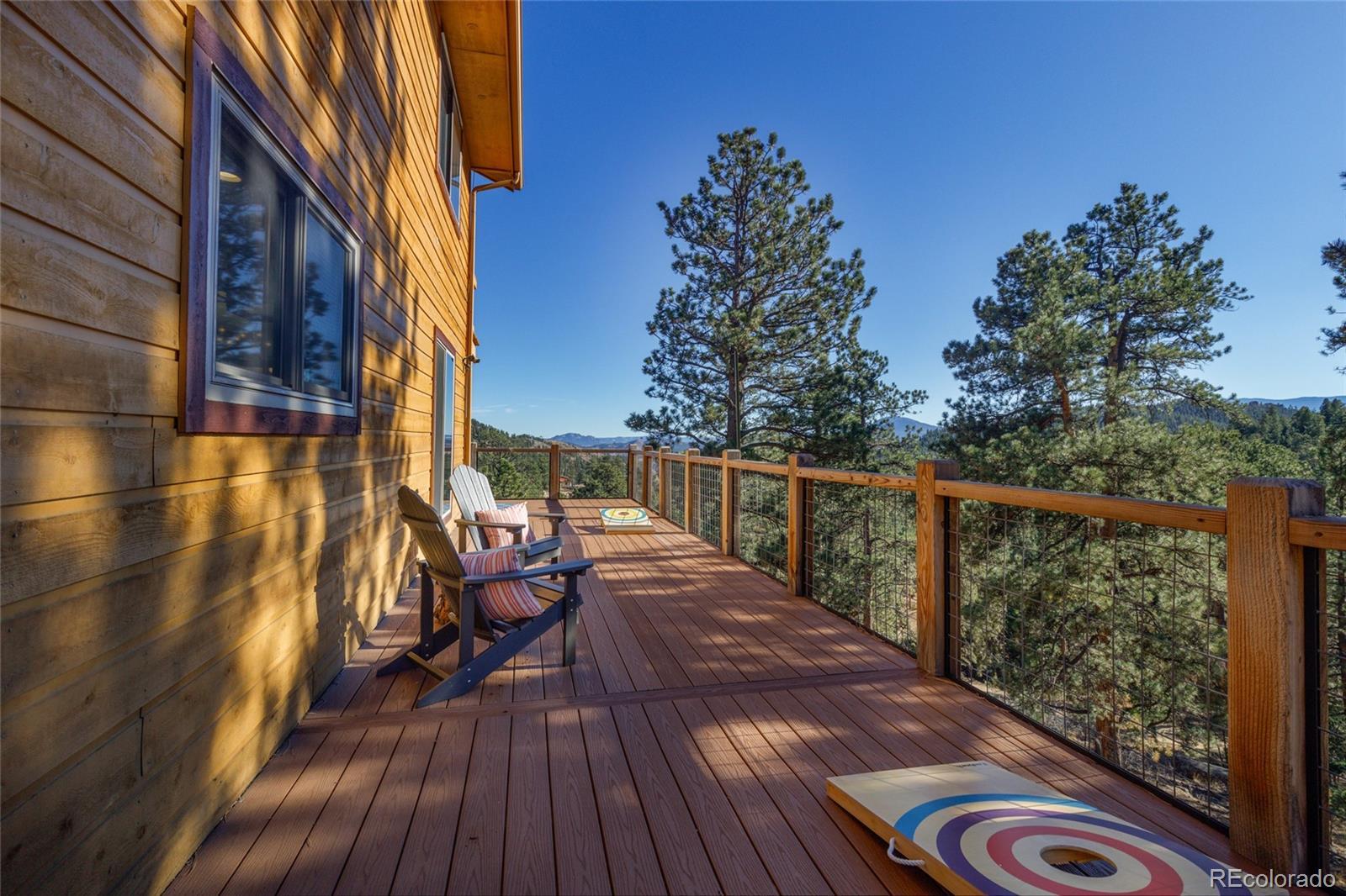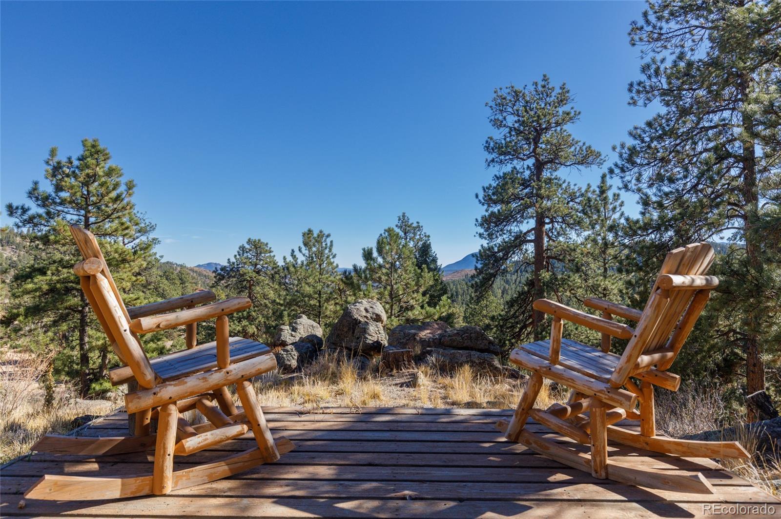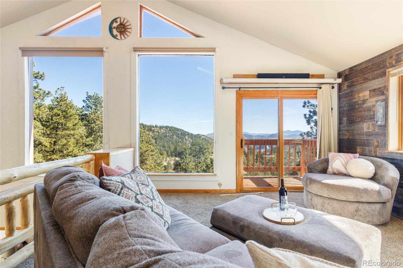 Escape to your own slice of mountain paradise! This tri-level, stunning home sits on 2 private acres surrounded by towering pines, dramatic moss-rock outcroppings & breathtaking panoramic views. Enjoy the sunrise from your upper level, private viewing platform or relax in the sunshine on the elevated expansive wrap-around Trex deck! Inside, you’ll find an open-concept floor plan w soaring ceilings & walls of windows that flood the home w natural light. The main living area features a striking moss-rock wood burning fireplace, cozy cedar-finished sunroom w skylights & double french doors that open onto the deck. The walk-out lower level offers its own living space w a pellet stove ez hot tub access & a private bedroom w sink and vanity—perfect for guests. Upstairs, the sunny loft w movie screen that overlooks the main living area & leads to the primary suite, complete w a luxurious 5 piece bath & stunning views from every window & a beautiful stained glass feature. Additional highlights include a mudroom with built-in storage spacious laundry room, low-maintenance metal roof & an attached two-car garage. This 3-bedroom, 2-bath retreat is move-in ready & fully furnished—most everything can stay! That includes quality furniture, appliances, a newer large hot tub, Starlink dish, snow blower, log splitter, tree trimmer/chainsaw/gas storage/misc yard equipment & more! voluntary hoa includes access to a private fishing pond & hiking trail to Mt Bailey! (www.burlandhomeowners.org/park) Move right in and relax—all the work has been done for you! Brand-new furnace, dishwasher & light fixtures throughout! Plus, enjoy peace of mind with major updates from the past decade, including a low-maintenance metal roof, cedar siding, Trex decking, water softener & pump, windows, septic system, water heater & stainless steel appliances! Located just a few miles off Hwy 285 & less than an hour from Denver, you’ll enjoy total tranquility with easy access to the city!